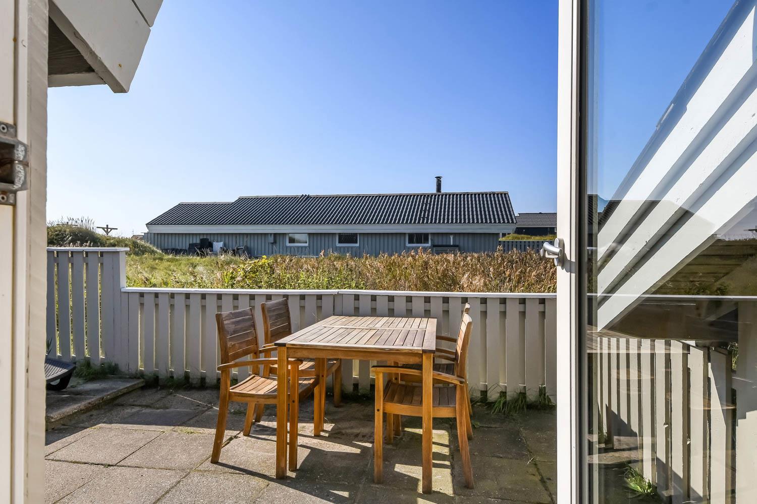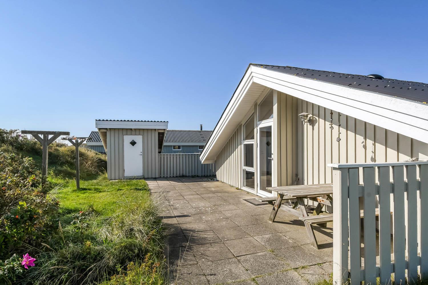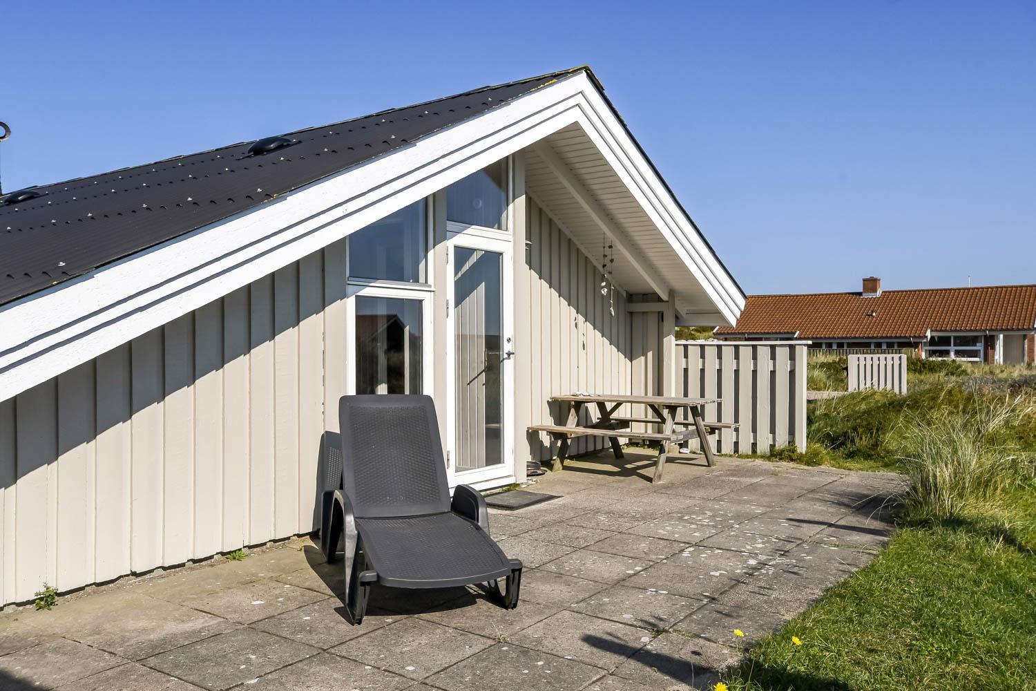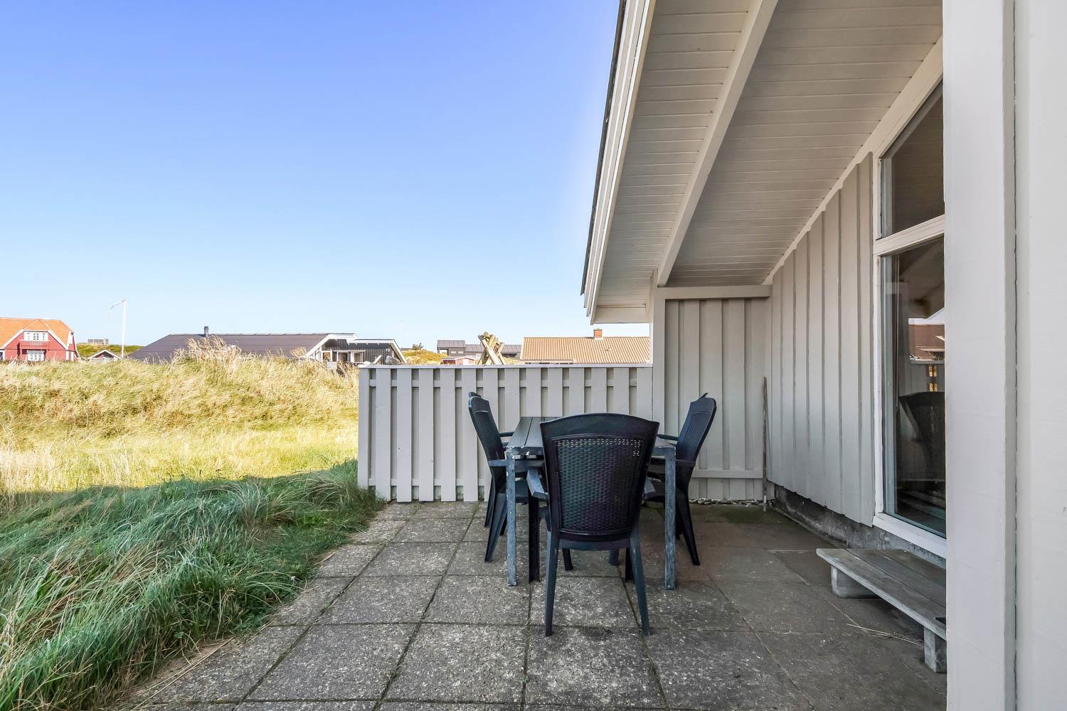 Huset ligger på en ca. 1.600 m2 stor klitgrund. Fra opholdsstuen og fra køkkenet er udgang til 3 dejlige terrasser, hvoraf den største er delvis overdækket. Der er havemøbler, grill og solvogne til rådighed. Fra terrasserne kan man høre havets brusen. Nyd en gåtur ved Vesterhavet. Find sten og rav eller sæt jer i klitterne og nyd solnedgangen over havet.
