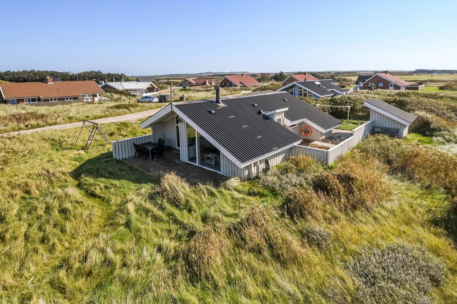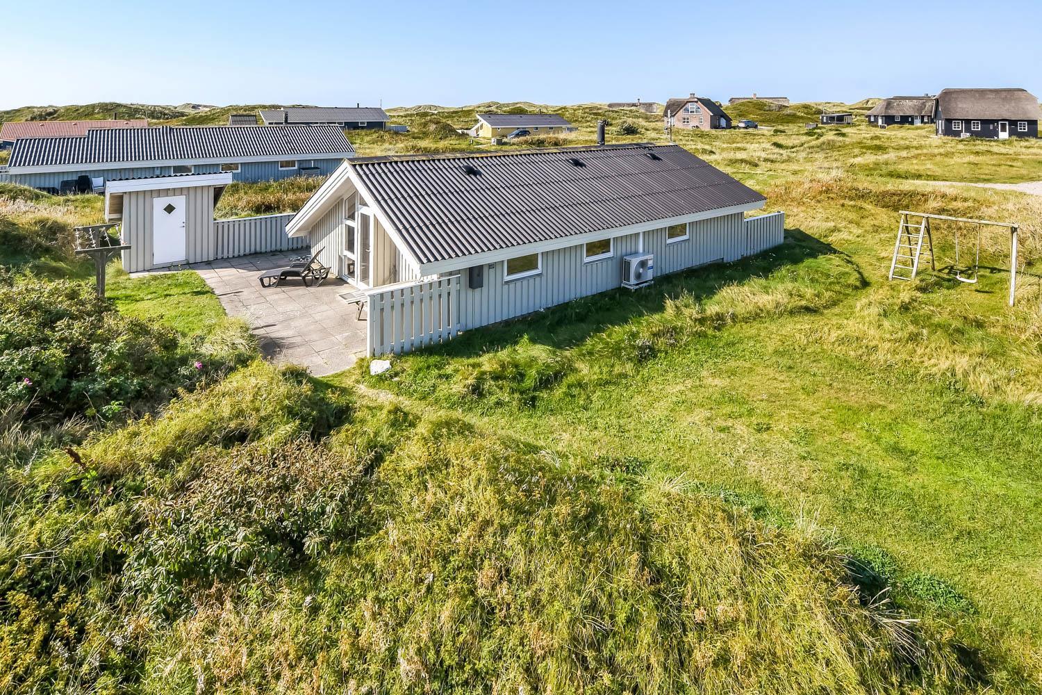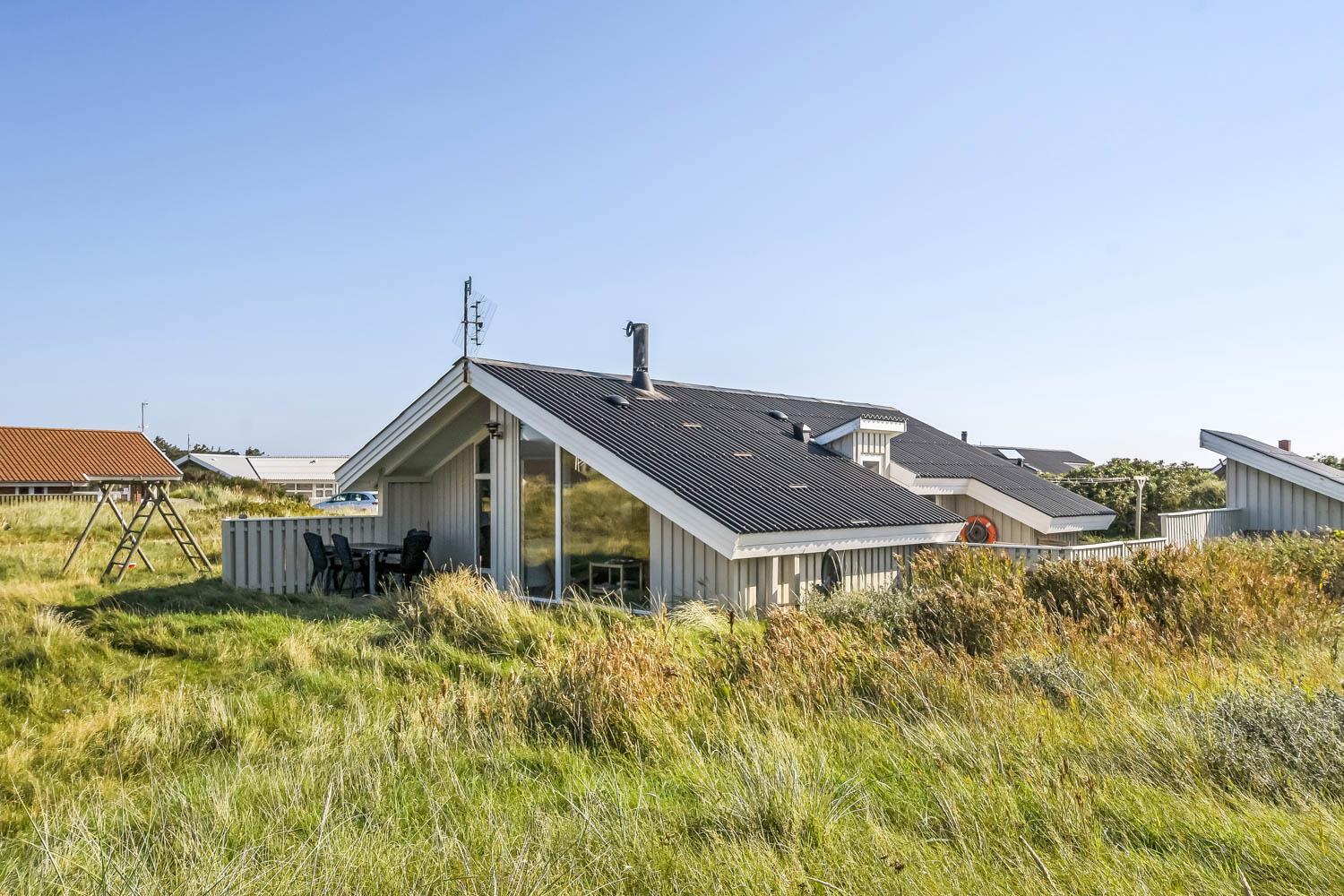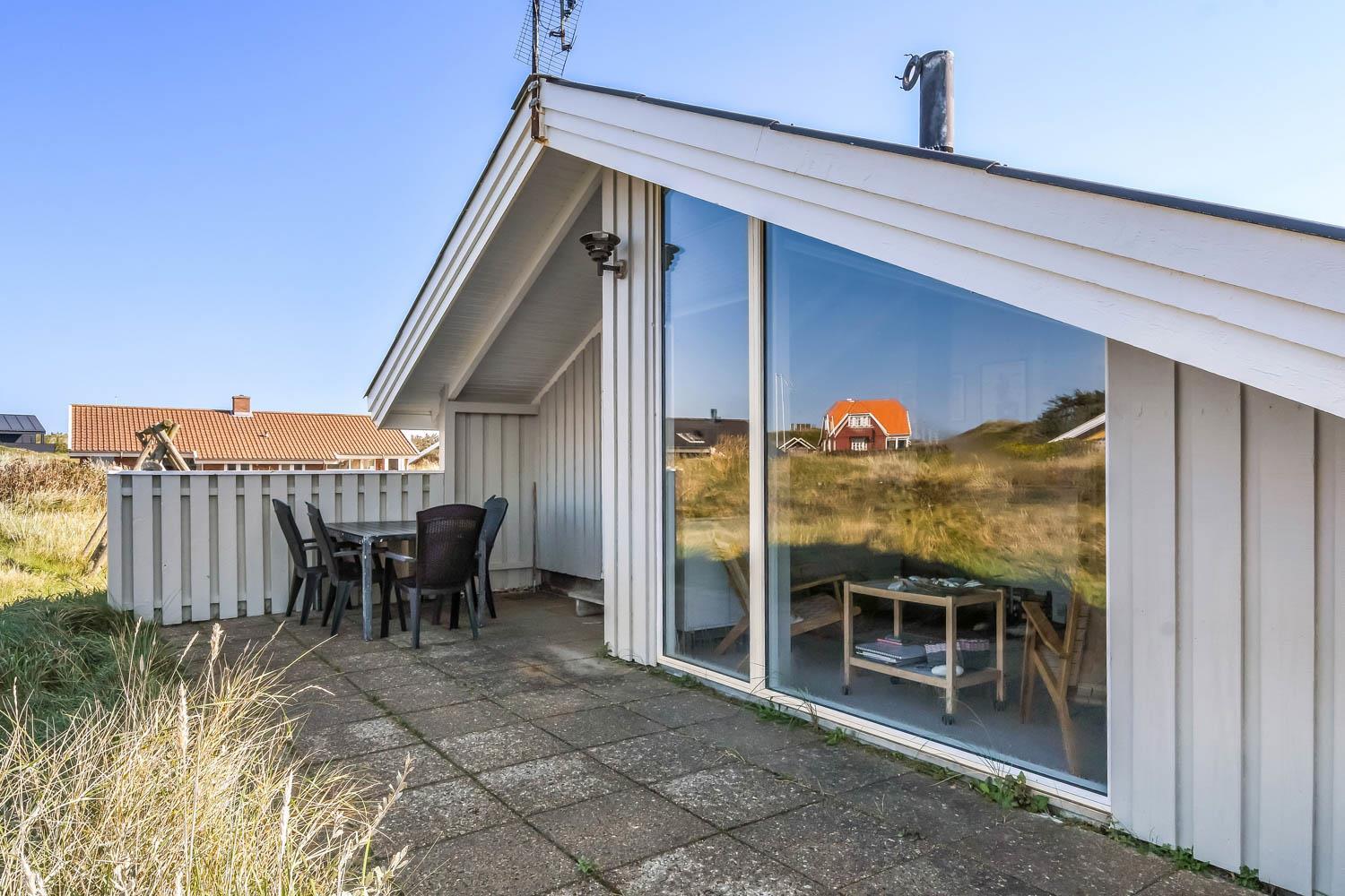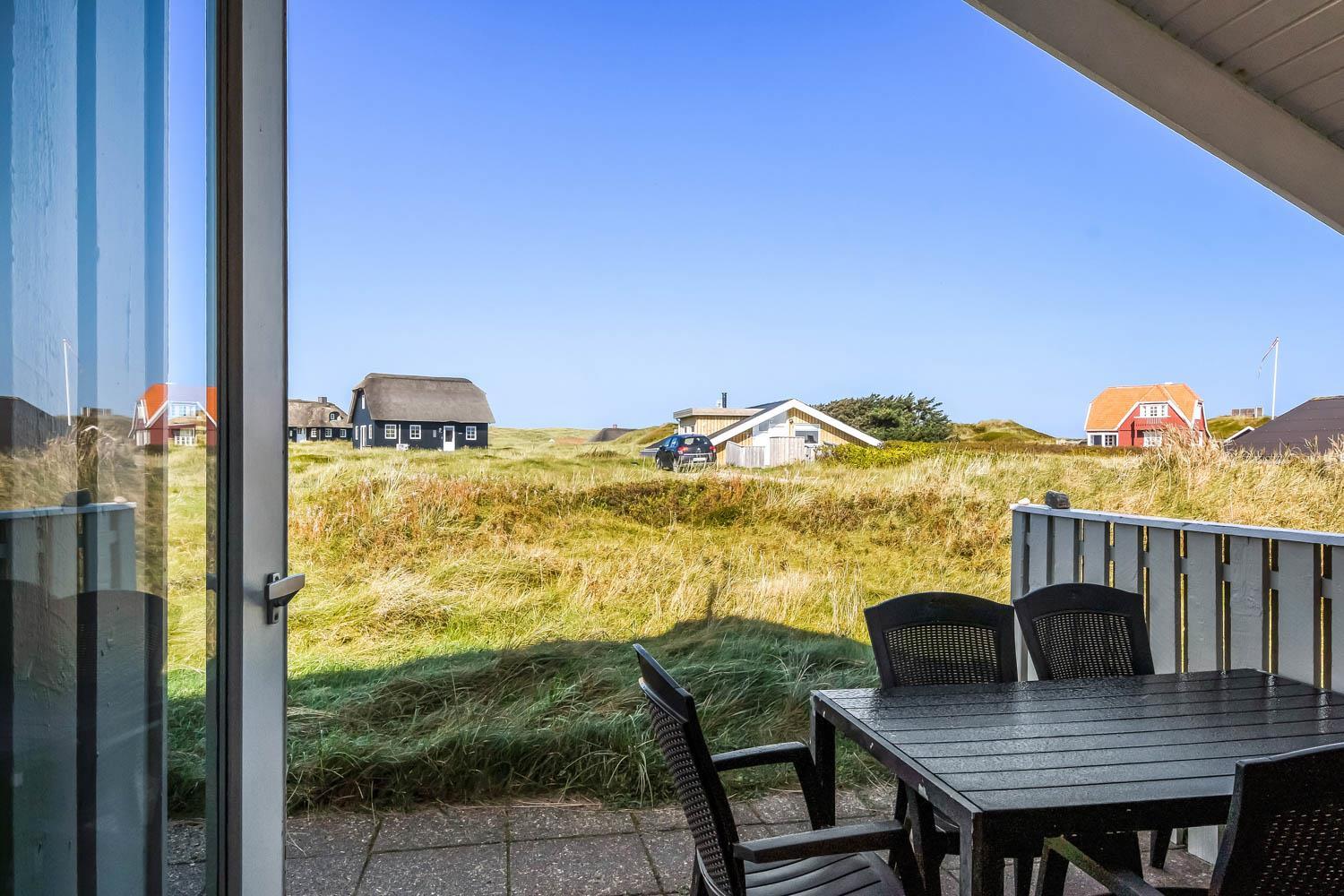 Huset ligger på en ca. 1.600 m2 stor klitgrund. Fra opholdsstuen og fra køkkenet er udgang til 3 dejlige terrasser, hvoraf den største er delvis overdækket. Der er havemøbler, grill og solvogne til rådighed. Fra terrasserne kan man høre havets brusen. Nyd en gåtur ved Vesterhavet. Find sten og rav eller sæt jer i klitterne og nyd solnedgangen over havet.
