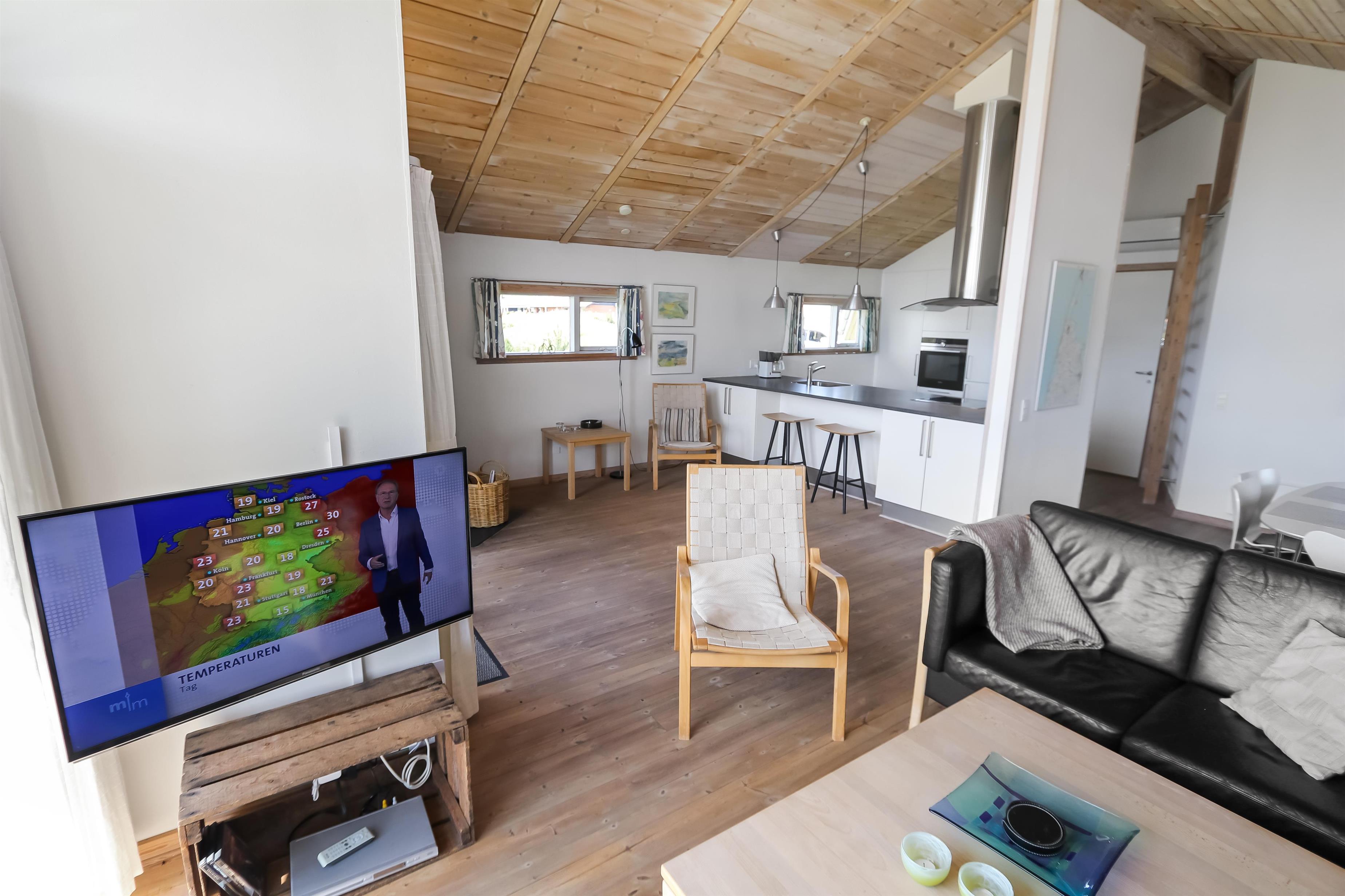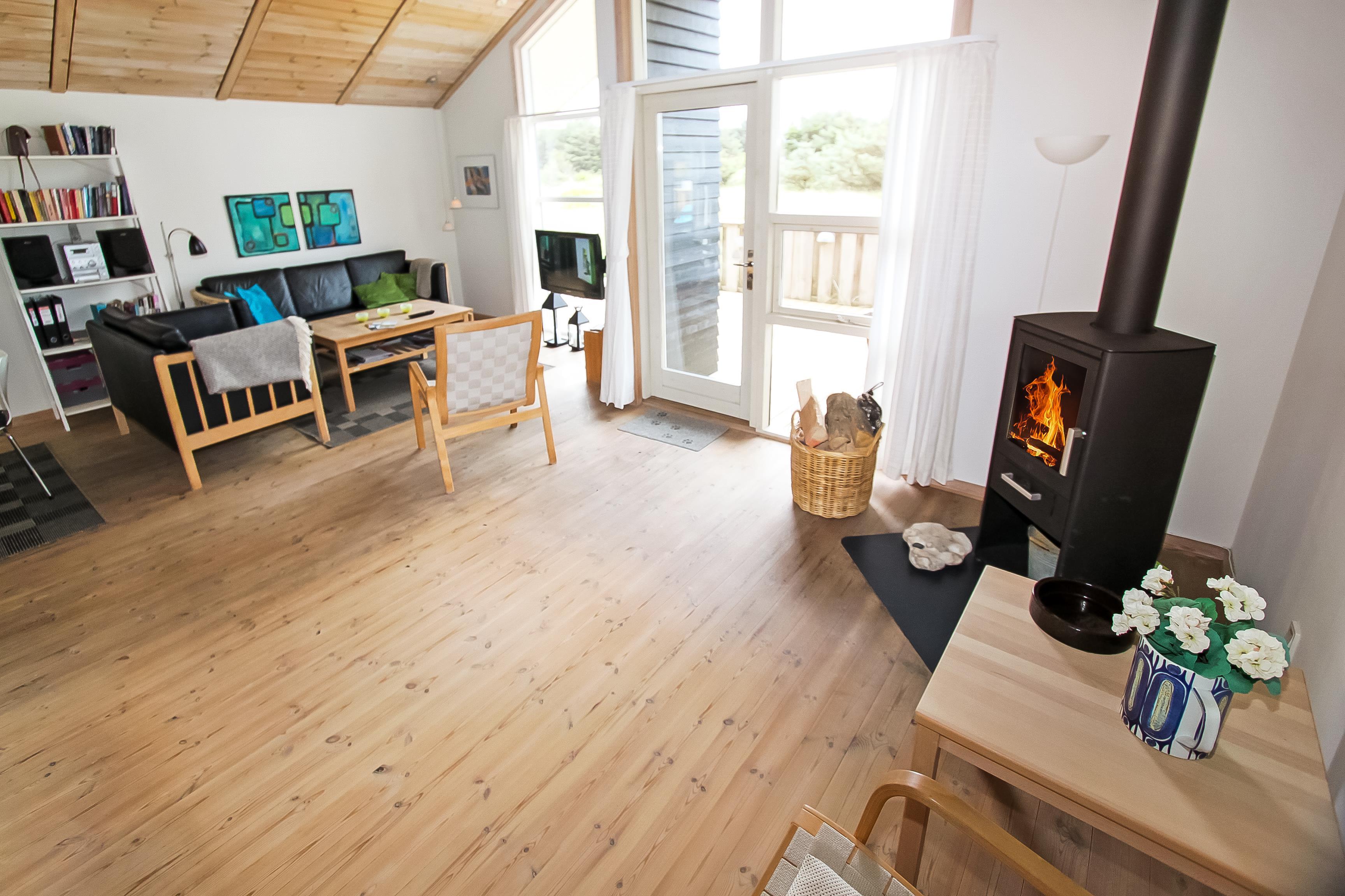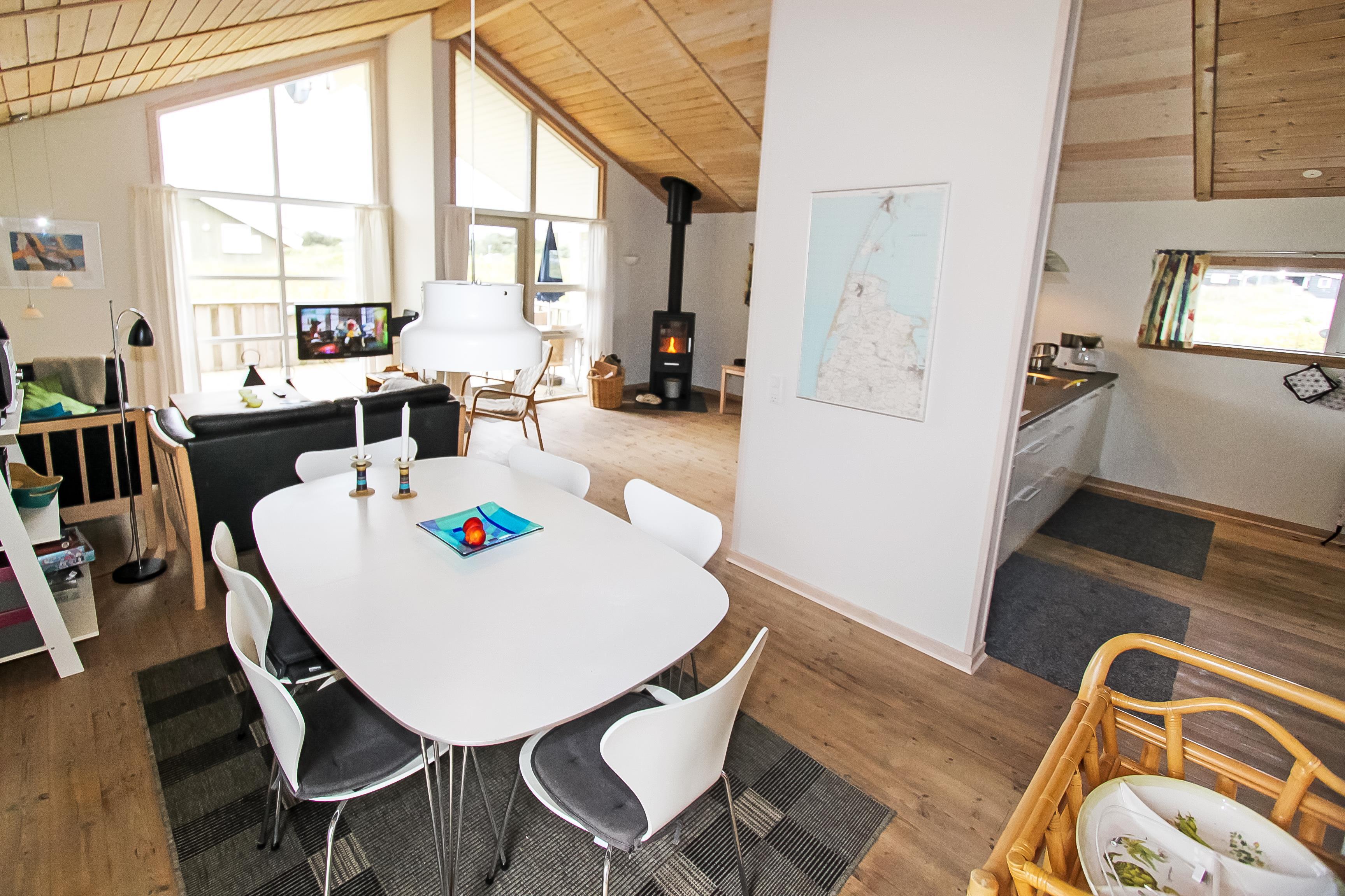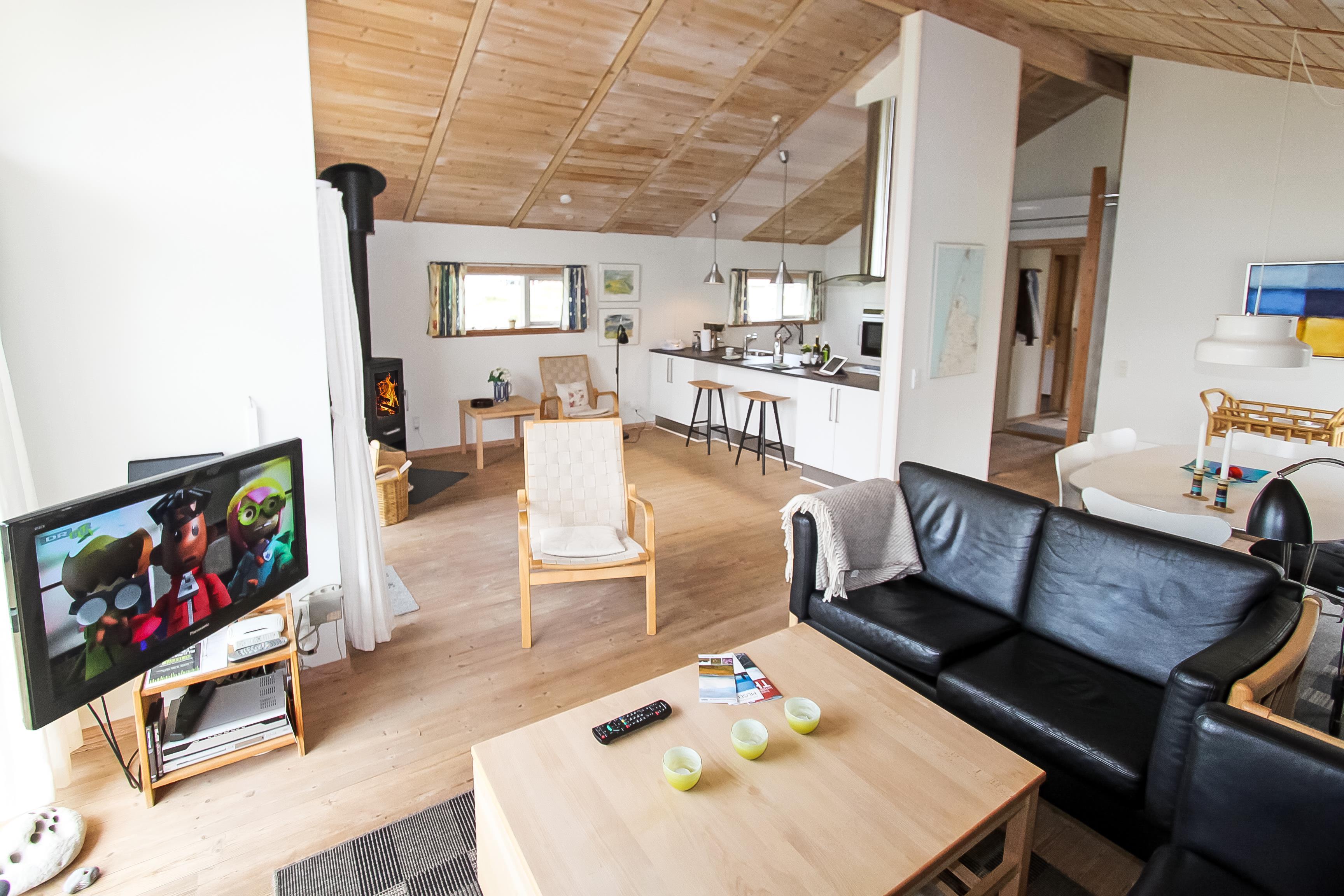 Lyst og venligt indrettet feriehus med trævægge, gulve og lofter som er åben til kip. De store panoramavinduer giver et dejligt lysindfald i stuen. Køkkenet som er kombineret med stuen er moderne og godt udstyret med keramisk kogeplade, opvaskemaskine, emhætte, indbygget ovn, køle-/fryseskab samt mikroovn, separat fryser på 100 l. Stuen er indrettet med lædermøbler, F-TV med danske og tyske programmer, CD og DVD afspiller, radio og en skøn brændeovn som sammen med varmepumpen sørger for en dejlig varme og er medvirkende til en billigere forbrugsregning. Stue og køkken er med trægulve. Der er 3 gode soverum: 1DS + 1DS + 1E. Samt en hems med 2 sovemuligheder. Dejligt stort badeværelse med toilet, håndvask, bruser, sauna og spabad, flisegulv. Vaskemaskine og tørretumbler forefindes også. Til de mindste gæster er der en barneseng og en barnestol. Husdyr er ikke tilladt. Ikke rygerhus. Gratis internetadgang.