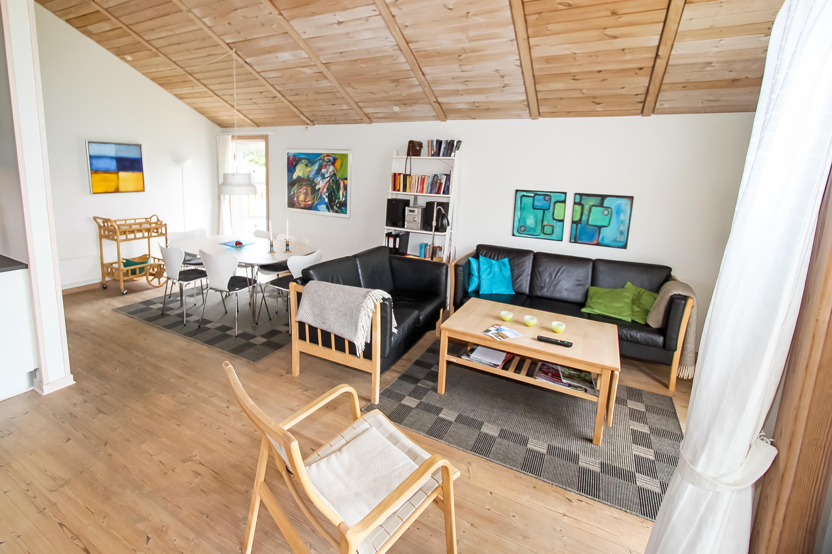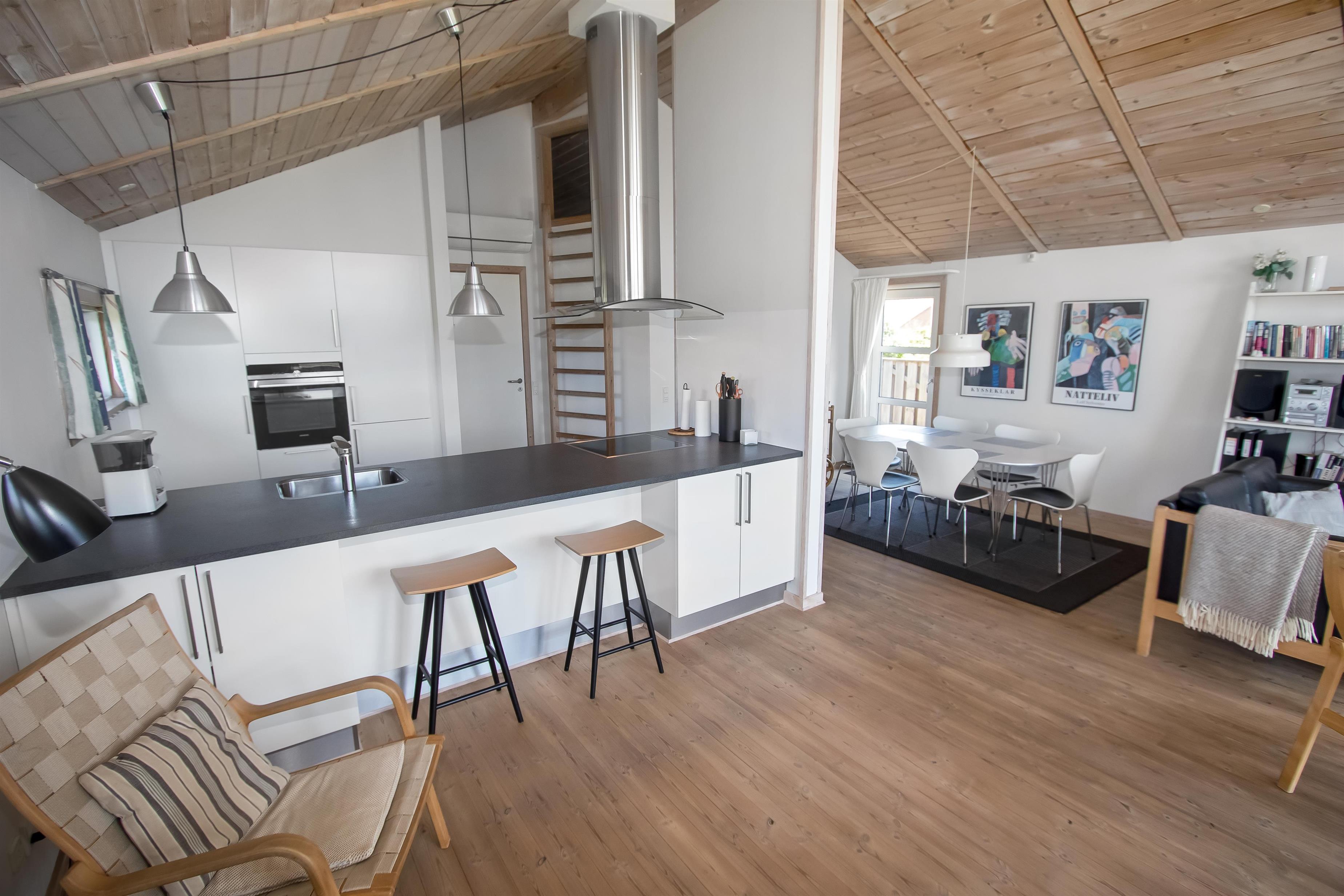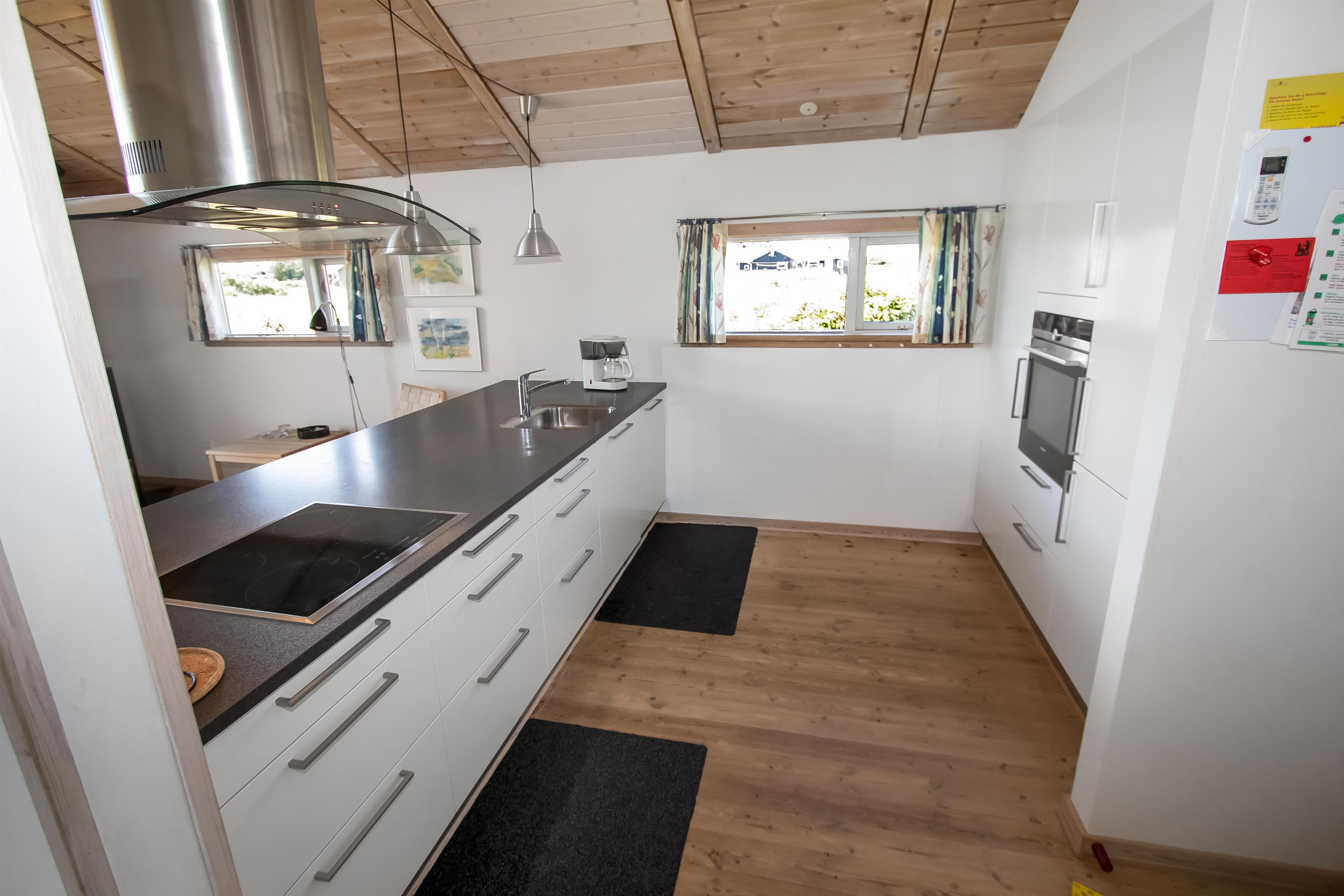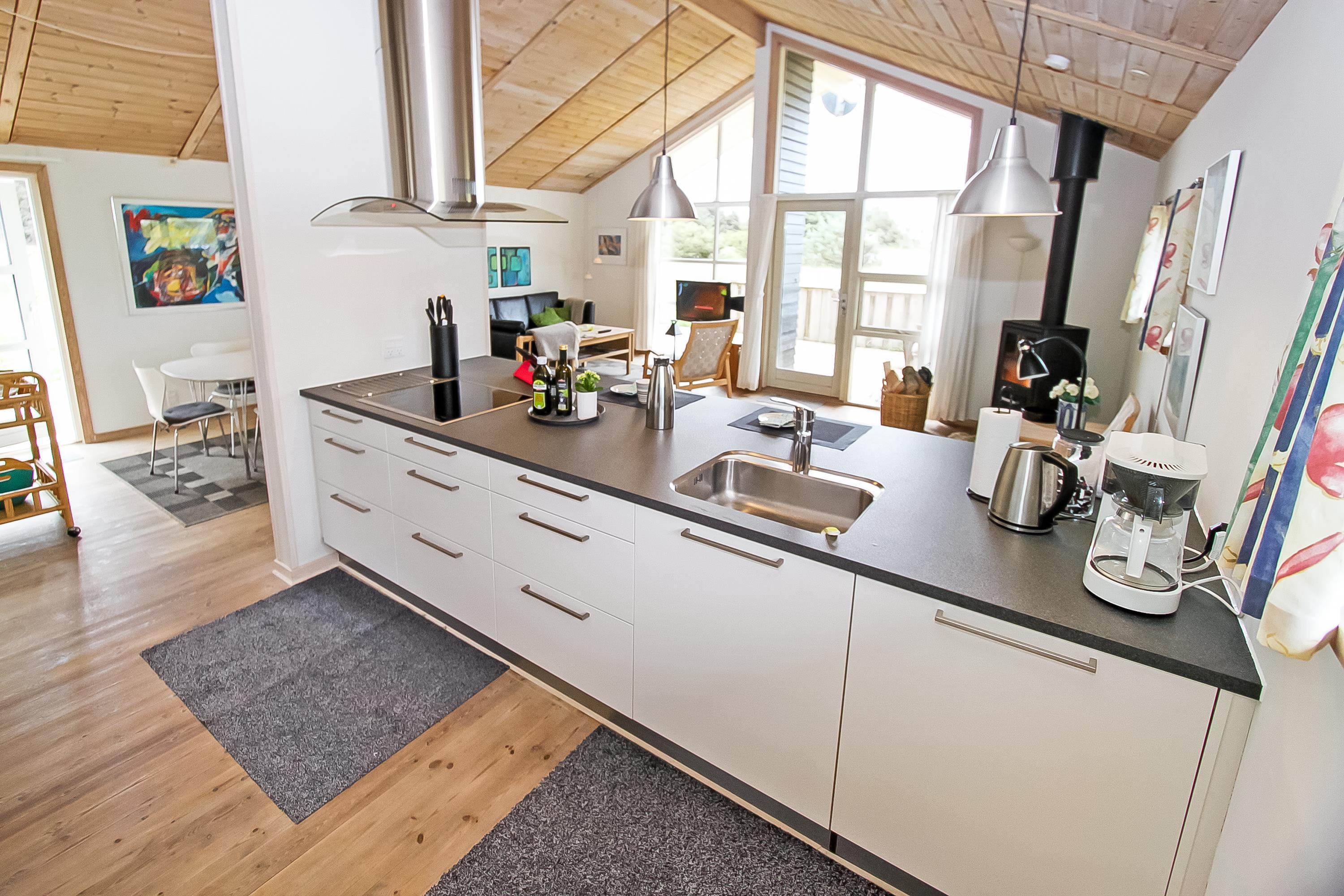 Lyst og venligt indrettet feriehus med trævægge, gulve og lofter som er åben til kip. De store panoramavinduer giver et dejligt lysindfald i stuen. Køkkenet som er kombineret med stuen er moderne og godt udstyret med keramisk kogeplade, opvaskemaskine, emhætte, indbygget ovn, køle-/fryseskab samt mikroovn, separat fryser på 100 l. Stuen er indrettet med lædermøbler, F-TV med danske og tyske programmer, CD og DVD afspiller, radio og en skøn brændeovn som sammen med varmepumpen sørger for en dejlig varme og er medvirkende til en billigere forbrugsregning. Stue og køkken er med trægulve. Der er 3 gode soverum: 1DS + 1DS + 1E. Samt en hems med 2 sovemuligheder. Dejligt stort badeværelse med toilet, håndvask, bruser, sauna og spabad, flisegulv. Vaskemaskine og tørretumbler forefindes også. Til de mindste gæster er der en barneseng og en barnestol. Husdyr er ikke tilladt. Ikke rygerhus. Gratis internetadgang.