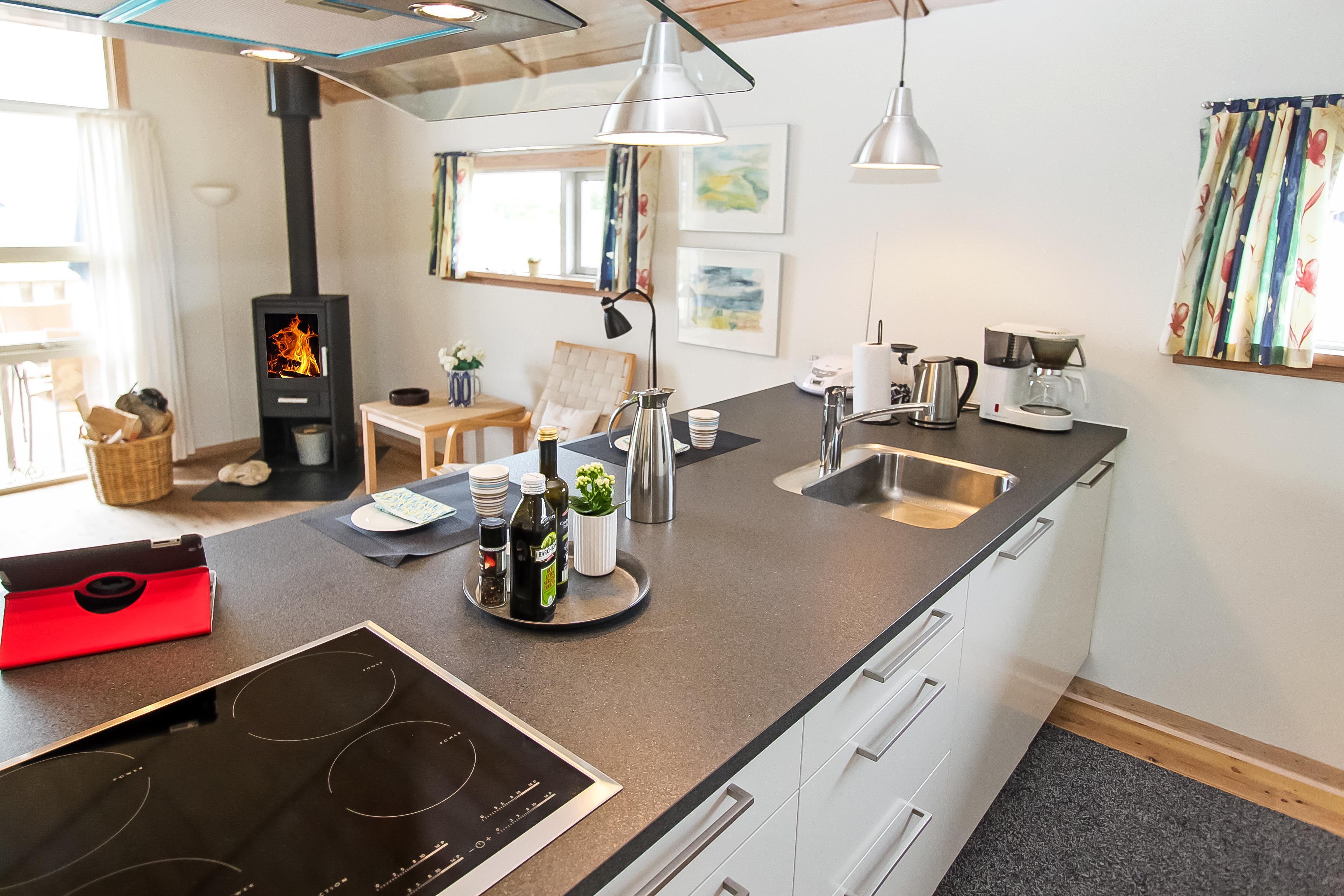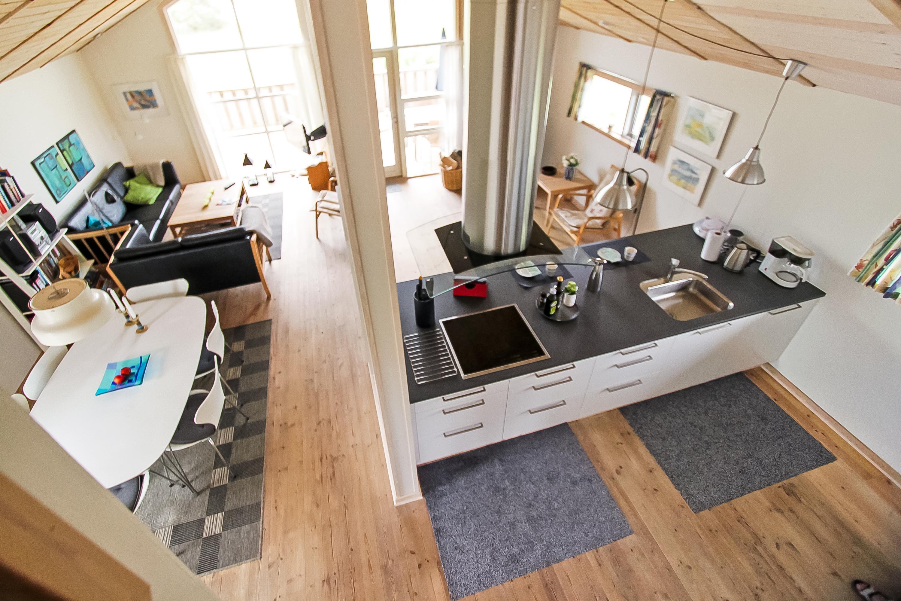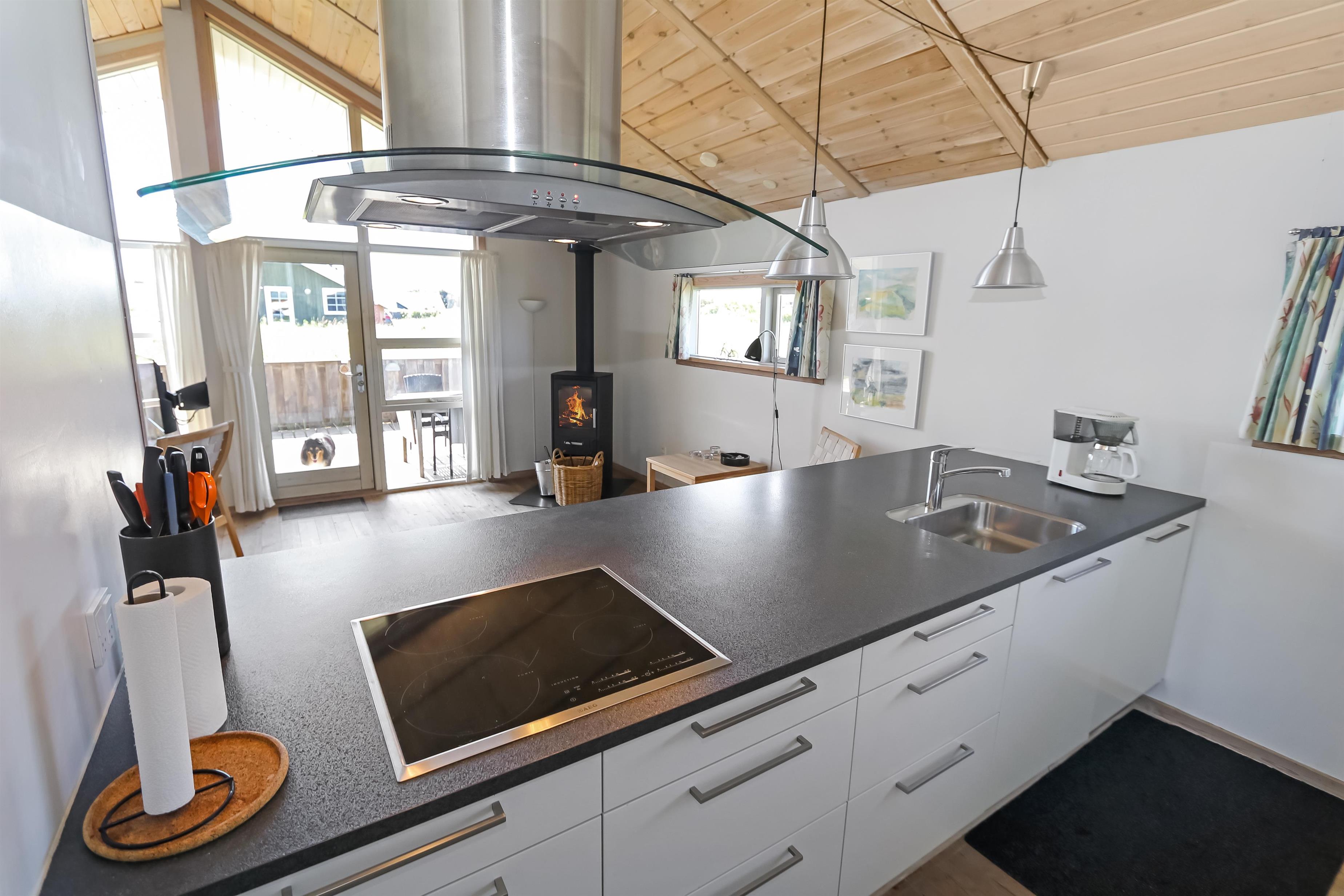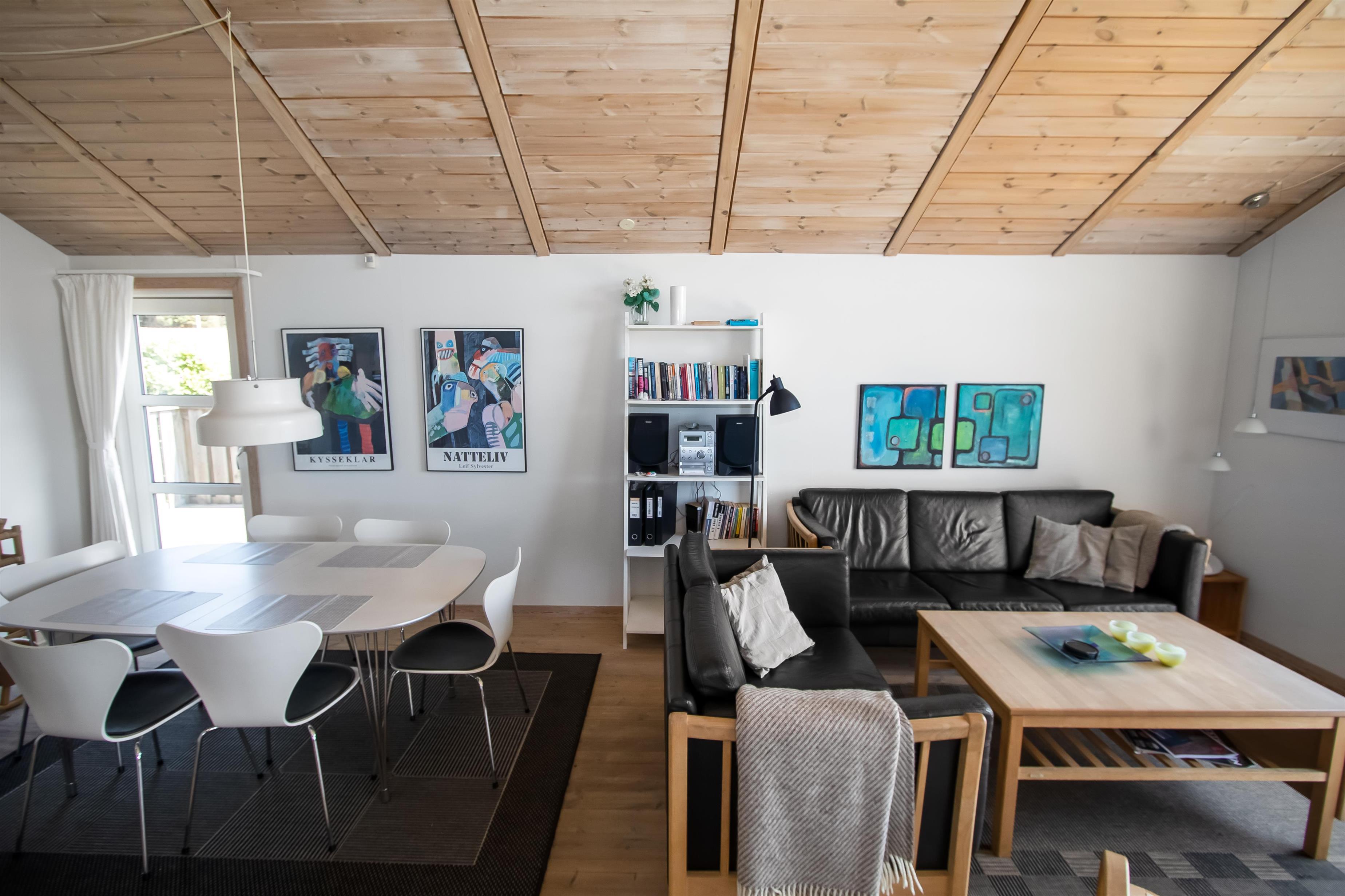 Lyst og venligt indrettet feriehus med trævægge, gulve og lofter som er åben til kip. De store panoramavinduer giver et dejligt lysindfald i stuen. Køkkenet som er kombineret med stuen er moderne og godt udstyret med keramisk kogeplade, opvaskemaskine, emhætte, indbygget ovn, køle-/fryseskab samt mikroovn, separat fryser på 100 l. Stuen er indrettet med lædermøbler, F-TV med danske og tyske programmer, CD og DVD afspiller, radio og en skøn brændeovn som sammen med varmepumpen sørger for en dejlig varme og er medvirkende til en billigere forbrugsregning. Stue og køkken er med trægulve. Der er 3 gode soverum: 1DS + 1DS + 1E. Samt en hems med 2 sovemuligheder. Dejligt stort badeværelse med toilet, håndvask, bruser, sauna og spabad, flisegulv. Vaskemaskine og tørretumbler forefindes også. Til de mindste gæster er der en barneseng og en barnestol. Husdyr er ikke tilladt. Ikke rygerhus. Gratis internetadgang.