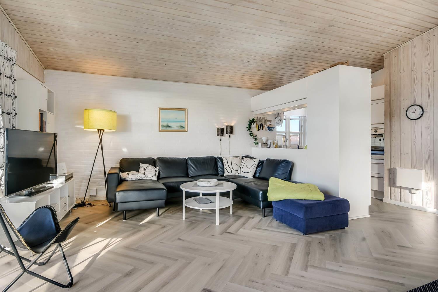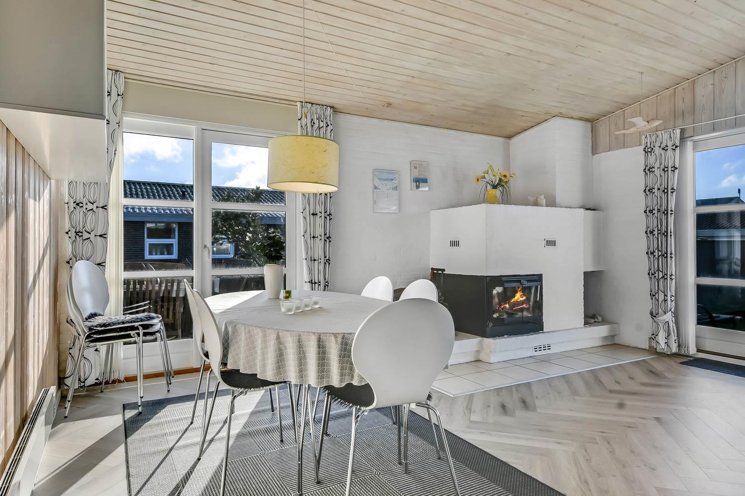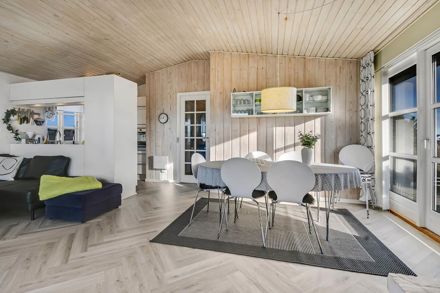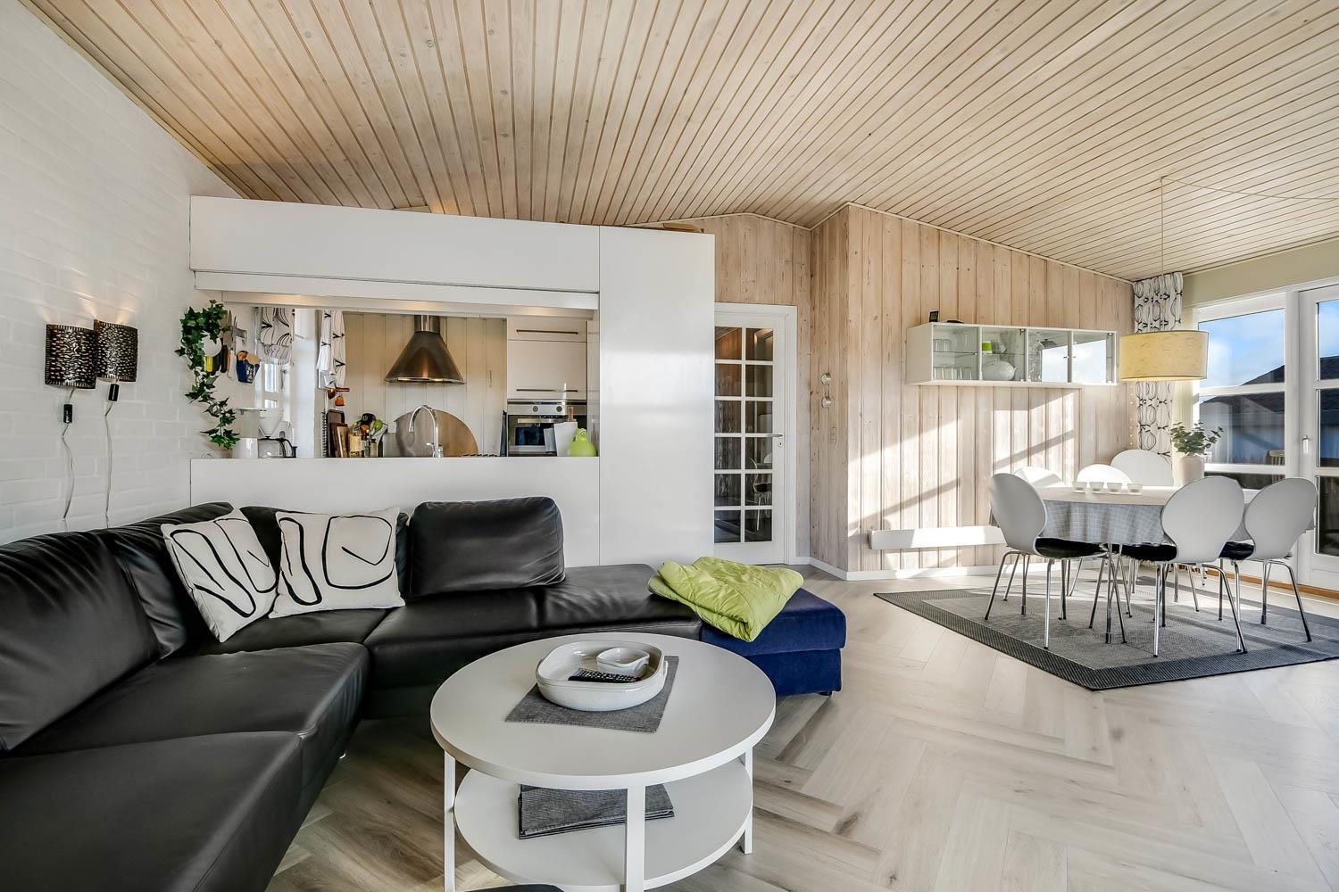 Pænt indrettet feriehus med kombineret opholdsstue og køkken. Stuen er indrettet med lædermøbler, Smart-TV med danske og tyske programmer og en skøn brændeovn, som sammen med varmepumpen sørger for en behagelig varme og begge er medvirkende til en lavere forbrugsafregning. Tæt på køkkenet er spisebordet placere. Åben køkken med glaskeramisk komfur, køle-/fryseskab, emhætte, opvaskemaskine og mikroovn. Stue og køkken er med nyt sildebenspaketgulv. 3 soverum: 1DS + 1DS + 2S og alle soverum er med nyt sildebenspaketgulv. Nyrenoveret badeværelse med toilet, håndvask, bruser samt adgang til sauna og med gulvvarme. Til de mindste gæster er der 1 barneseng og 1 barnestol. Ikke rygerhus. 1 husdyr er tilladt.
