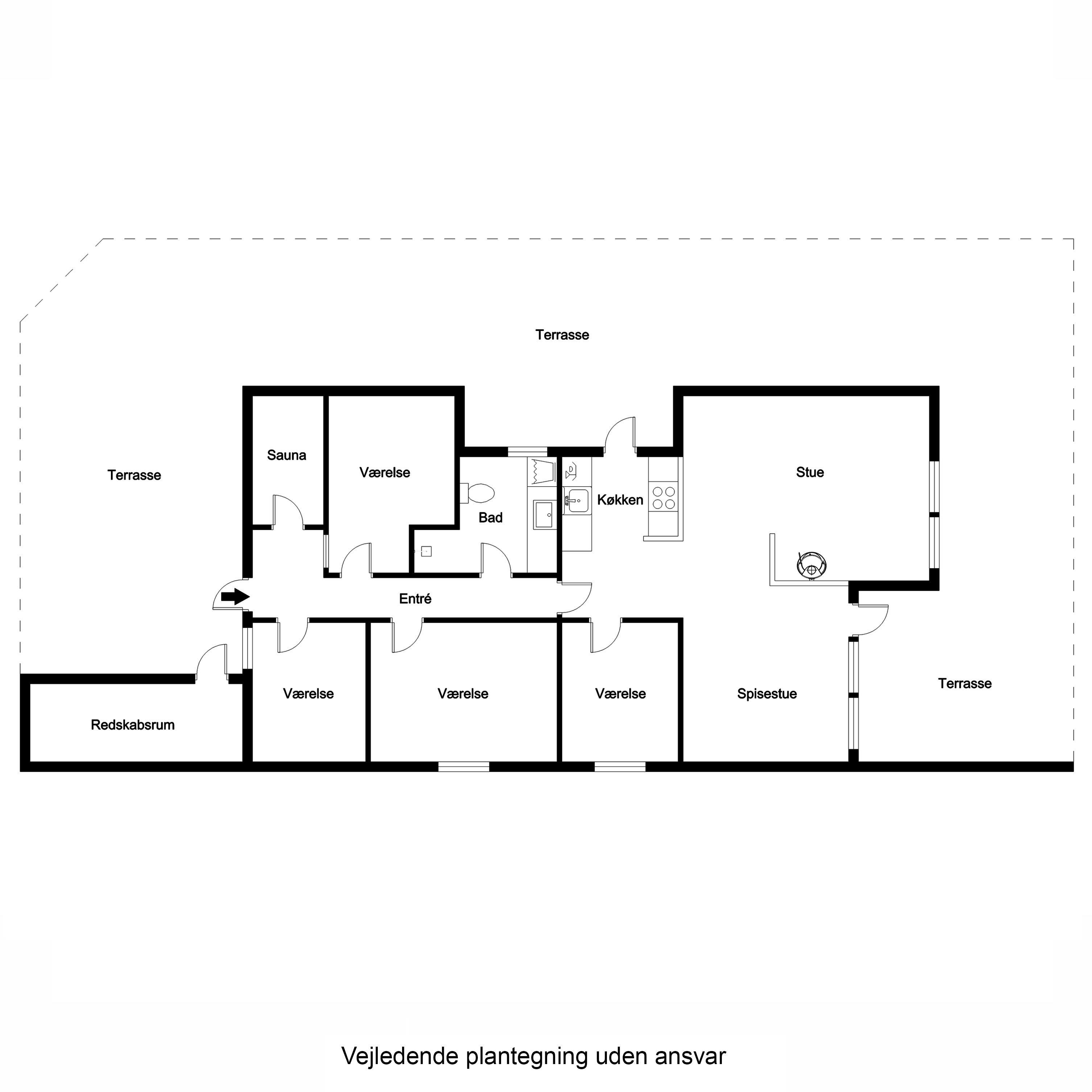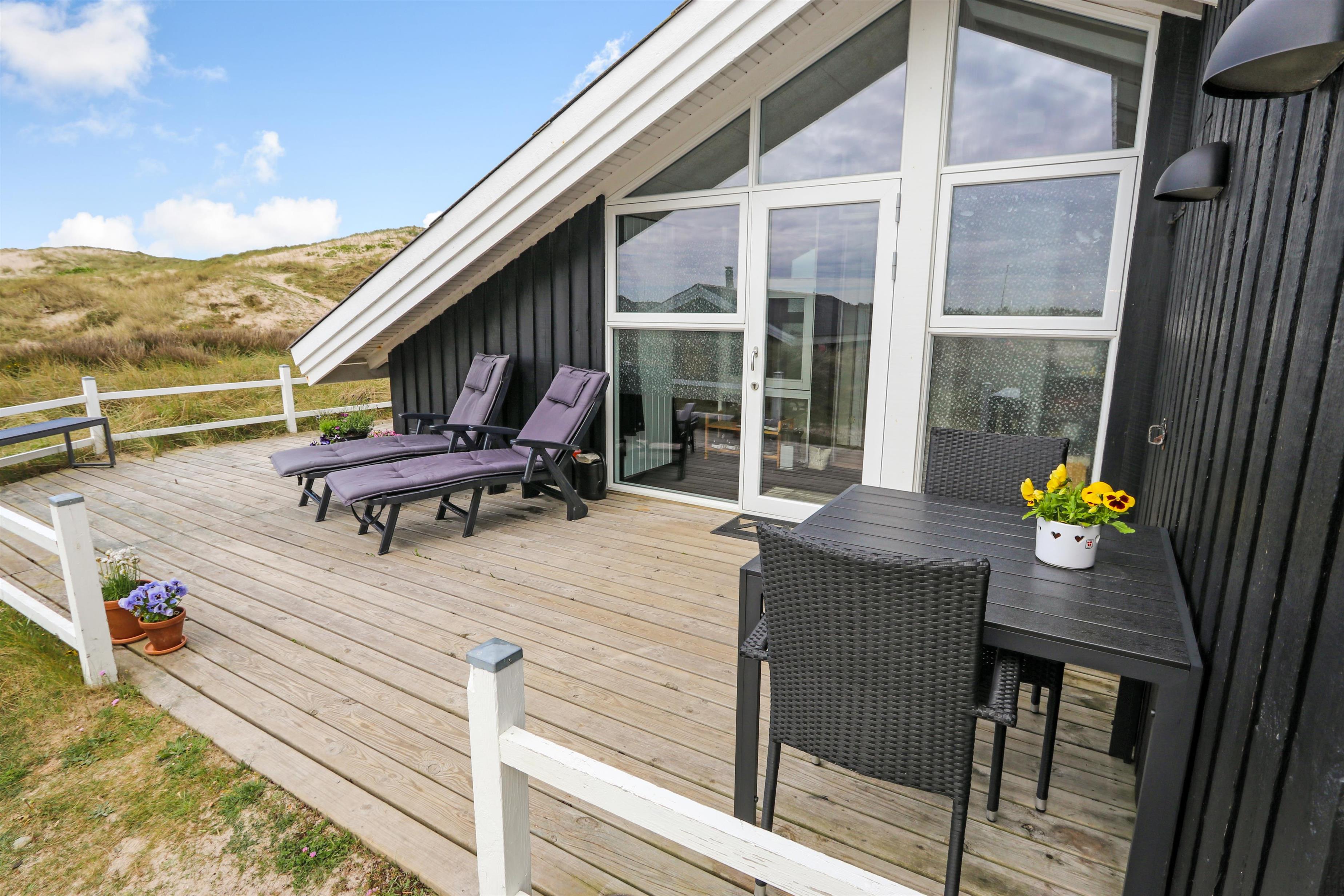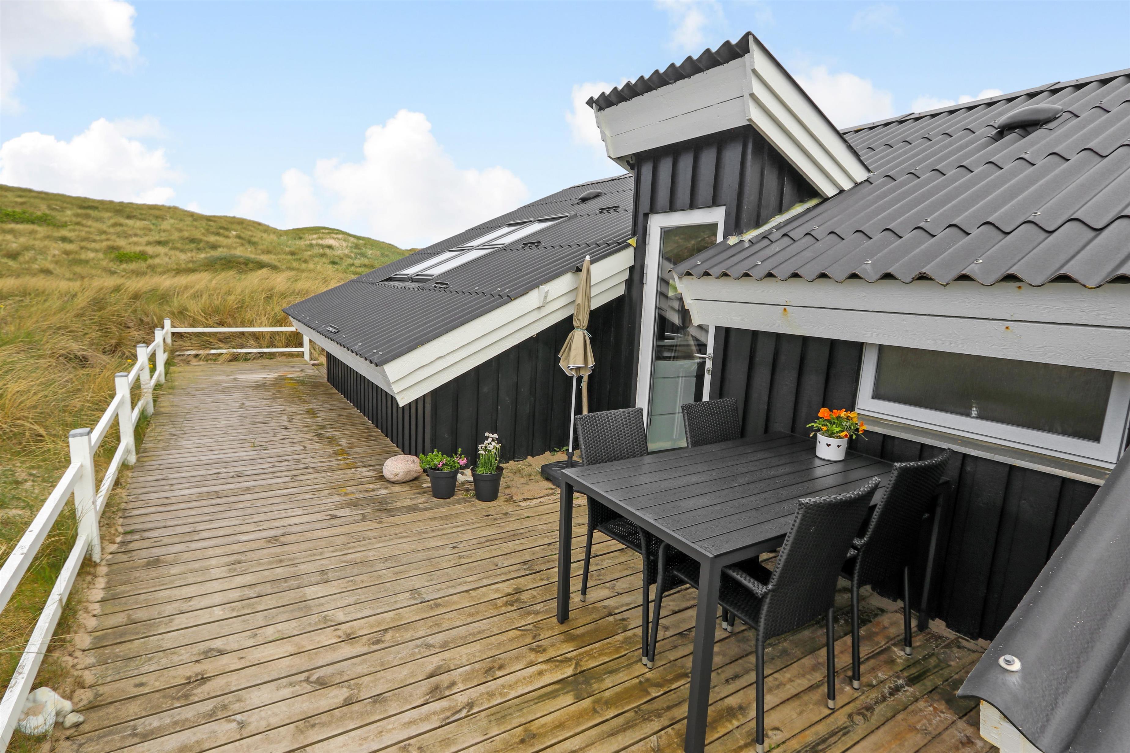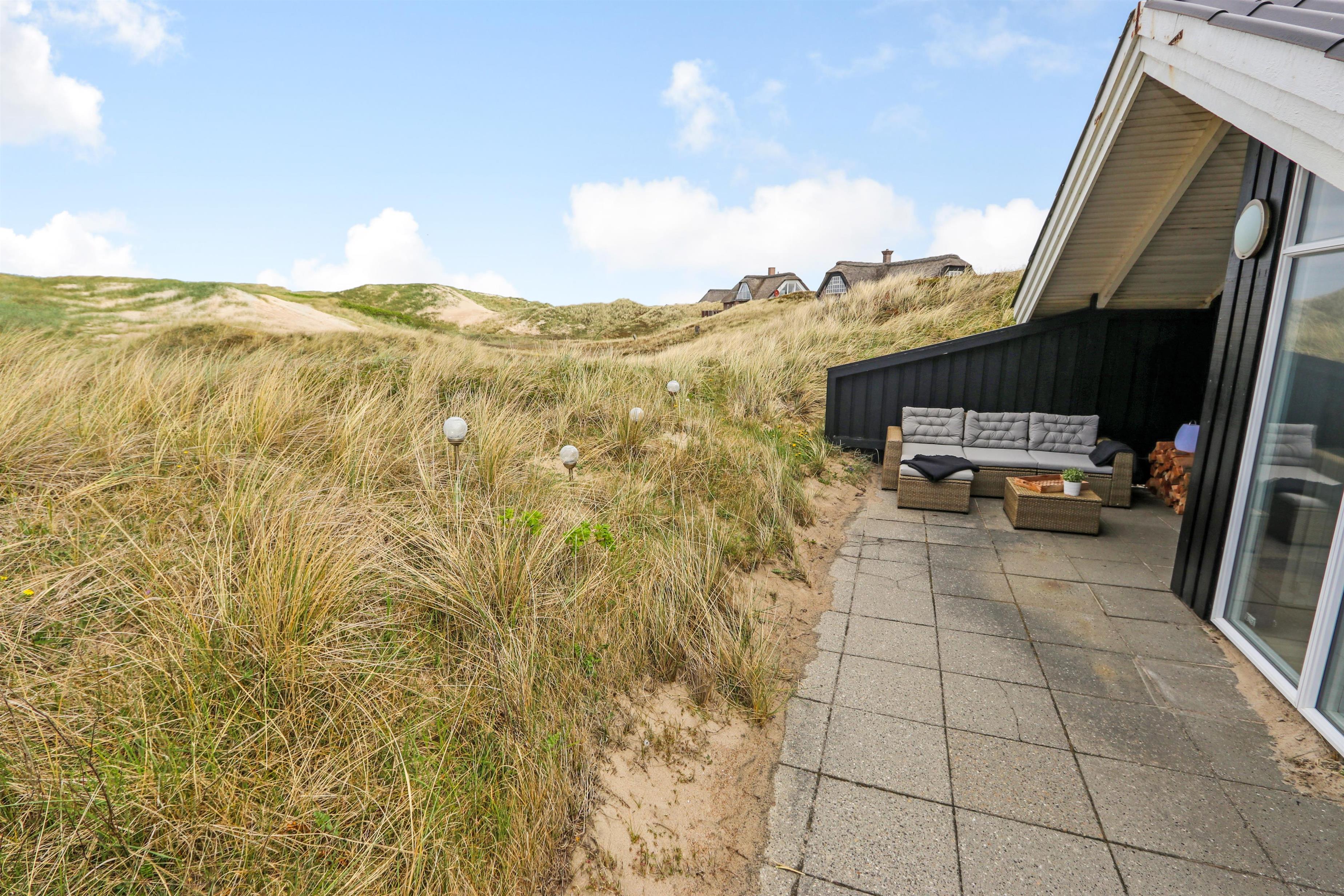 Fra huset er der udgang til en stor terrasse som omgiver det meste af huset, her kan man nyde solen og altid finde et sted med læ. Fra terrassen kan man høre havets brusen. Der er havemøbler, solvogne og grill til rådighed. Fra huset er der blot 20 m til den hvide sandstrand, så fra grunden er der direkte adgang til Vesterhavet. Her kan man gå lange ture og søge efter sten og rav eller ligge sig i en "gryde" og nyde solen og havet. Eller gå op og sætte sig i klitterne og nyde solnedgangen over Vesterhavet. Adgang til Harboøre Centeret.