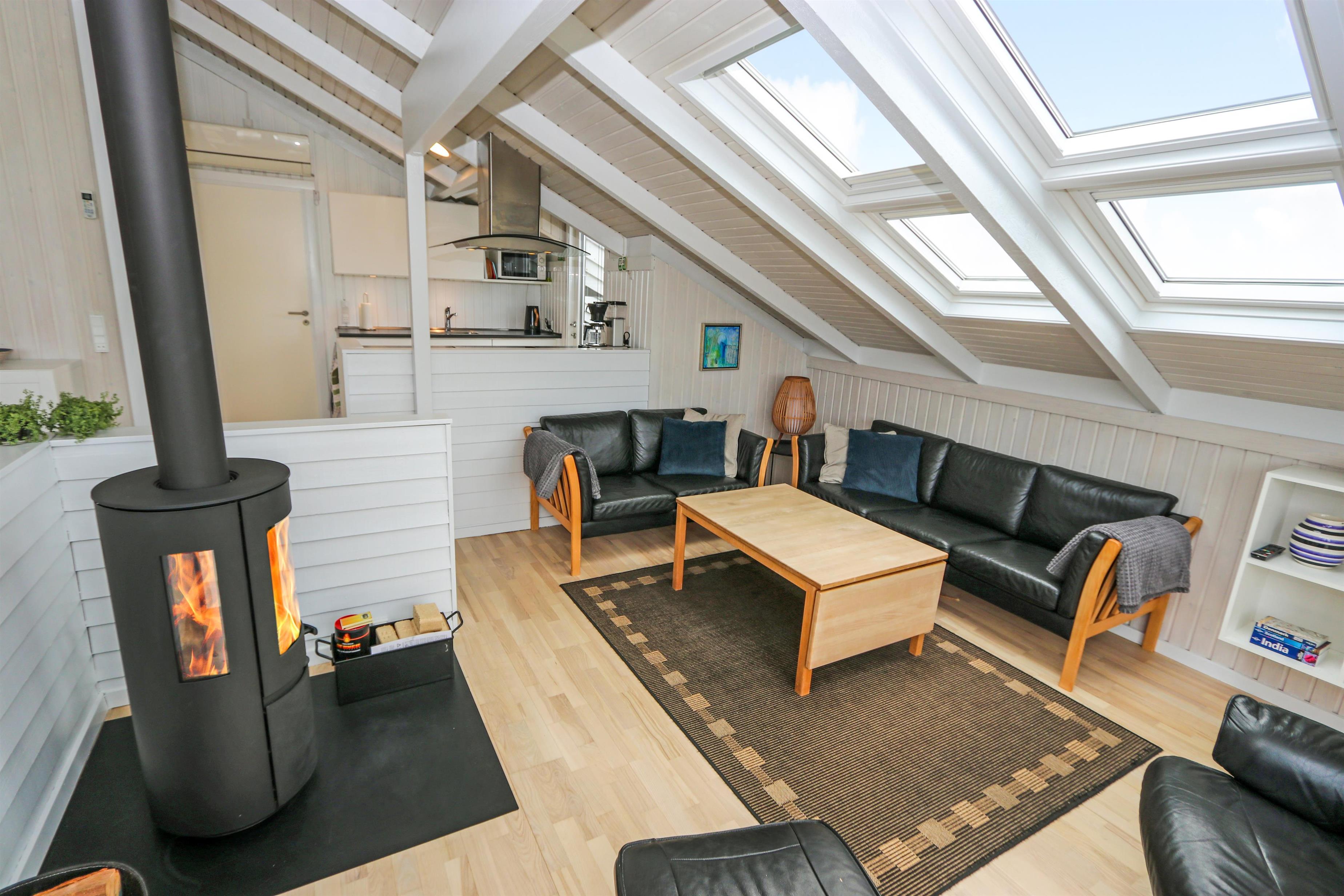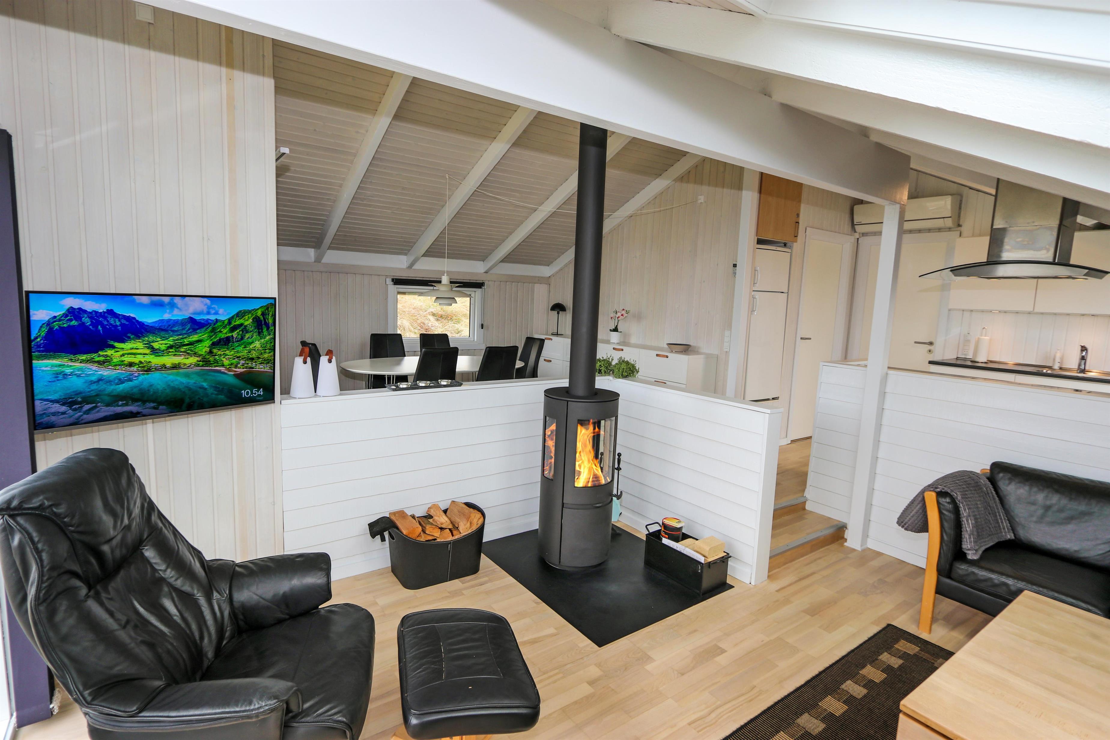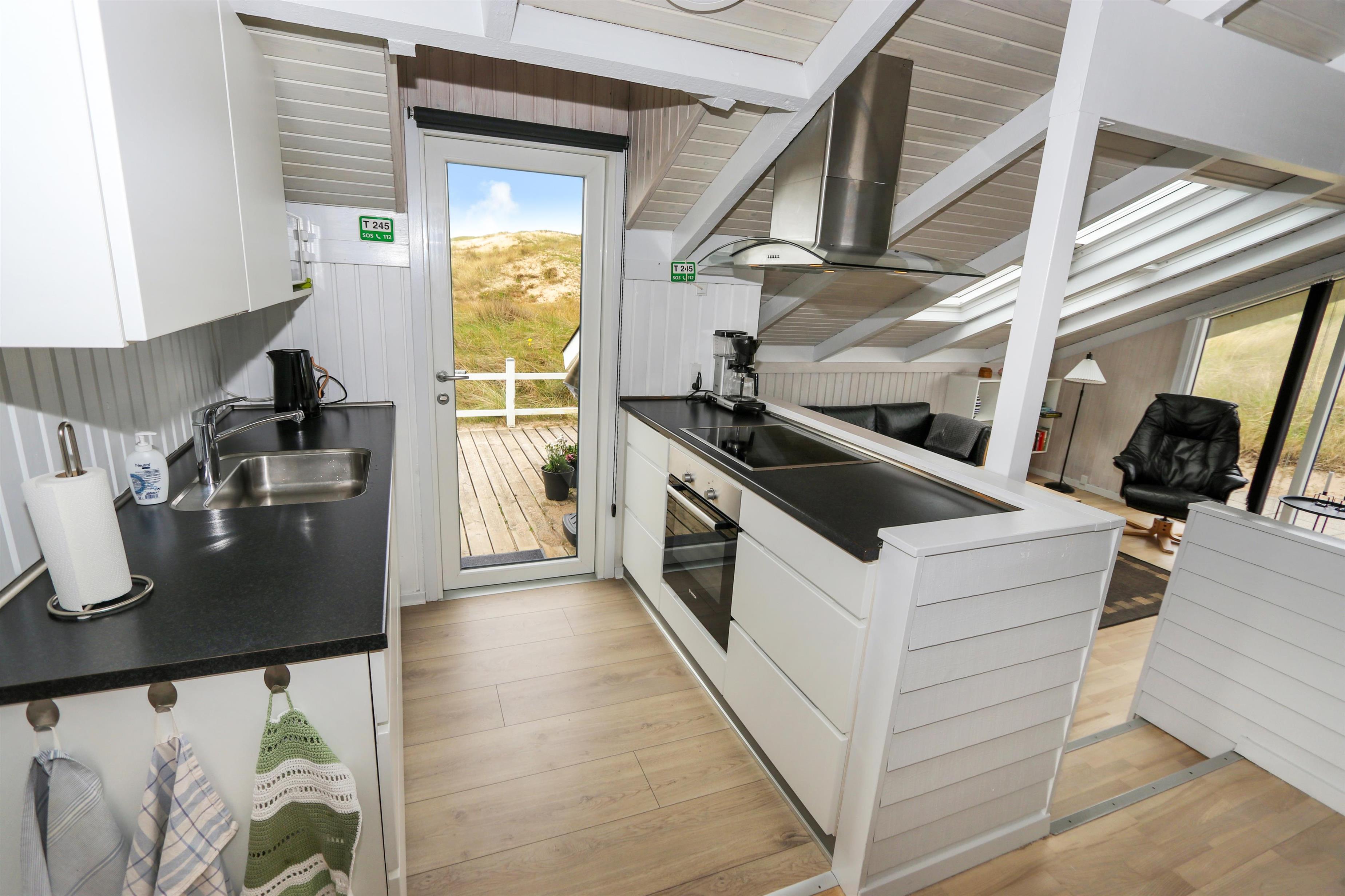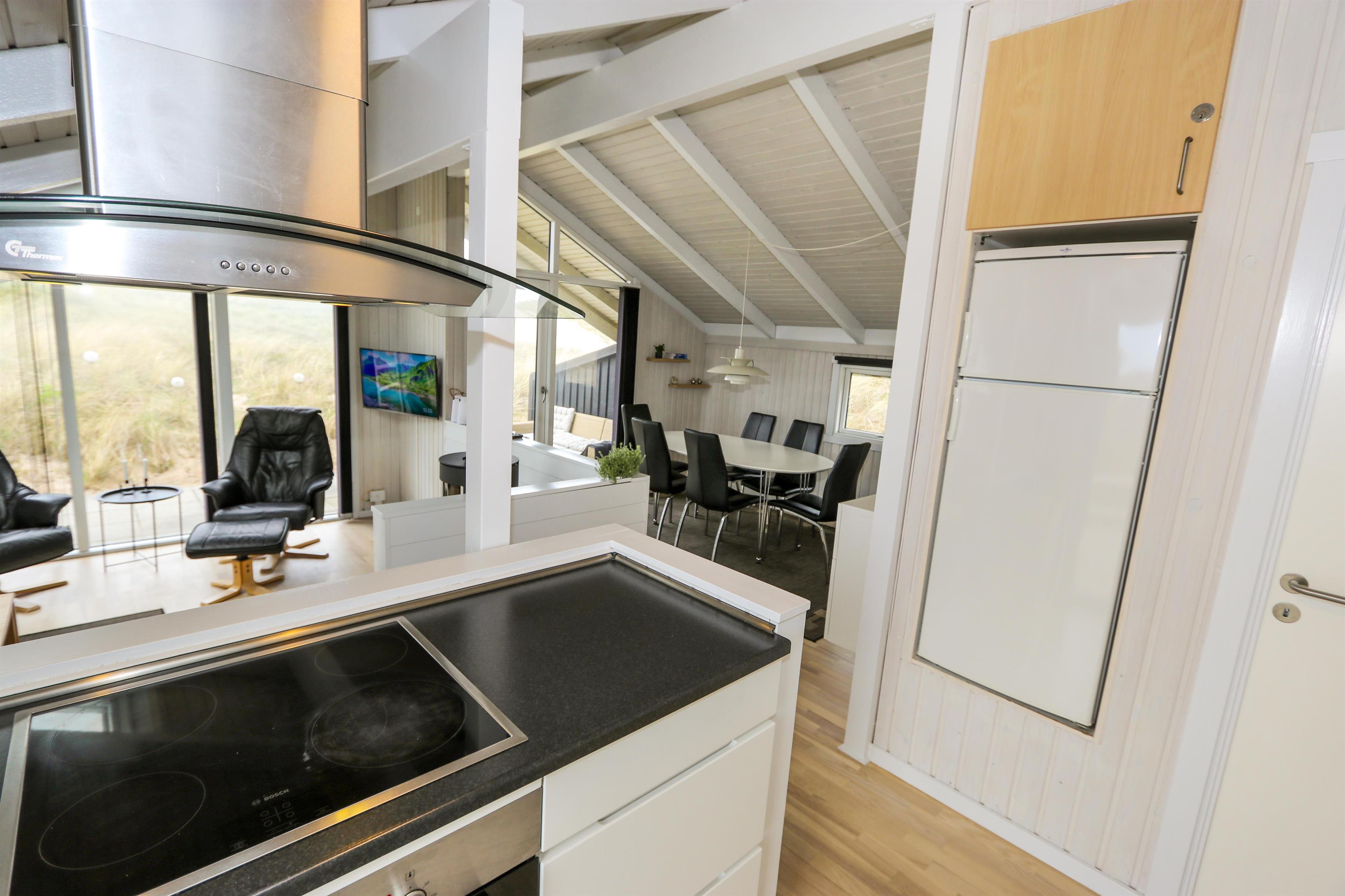 Godt indrettet køkkenafdeling med alle tænkelige hjælpemidler bl.a. opvaskemaskine, mikroovn og køle-fryseskab. Køkkenet er kombineret med opholds-/spisestuen. Opholdsstuen som er forsænket i forhold til køkken og spiseafdeling er med komfortable møbler og fladskærms-TV med DR1 og parabol til de tyske kanaler samt CD-afspiller. Sæt dig i sofaen og tænd op i brændeovnen og lyt til brændeovnens knitren og nyd udsigten til klitterne, det er hvad en afslappende ferie i dette hus også kan tilbyde. Huset har installeret en varmepumpe, som gør det energibesparende. 3 soverum med 1DS + 1DS + 2S. Badeværelse med bruser, toilet, håndvask og sauna og vaskemaskine. Husdyr er ikke tilladt. Har i en elbil så er der opsat oplader ved huset.