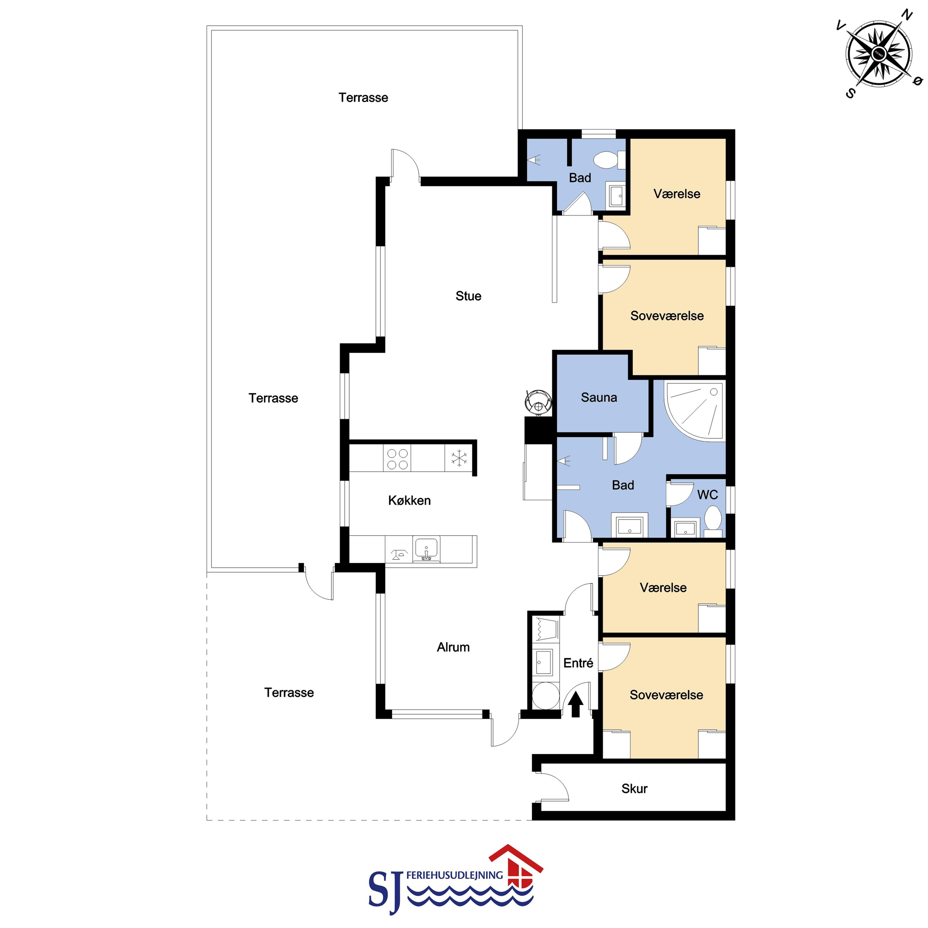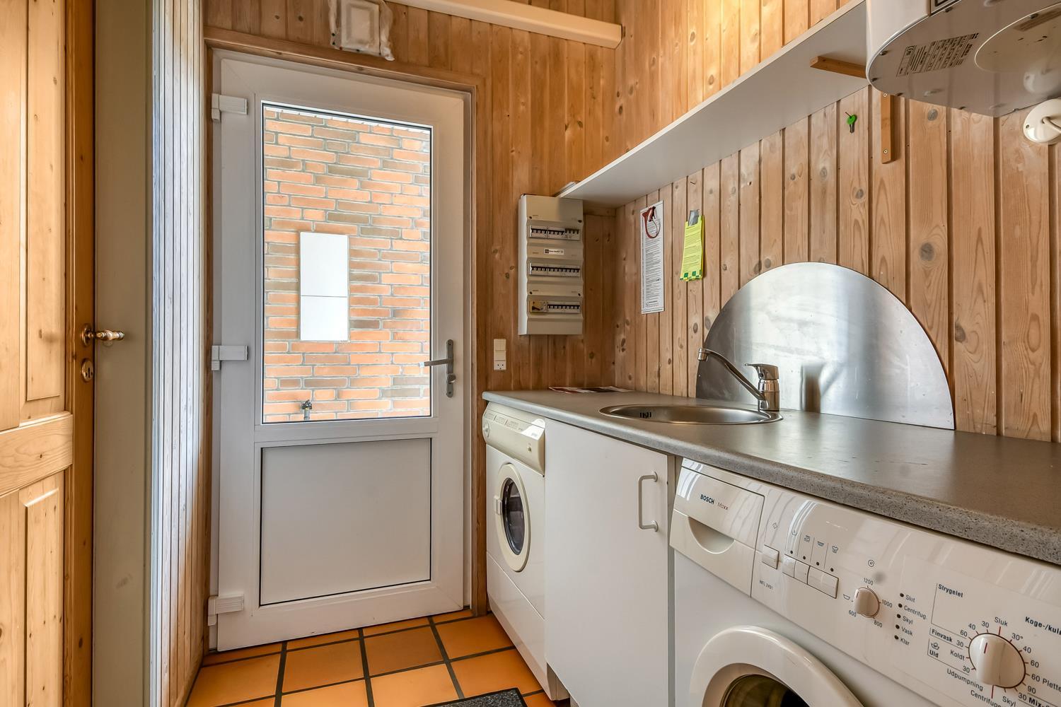 Stuen er varm og hyggelig med gulvtæppe og delvis træbeklædning på væggene. Der er en hyggekrog med behagelige sofamøbler med sofabord samt brændeovn. Der er ligeledes en fladskærm med DVD-afspiller og parabol med tyske kanaler. Herudover er der stereoanlæg med CD. Køkkenet er godt udstyret med elektrisk komfur, mikrobølgeovn, opvaskemaskine, køle/fryseskab og separat fryser på 90 liter. Hertil er der en krog med store vinduespaneler og spisebord. Her er hele 2 badeværelser hvoraf det ene er med toilet, håndvask, bruser, spabad, sauna, vaskemaskine og tørretumbler og det andet er mere enkelt med blot toilet, håndvask og bruser. Der er 4 soveværelser: 3 med dobbeltsenge og en med 2 køjepladser. Der er installeret varmepumpe i huset og det betyder at du som gæst kan spare en del på din elvarmeregning - varmepumpen leverer op til 4 gange så meget effekt som den bruger, det betyder at for hver kilowatt-time pumpen bruger yder den varme svarende til ca. 4 kW energien udnyttes dermed langt bedre.