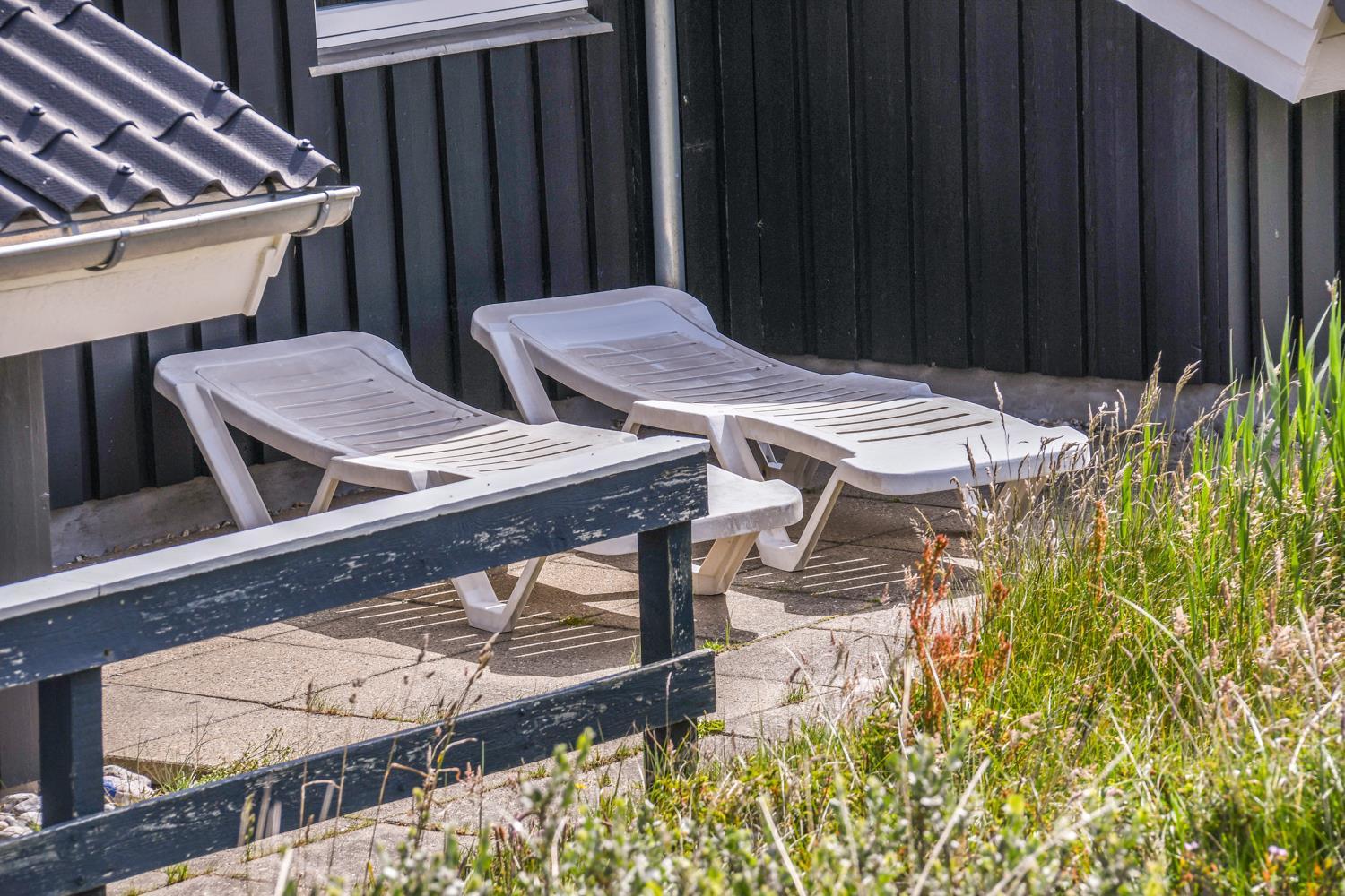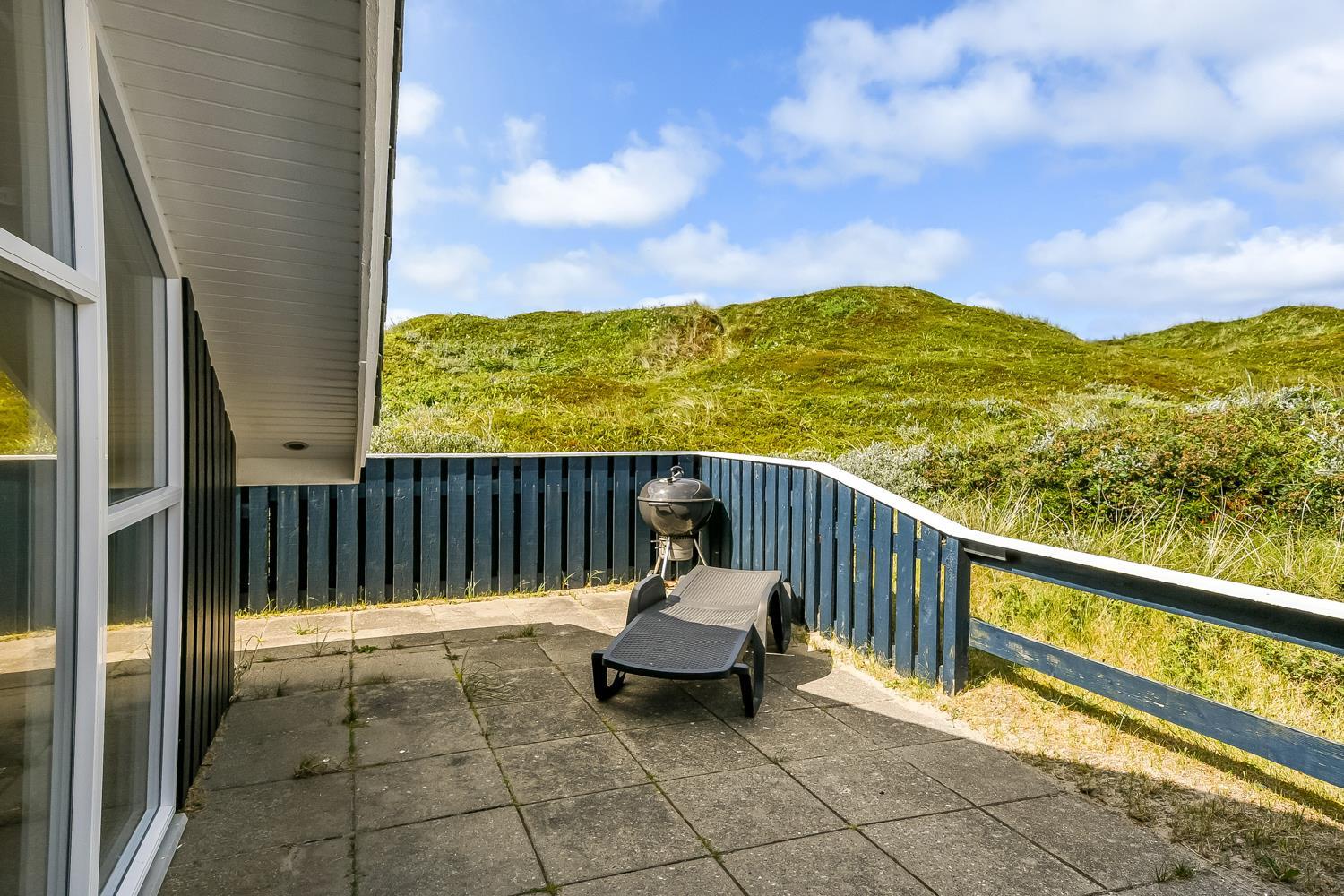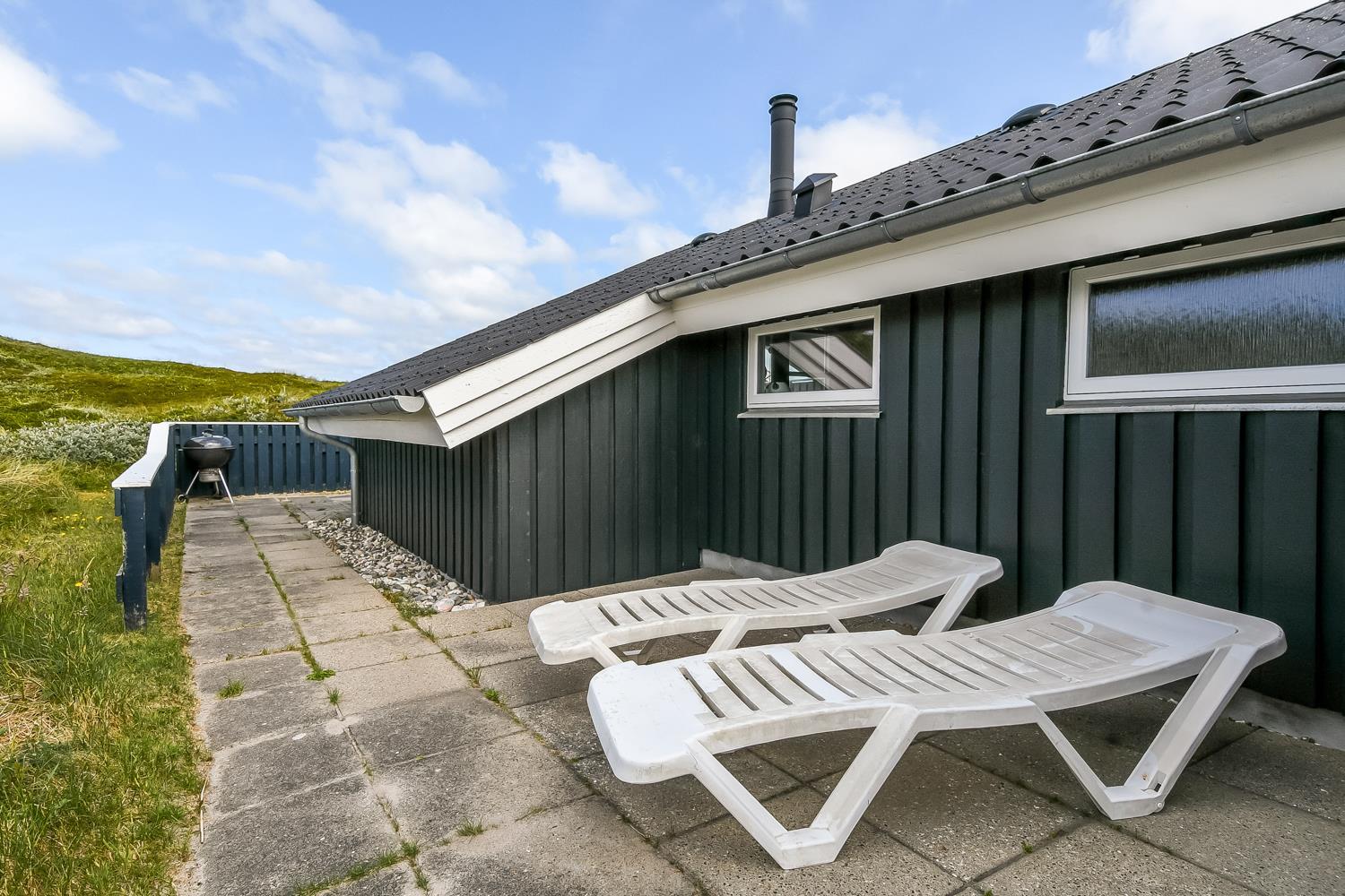 Den overdækkede vestvendte terrasse vender væk fra vejen og ind mod klitten, så man kan ligge forholdsvis uforstyrret på een af de 4 solvogne. Havemøbler og grill er også standard, så der er virkelig basis for mange hyggelige timer tæt på naturen i komfortable omgivelser.