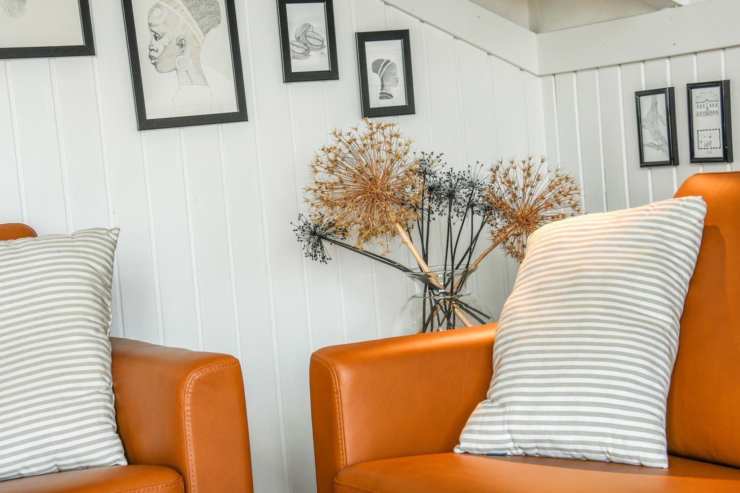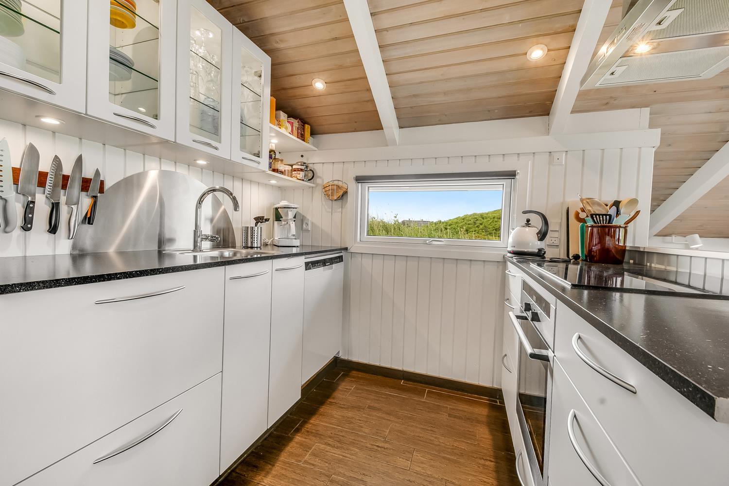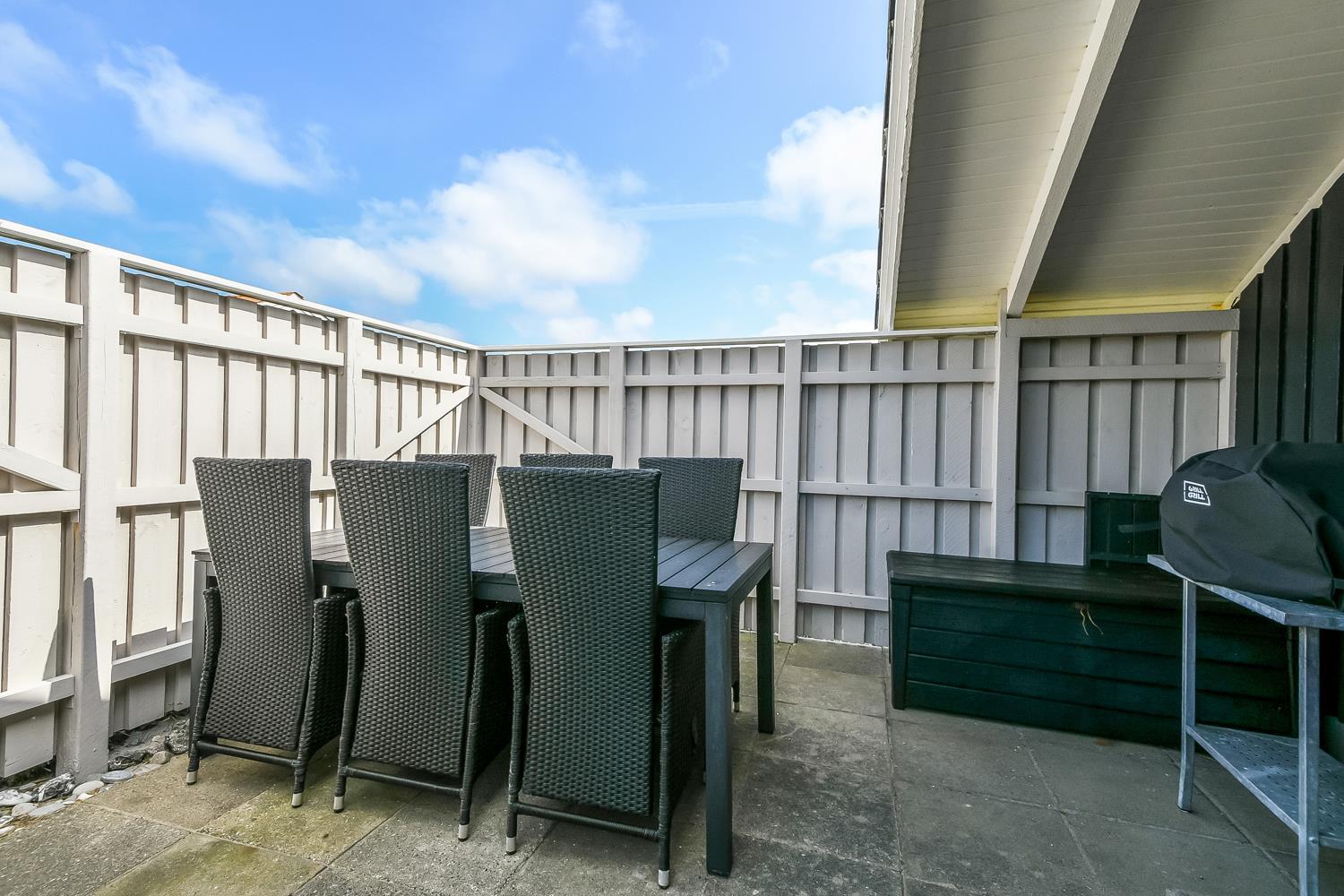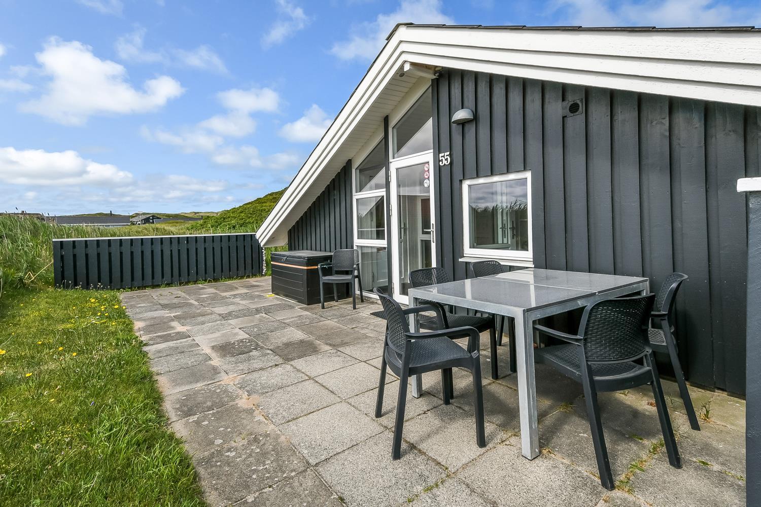 Den overdækkede vestvendte terrasse vender væk fra vejen og ind mod klitten, så man kan ligge forholdsvis uforstyrret på een af de 4 solvogne. Havemøbler og grill er også standard, så der er virkelig basis for mange hyggelige timer tæt på naturen i komfortable omgivelser.