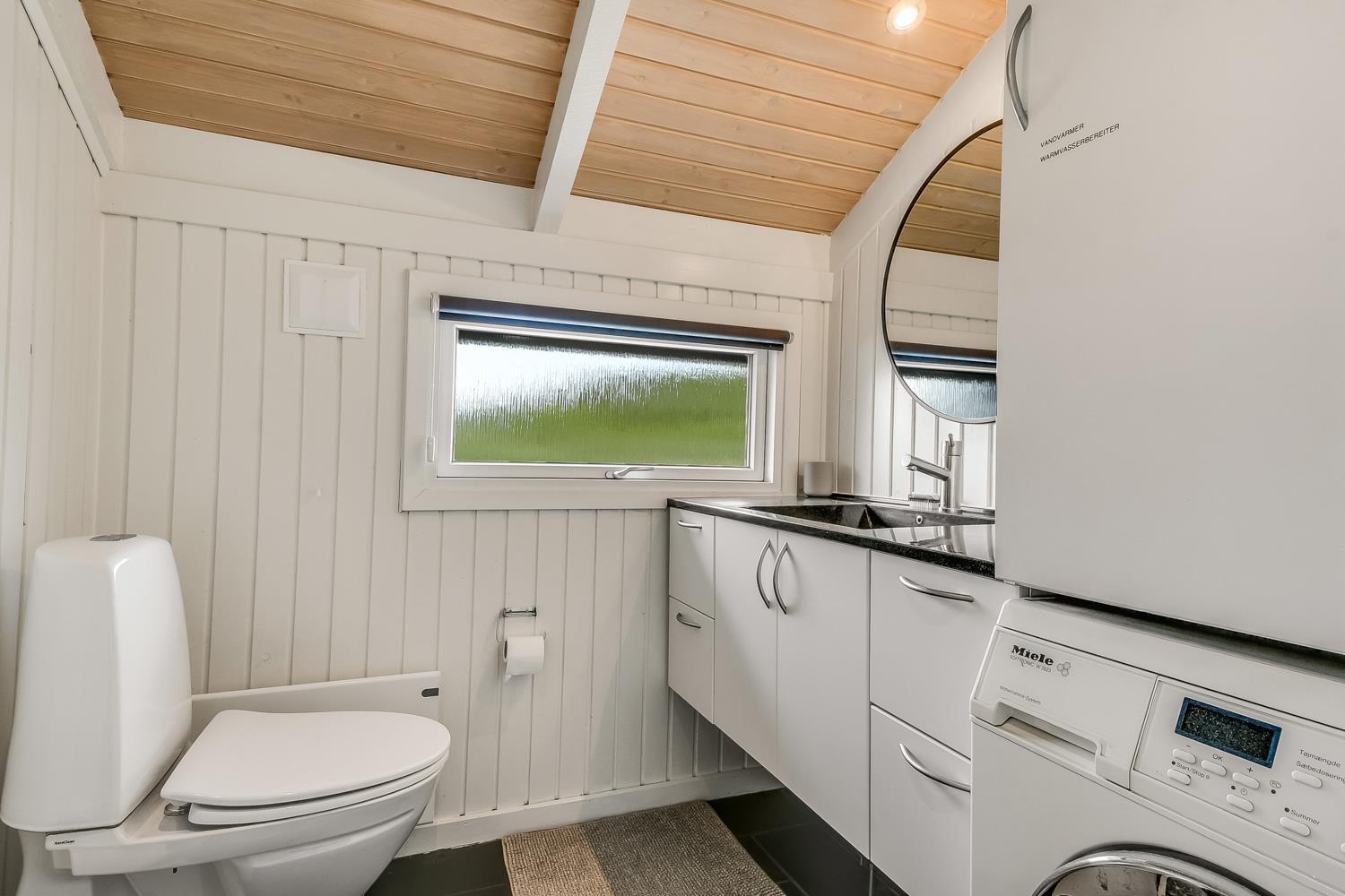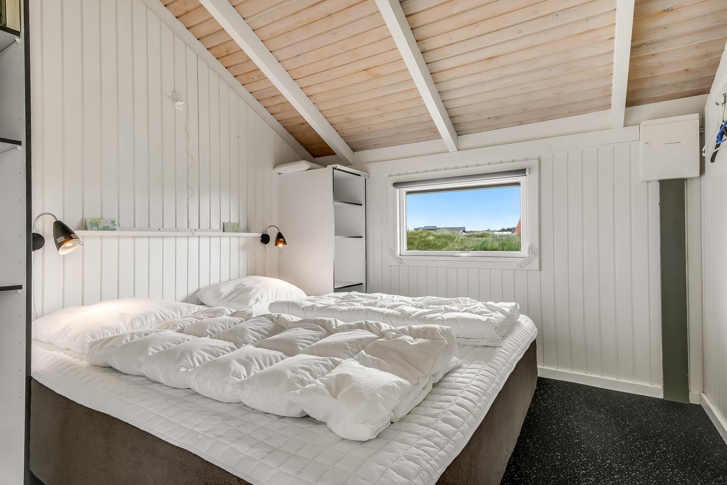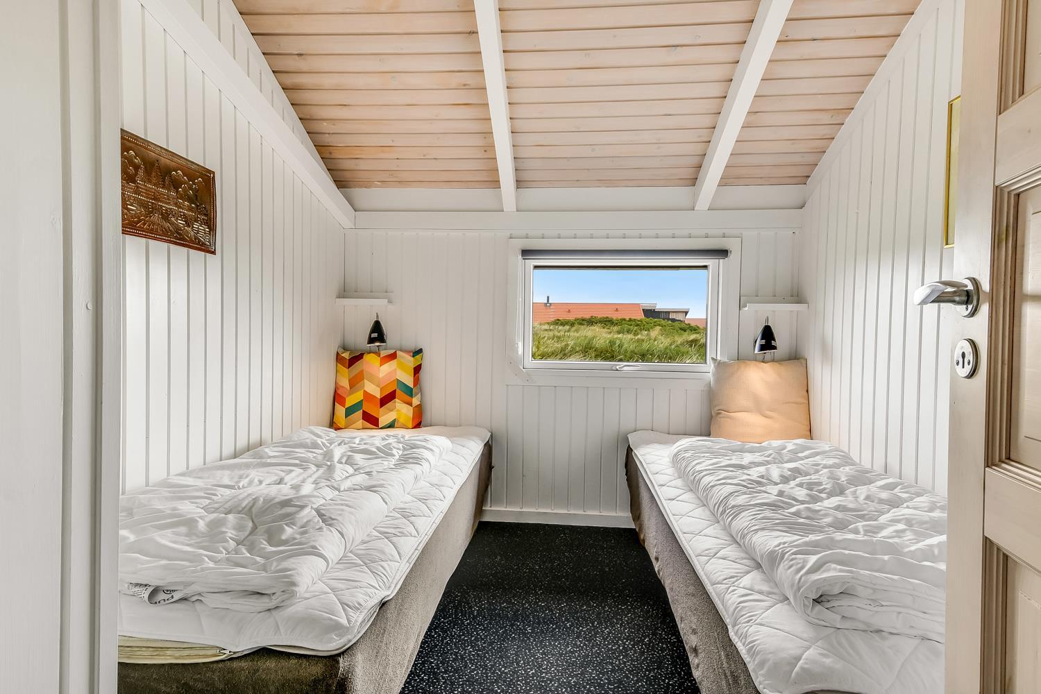 Her er 4 soveværelser heraf 2 med dobbeltsenge og 1 med 2 enkeltsenge samt 1 med 1 enkeltseng - men der må max bo 6 personer i huset. Badeværelset med gulvvarme har håndvask, bruser og toilet. Der er også en vaskemaskine i huset. Dette hus er et ikke rygerhus.