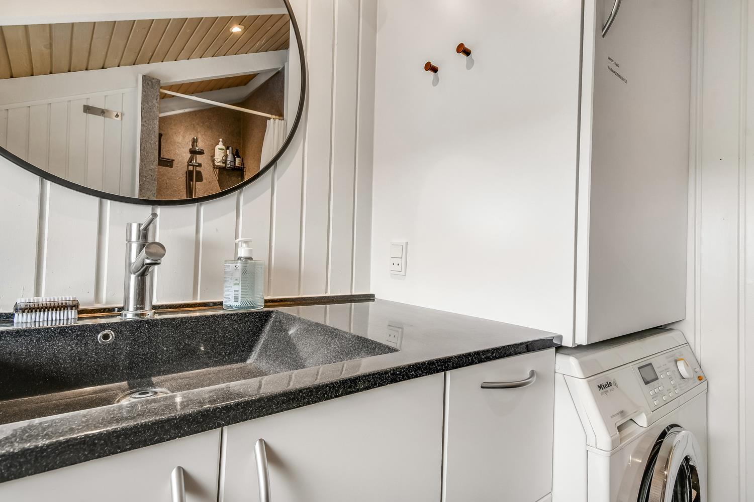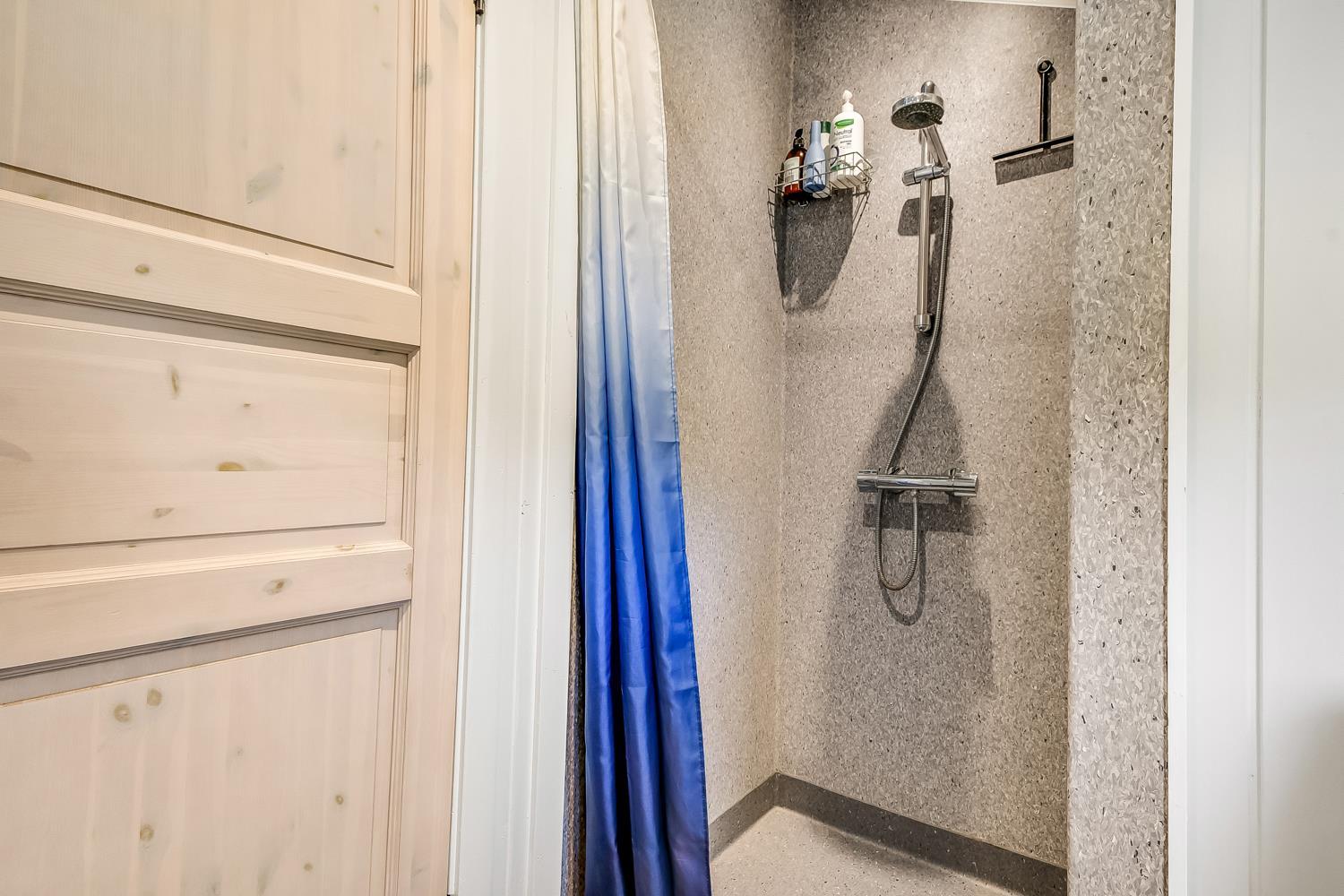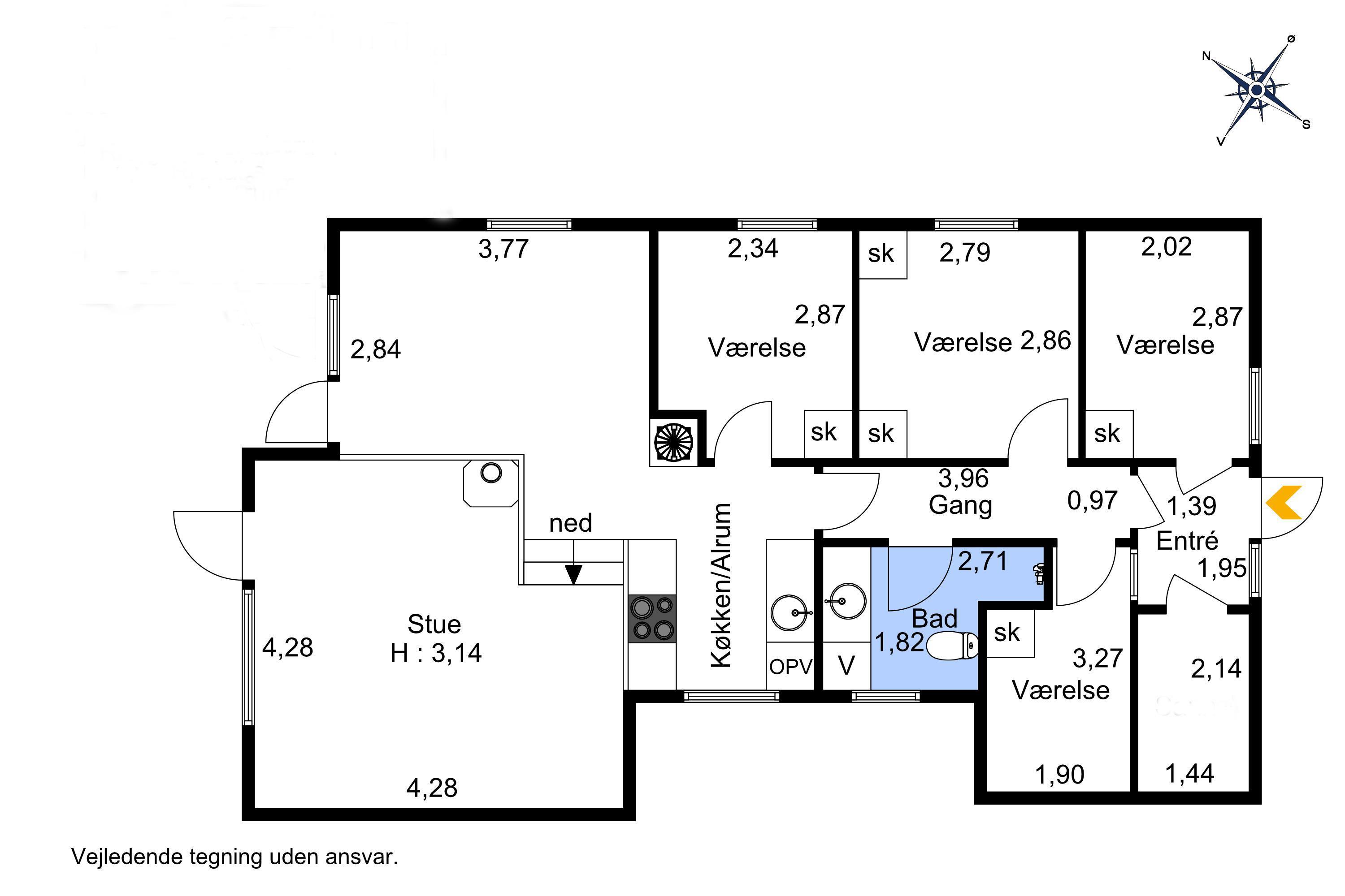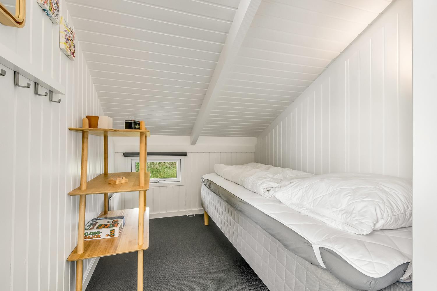 Her er 4 soveværelser heraf 2 med dobbeltsenge og 1 med 2 enkeltsenge samt 1 med 1 enkeltseng - men der må max bo 6 personer i huset. Badeværelset med gulvvarme har håndvask, bruser og toilet. Der er også en vaskemaskine i huset. Dette hus er et ikke rygerhus.