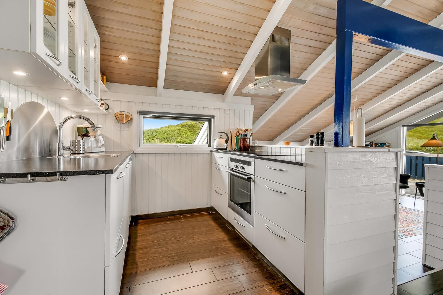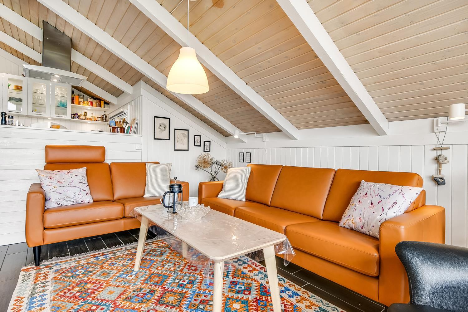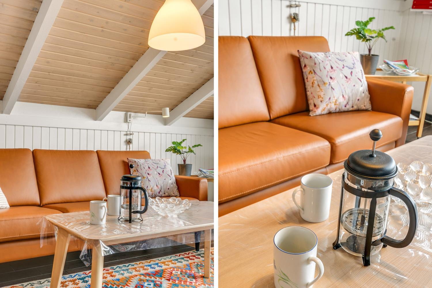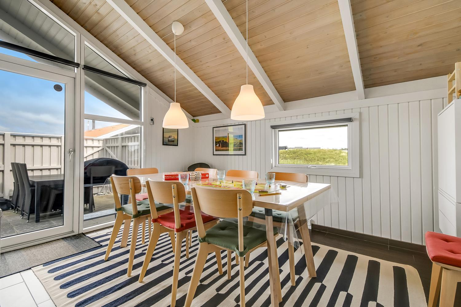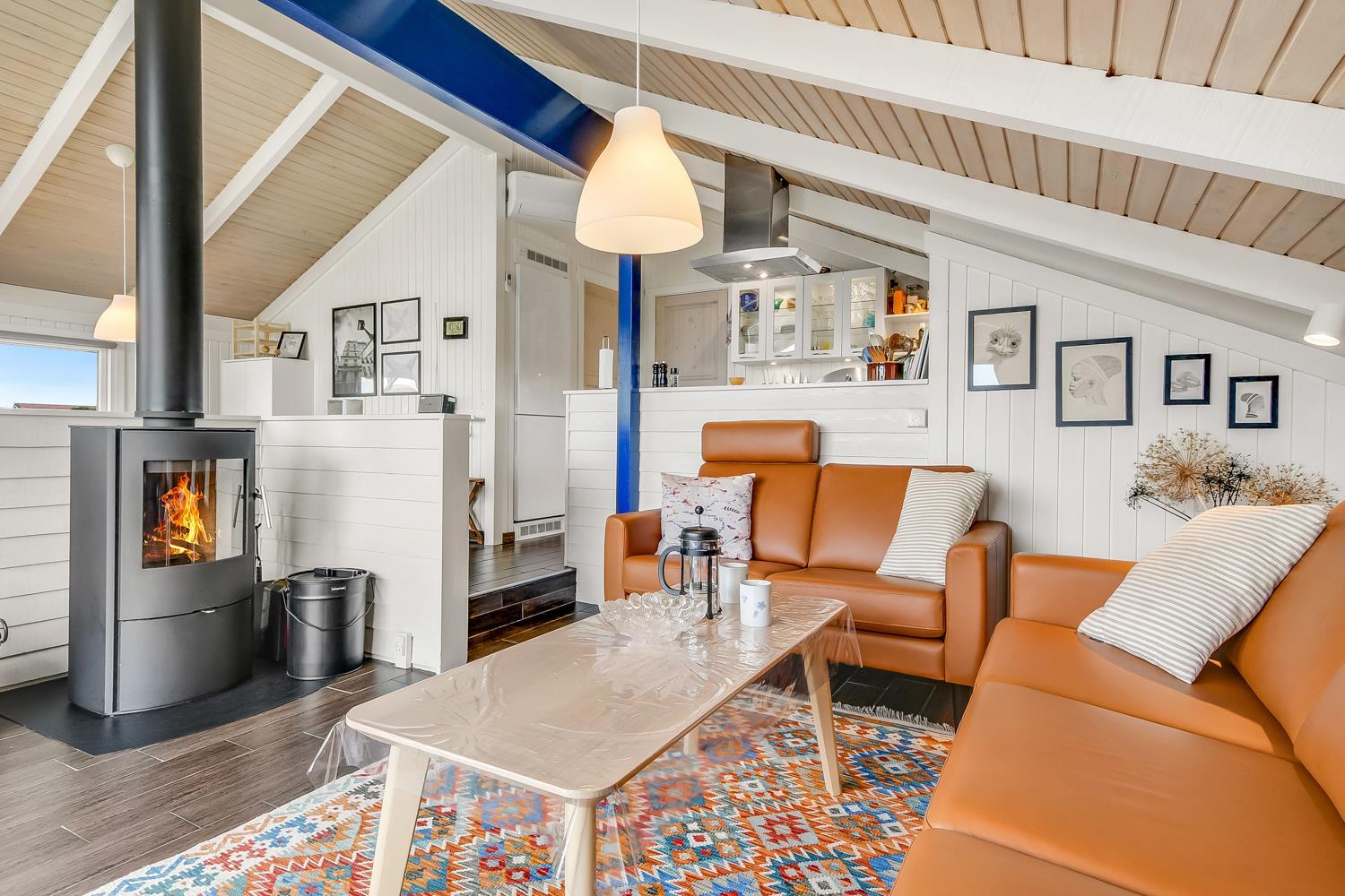 Huset er velindrettet med pejsestue i forbindelse med spisestue og køkken. Køkkenet har gulvvarme, induktionskogeplader, opvaskemaskine, indbygningsovn, køleskab og seperat fryser. Herfra er rummet delt op i to hyggelige stuer. Den ene stue er spisestuen hvorfra der også er udgang til terrassen. Det anden stue er pejsestuen hvor der udover pejs også er fladskærm med dansk og tysk tv, DVD og CD anlæg. Der er installeret varmepumpe i huset og det betyder at du som gæst kan spare en del på din elvarmeregning - varmepumpen leverer op til 4 gange så meget effekt som den bruger, det betyder at for hver kilowatt-time pumpen bruger yder den varme svarende til ca. 4 kW energien udnyttes dermed langt bedre.