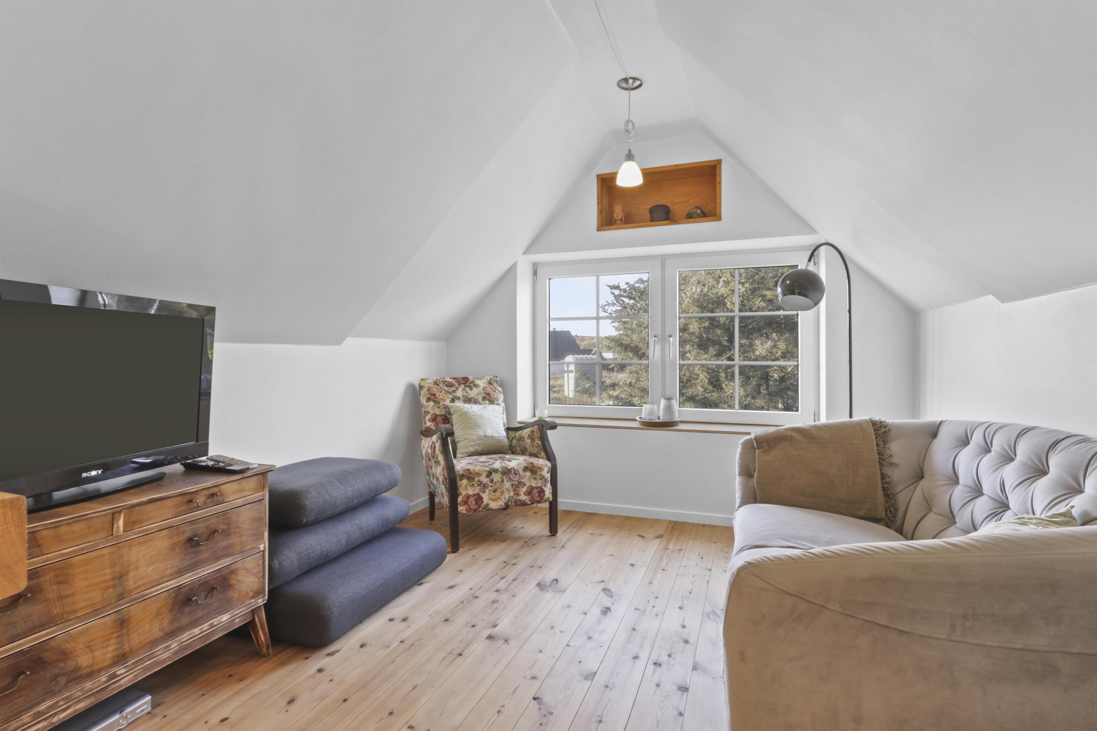 På første sal finder du også en tv-stue med panoramaudsigt over de imponerende klitter, som du kan nyde, mens du slapper af.