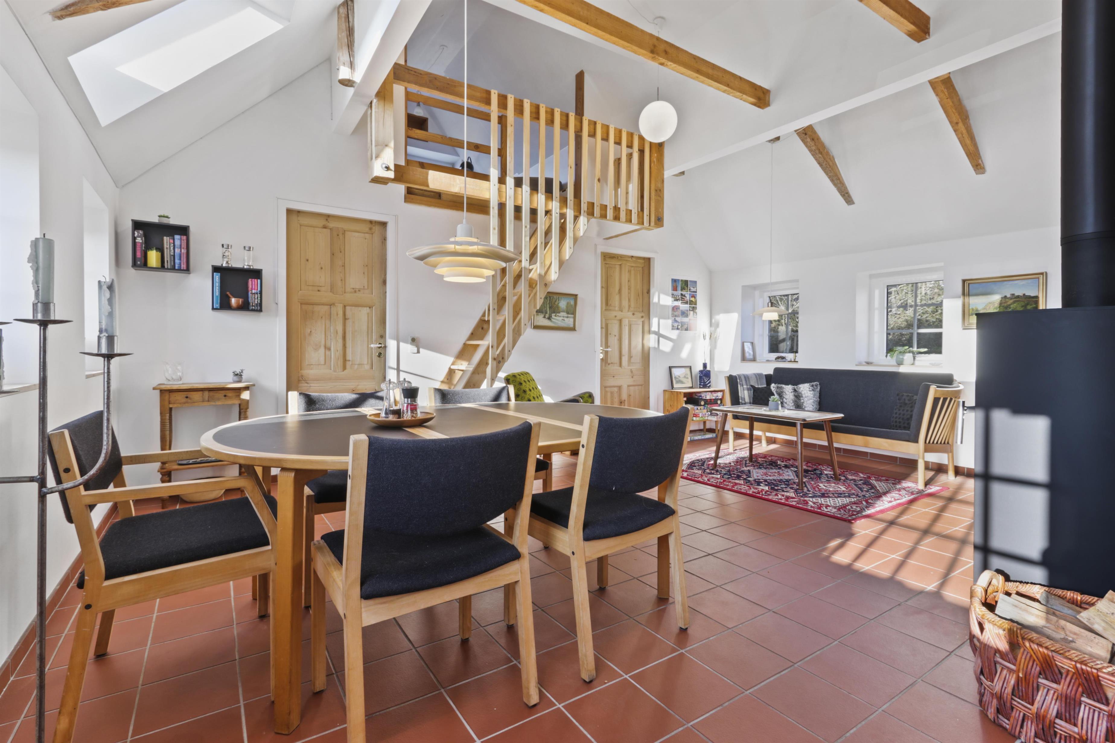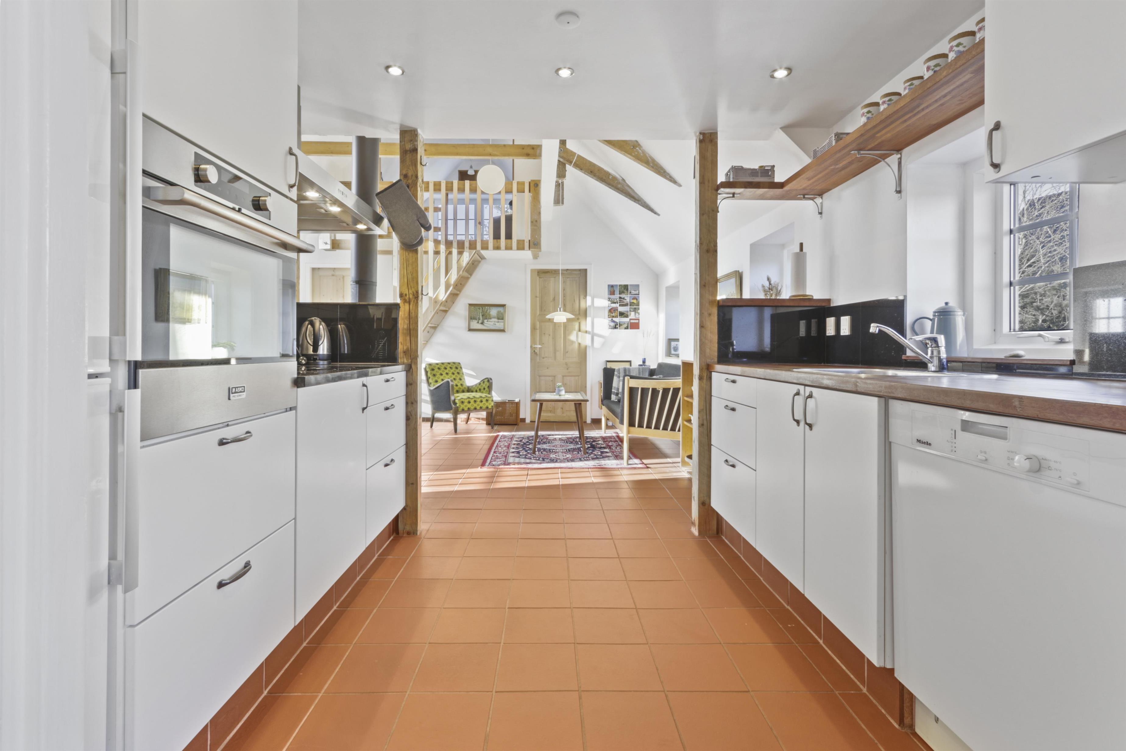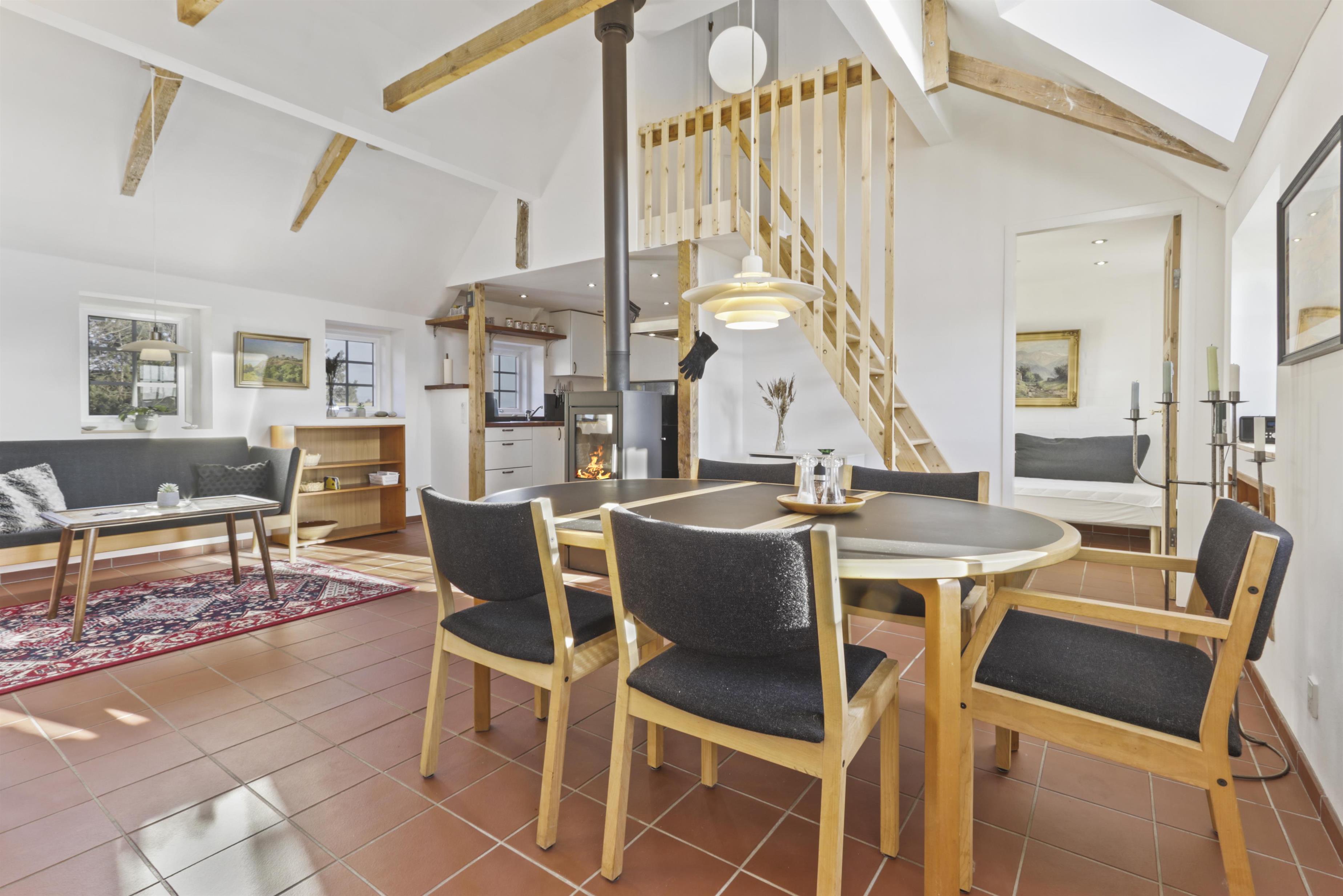Køkkenet er en drøm for madelskere – moderne og funktionelt med alt i hårde hvidevarer. Herfra går du videre til den åbne stue og spiseområde, hvor der er god plads til både afslapning og samvær. Fra stuen har du adgang til tre soveværelser: et med dobbeltseng og to med enkeltsenge. Der er også en trappe op til det fjerde værelse på første sal, som byder på to enkeltsenge og en vidunderlig udsigt over de omkringliggende marker.
