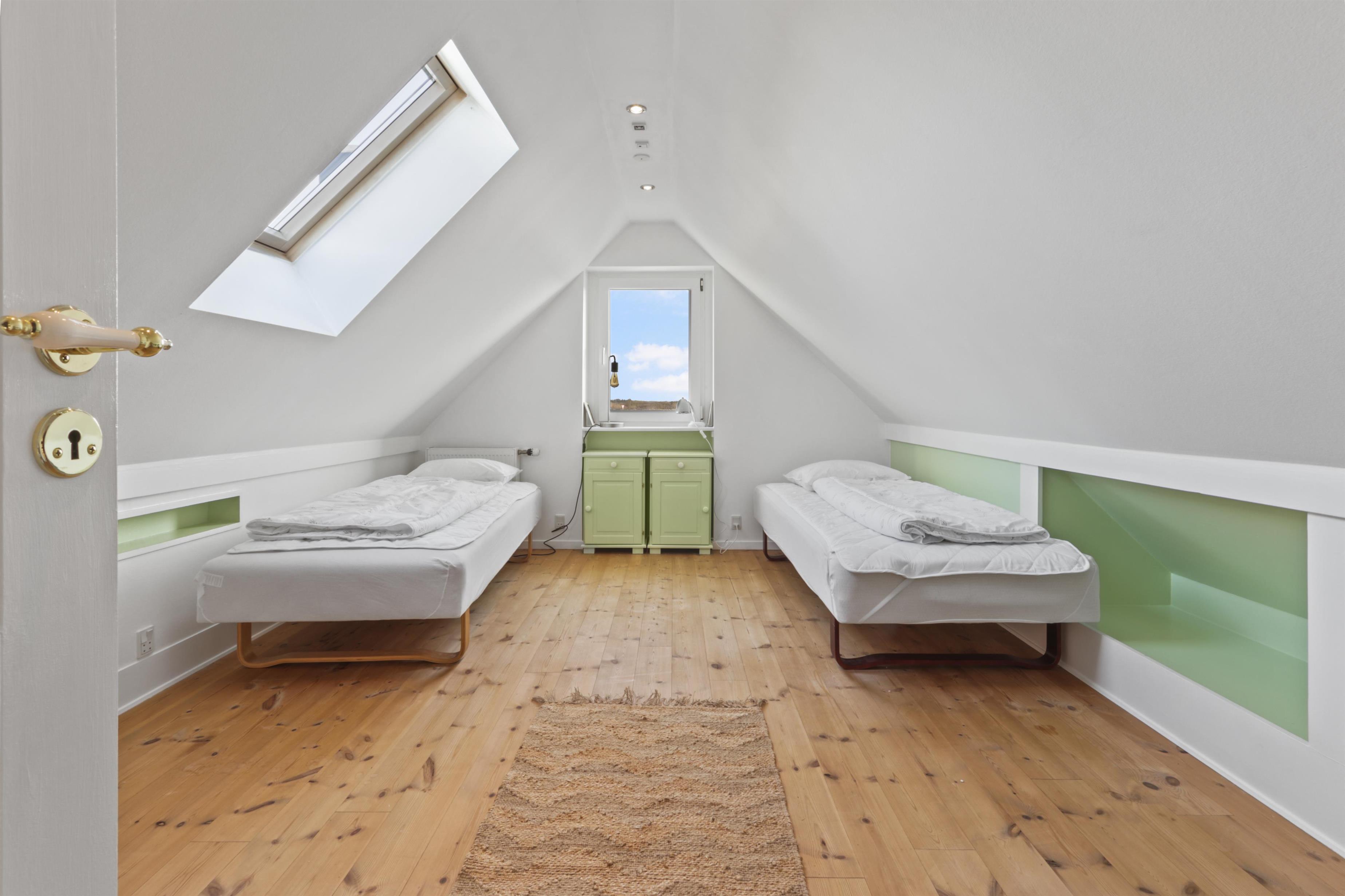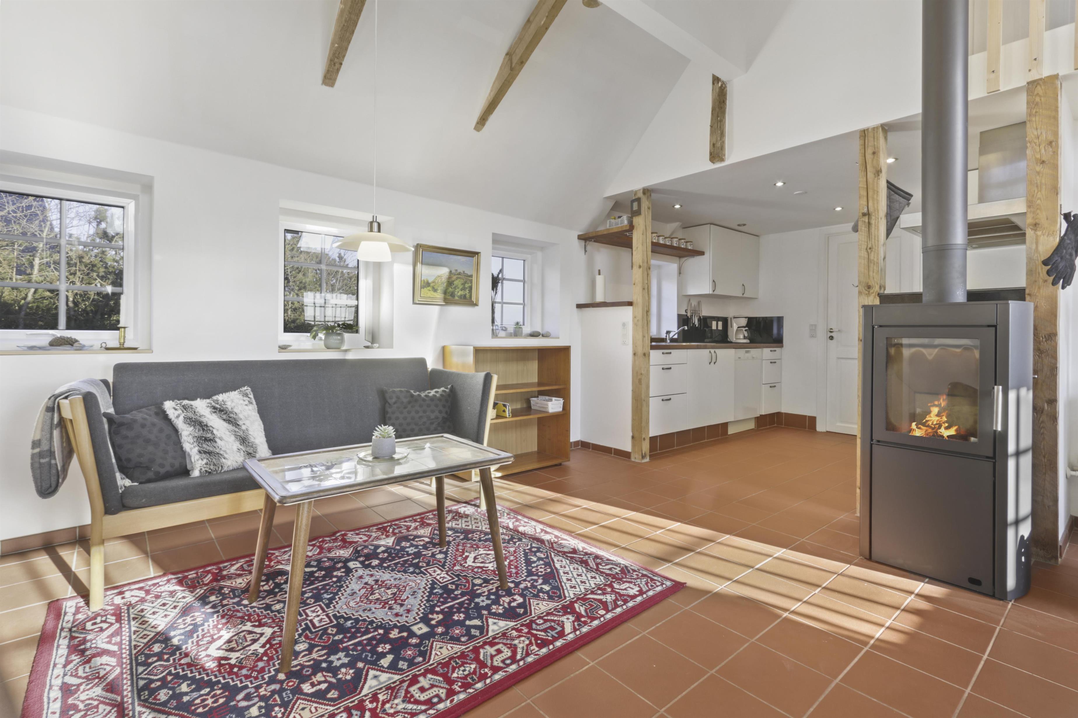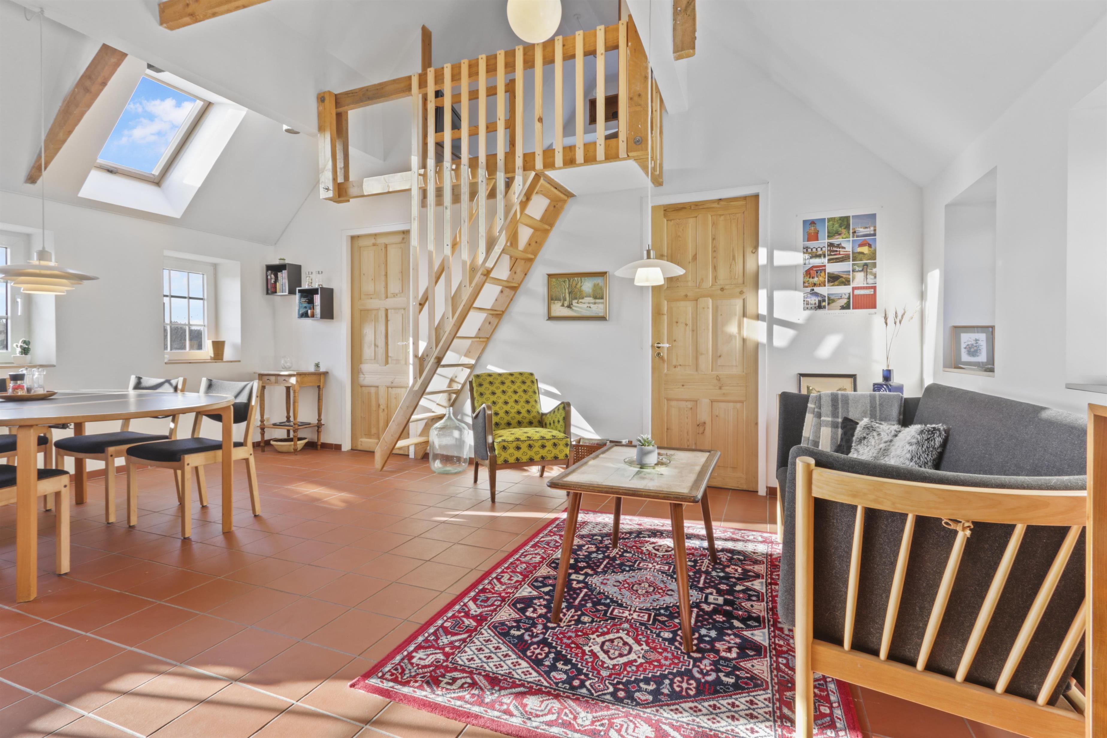 Køkkenet er en drøm for madelskere – moderne og funktionelt med alt i hårde hvidevarer. Herfra går du videre til den åbne stue og spiseområde, hvor der er god plads til både afslapning og samvær. Fra stuen har du adgang til tre soveværelser: et med dobbeltseng og to med enkeltsenge. Der er også en trappe op til det fjerde værelse på første sal, som byder på to enkeltsenge og en vidunderlig udsigt over de omkringliggende marker.