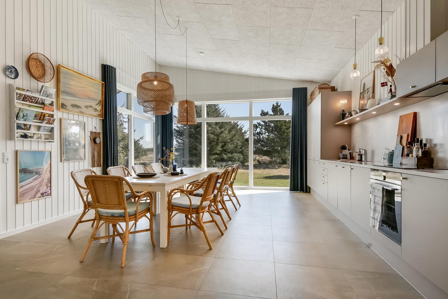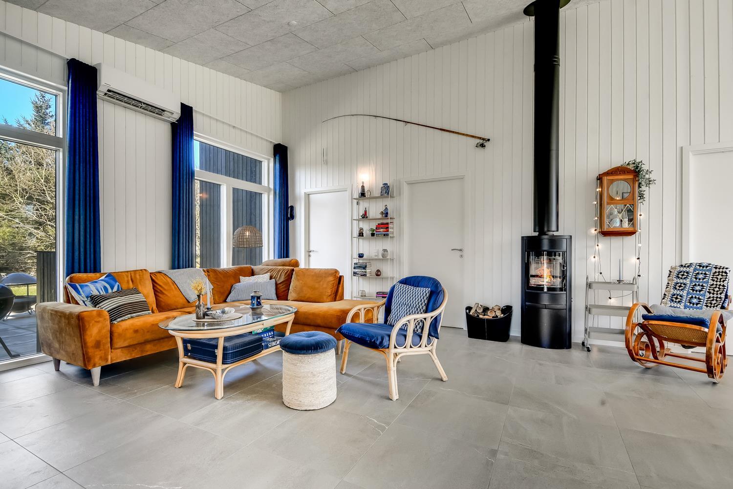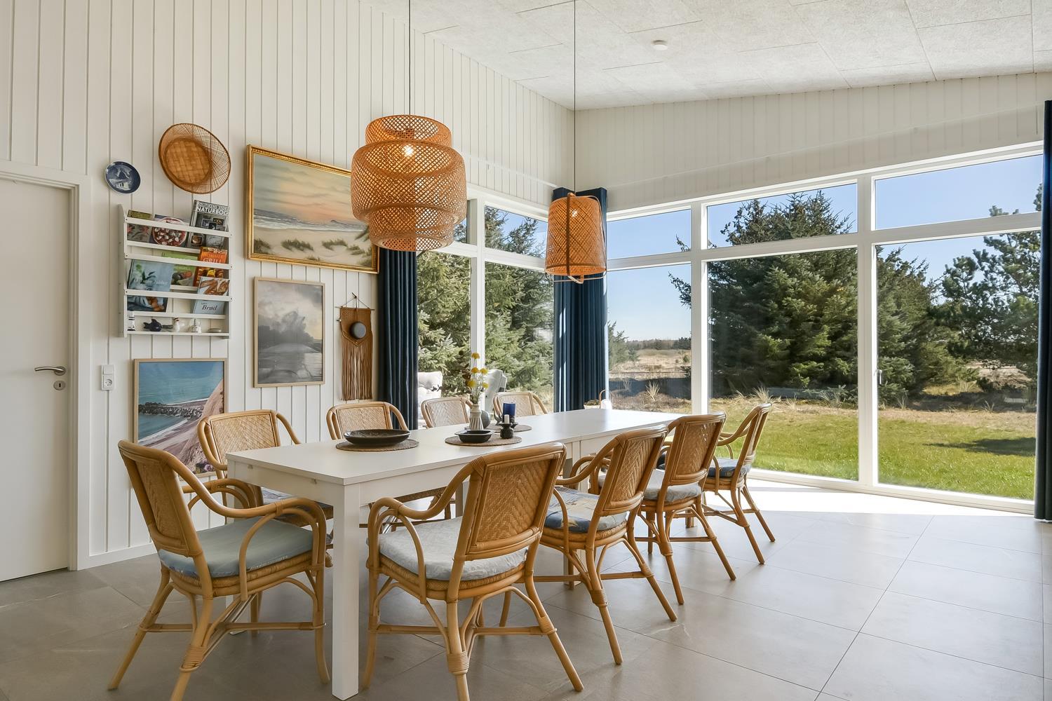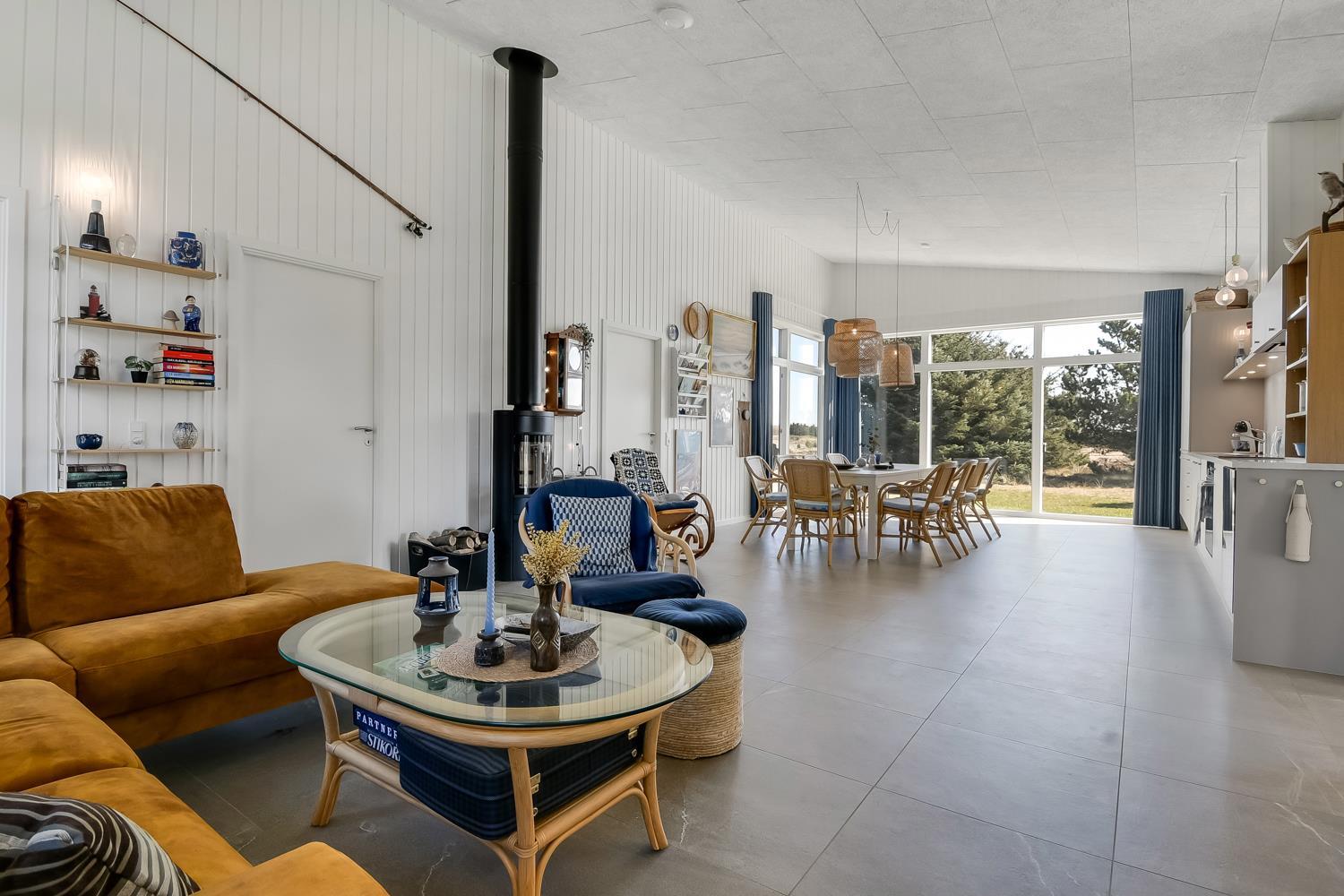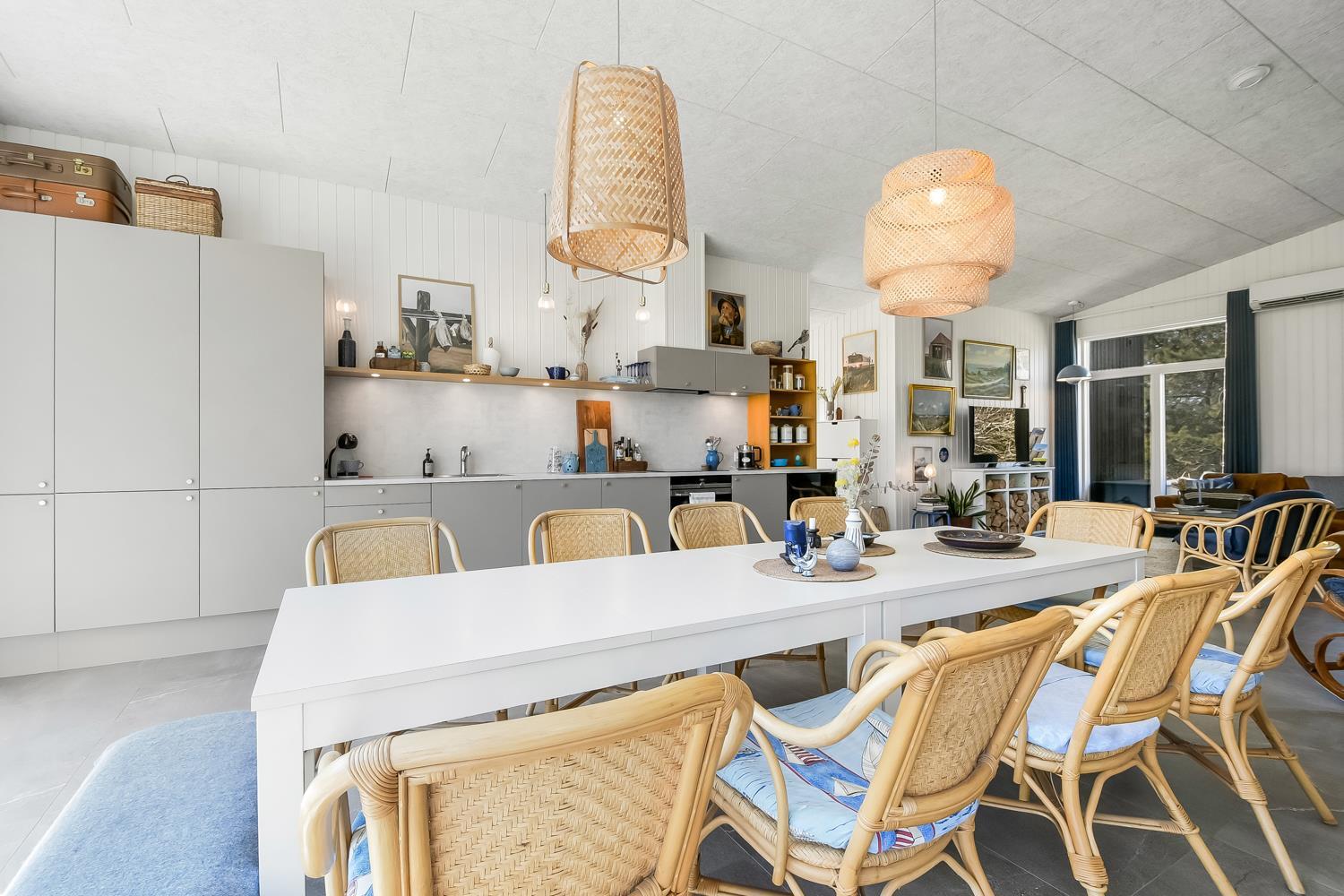 Feriehus er på hele 124m2 og er i særdeleshed veludnyttet med bl.a. stort køkken/alrum kombineret med stuen. Det giver følelsen at, man som familie er samlet uanset om en person er i køkkenet og resten af familien slænger sig i den bløde sofa. Der er højt til himlen, huset har nemlig loft til kip, som er med til at gøre huset ekstra rummeligt. Det store vinduesparti giver et fantastisk lysindfald og fungerer som et levende maleri.
