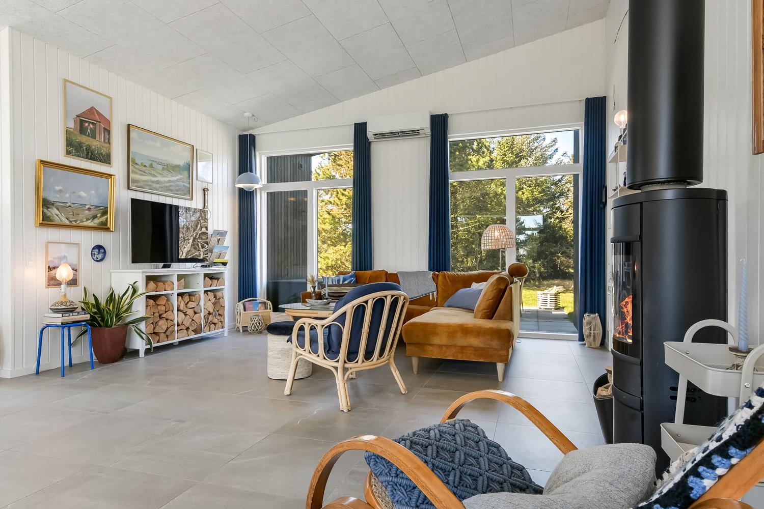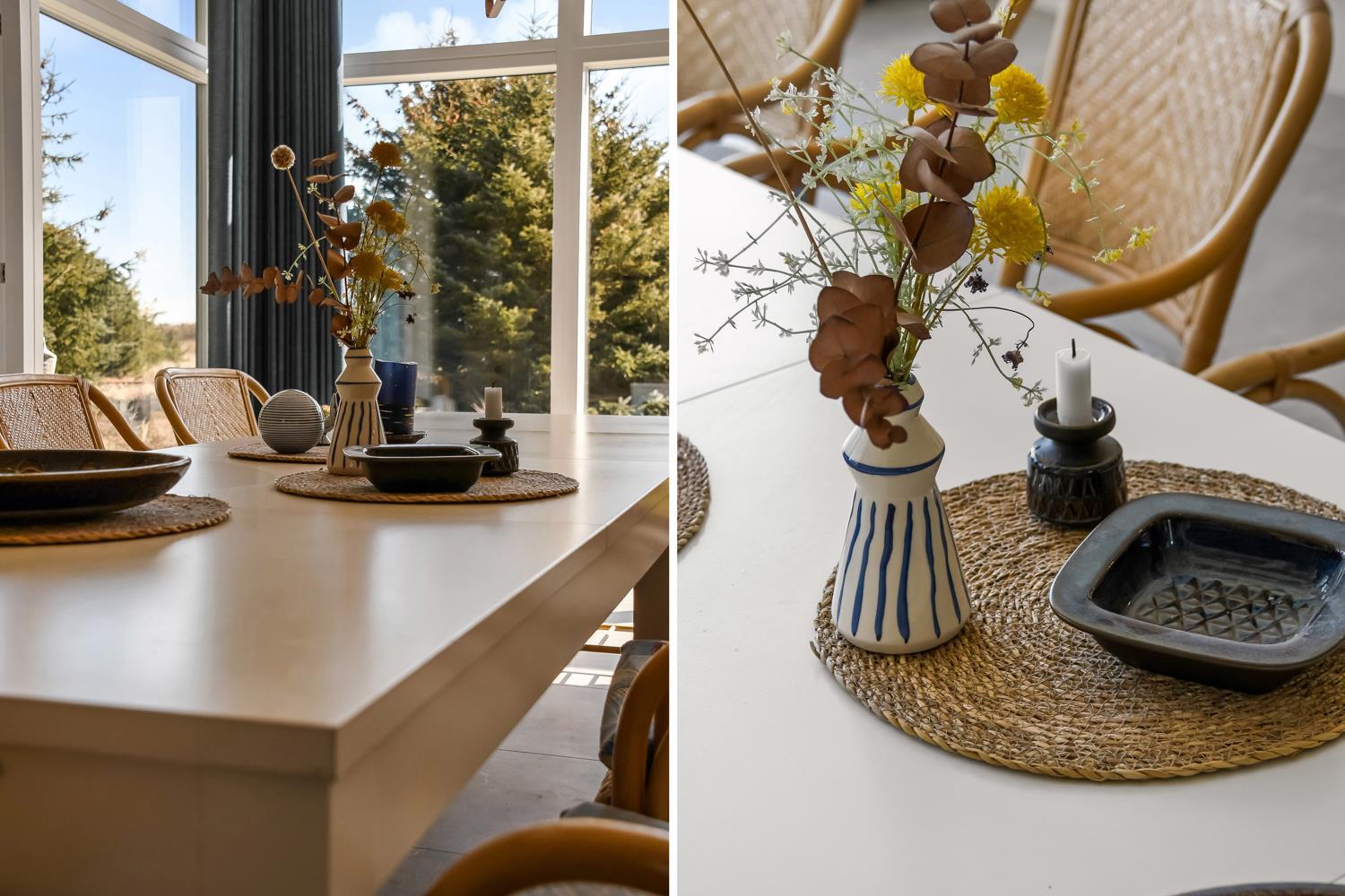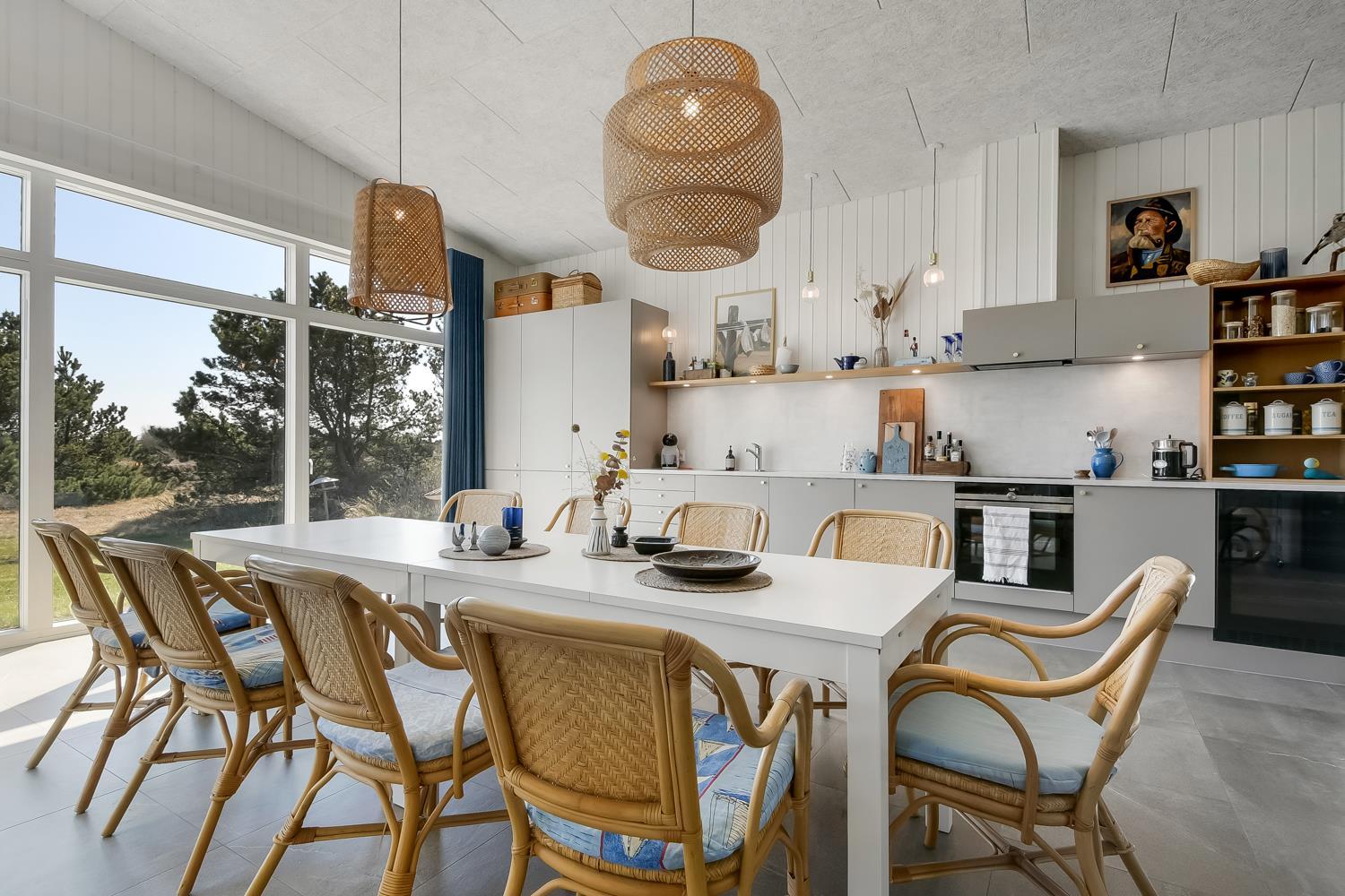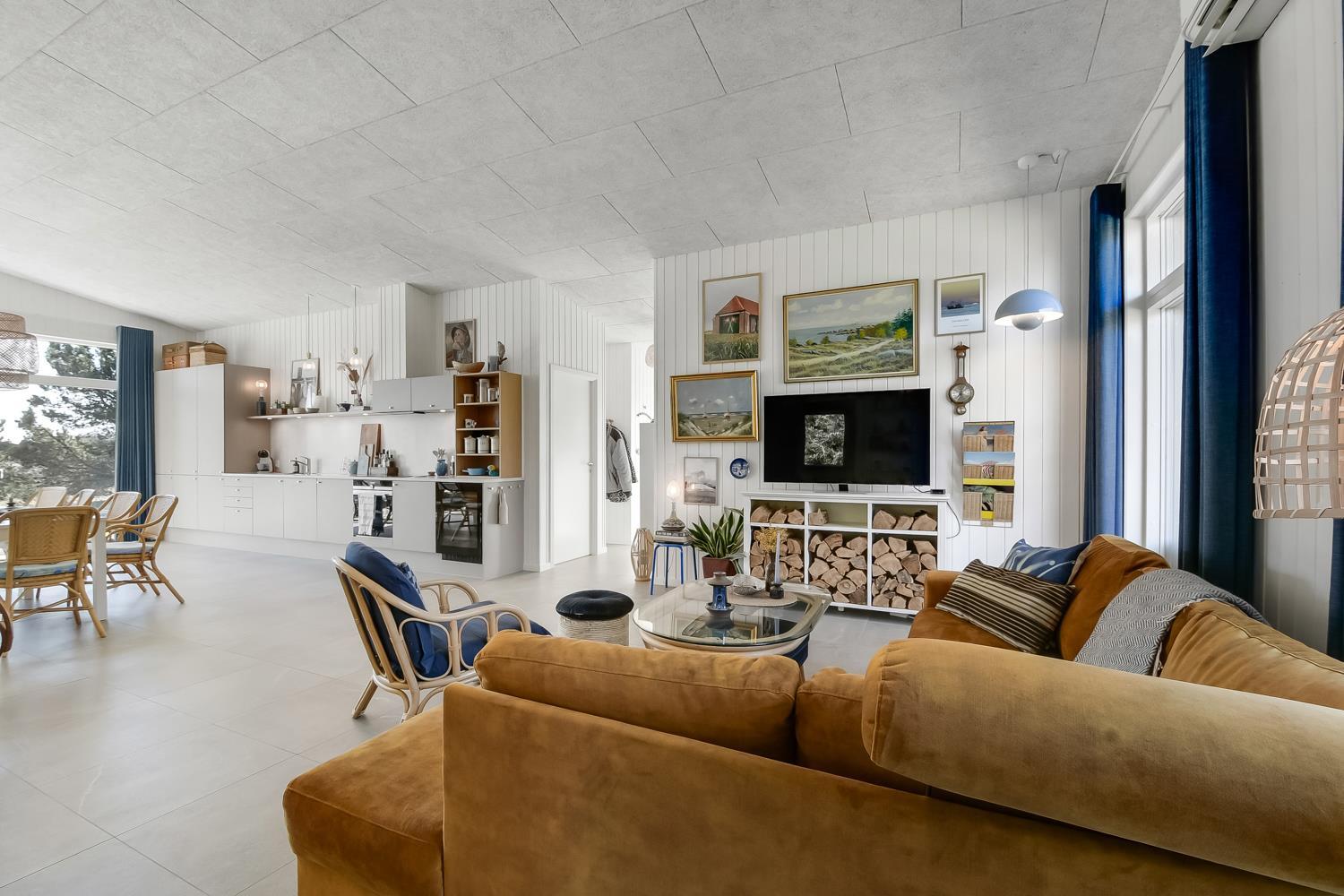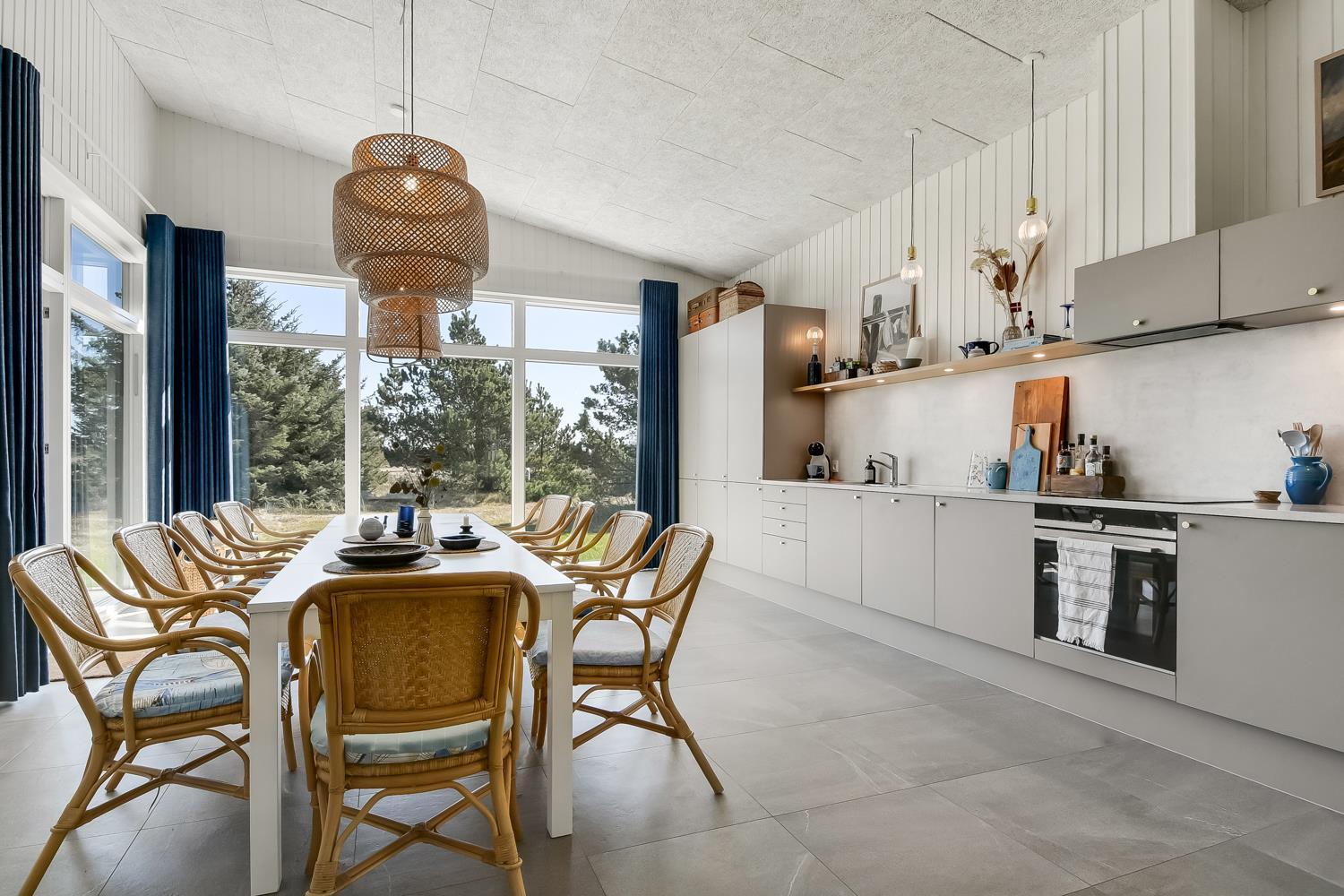 Feriehus er på hele 124m2 og er i særdeleshed veludnyttet med bl.a. stort køkken/alrum kombineret med stuen. Det giver følelsen at, man som familie er samlet uanset om en person er i køkkenet og resten af familien slænger sig i den bløde sofa. Der er højt til himlen, huset har nemlig loft til kip, som er med til at gøre huset ekstra rummeligt. Det store vinduesparti giver et fantastisk lysindfald og fungerer som et levende maleri.
