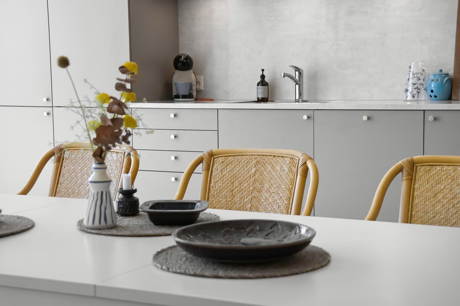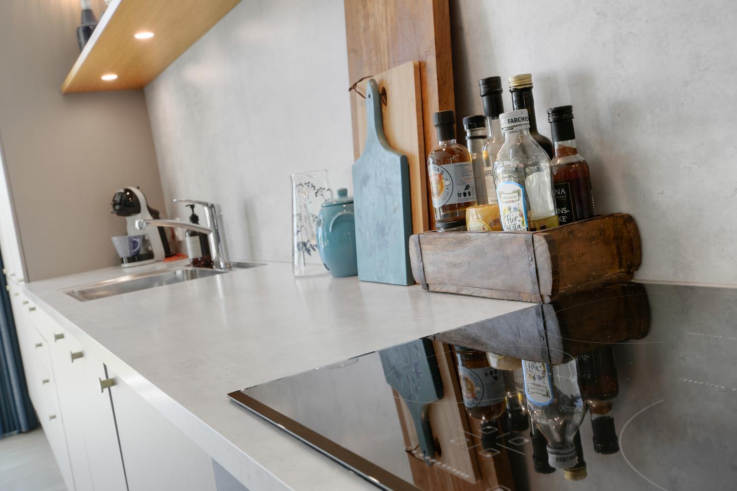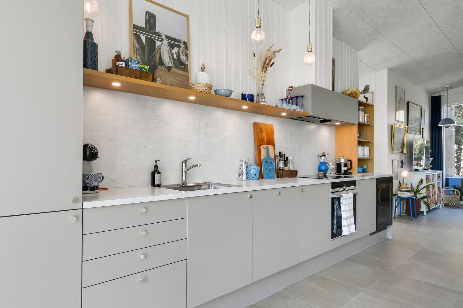 I det veludstyrede køkken finder i alle de faciliteter der nødvendige for at kunne kokkerere aftensmaden, bl.a. el-keramisk kogeplade, emhætte, indbygget ovn, køle/fryskab og selvfølgelig en opvaskemaskine. Det store spisebord er placeret i forbindelse med køkkenet, hvorfra man igen har et fantastiske lysindfald. Sofaområdet råder over et Smart-TV, hvor man kan streame egne tjenester gennem Chromecast eller Apple-TV. Der er ikke danske eller tyske kanaler. Der findes fiberinternet i huset.