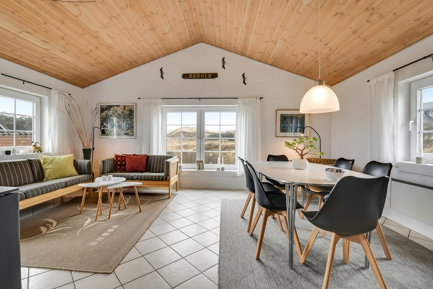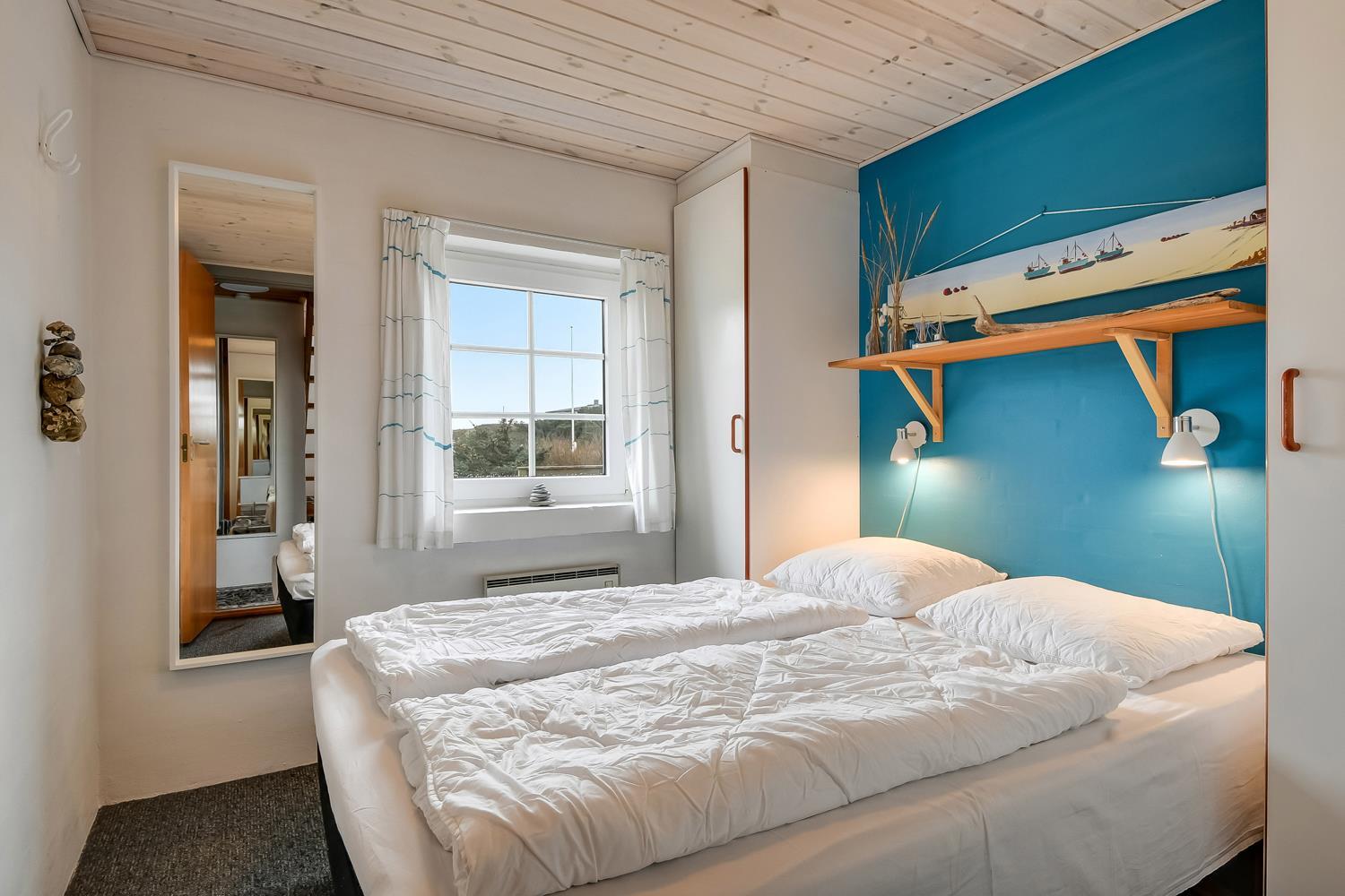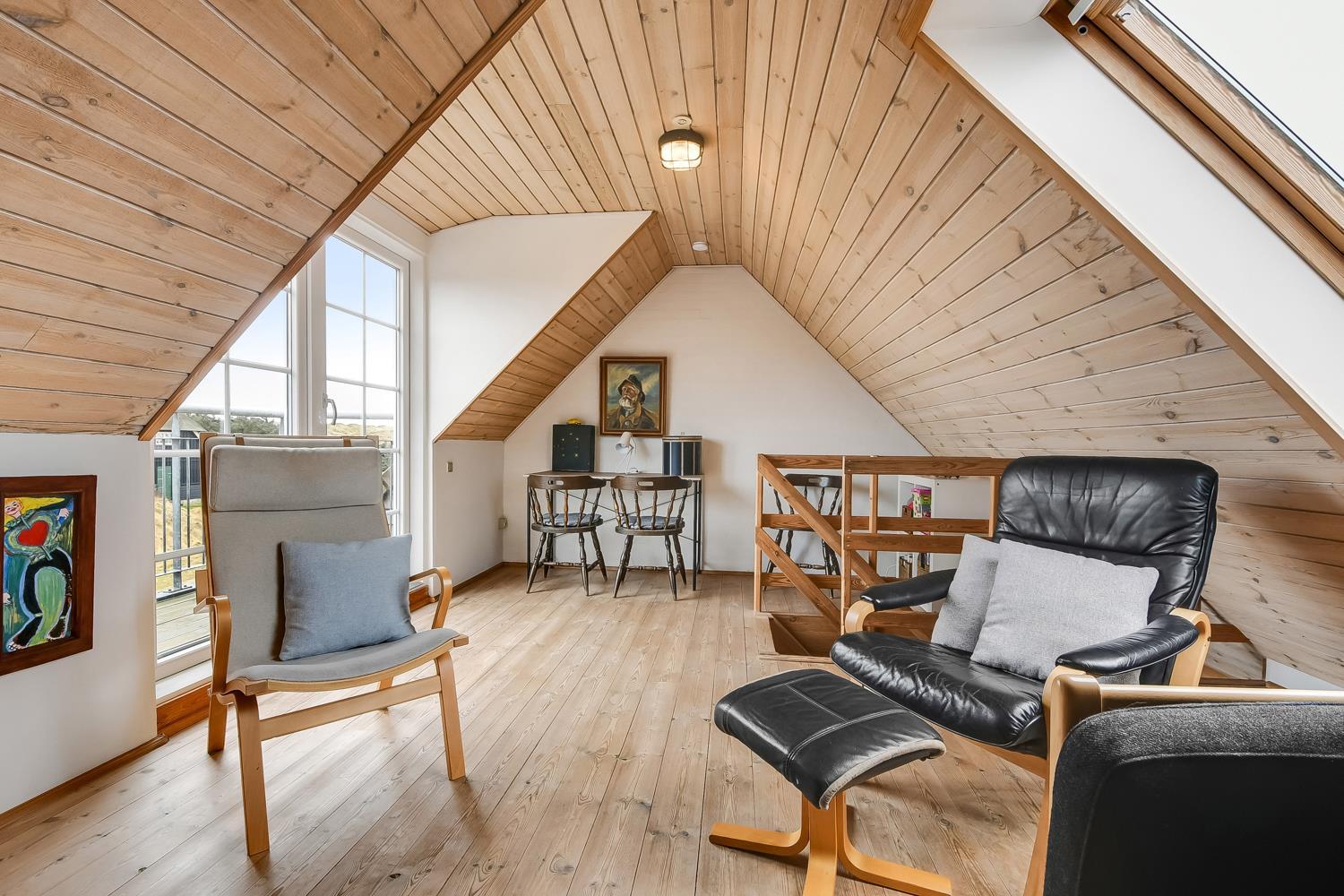 Dette smagfuldt indrettede feriehus i 2 etager er beliggende ideelt ved yderste klitrække blot 150 m fra Vesterhavet. Huset er meget smagfuldt indrettet og fremstår lyst og venligt. Hyggeligt indrettet stue som er kombineret med et velindrettet køkken som er indrettet med elkomfur, køleskab med frostboks, mikroovn og opvaskemaskine. Stuen er godt indrettet med dejlige møbler, spisebord, F-TV med parabol samt med mulighed for streaming af egne programmer, PlayStation 3 med spil og en dejlig brændeovn som giver en behagelig varme også på de kolde årstider. 3 soverum med DS + DS + 4K. Flot badeværelse med toilet, håndvask, bruser, spa, vaskemaskine, tørretumbler og adgang til sauna, flisegulv med gulvvarme. I entreen er der trappe til 1. sal hvor der findes en lille hyggelig stue med ekstra TV og trægulve, herfra er der en fantastisk udsigt over området og de høje klitter ved Vesterhavet fra den lille altan. Husdyr tilladt. Ikke rygerhus.