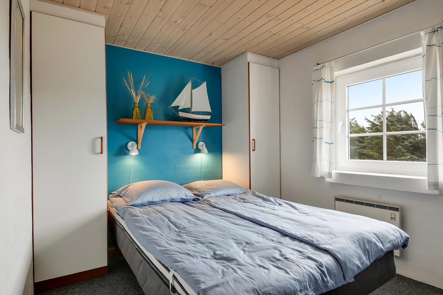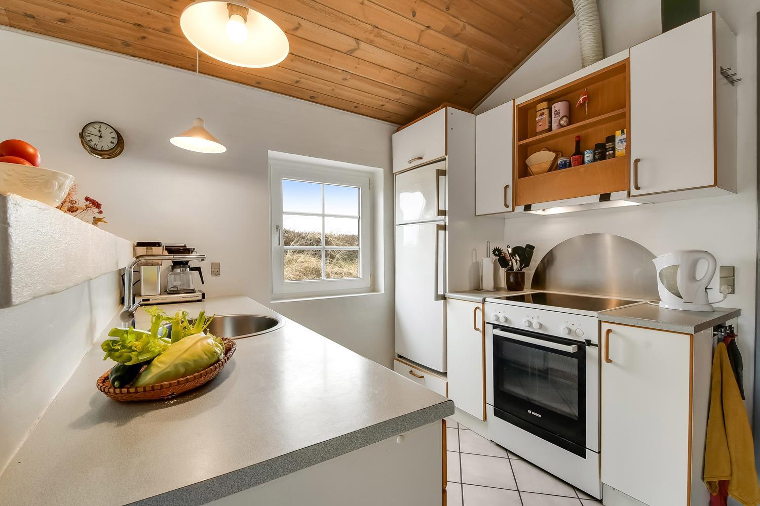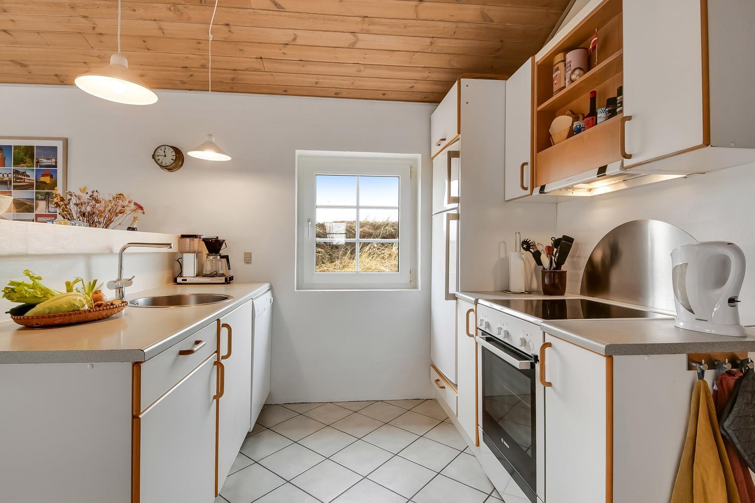 Dette smagfuldt indrettede feriehus i 2 etager er beliggende ideelt ved yderste klitrække blot 150 m fra Vesterhavet. Huset er meget smagfuldt indrettet og fremstår lyst og venligt. Hyggeligt indrettet stue som er kombineret med et velindrettet køkken som er indrettet med elkomfur, køleskab med frostboks, mikroovn og opvaskemaskine. Stuen er godt indrettet med dejlige møbler, spisebord, F-TV med parabol samt med mulighed for streaming af egne programmer, PlayStation 3 med spil og en dejlig brændeovn som giver en behagelig varme også på de kolde årstider. 3 soverum med DS + DS + 4K. Flot badeværelse med toilet, håndvask, bruser, spa, vaskemaskine, tørretumbler og adgang til sauna, flisegulv med gulvvarme. I entreen er der trappe til 1. sal hvor der findes en lille hyggelig stue med ekstra TV og trægulve, herfra er der en fantastisk udsigt over området og de høje klitter ved Vesterhavet fra den lille altan. Husdyr tilladt. Ikke rygerhus.