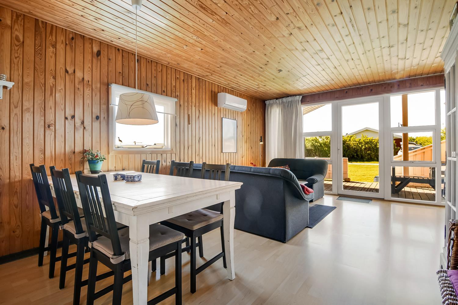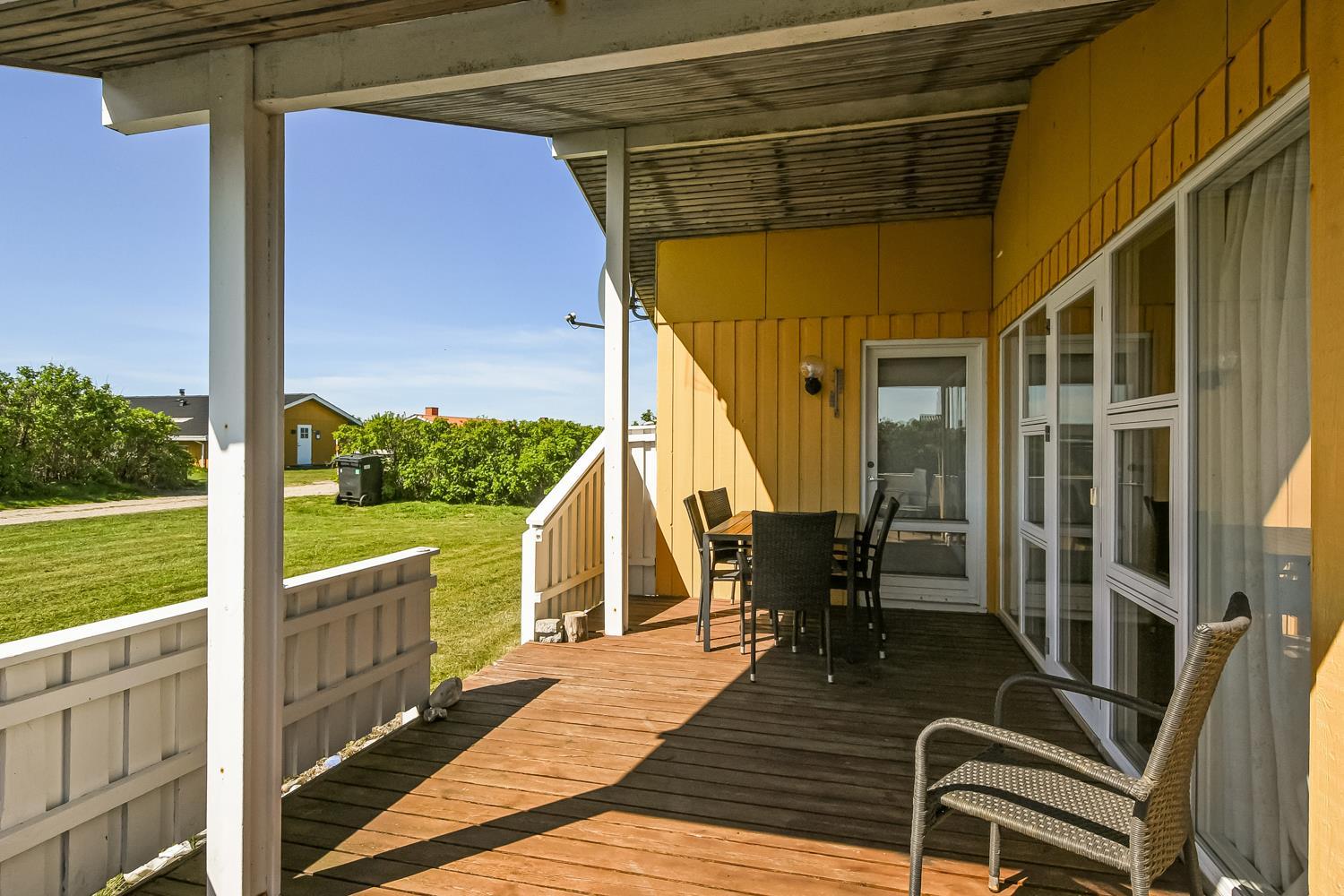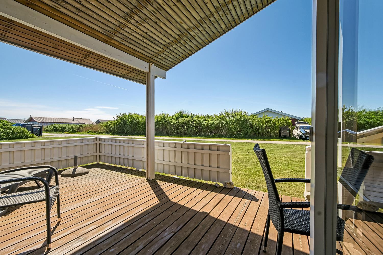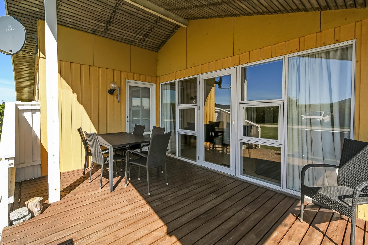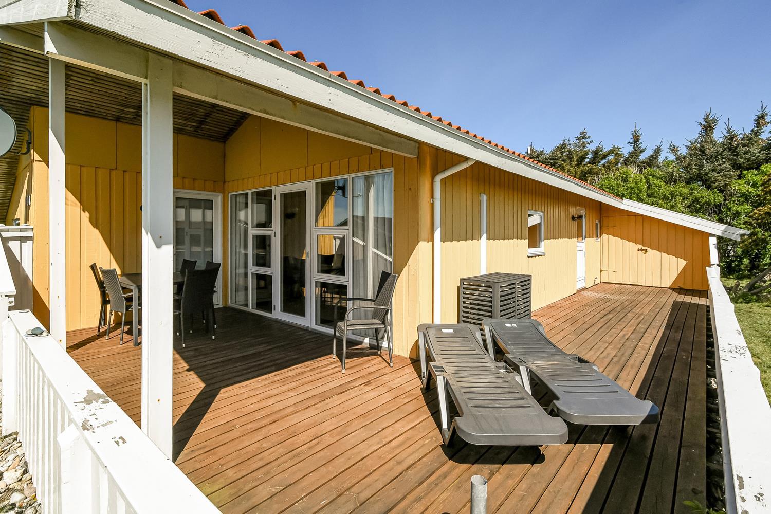 Huset har en åben og overdækket terrasse med havemøbler, hvor I kan nyde solen eller spise ude i læ. Til børnene er der gynge, barnestol og barneseng, så hele familien kan få en komfortabel og sjov ferie.