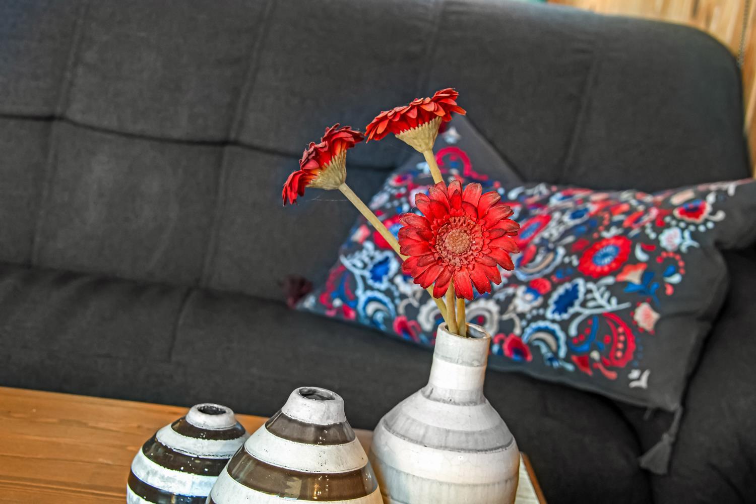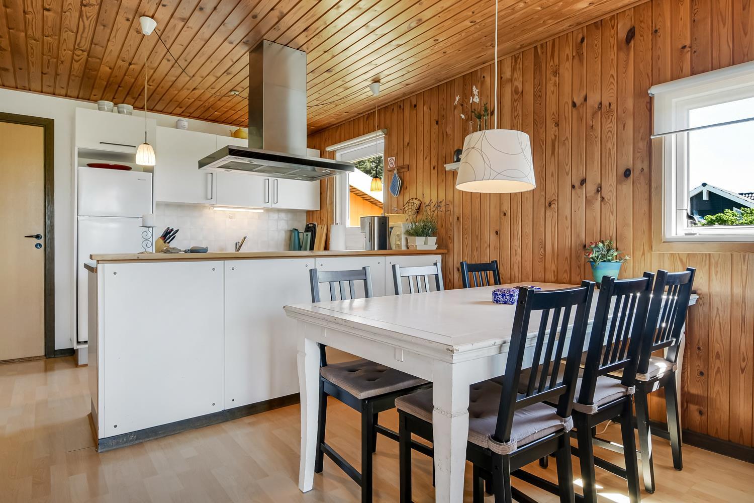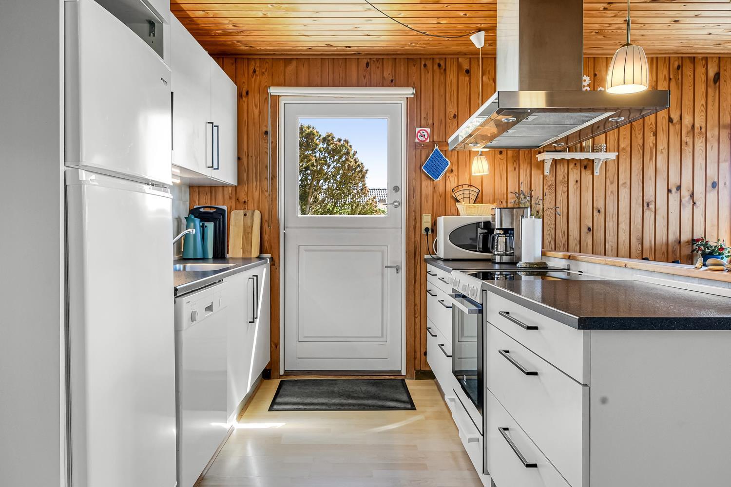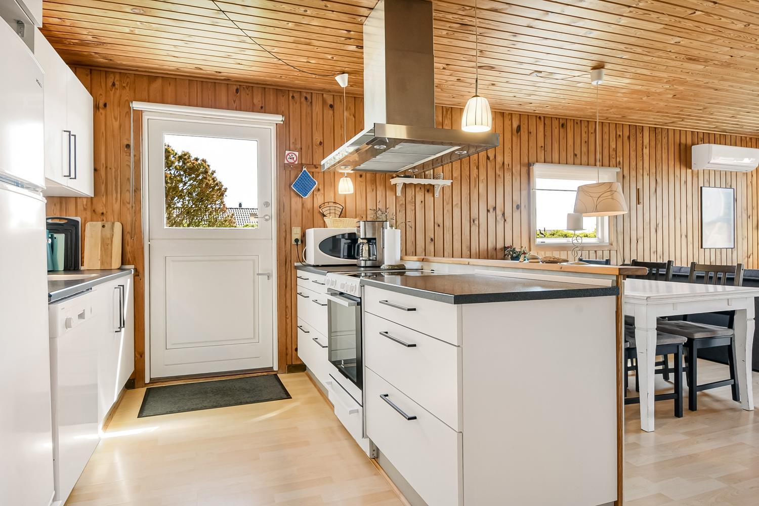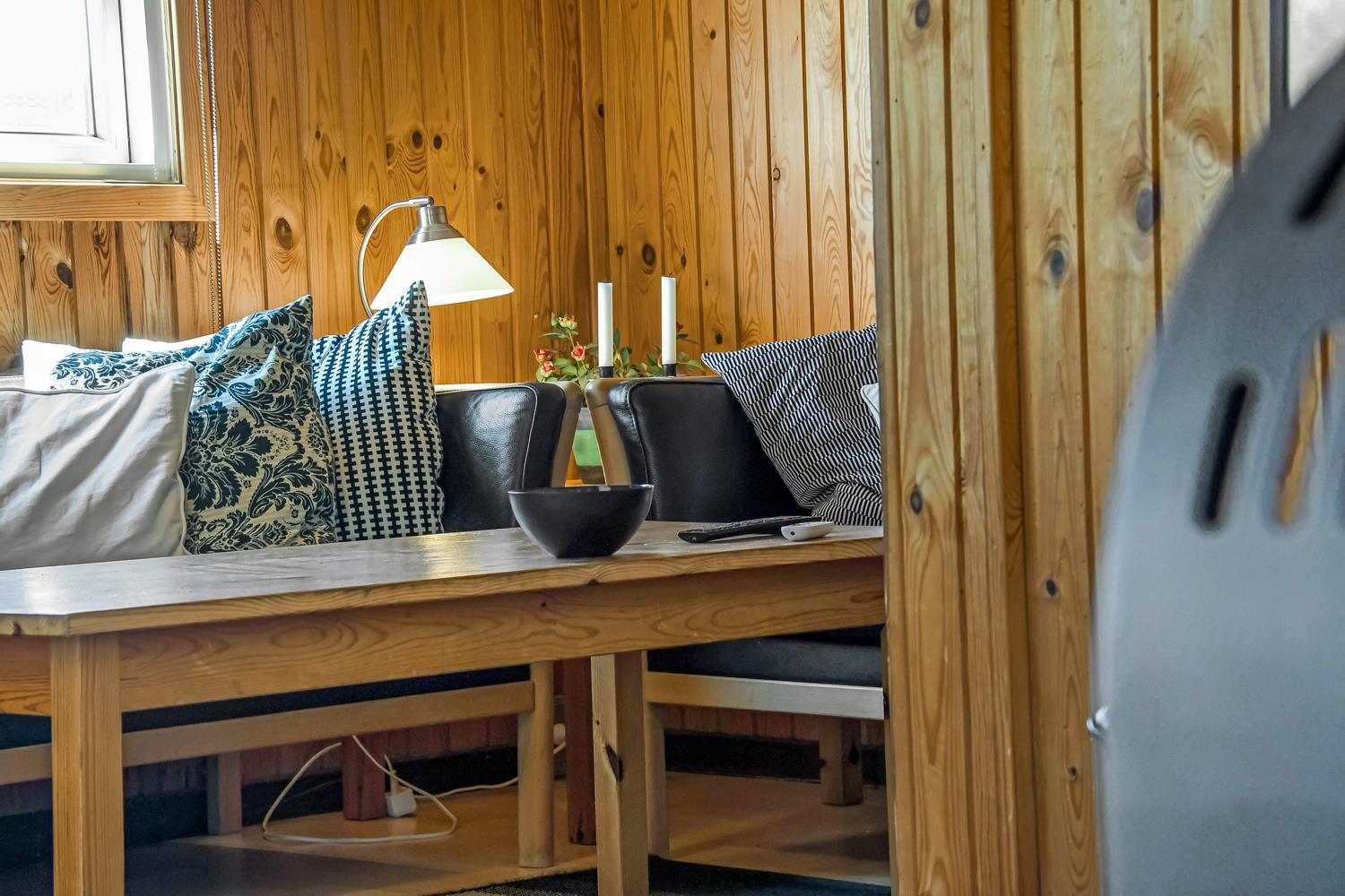 Opholdsstuen er hyggeligt møbleret og har brændeovn, farve-tv med parabol (kun tyske kanaler), dvd-afspiller og stereoanlæg med cd, så I kan slappe af efter en dag ved vandet eller på udflugter i området. Køkkenet er funktionelt udstyret med opvaskemaskine, mikrobølgeovn og lille fryser (15 l), hvilket gør det nemt at tilberede feriens måltider.