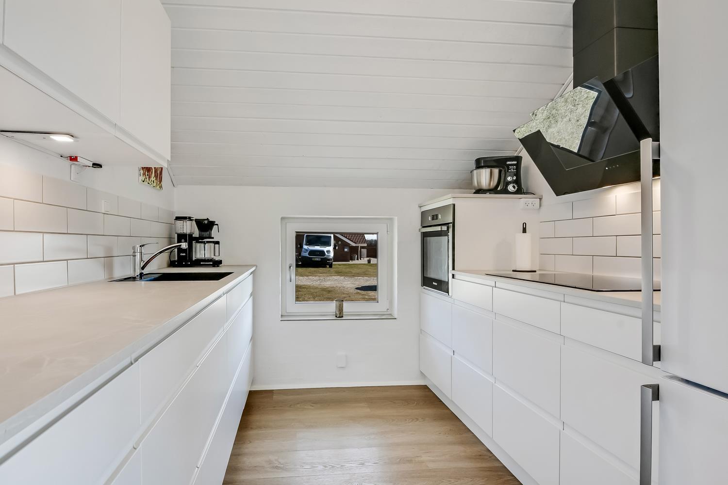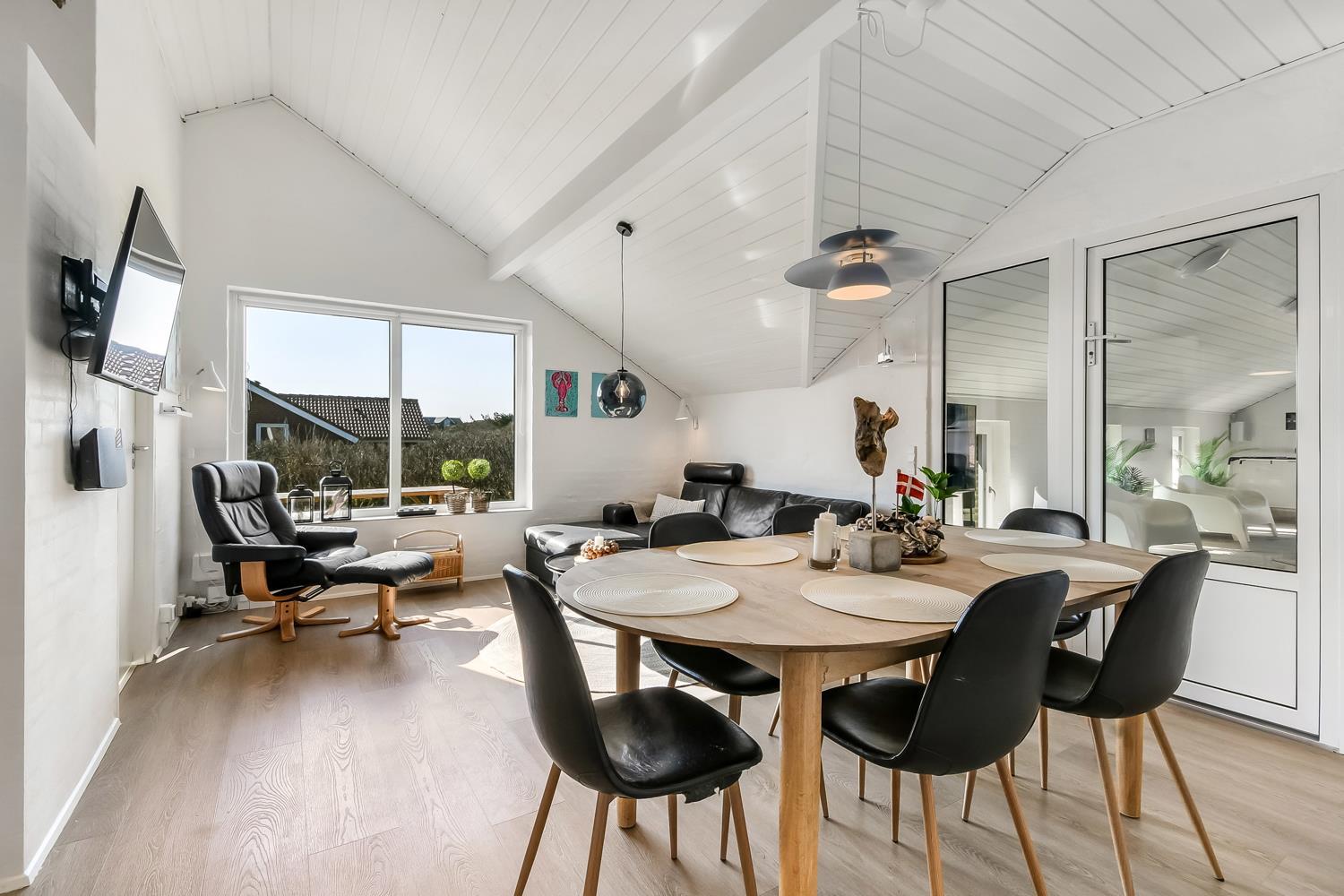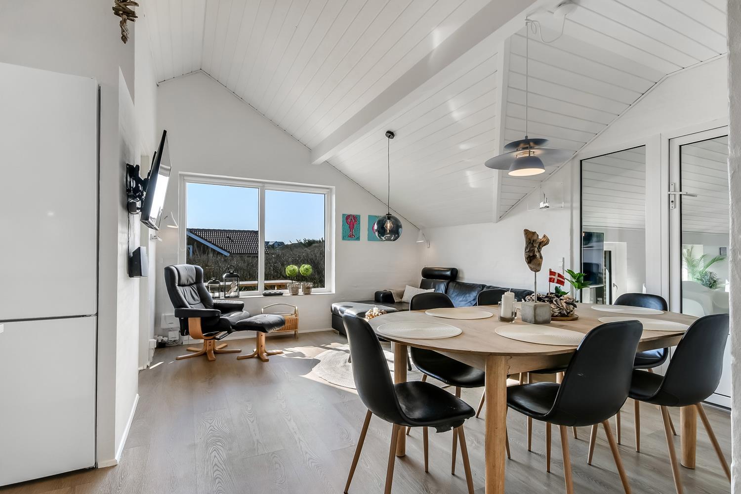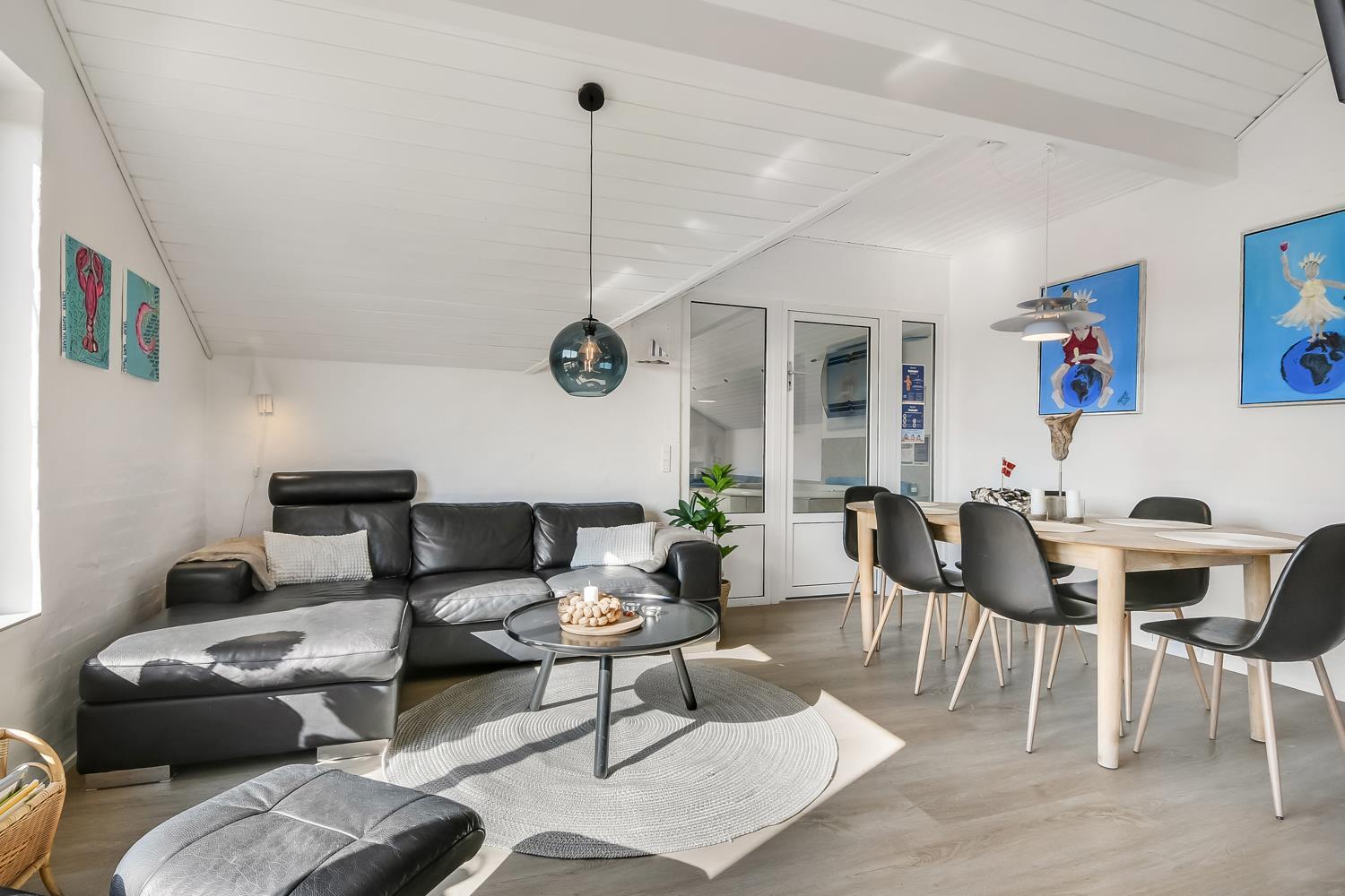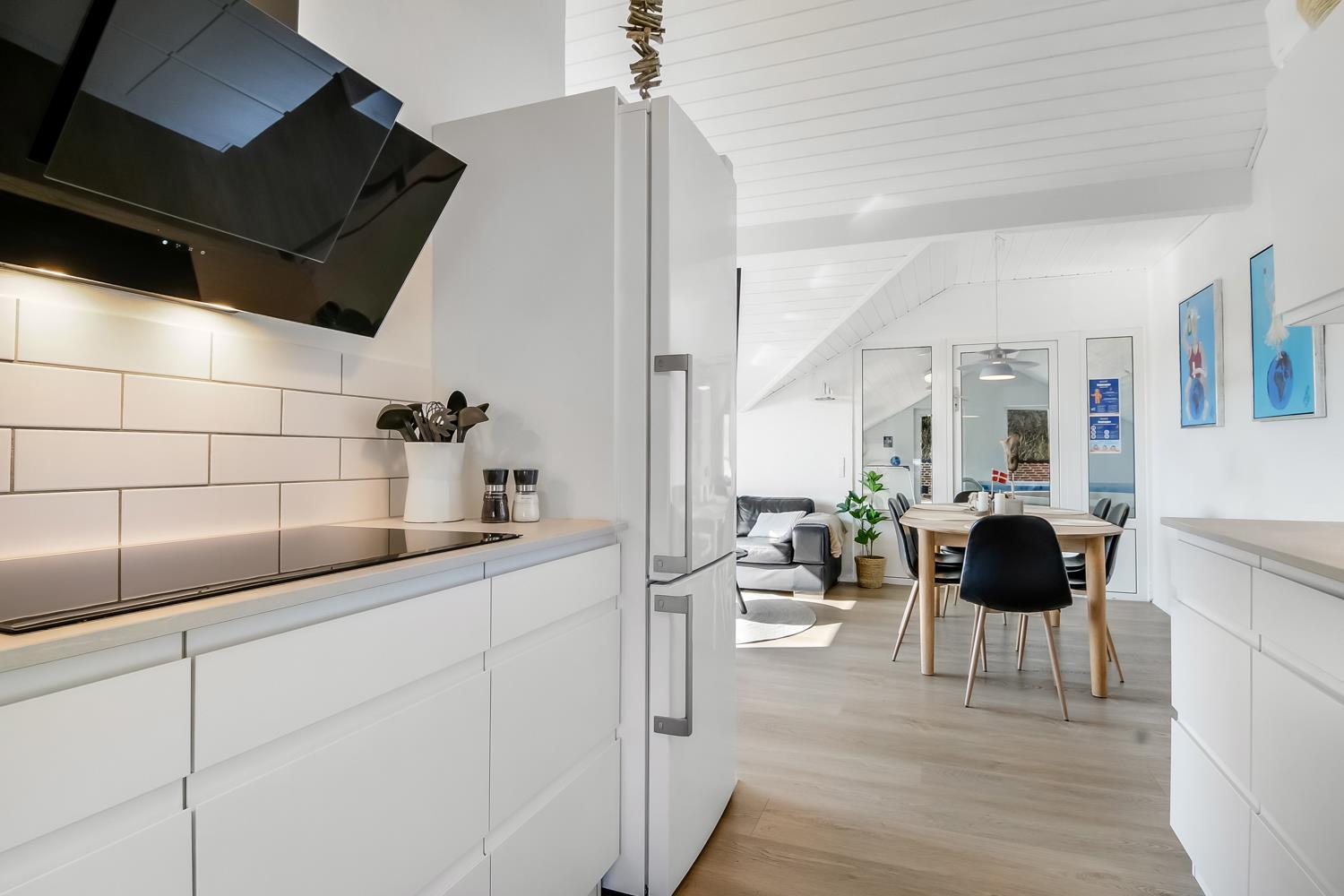 Huset er 140 m² og indrettet med fokus på moderne komfort og æstetik. Her møder I et lyst og minimalistisk interiør med smagfulde detaljer og praktiske løsninger. Den rummelige entré byder velkommen med både vaskemaskine, tørretumbler og grovkøkken. Hjertet i huset er den åbne opholdsstue med lækre lædermøbler, spiseplads og smart-TV med både danske og tyske kanaler – samt streamingmuligheder.