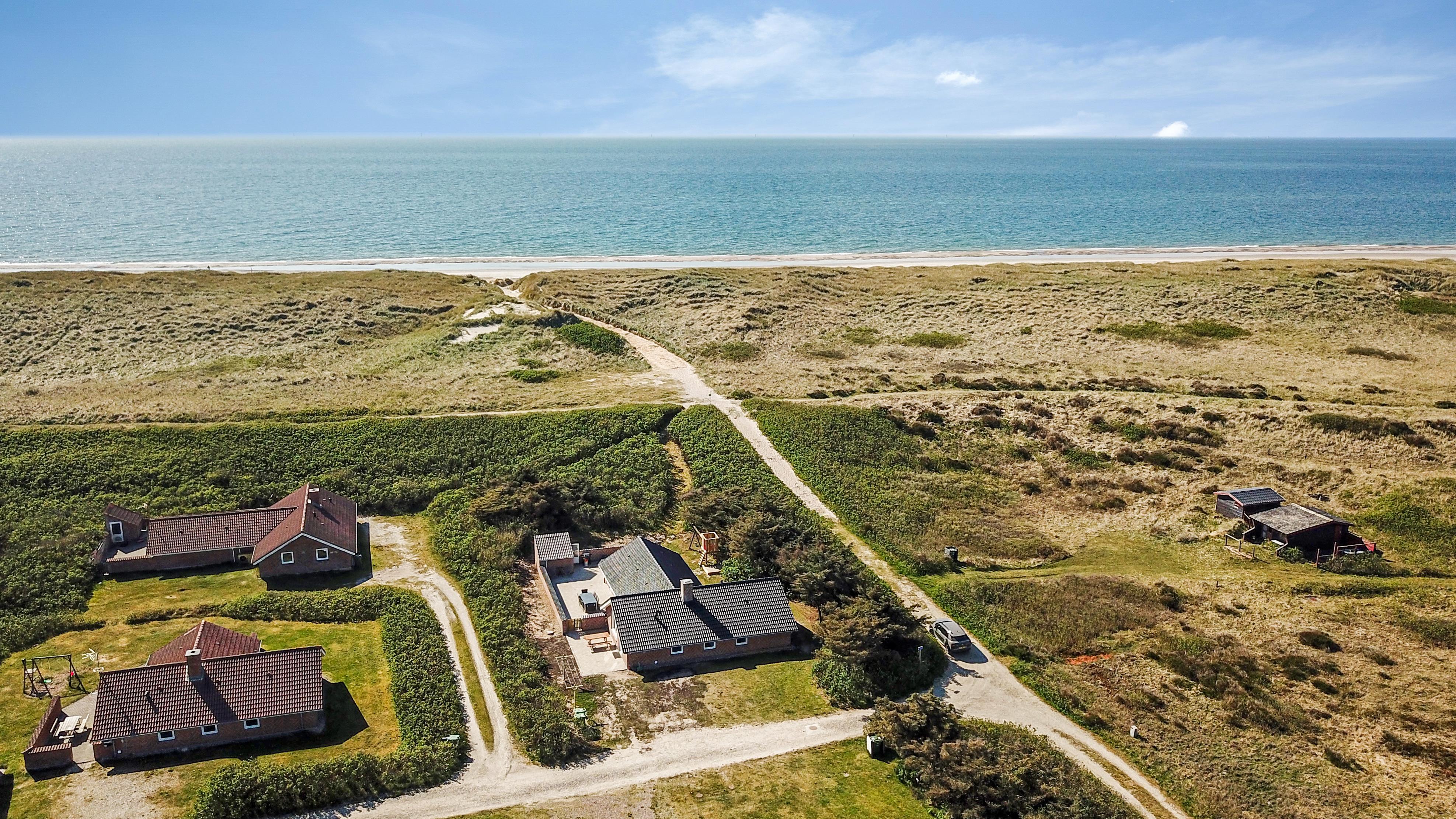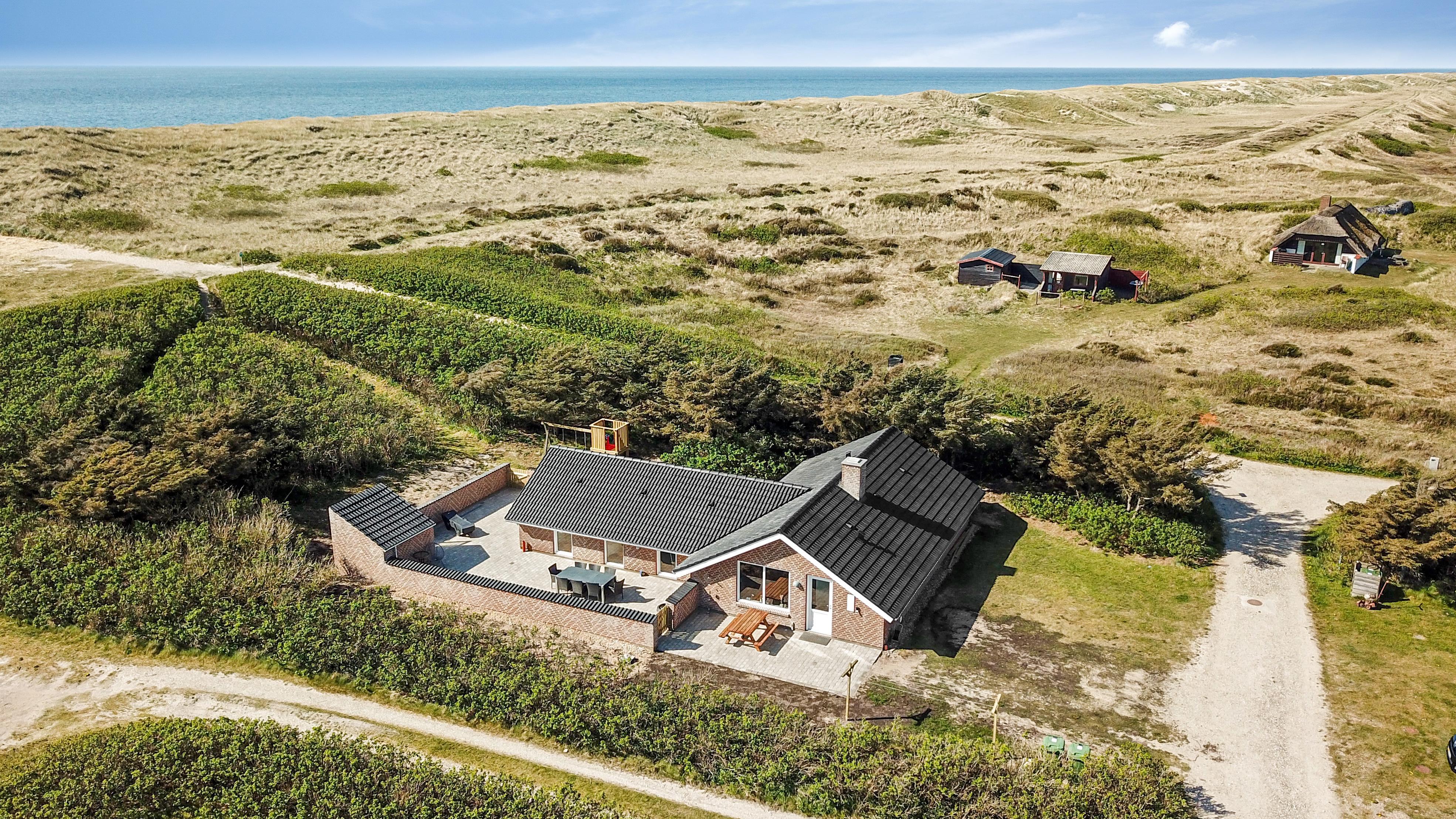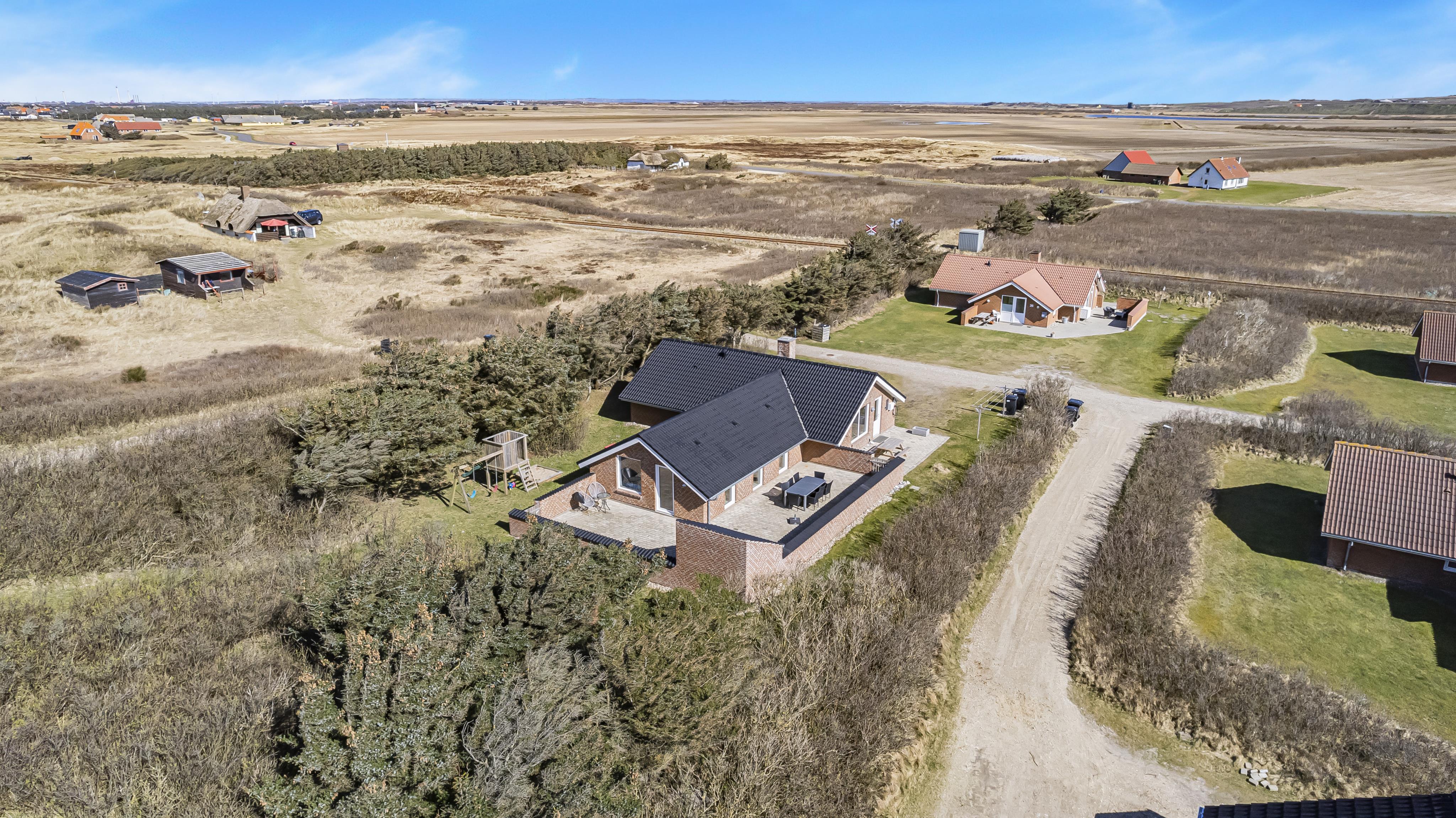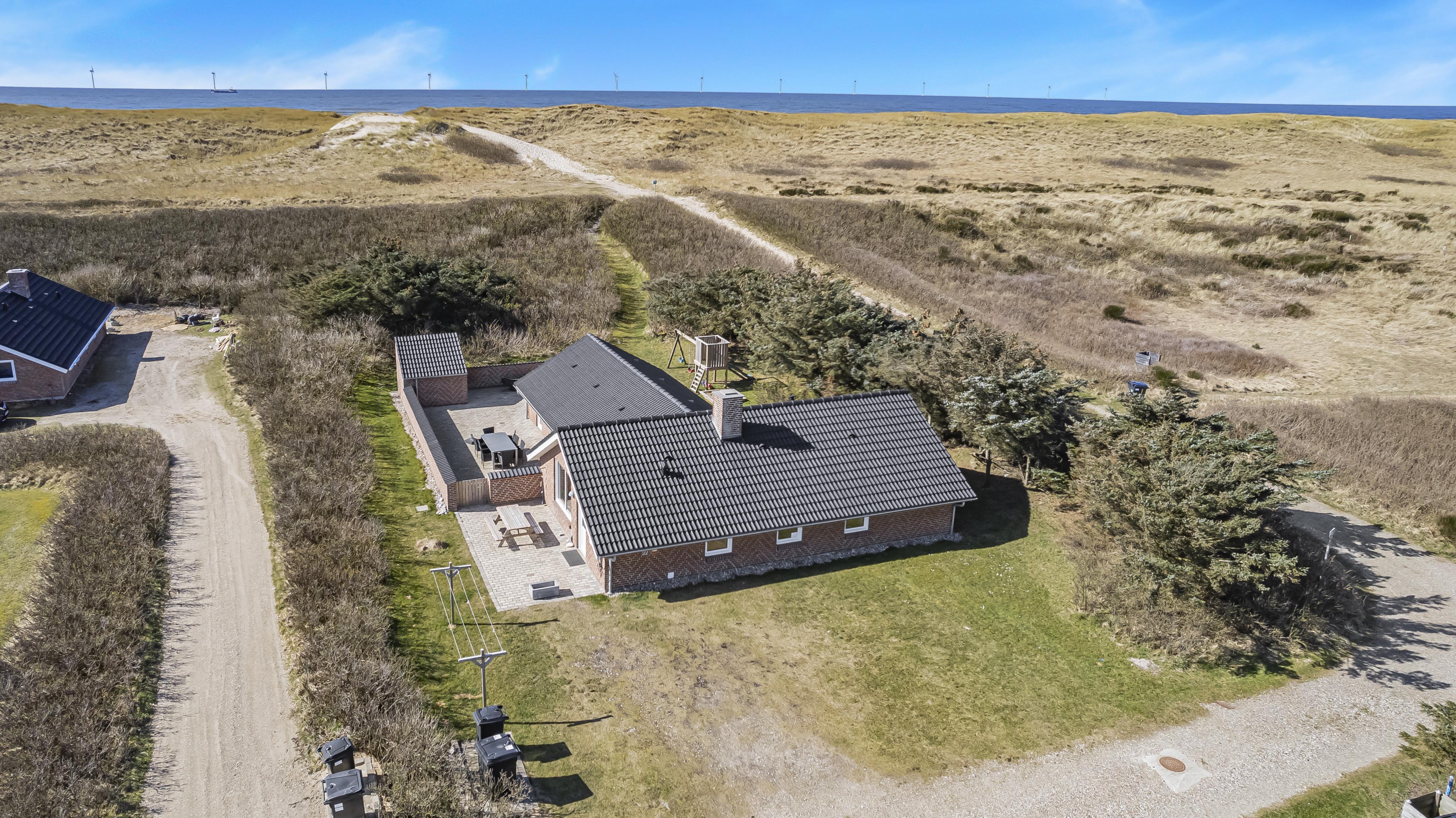 Huset ligger på en 1.407 m² stor naturgrund for enden af en blind vej – direkte op til klitterne. Fra haven er der privat sti til stranden og en stor, indhegnet terrasse med nye havemøbler, solvogne og gasgrill – ideelt til børnefamilier og gæster med hund. Her er også gynger, sandkasse og klatrestativ til børnene.