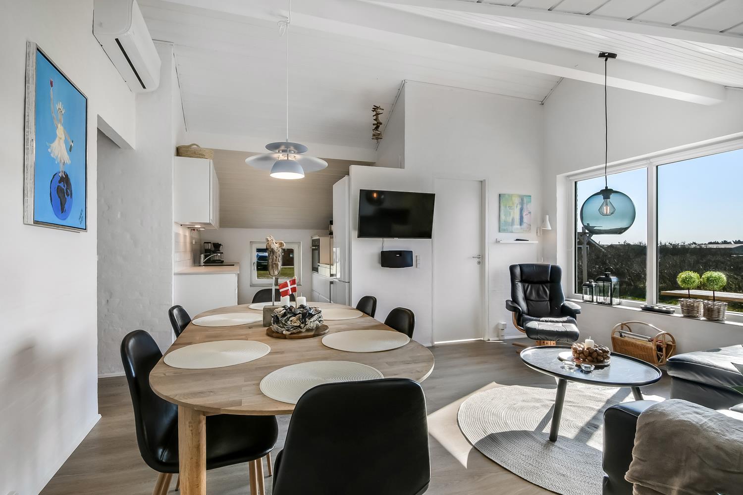 Det nye, veludstyrede køkken gør det let at tilberede måltider til hele familien, og en moderne luft-til-luft varmepumpe sikrer behageligt indeklima og lavere energiforbrug.