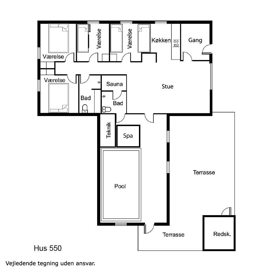 Huset har fire gode soveværelser (2 med dobbeltsenge, 1 med køjeseng, 1 med enkeltsenge), to badeværelser og et fantastisk poolområde. Her finder I en 5,5 x 3 m stor pool, spabad med plads til 4 personer, sauna og endnu et badeværelse – alt sammen med gulvvarme og energieffektivt luft-til-vand anlæg. Bluetooth-højtalere og ekstra TV gør pooltiden endnu mere underholdende.