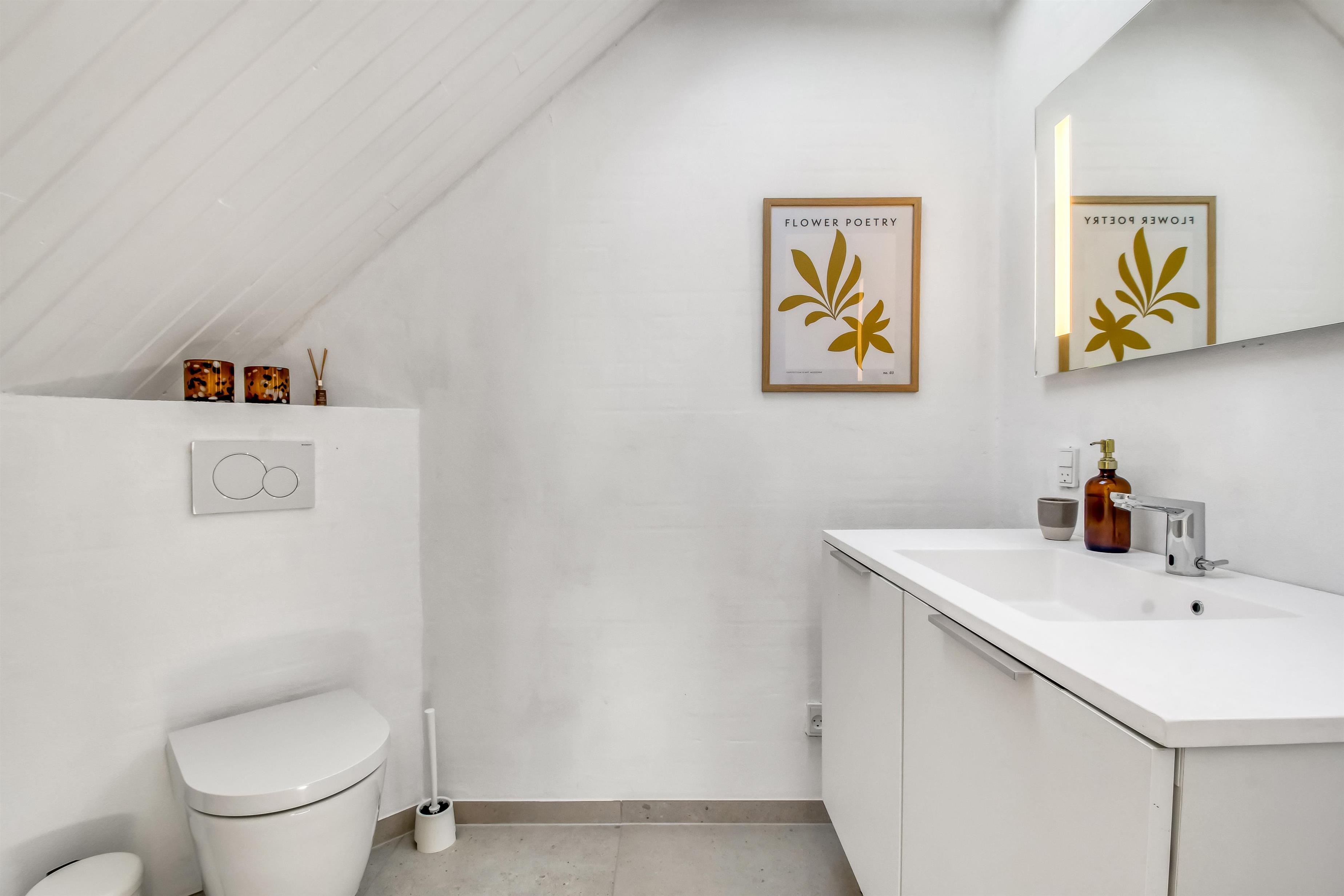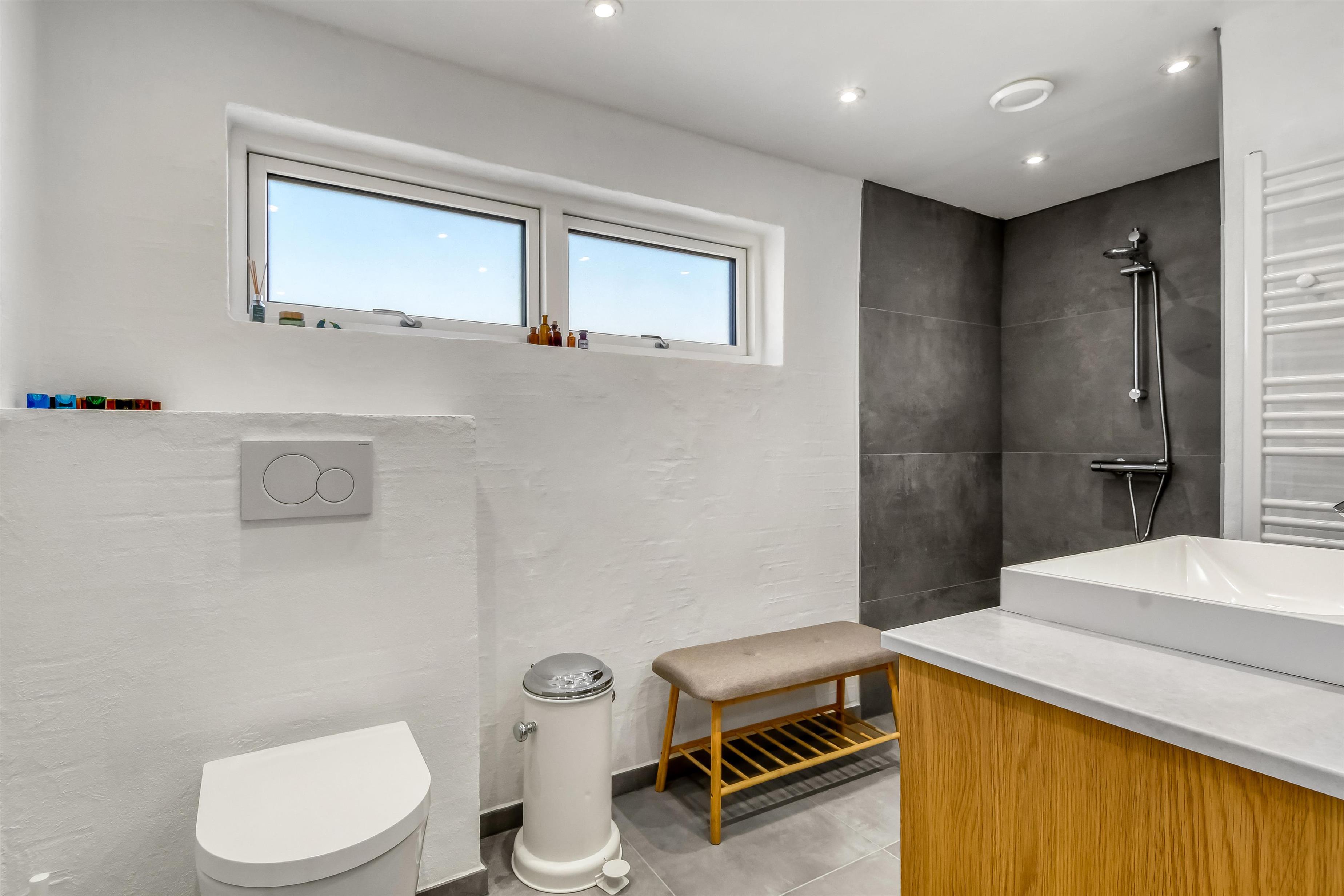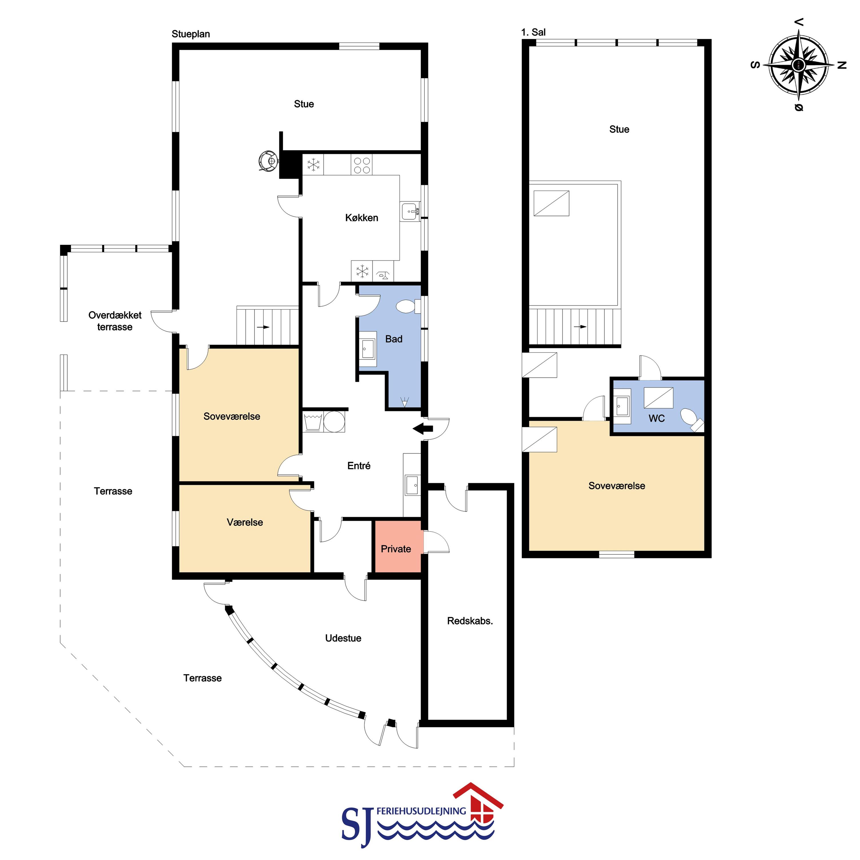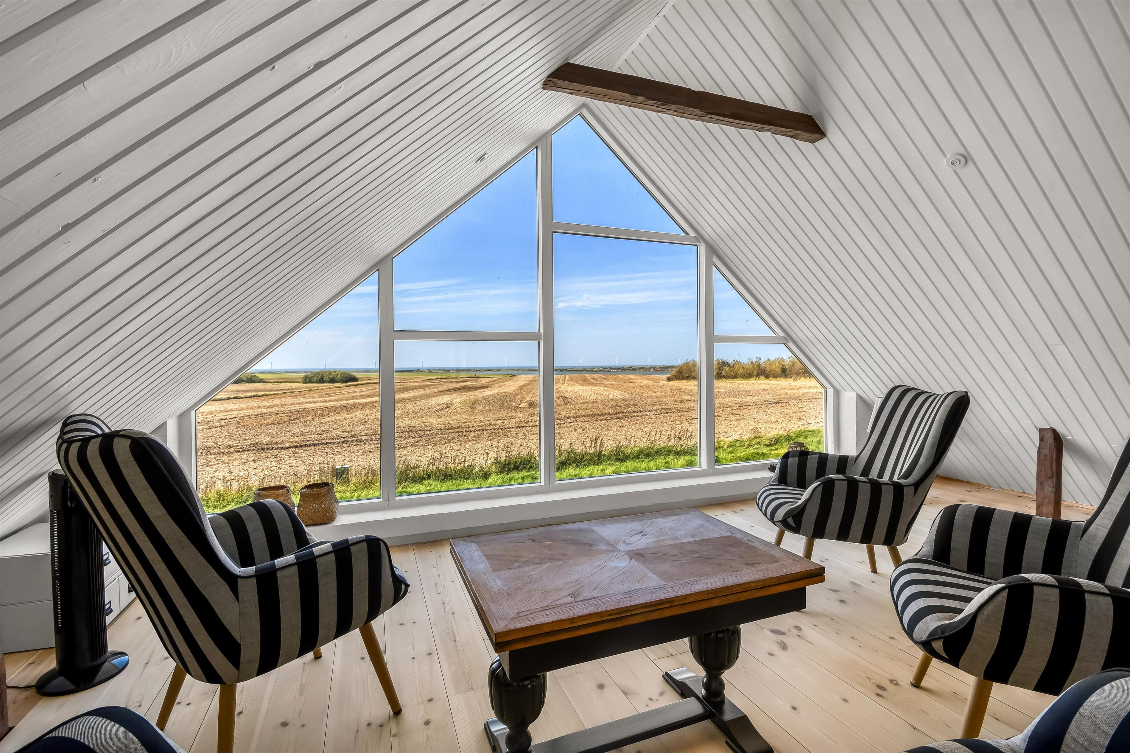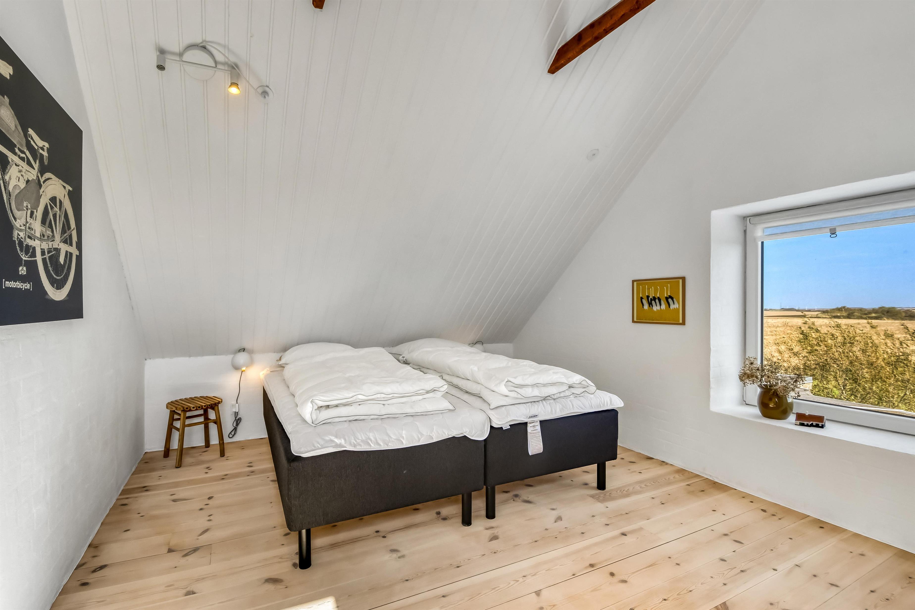 Via en muret trappe i stuen kommer man op på 1. sal, Her kommer man op i et stort område med panoramavinduer, hvorfra der er en fantastisk udsigt til Ferring Sø og Vesterhavet og området. På 1. sal er der også et badeværelse med toilet og håndvask. Husets sidste soverum findes også på 1 sal som ligger lige op af toilet har dobbeltseng 180x200