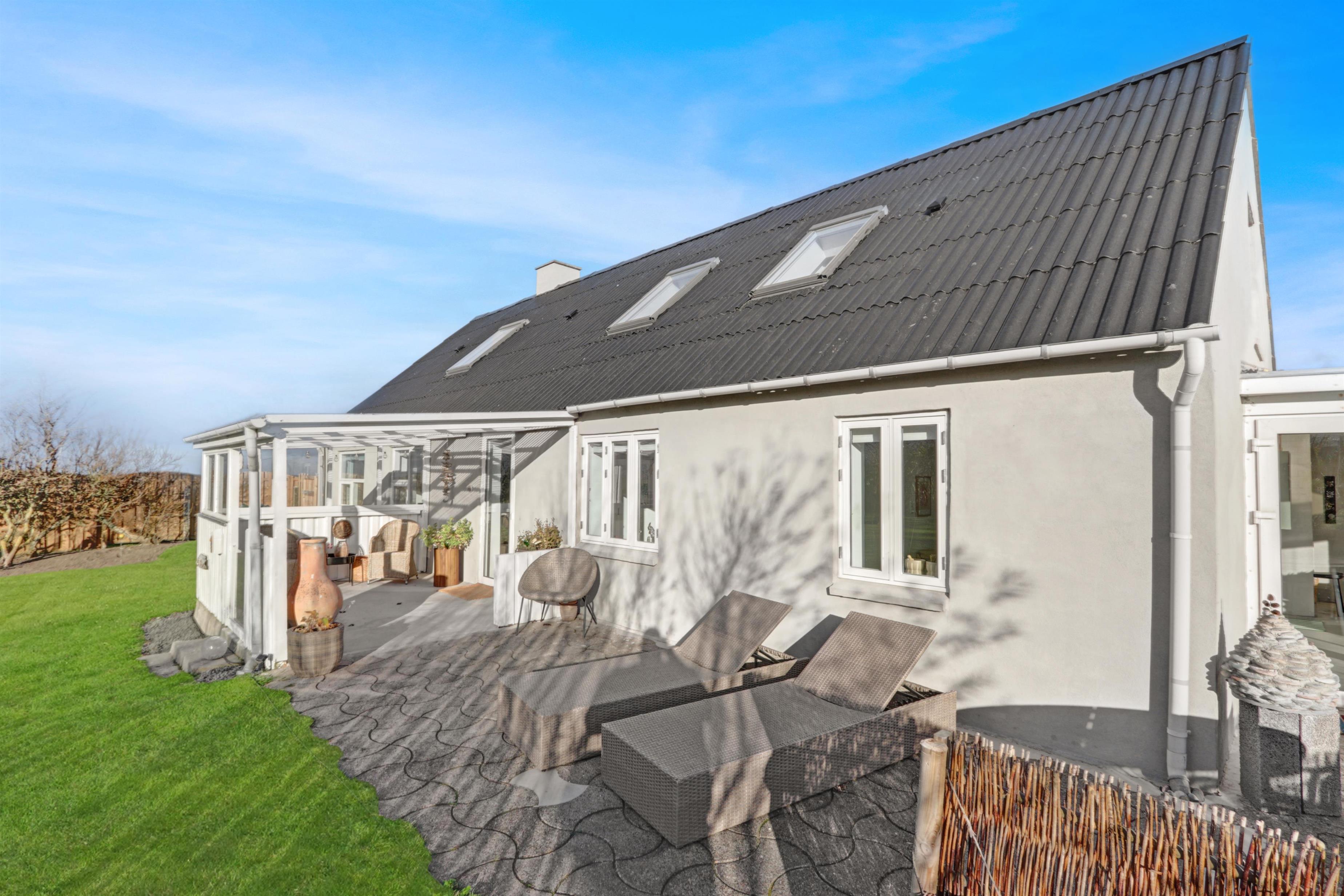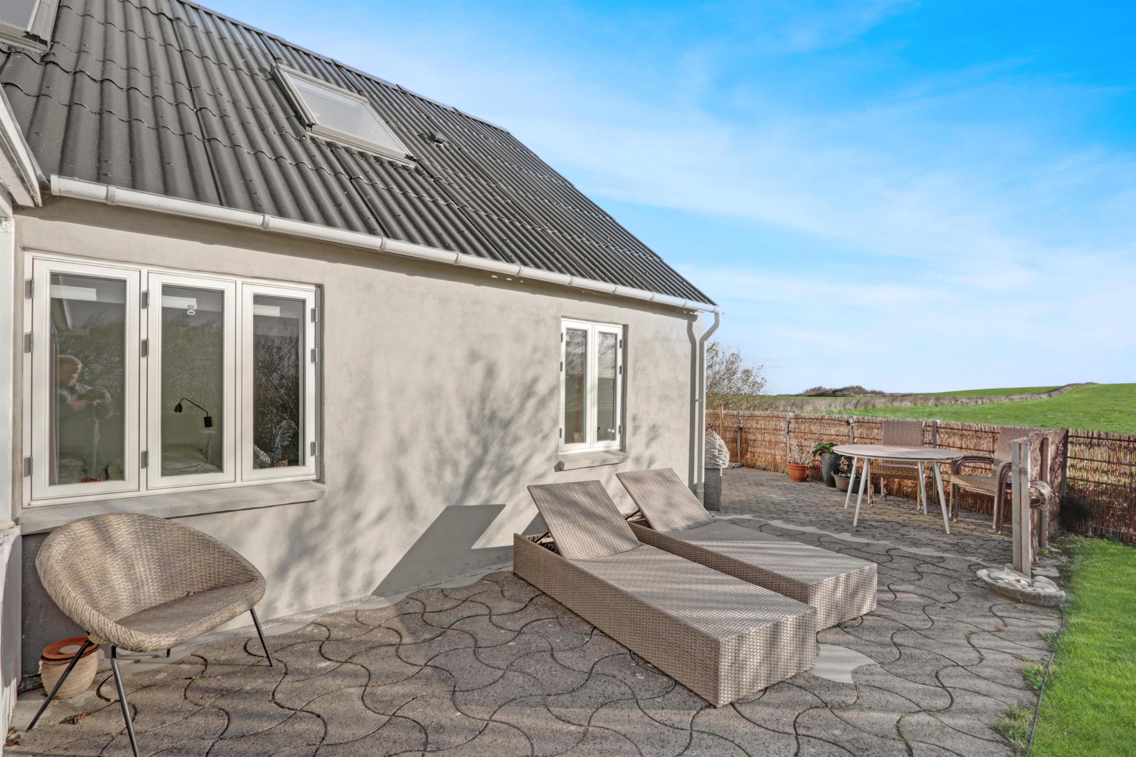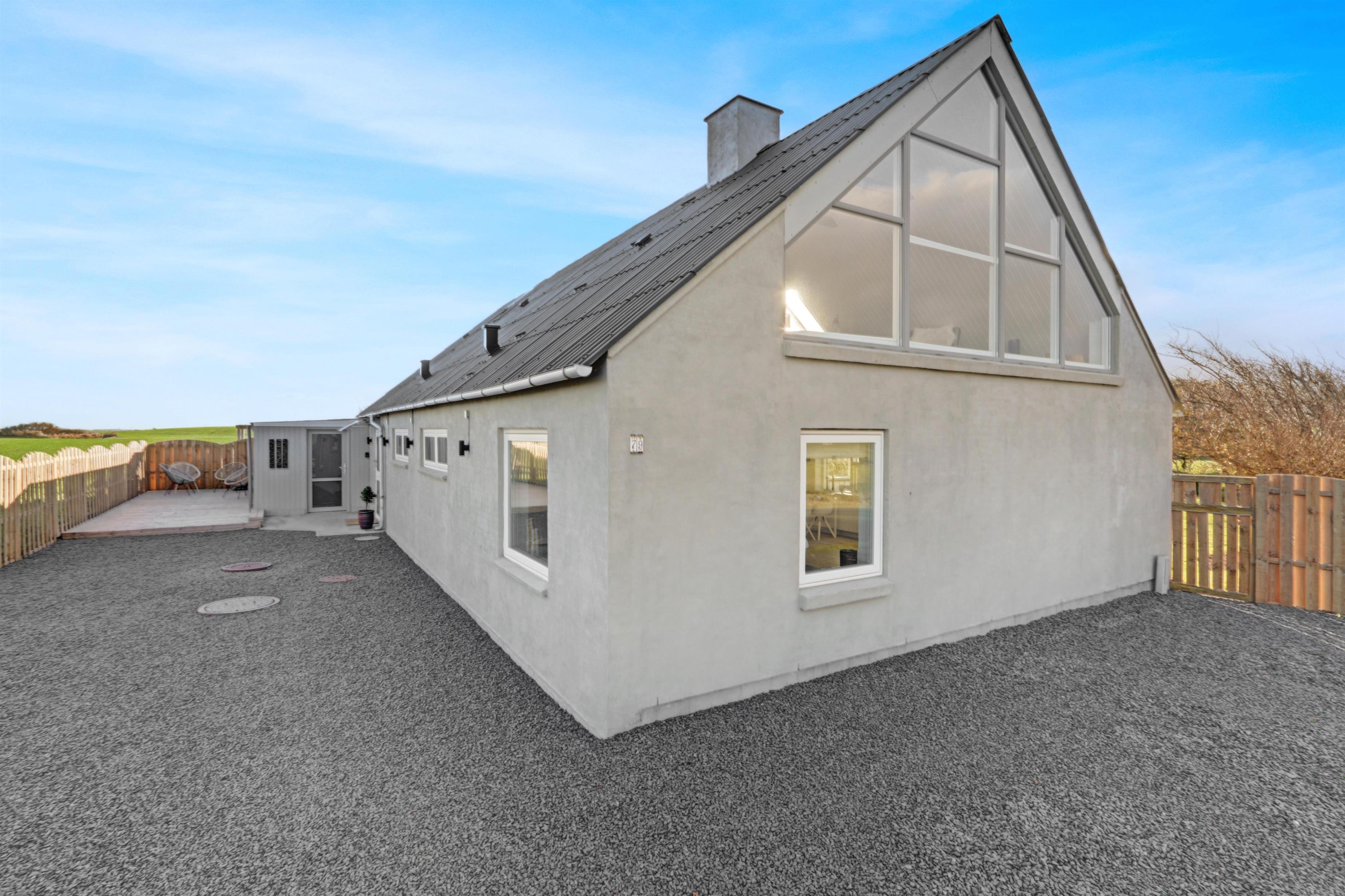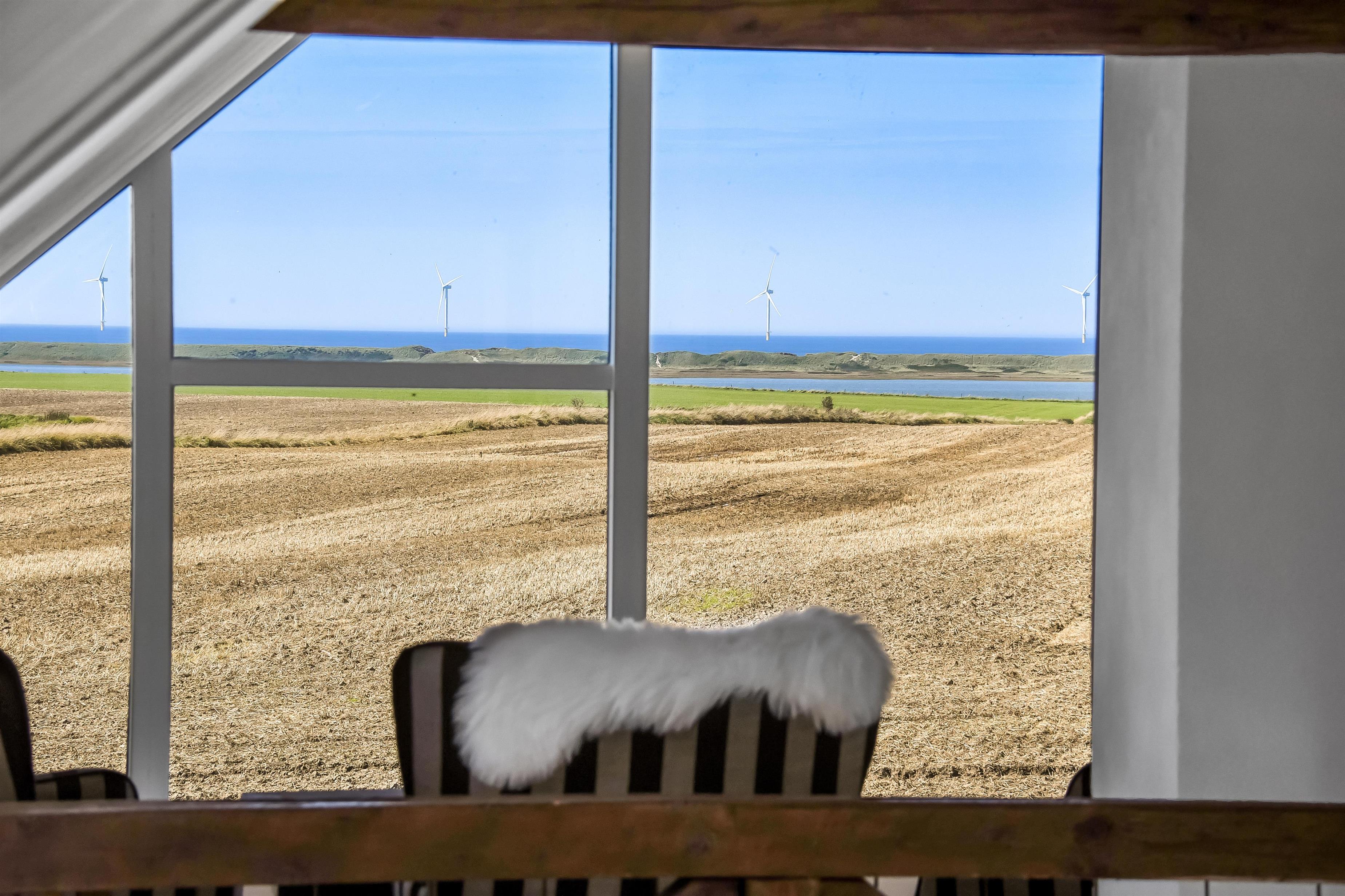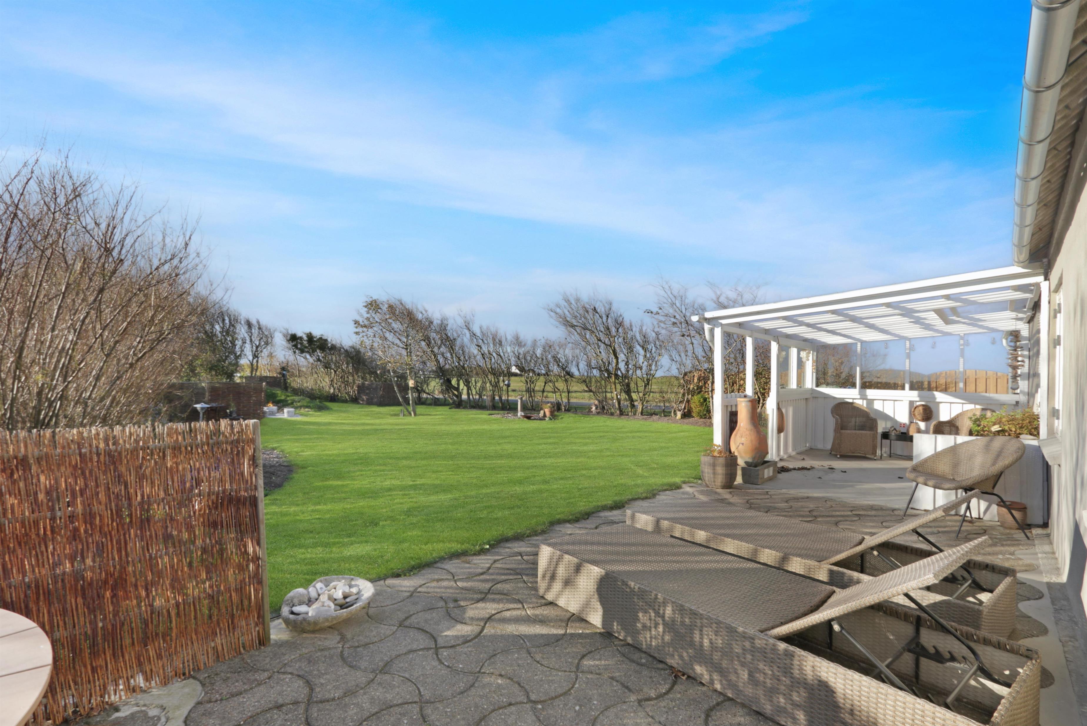 Huset er beliggende på en 802 m2 grund med flere gode terrasser hvor der altid er mulighed for at finde læ, der er en overdækket terrasse, hvor man kan forlænge de kølige aftner. Der er havemøbler, solvogne og grill som kan flyttes rundt efter behov. Grunden er omgivet af buske og træer som giver gode læmuligheder. Huset ligger ca. 2250 m fra Vesterhavet og indkøb sommersæson. Eller 10 min kørsel til gode indkøbsmuligheder. Der findes en have med masser af charme. Ønsker man at bo fantastisk med en flot udsigt og helt for sig selv så er dette hus det perfekte valg.