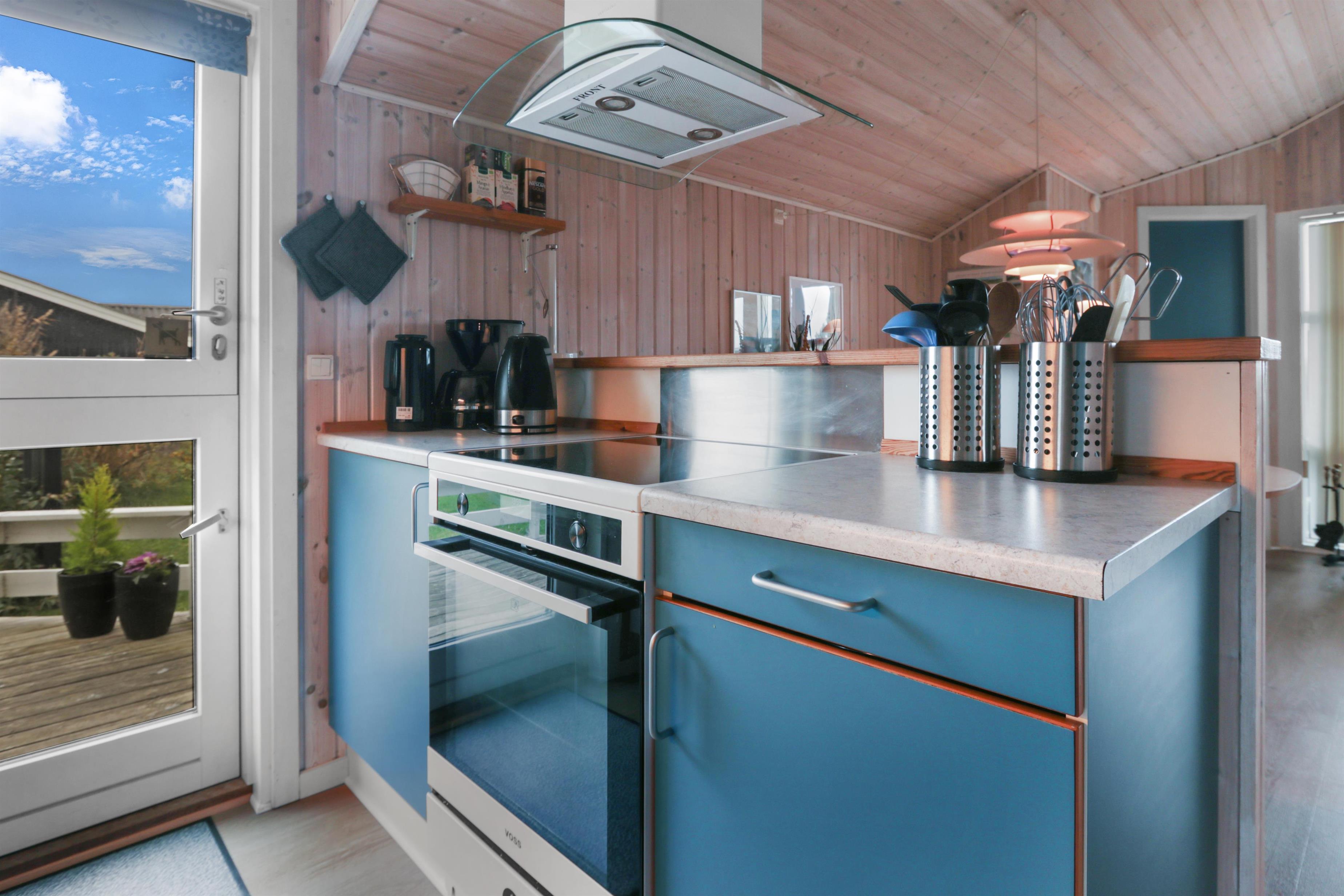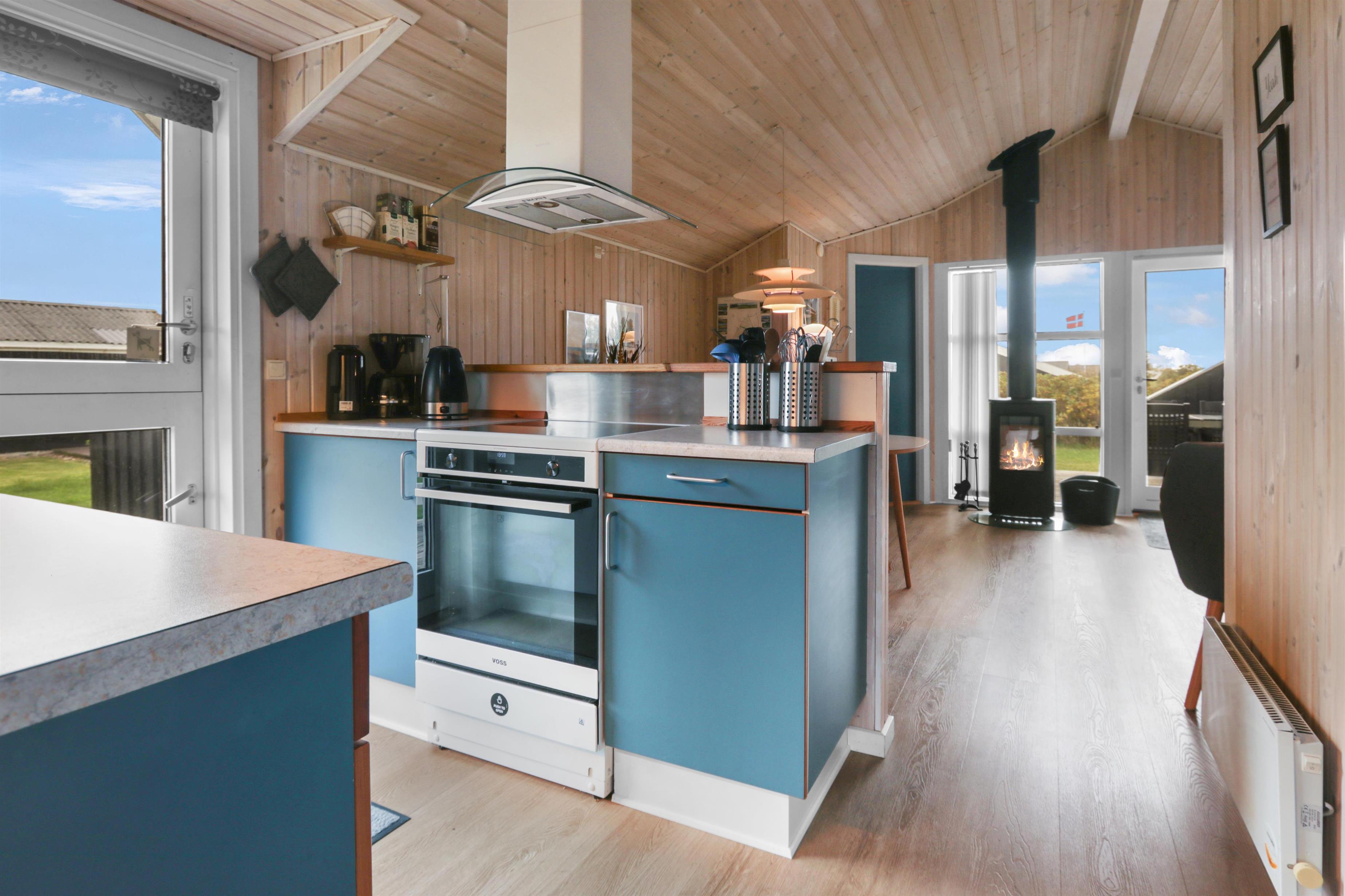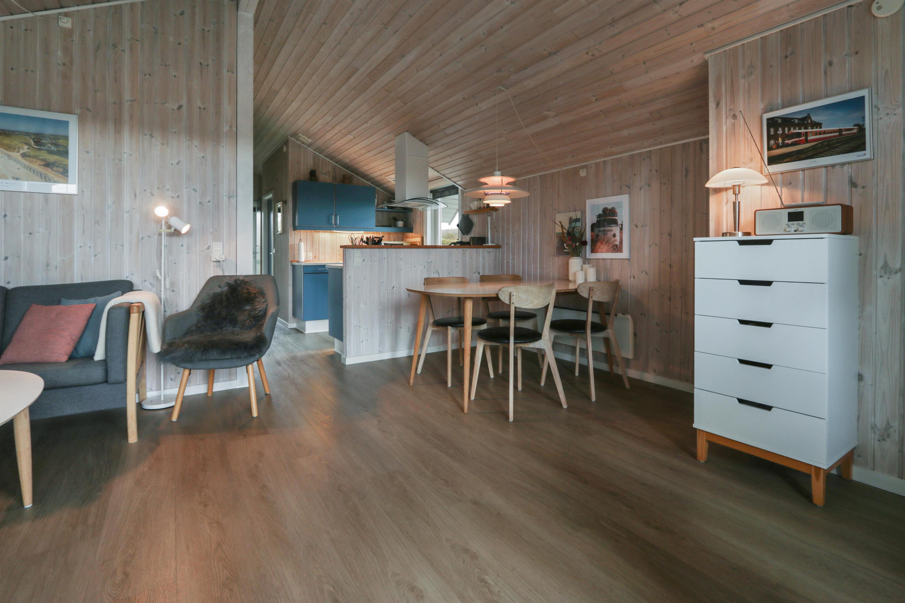 Feriehuset er på 65 m² og har plads til seks personer. Indretningen er lys og indbydende med en hyggelig kombineret stue og køkken. Det pæne og moderne køkken er veludstyret med komfur med glaskeramiske kogeplade, emhætte, opvaskemaskine, mikroovn samt køle-/fryseskab, så du nemt kan tilberede dagens måltider. Spisepladsen ligger i forlængelse af køkkenet og danner rammen om hyggelige måltider med familien.