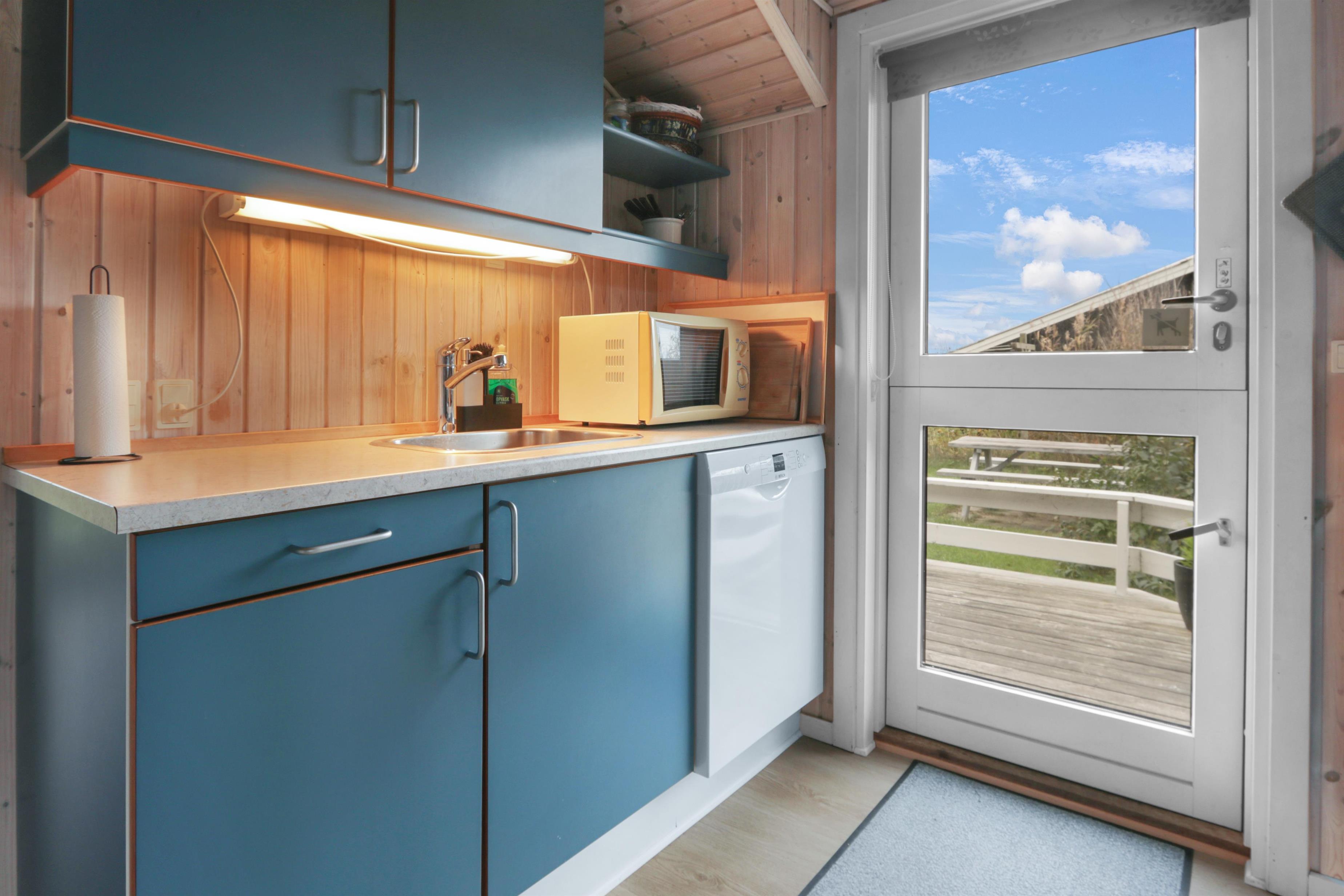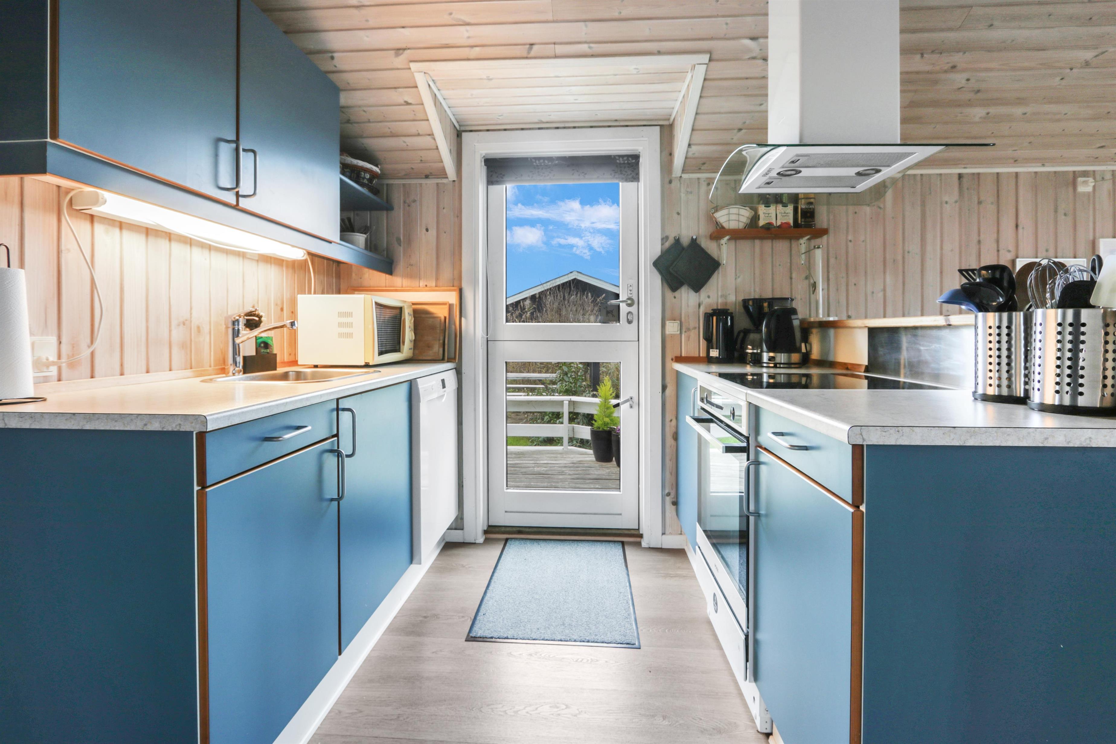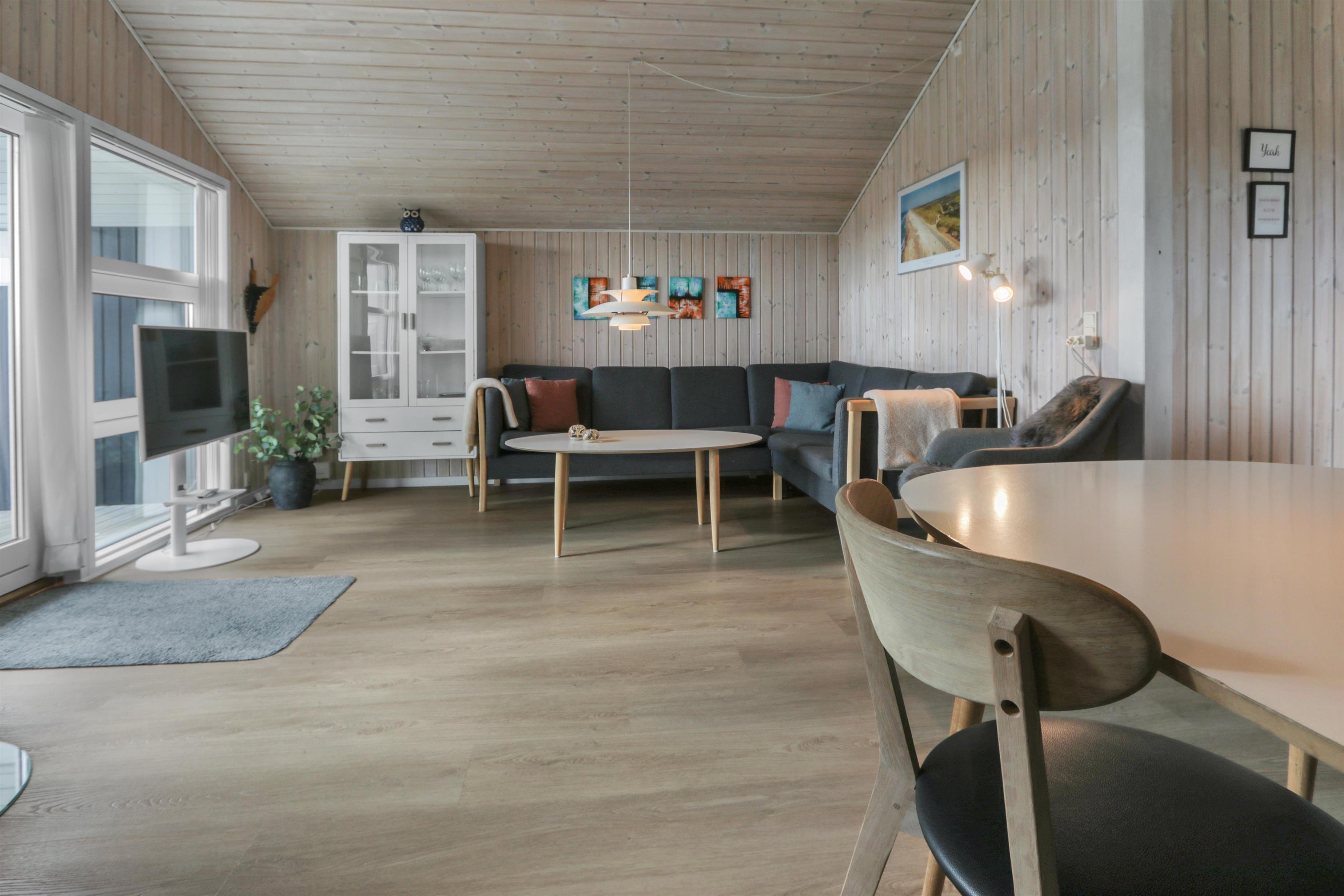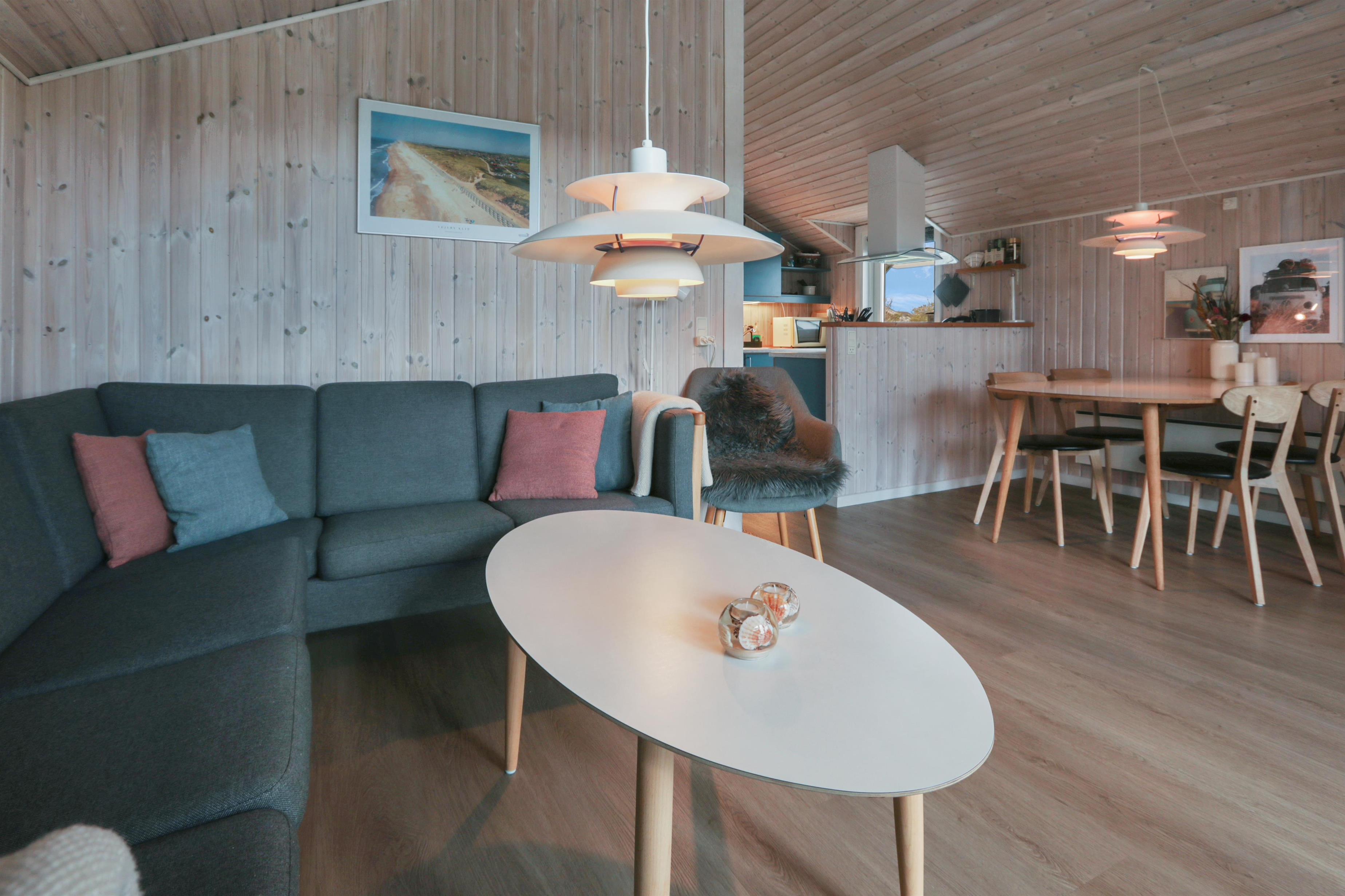 Feriehuset er på 65 m² og har plads til seks personer. Indretningen er lys og indbydende med en hyggelig kombineret stue og køkken. Det pæne og moderne køkken er veludstyret med komfur med glaskeramiske kogeplade, emhætte, opvaskemaskine, mikroovn samt køle-/fryseskab, så du nemt kan tilberede dagens måltider. Spisepladsen ligger i forlængelse af køkkenet og danner rammen om hyggelige måltider med familien.