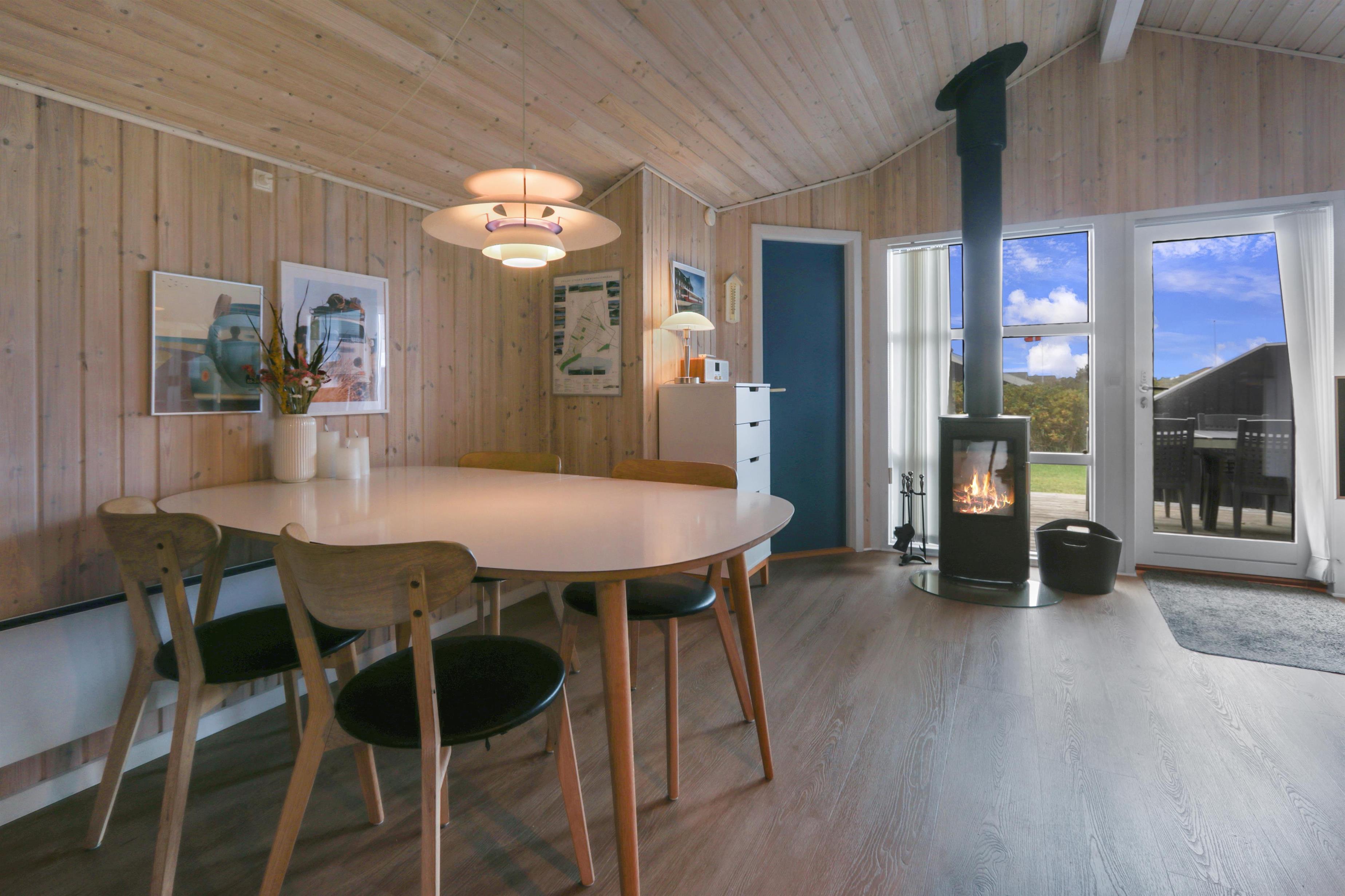 Brændeovnen skaber en dejlig varme og en hyggelig atmosfære på kølige dage, uanset årstiden.