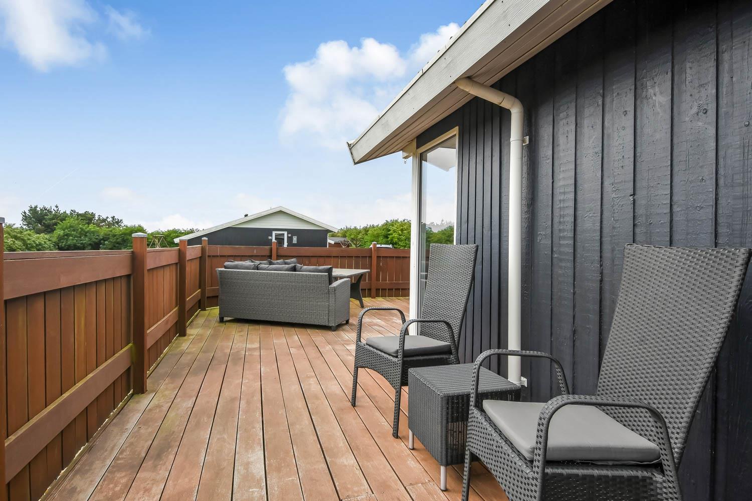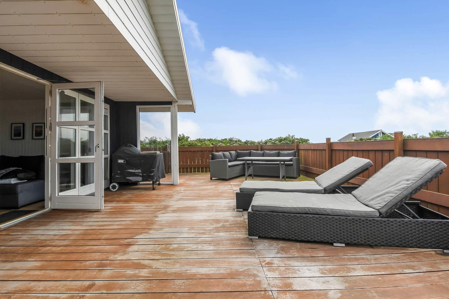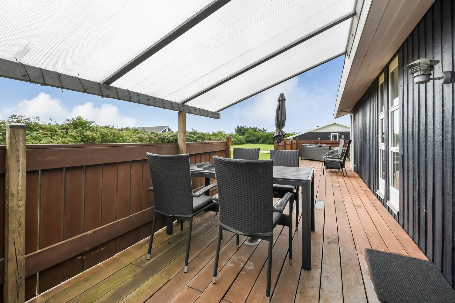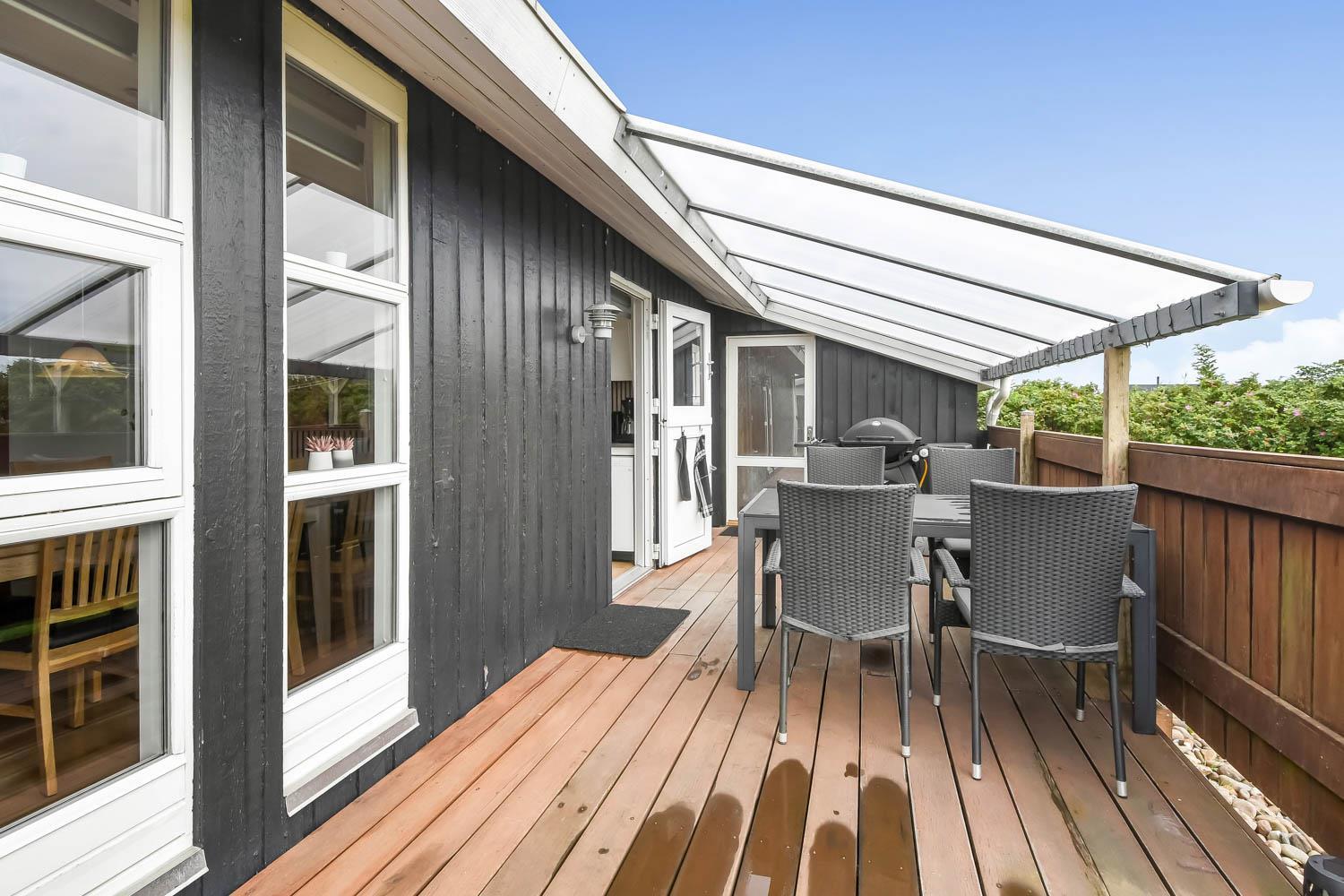 Fra stue er der udgang til et stort, delvis overdækket og indhegnet terrasseanlæg (ca. 80 m2 heraf er ca. 10m2 delvis overdækket) . Terrassen er omkranset af et stakit. Flere sæt havemøbler, liggestole og gasgrill. Området omkring Vejlby og Ferring sø ligger ikke langt fra det brusende Vesterhav (550 m) og stranden. Naturen indbyder meget til udendørsaktiviteter året rundt - uanset om det er gåture i landskabet omkring søen eller en strandtur. Områdets købmand ligger tæt på huset. I højsæsonen byder han på frisk morgenbrød, og her kan daglige indkøb også klares. Der er heller ikke langt til dagligvarebutikker i både Vejlby og Harboøre - Og er du i bil kan du køre til Lemvig - 'Smilets by' eller den meget populære turistby Thyborøn, hvor du begge steder finder flere dagligvarebutikker, spisesteder samt velfungerende detailhandel. Det ideelle huse for den 2 personer eller den lille familie som ønsker en beliggenhed tæt på sø, hav og strand