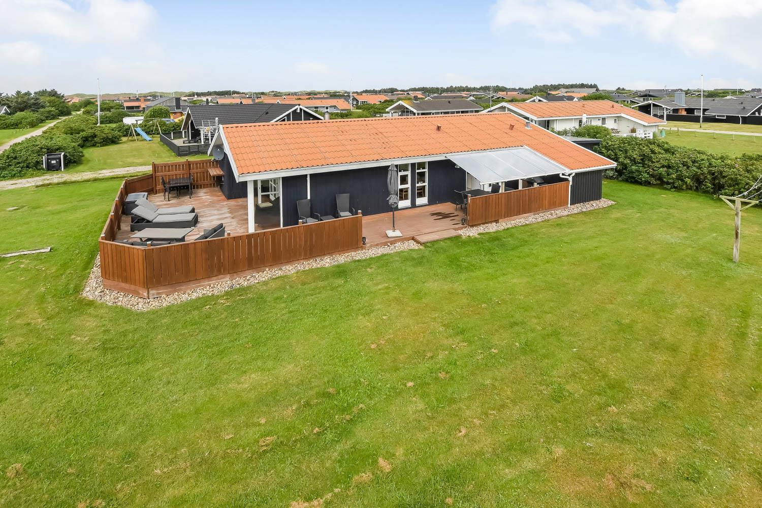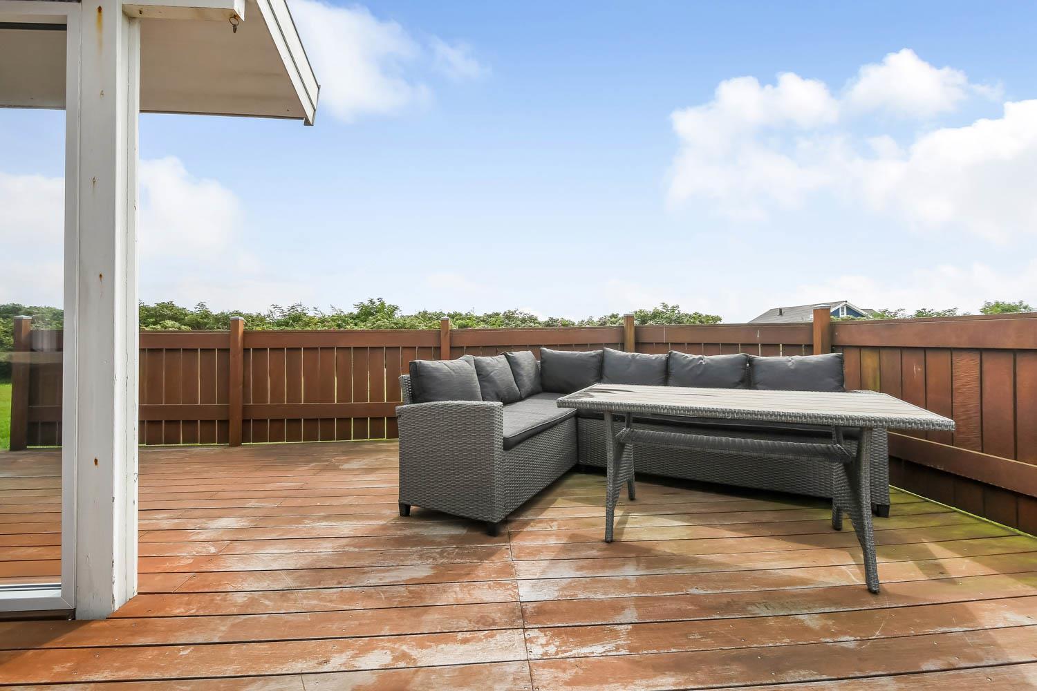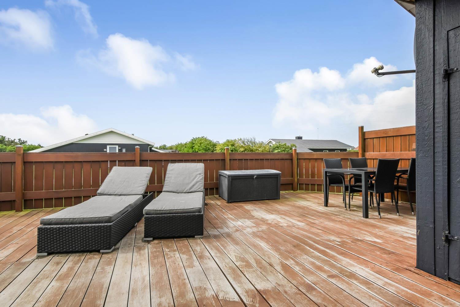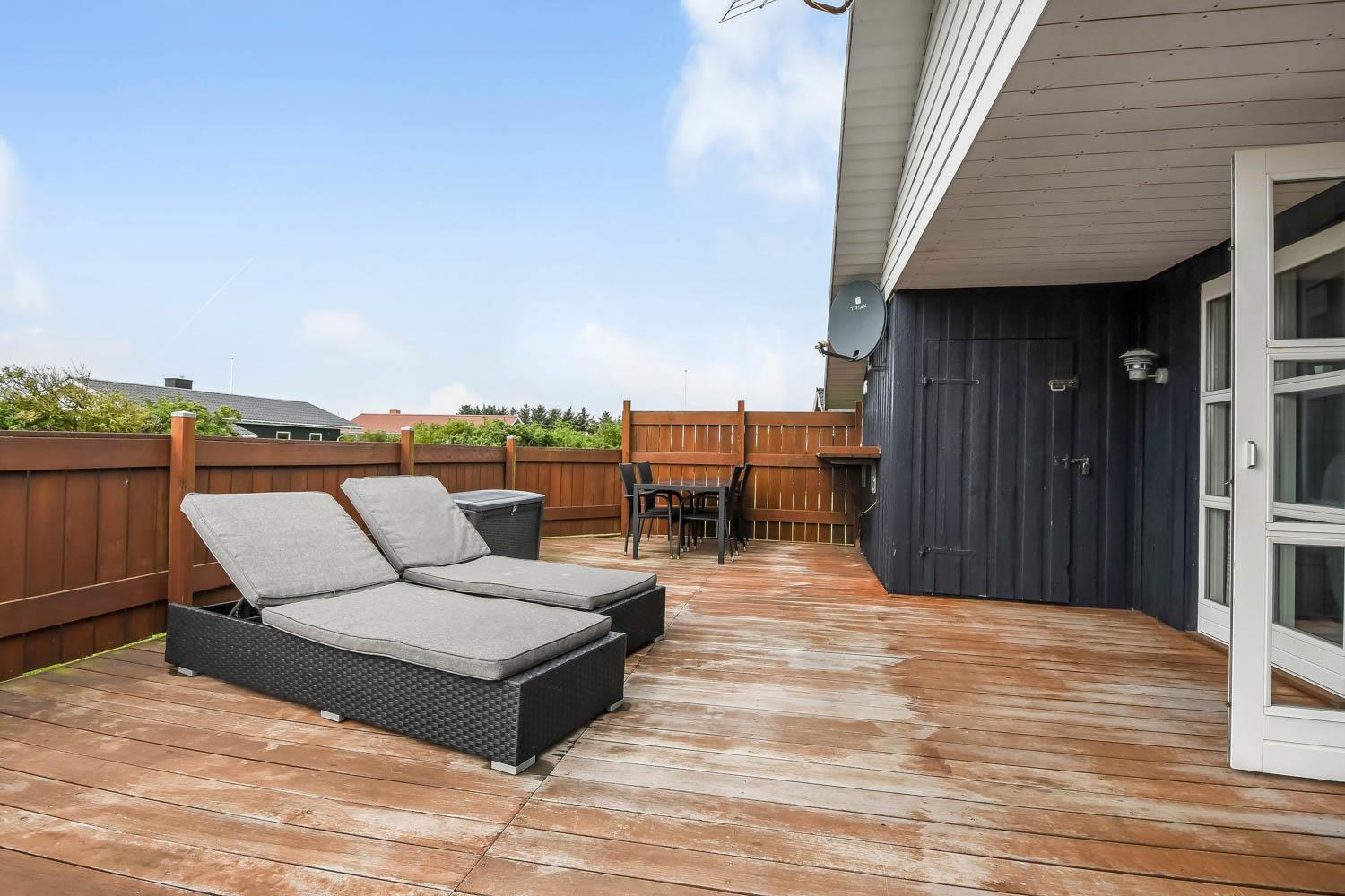 Fra stue er der udgang til et stort, delvis overdækket og indhegnet terrasseanlæg (ca. 80 m2 heraf er ca. 10m2 delvis overdækket) . Terrassen er omkranset af et stakit. Flere sæt havemøbler, liggestole og gasgrill. Området omkring Vejlby og Ferring sø ligger ikke langt fra det brusende Vesterhav (550 m) og stranden. Naturen indbyder meget til udendørsaktiviteter året rundt - uanset om det er gåture i landskabet omkring søen eller en strandtur. Områdets købmand ligger tæt på huset. I højsæsonen byder han på frisk morgenbrød, og her kan daglige indkøb også klares. Der er heller ikke langt til dagligvarebutikker i både Vejlby og Harboøre - Og er du i bil kan du køre til Lemvig - 'Smilets by' eller den meget populære turistby Thyborøn, hvor du begge steder finder flere dagligvarebutikker, spisesteder samt velfungerende detailhandel. Det ideelle huse for den 2 personer eller den lille familie som ønsker en beliggenhed tæt på sø, hav og strand