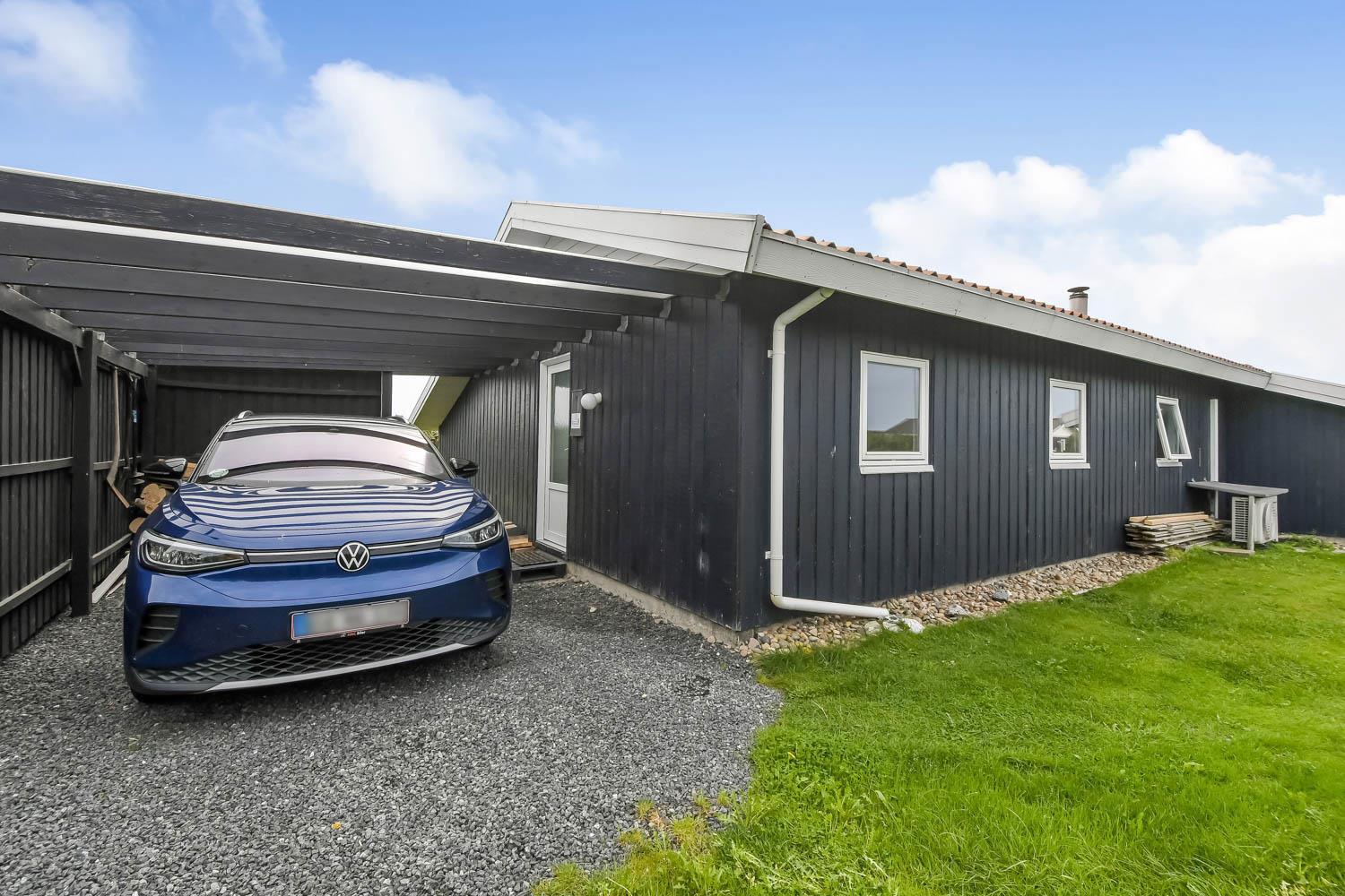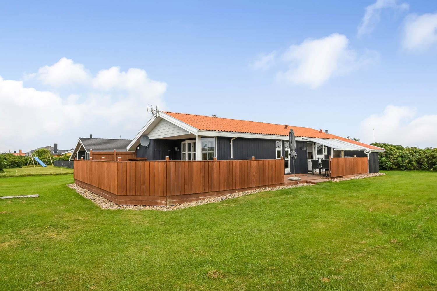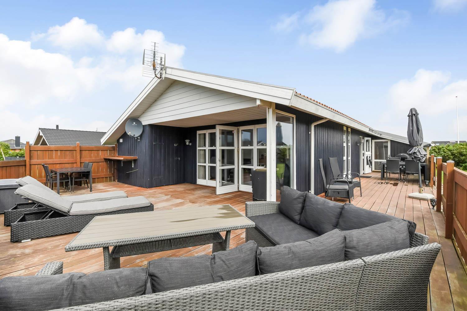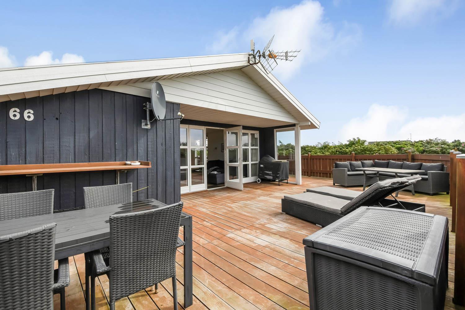 Fra stue er der udgang til et stort, delvis overdækket og indhegnet terrasseanlæg (ca. 80 m2 heraf er ca. 10m2 delvis overdækket) . Terrassen er omkranset af et stakit. Flere sæt havemøbler, liggestole og gasgrill. Området omkring Vejlby og Ferring sø ligger ikke langt fra det brusende Vesterhav (550 m) og stranden. Naturen indbyder meget til udendørsaktiviteter året rundt - uanset om det er gåture i landskabet omkring søen eller en strandtur. Områdets købmand ligger tæt på huset. I højsæsonen byder han på frisk morgenbrød, og her kan daglige indkøb også klares. Der er heller ikke langt til dagligvarebutikker i både Vejlby og Harboøre - Og er du i bil kan du køre til Lemvig - 'Smilets by' eller den meget populære turistby Thyborøn, hvor du begge steder finder flere dagligvarebutikker, spisesteder samt velfungerende detailhandel. Det ideelle huse for den 2 personer eller den lille familie som ønsker en beliggenhed tæt på sø, hav og strand