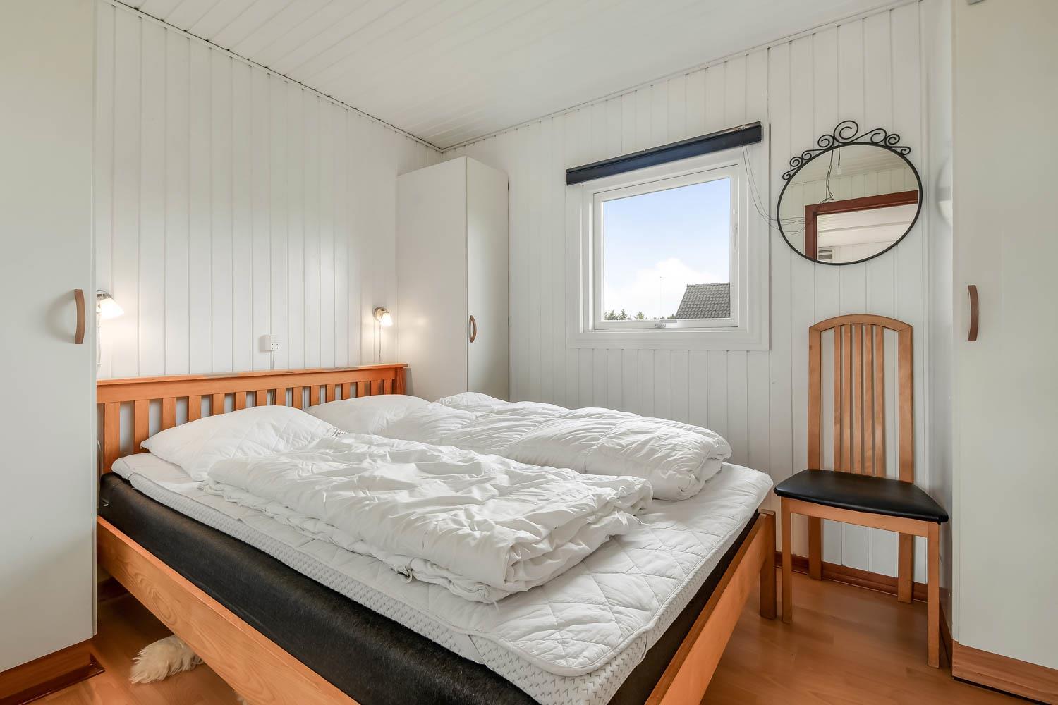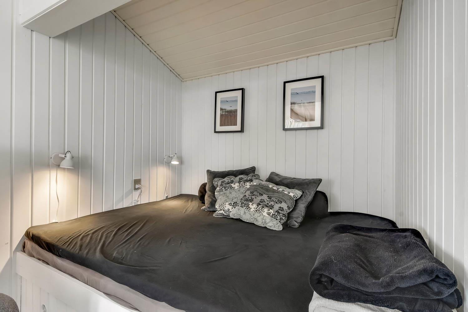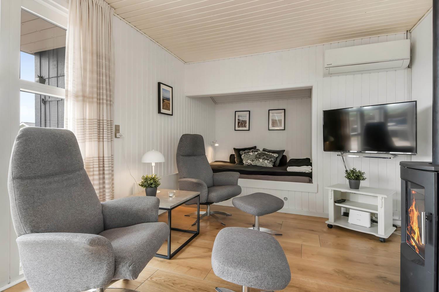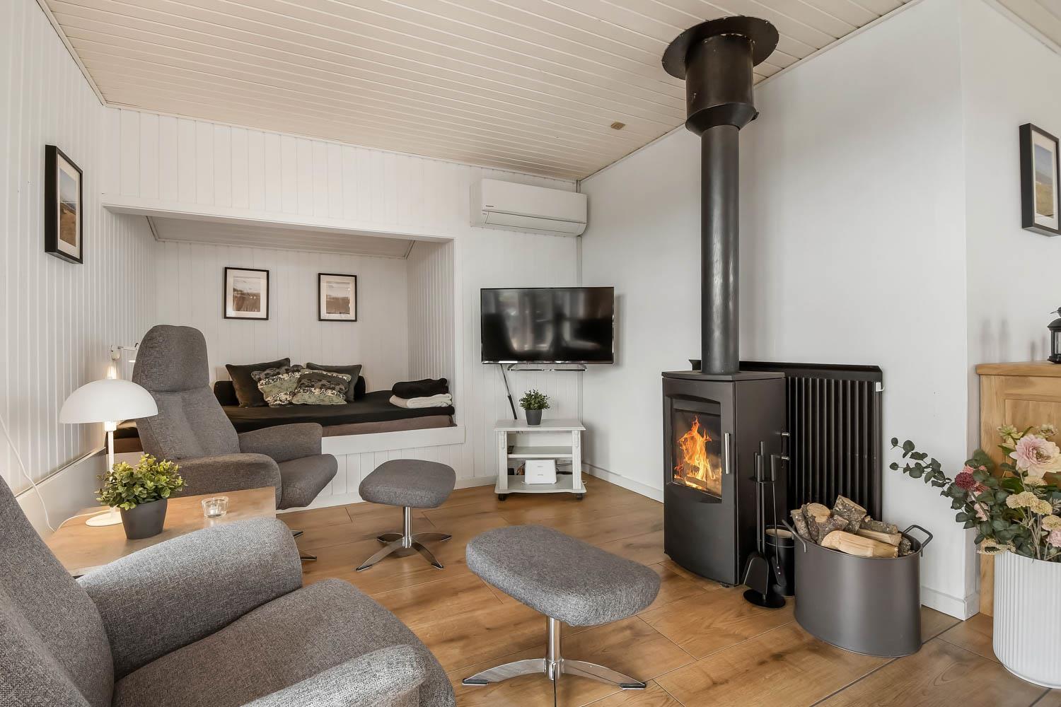 81 m2 stort, godt udnyttet træhus med 3 soveværelse (1DS, 1DS, 2ES) samt en dejlig alkove i opholdsstuen som kan bruges til 2 sovepladser. Hyggelig, kombineret opholdsstue og køkkenhjørne. Opholdsstue med DAB-radio med bluetooth, DVD-afspiller, TV med danske og tyske programmer samt Chromecast til streaming af TV / radio / Apps, så har du en mobiltelefon eller et andet device med kan du streame hvad du nu har abonnement. Der er komfortable møbler og spisebord direkte ved køkkenhjørnet. Slap af foran den knitrende brændeovn som sammen med varmepumpen hjælper med at reducere udgiften til varmeregningen. Huset fremstår overalt lyst og venligt med bl.a. nye gulve. Køkkenhjørne med glaskeramisk komfur, emhætte, køleskab med fryseboks (92L), mikroovn, opvaskemaskine og alt i service og køkkengrej. Flot istandsat og godt udnyttet badeværelse med klinkegulv med gulvvarme, bruser, toilet, håndvask og mini-vaskemaskine. Højstol til de mindste. Ekstra køleskab med lille fryseboks i skuret.