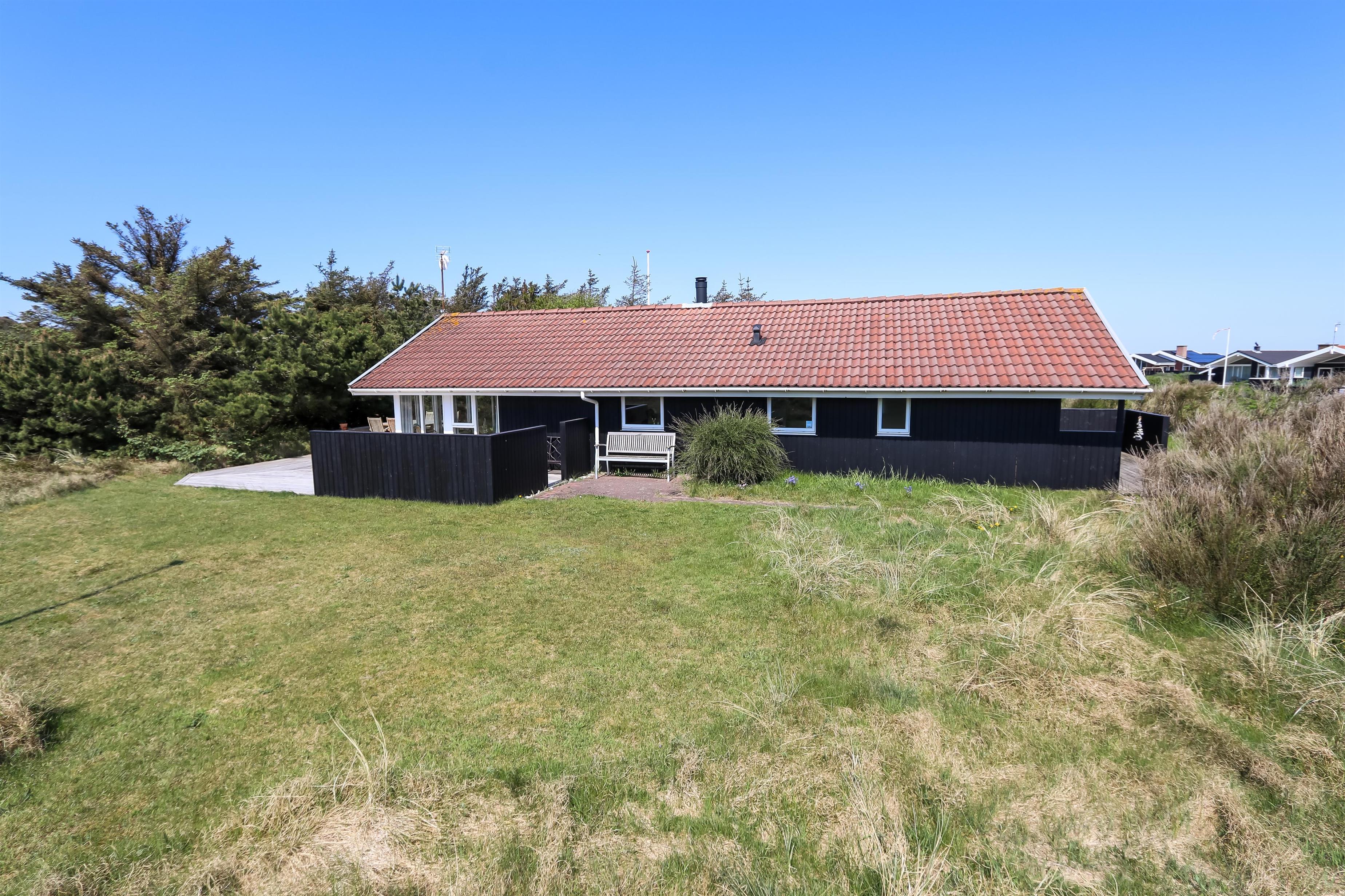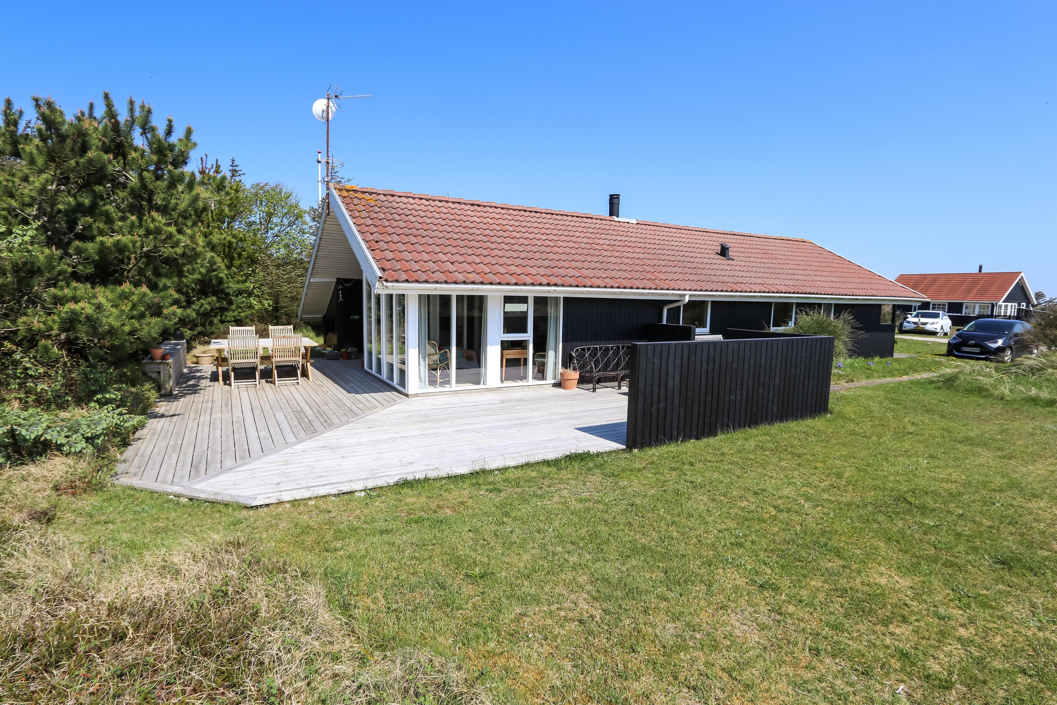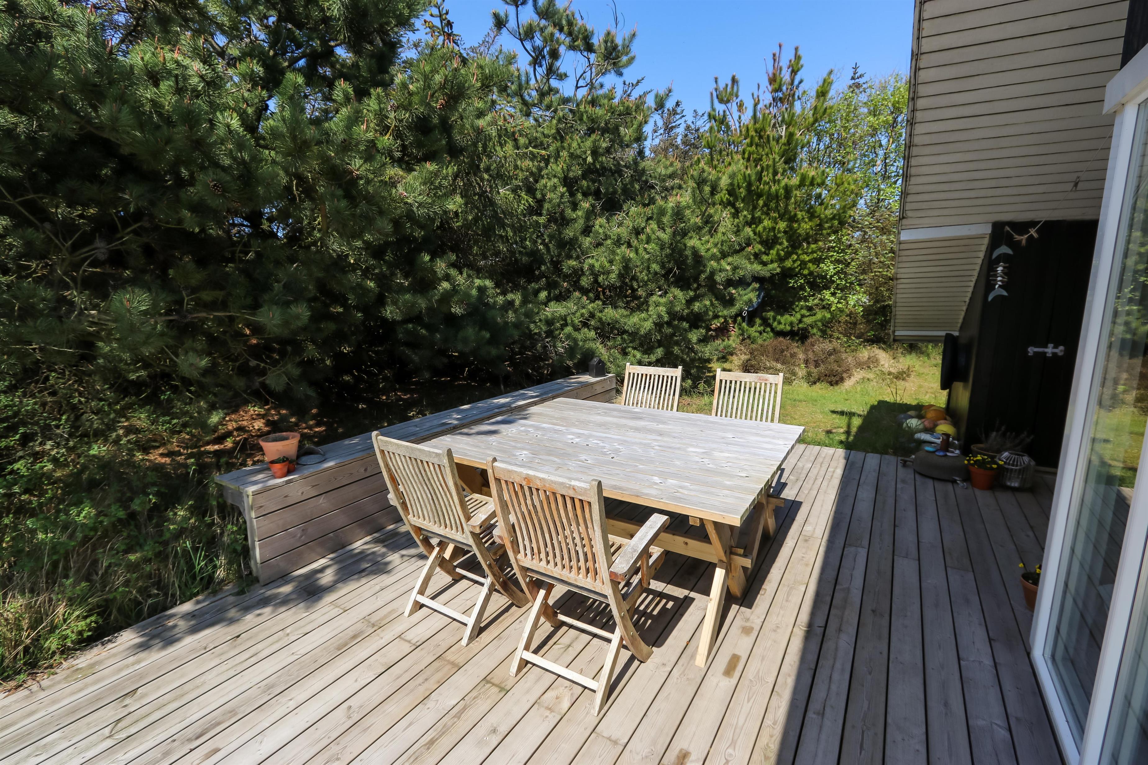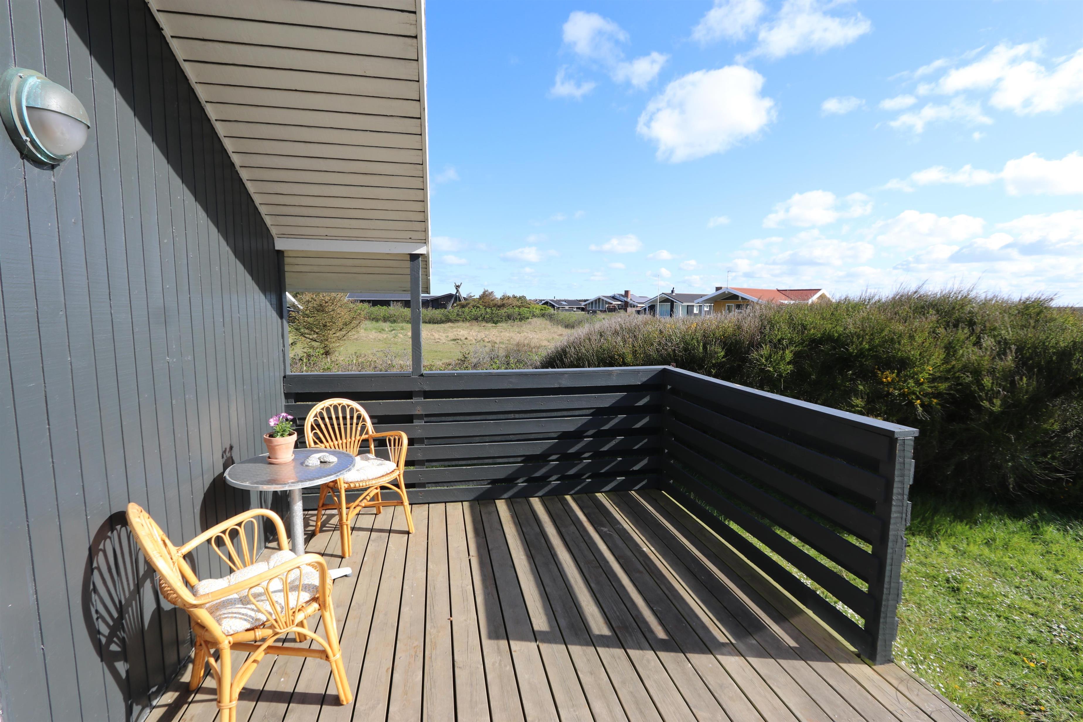 Huset er beliggende på en ca. 2.000 m2 klitgrund. Fra stuen er der udgang til en stor delvis overdækket terrasse med havemøbler, liggestole og grill. Morgenterrasse med havemøbler som er perfekt til at læse dagens avis og nyde morgenens kop kaffe. Der kan altid findes en plads i solen. Et utrolig dejligt hus, hvor der er tænkt på det meste og med masser af muligheder. Lige over klitten ligger Vesterhavet, der altid inviterer til en frisk gå- eller løbetur. Indenfor 25-30 minutter kan flere aktiviteter og shopping muligheder nås. Så hvad enten I er til aktiv ferie eller total afslapning, danner dette dejlige moderniserede feriehus en dejlig ramme både hvad angår hus, beliggenhed og omgivelser.