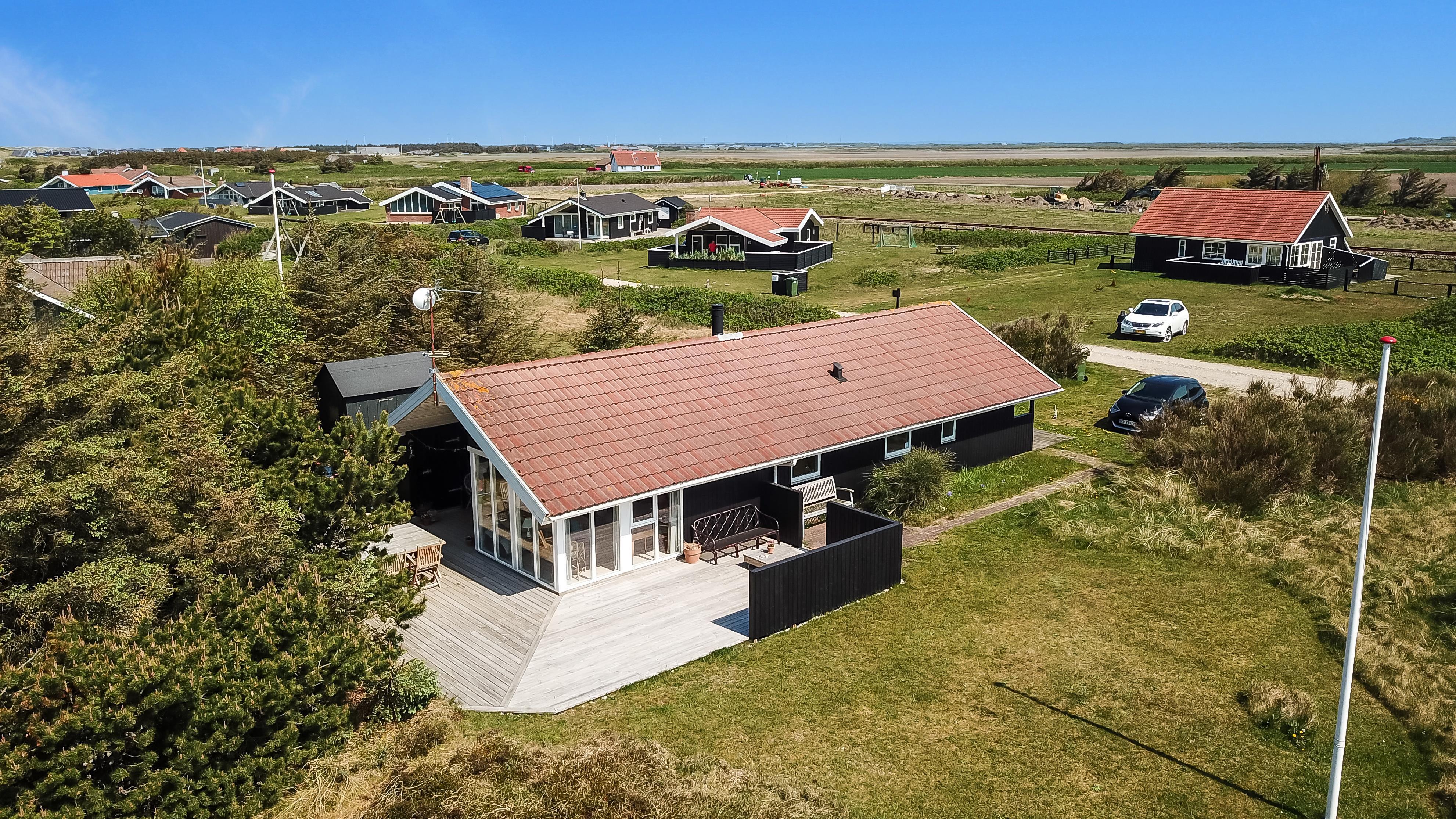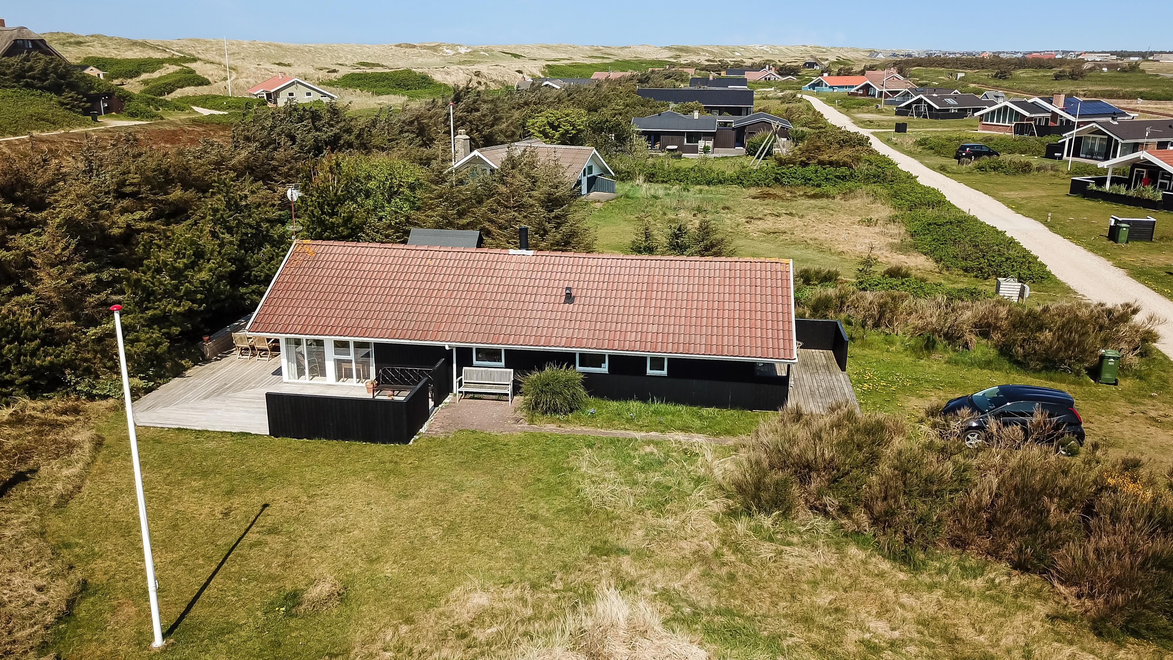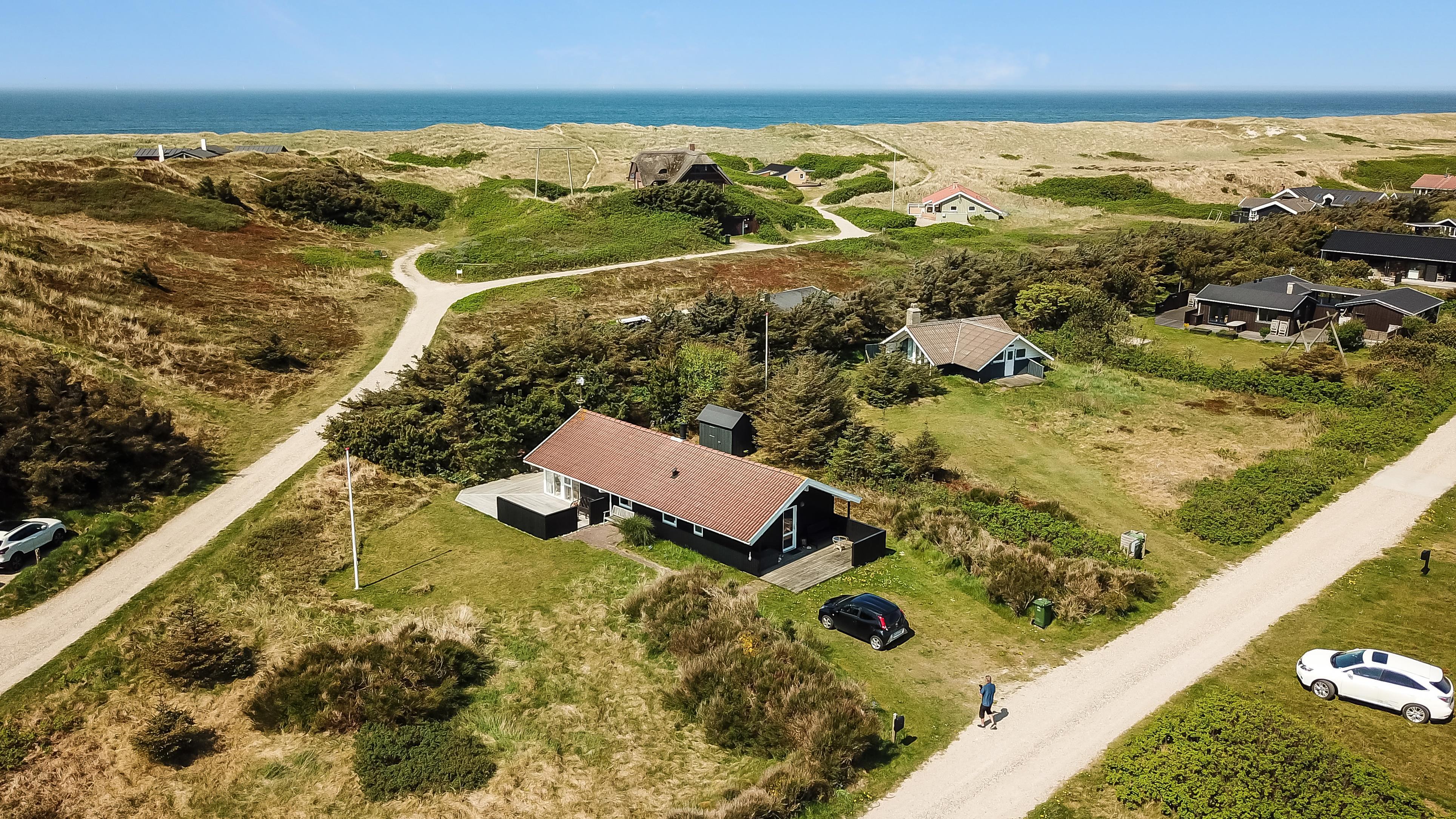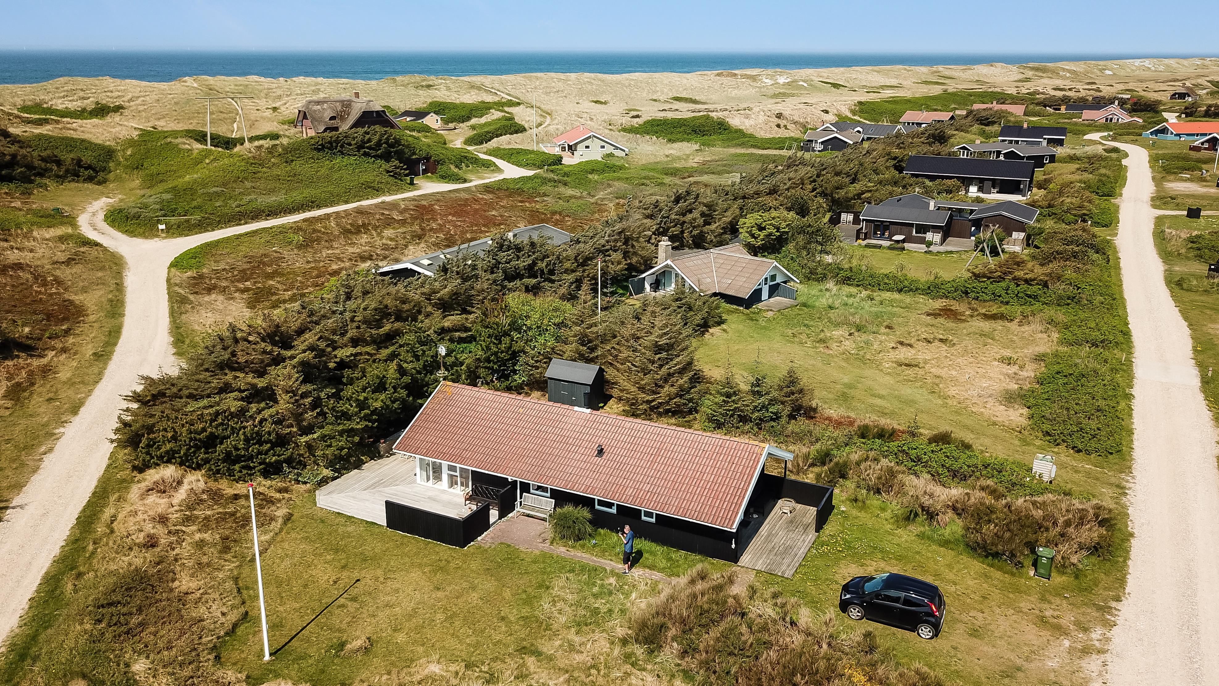 Huset er beliggende på en ca. 2.000 m2 klitgrund. Fra stuen er der udgang til en stor delvis overdækket terrasse med havemøbler, liggestole og grill. Morgenterrasse med havemøbler som er perfekt til at læse dagens avis og nyde morgenens kop kaffe. Der kan altid findes en plads i solen. Et utrolig dejligt hus, hvor der er tænkt på det meste og med masser af muligheder. Lige over klitten ligger Vesterhavet, der altid inviterer til en frisk gå- eller løbetur. Indenfor 25-30 minutter kan flere aktiviteter og shopping muligheder nås. Så hvad enten I er til aktiv ferie eller total afslapning, danner dette dejlige moderniserede feriehus en dejlig ramme både hvad angår hus, beliggenhed og omgivelser.