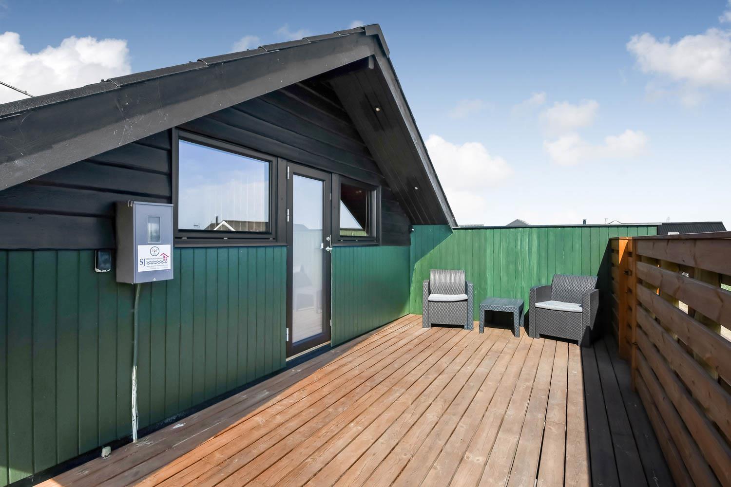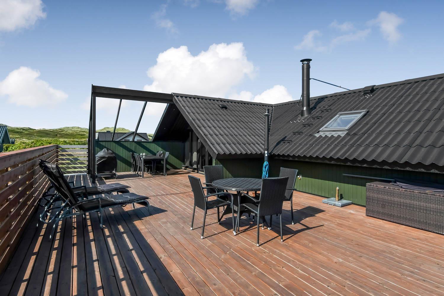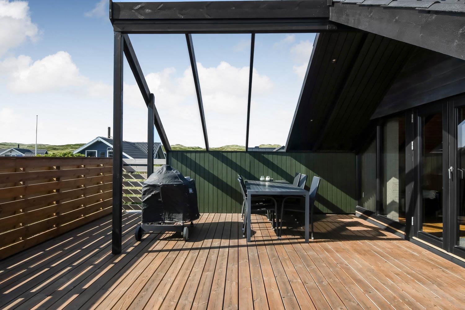 Husets indhegnede terrasse er primært sydvendt og den er delvis overdækket. Terrassen kan tilgås direkte fra stuen. Nyd her både morgen- og aftensolen i havemøblerne eller på en af de 2 solvogne. Grill er naturligvis også standard og børnene kan underholde sig med gyngerne, rutschebanen og sandkassen på grunden umiddelbart lige uden for terrassen. Huset ligger godt i forhold til vandreture, hvor der hverken er langt til Ferring Sø eller Vesterhavet. I sommerhalvåret fra påske til efterårsferie er der kun cirka 600 meter til nærmeste købmand ved Vejlby Torv, hvor der også er en Café som har åbent i sæsonen. I vinterhalvåret må man tage de 6 km til Harboøre, hvor der både er en Aldi og en Brugsen.