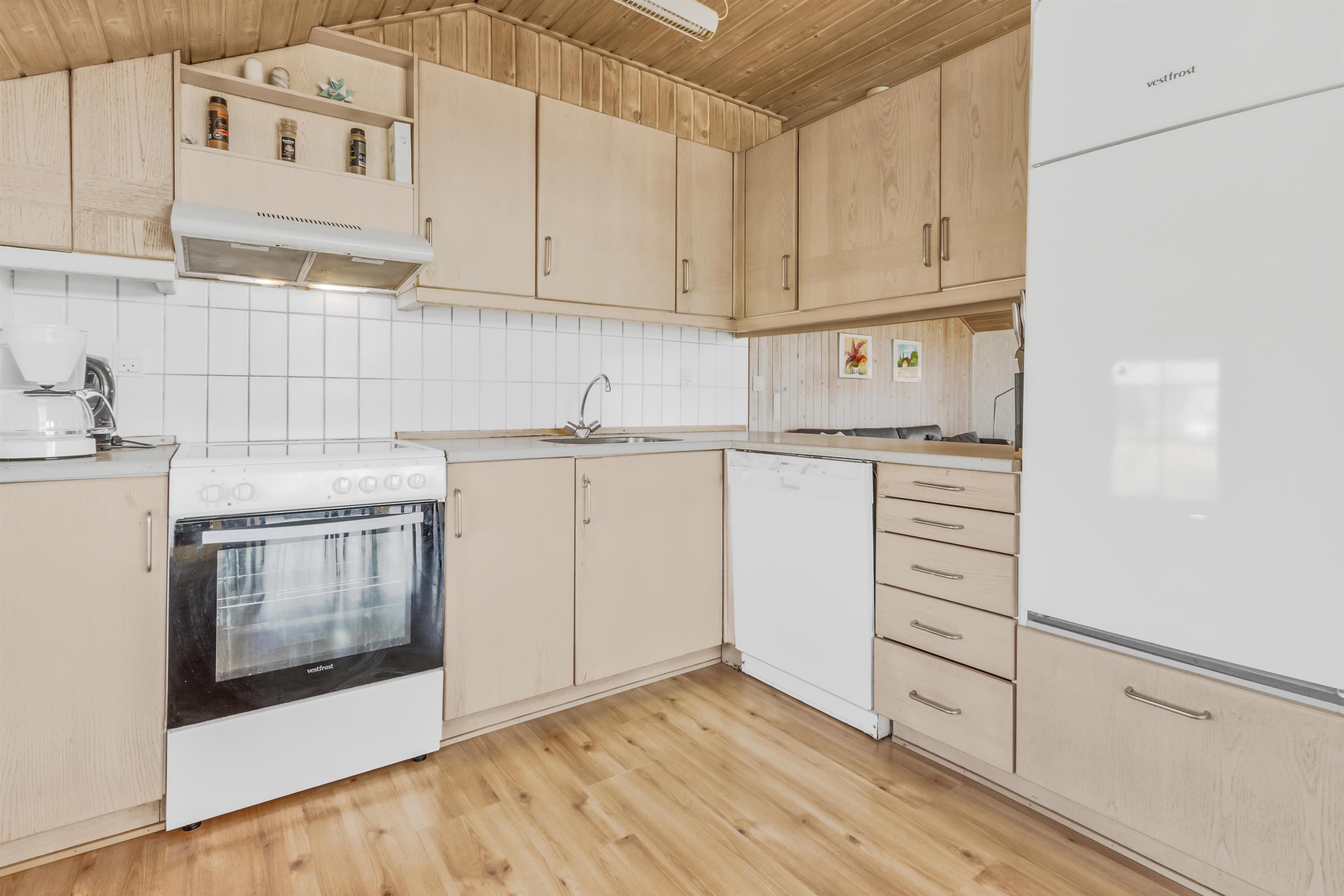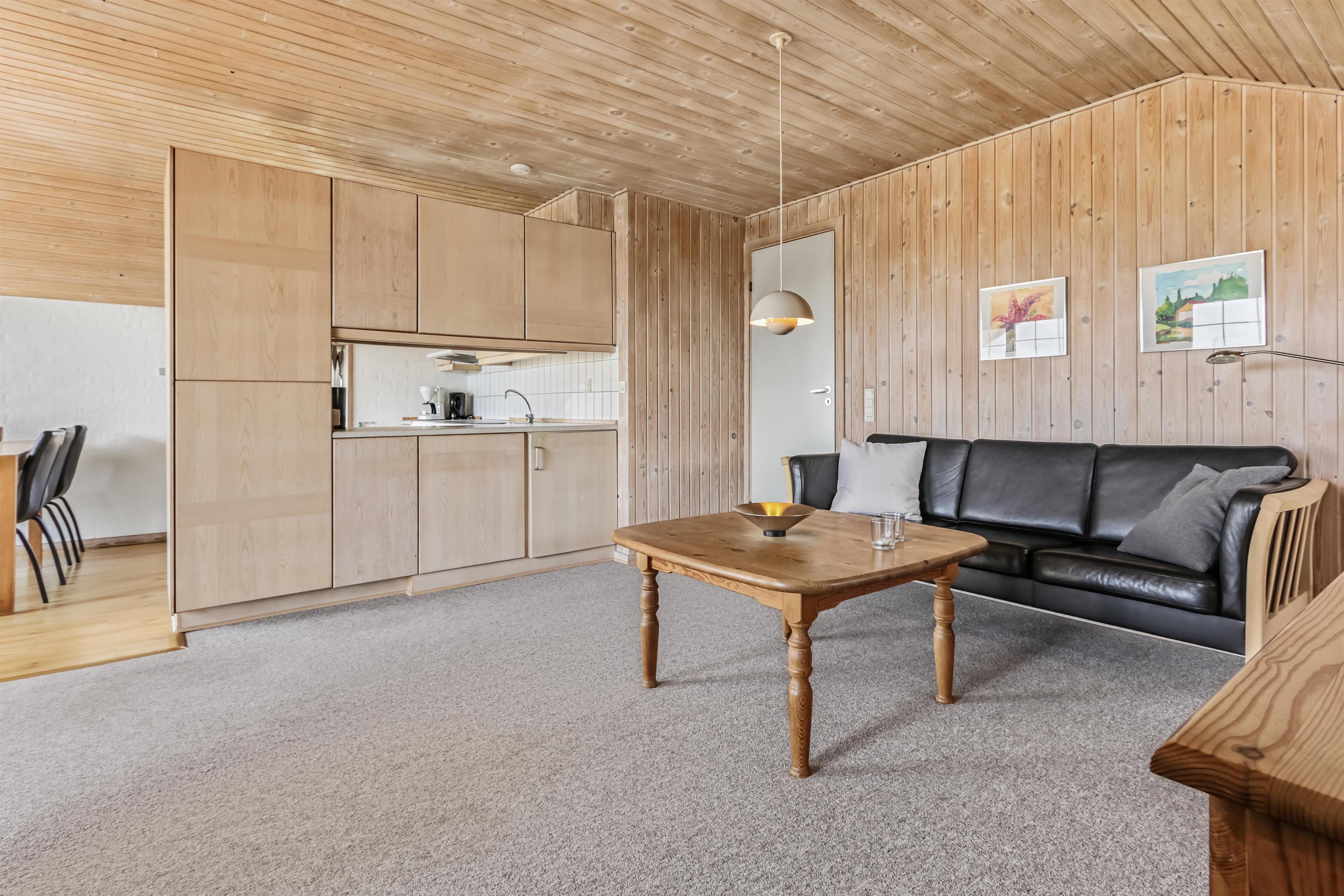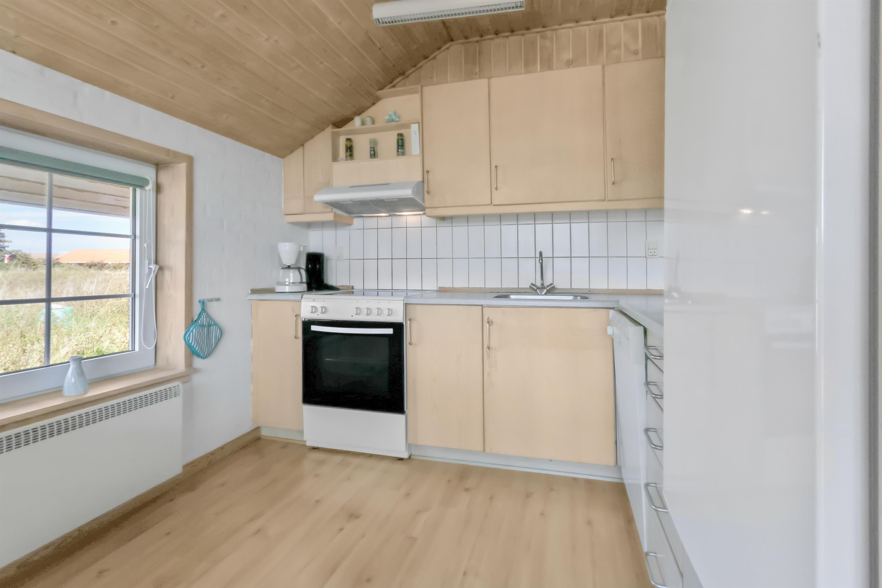 Huset er lyst og venligt indrettet med et stort, åbent køkken-alrum på hele 41 m² kombineret med en hyggelig stue, hvor der er fibernet-TV, så underholdningen er sikret. Køkkenet er godt indrettet og udstyret med elektrisk komfur, køle-/fryseskab, opvaskemaskine og mikroovn. Der er gratis internetadgang og DR1 i huset.