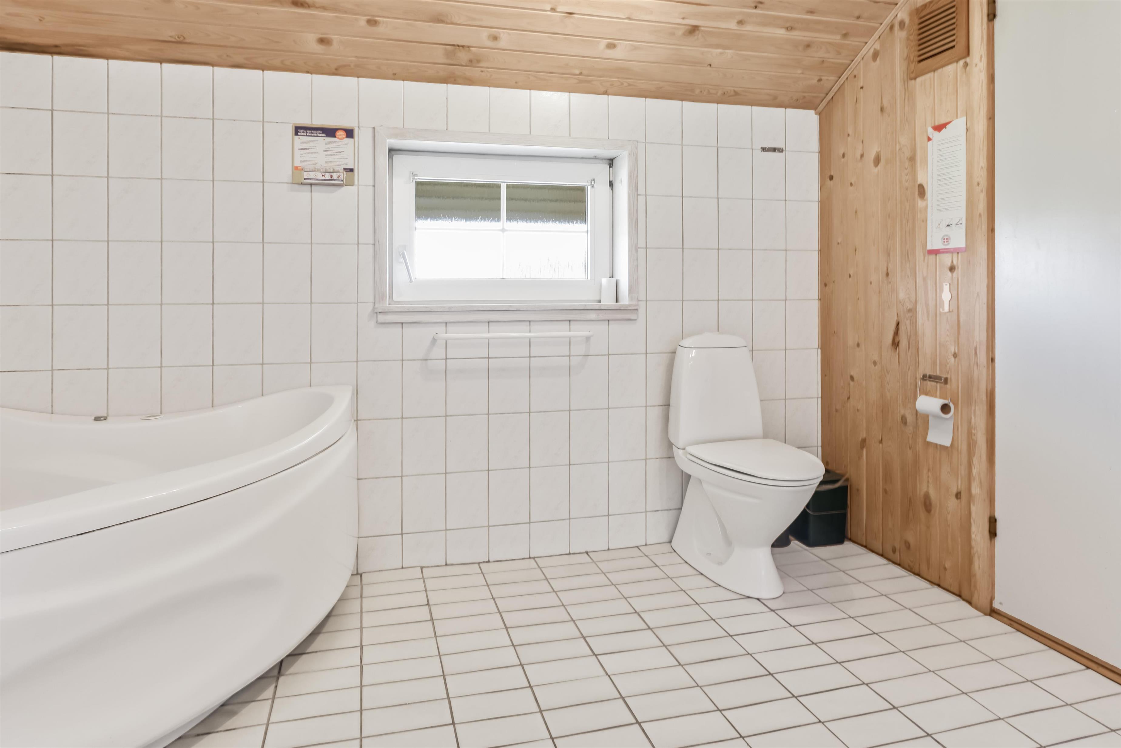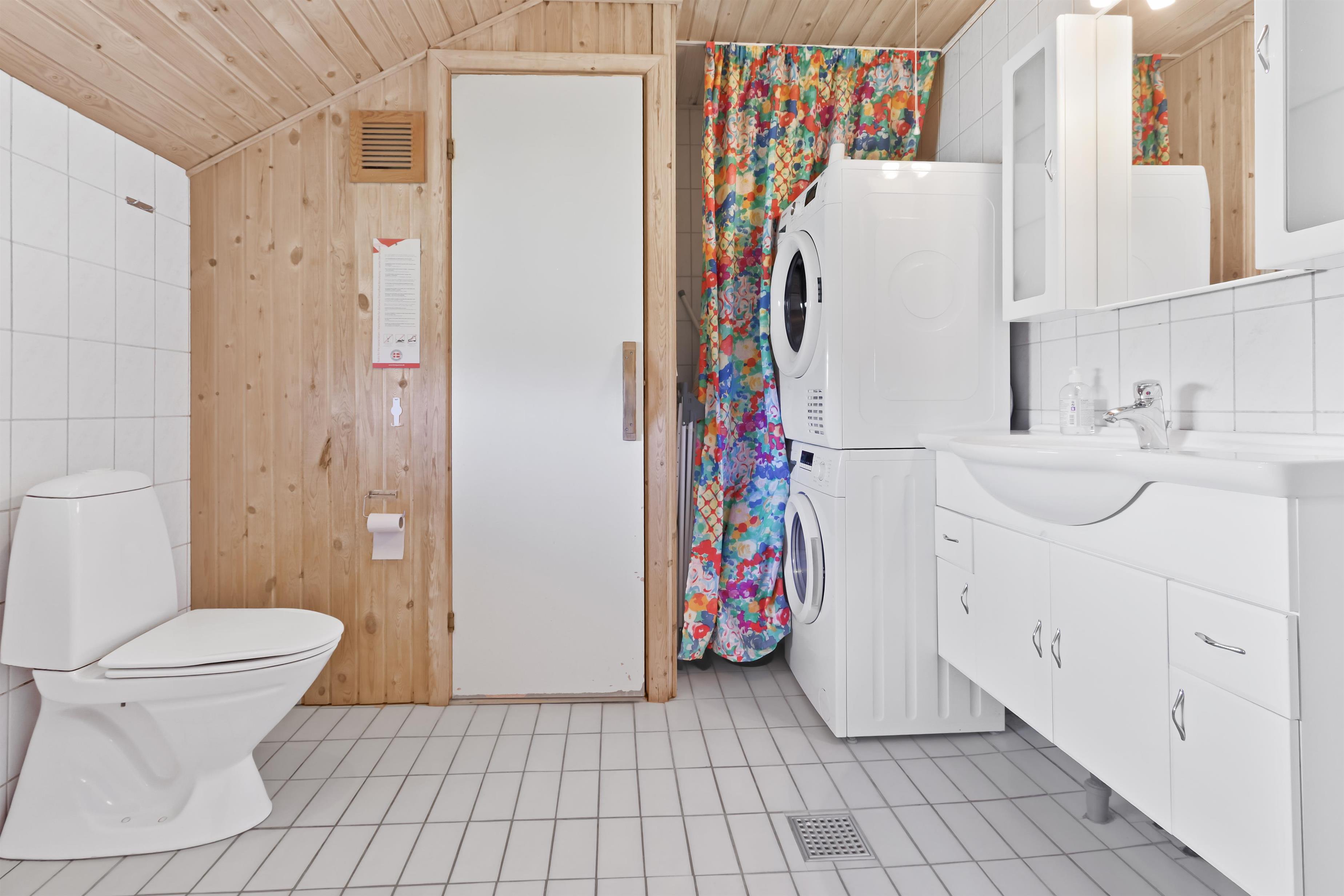 Badeværelset er udstyret med toilet, håndvask, bruser, sauna, spabad samt gulvvarme, hvilket giver behagelig komfort året rundt.
