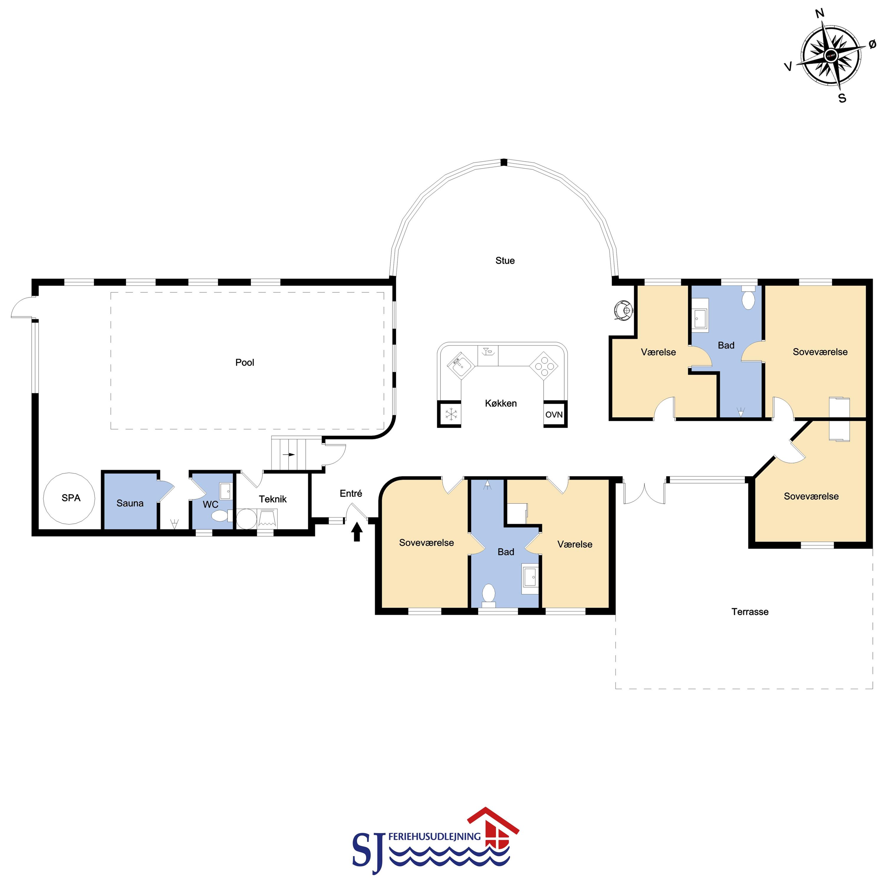 Køkkenet er med keramisk komfur, opvaskemaskine, mikroovn og 50 l fryser. Den store stue, som er i forbindelse med køkkenet, er indrettet med brændeovn, DVD, stereoanlæg med CD samt fladskærms-TV med DR1 samt parabol som modtager tyske kanaler. Gulvene i huset er belagt med klinker, dog er der tæpper i soverummene. I den store poolafdeling er husets store swimmingpool (8,0 x 4,0 x 1,45 m), 3 pers spa og badeværelse med gulvvarme og bruser. Herfra er der adgang til husets sauna. Fra køkkenet og stuen har man en flot udsigt ud over poolrummet. Huset indeholder endvidere to separate soveafdelinger med tilhørende badeværelser. I badeværelserne er der bruser. Obligatorisk slutrengøring. Huset har 5 soverum: 1DS + 1DS +2S +1DS +2K. Huset opvarmes med olie. Separat rum med vaskemaskine og tørretumbler. Desuden er der barnestol. Bemærk: Max et husdyr er tilladt. Et dejligt feriehus som på alle årstider vil kunne danne rammen om en vellykket ferie. Depositum vintersæson kr. 4500 og sommersæson kr. 2200.