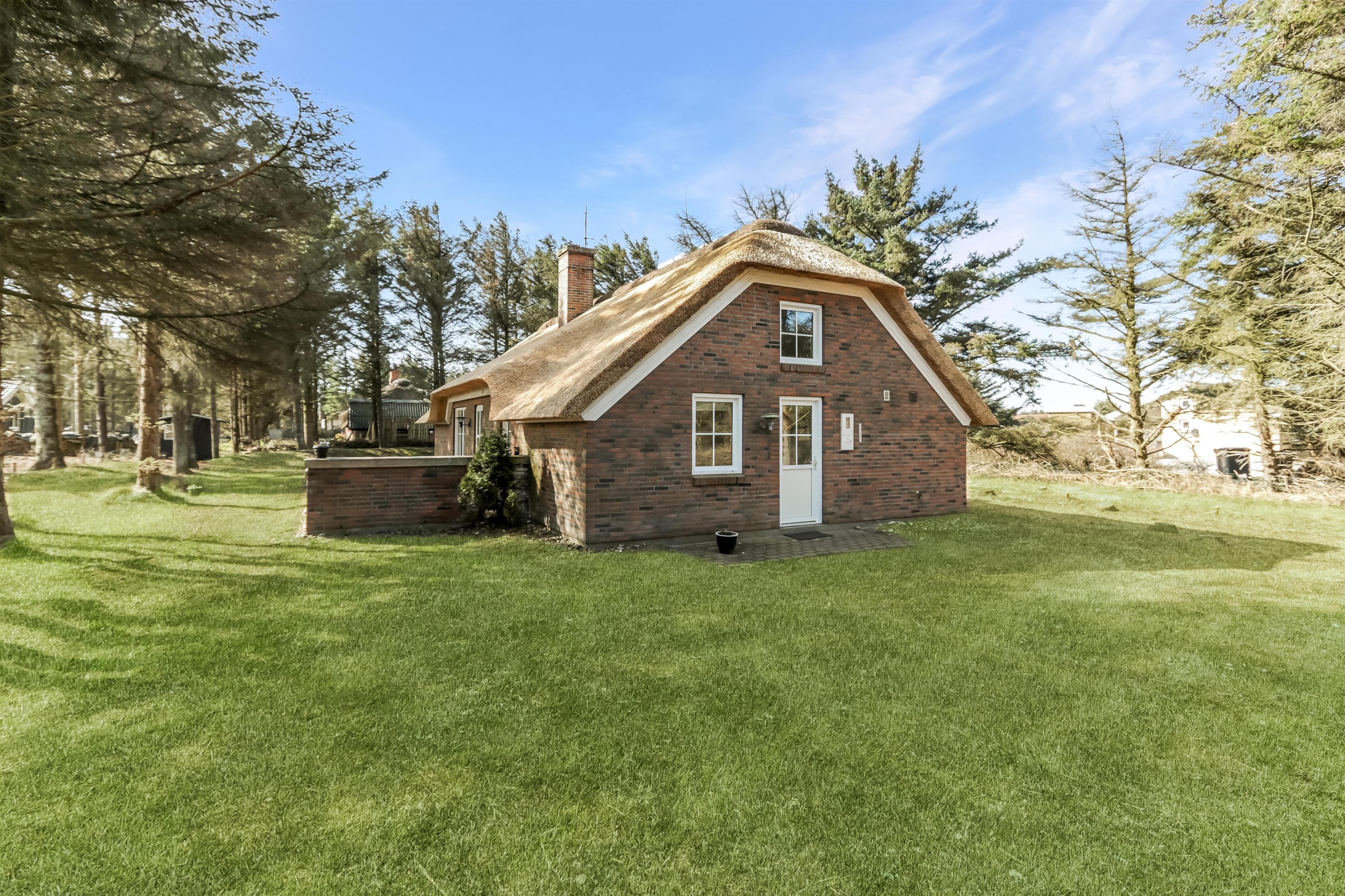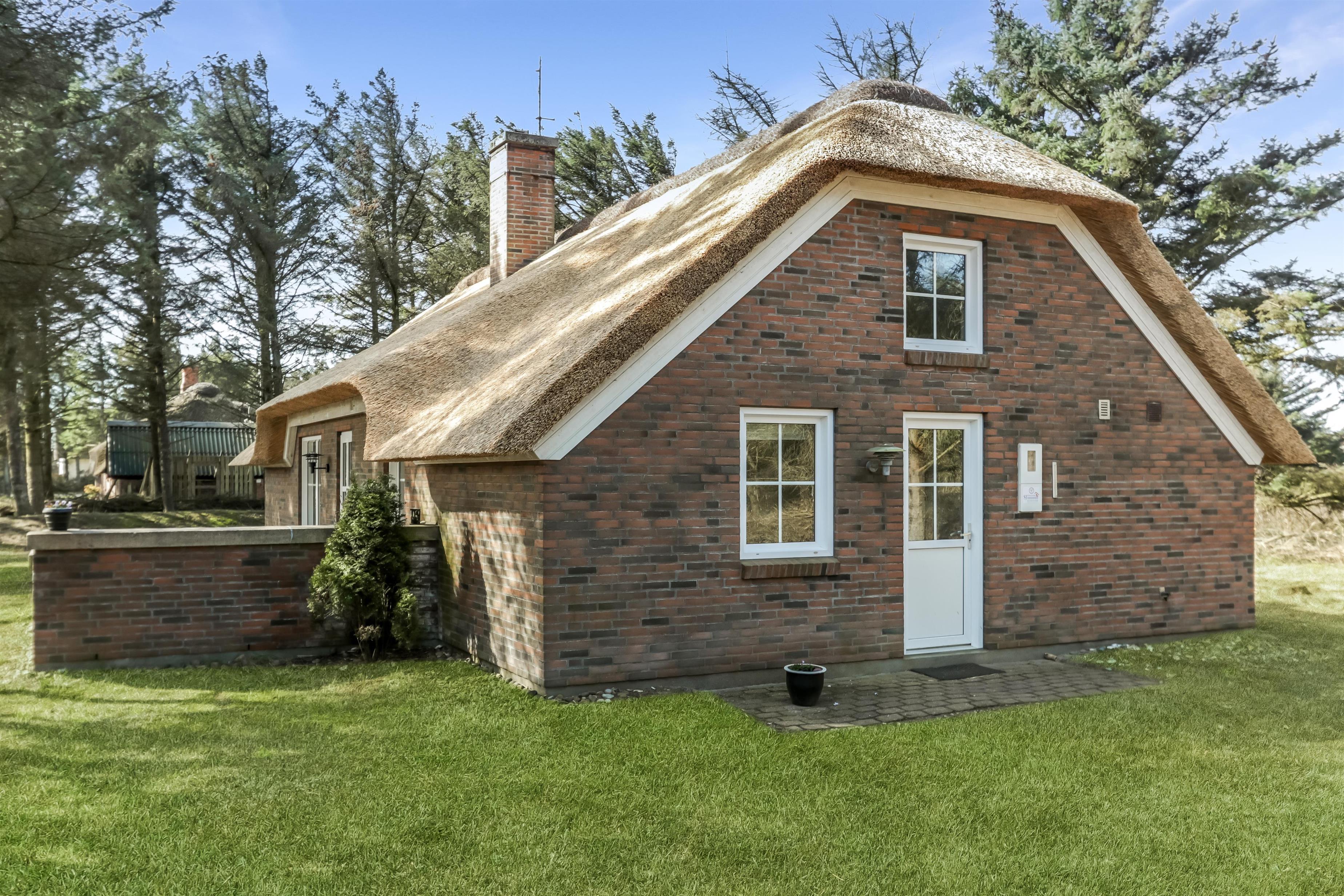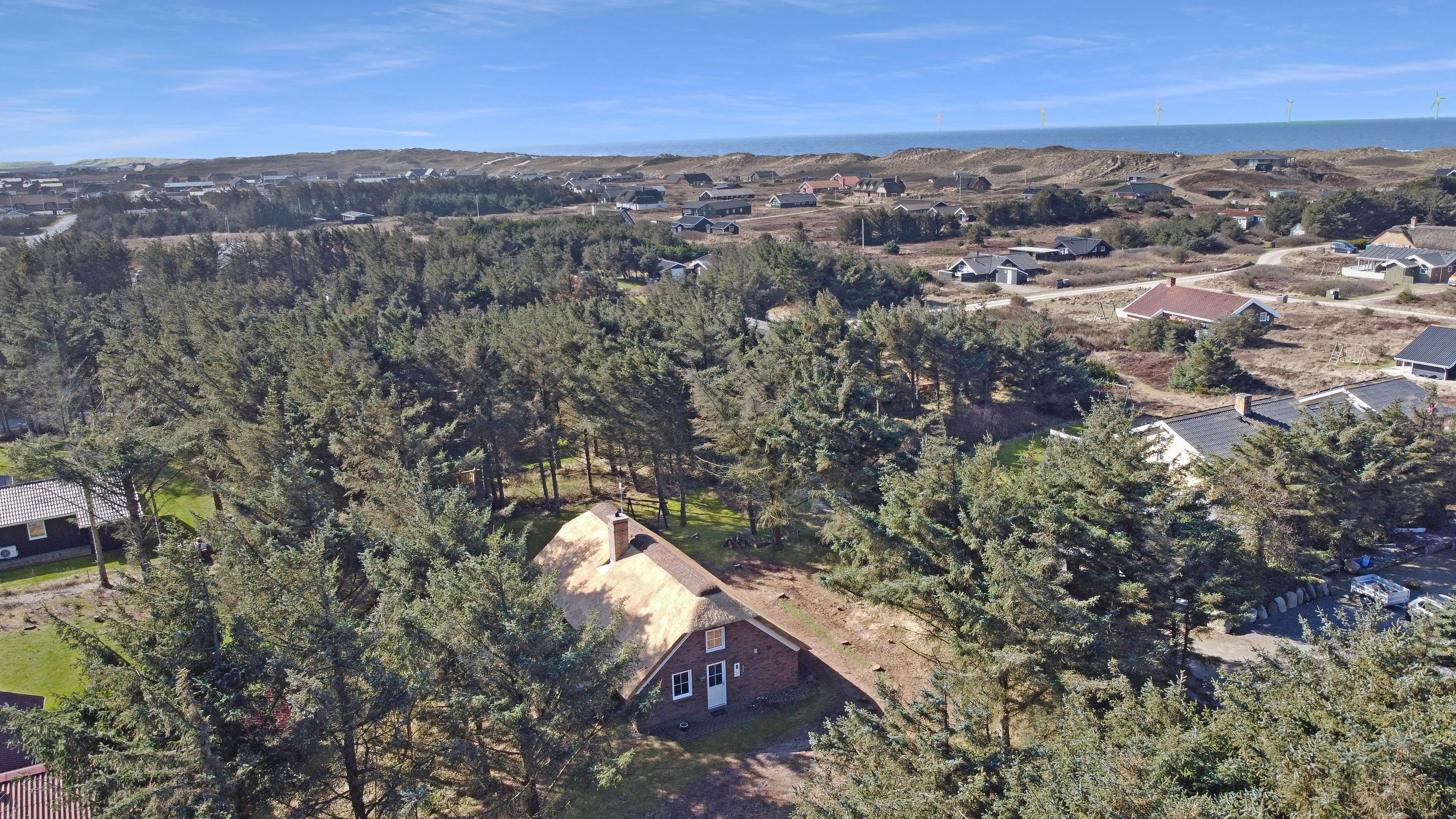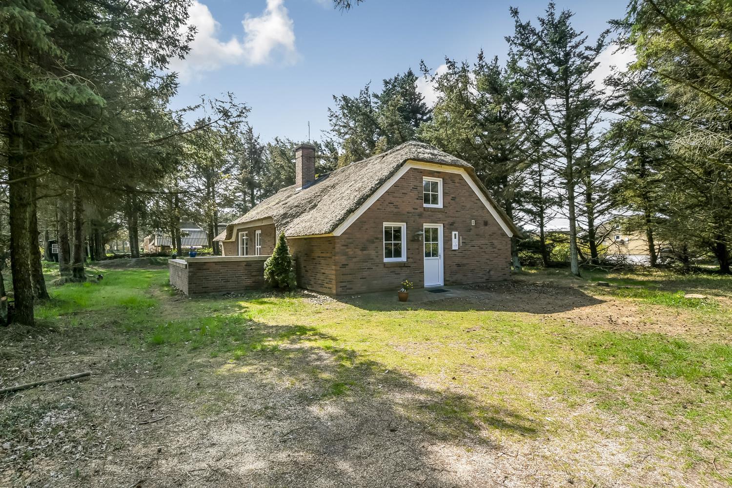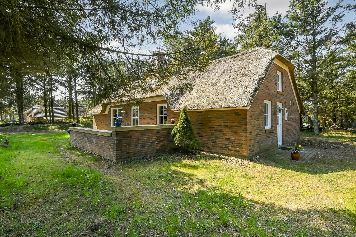 Flot stråtækt feriehus, beliggende i lille skov kun 250 fra Vesterhavet. Gratis internetadgang.