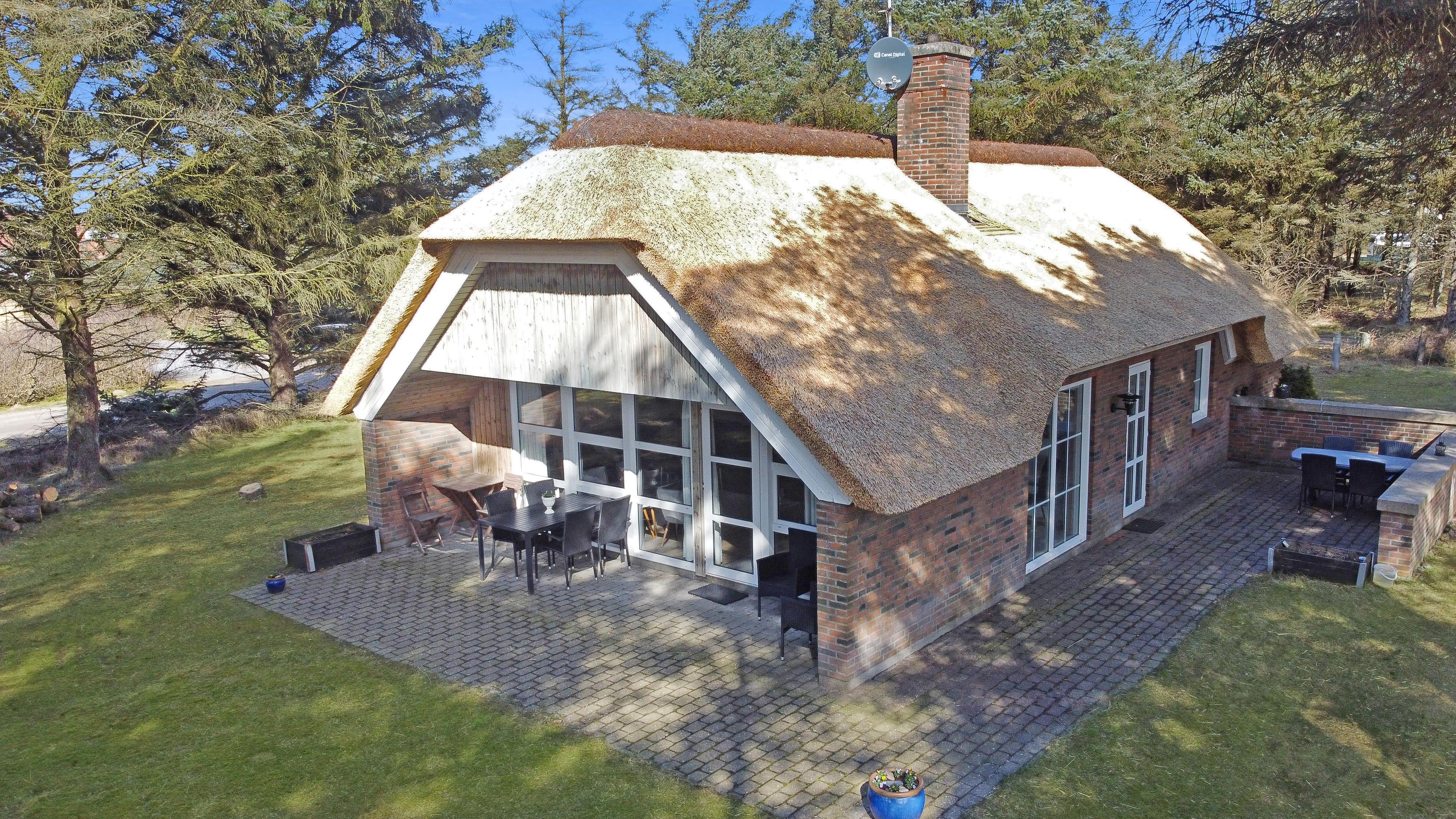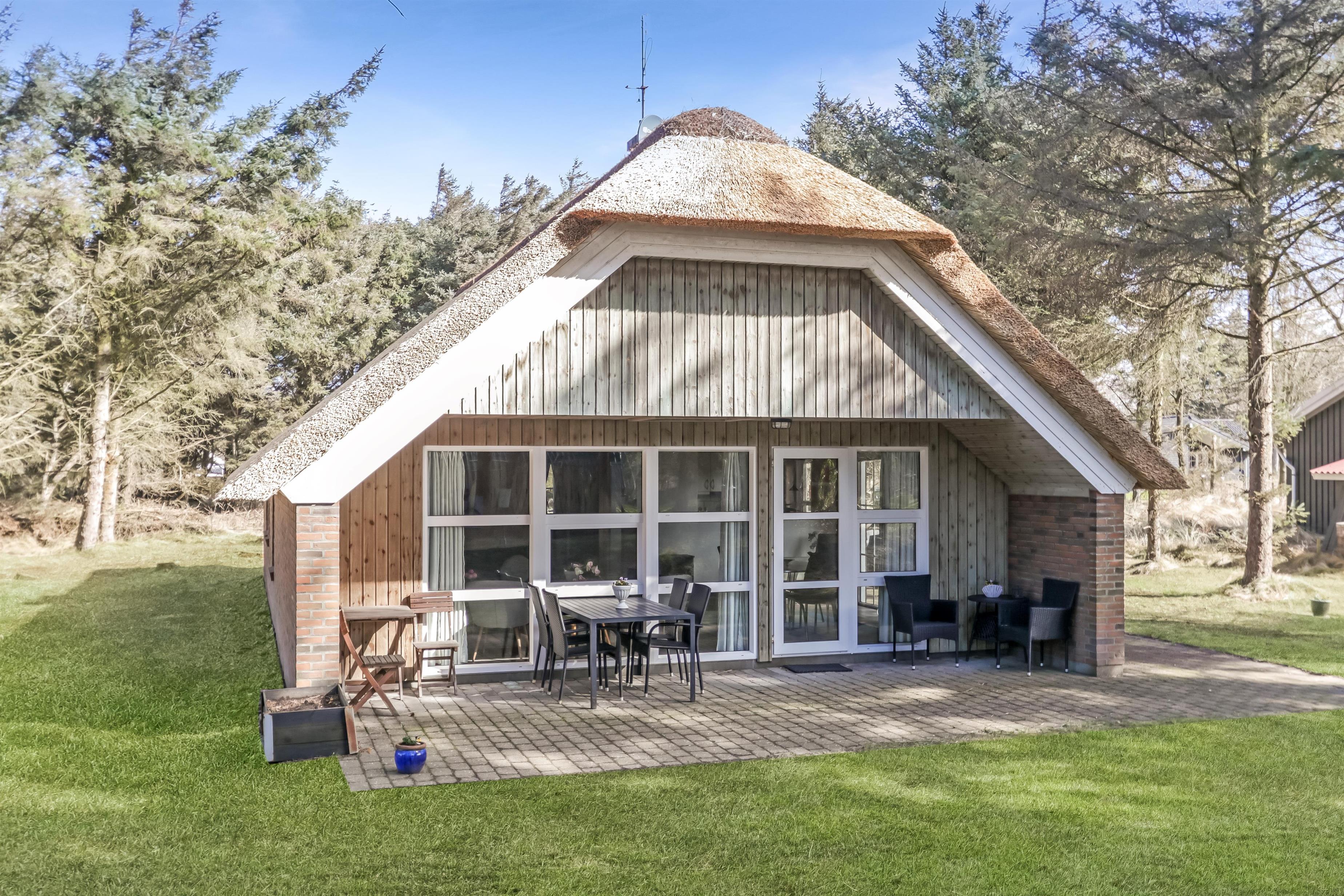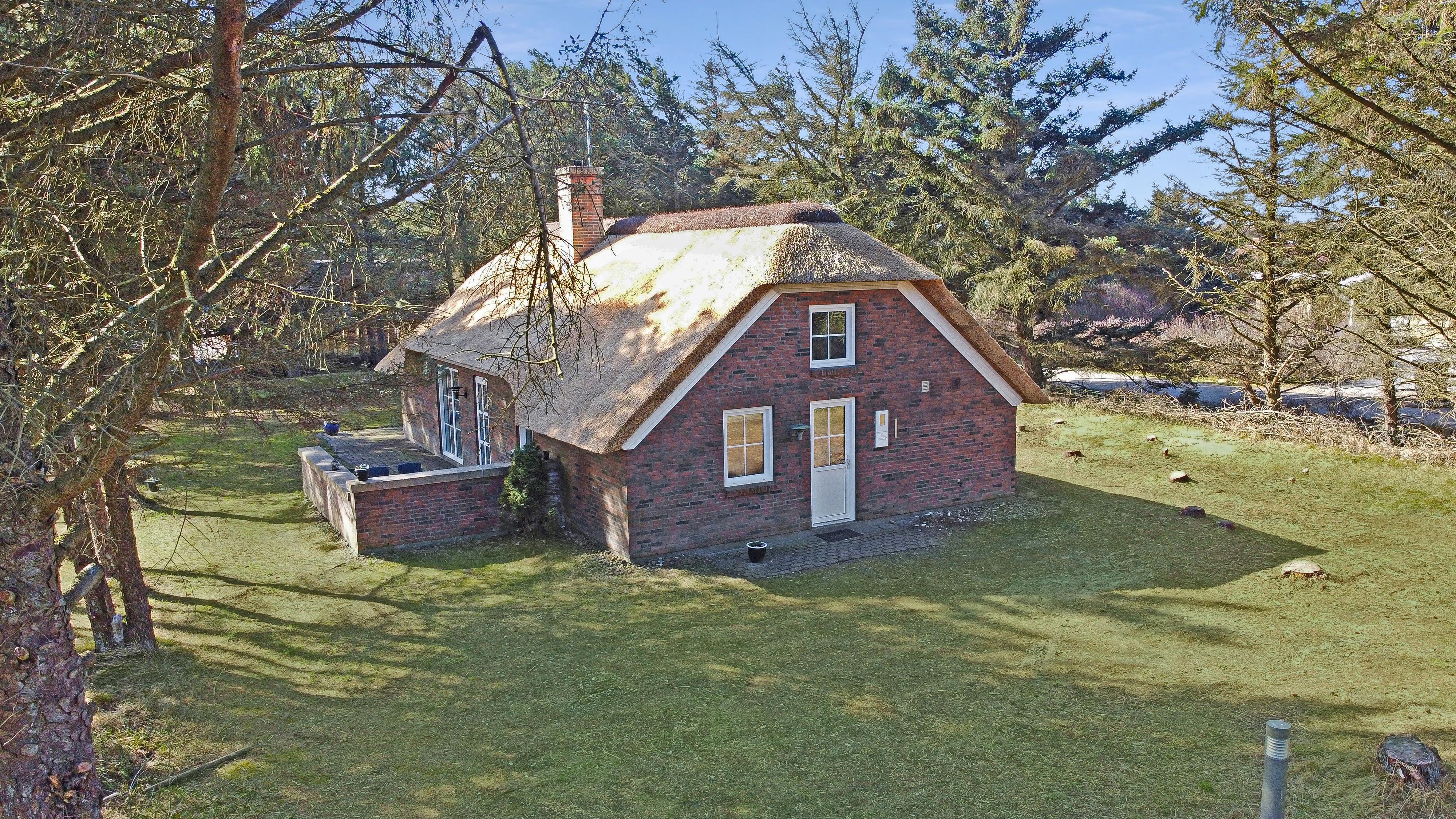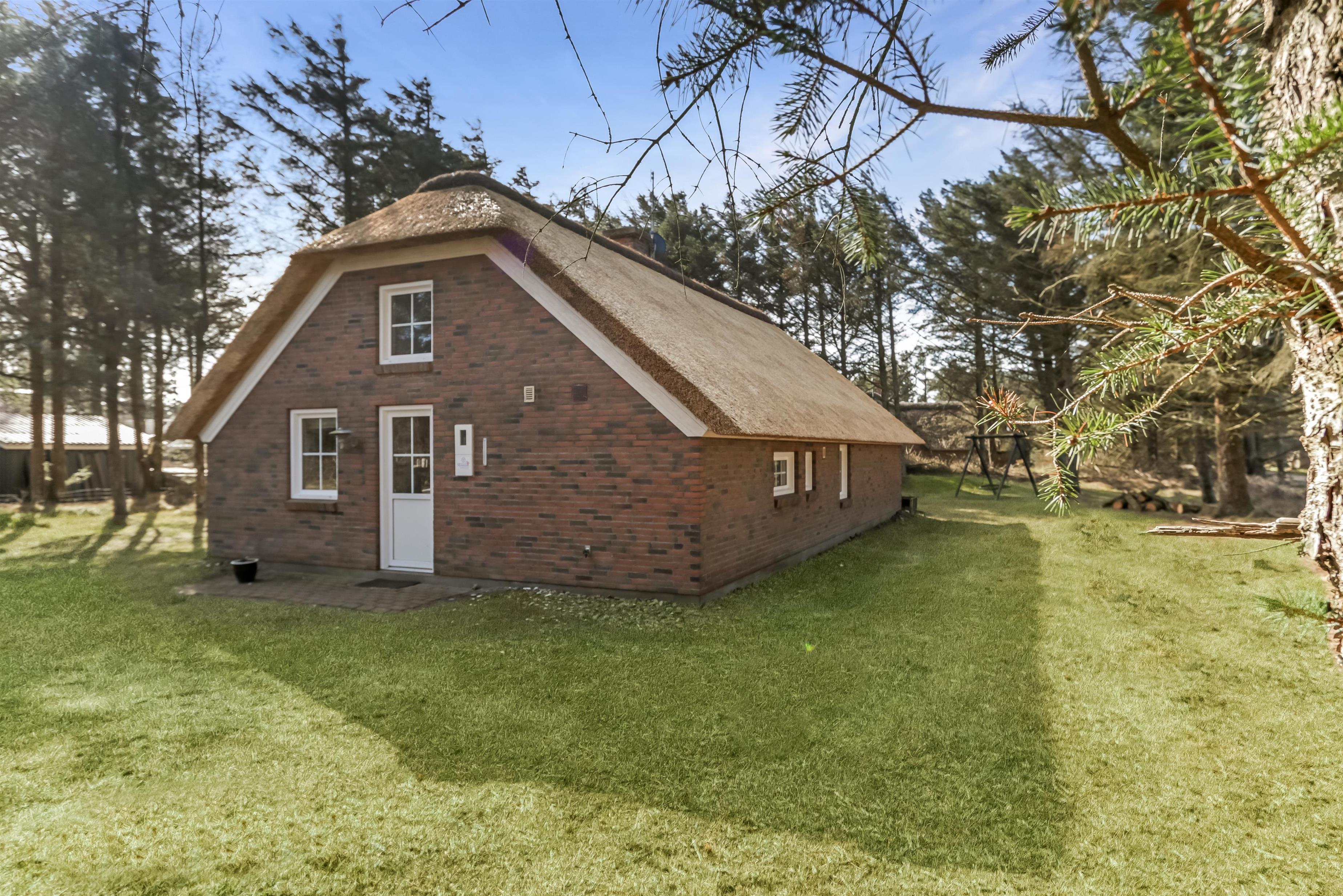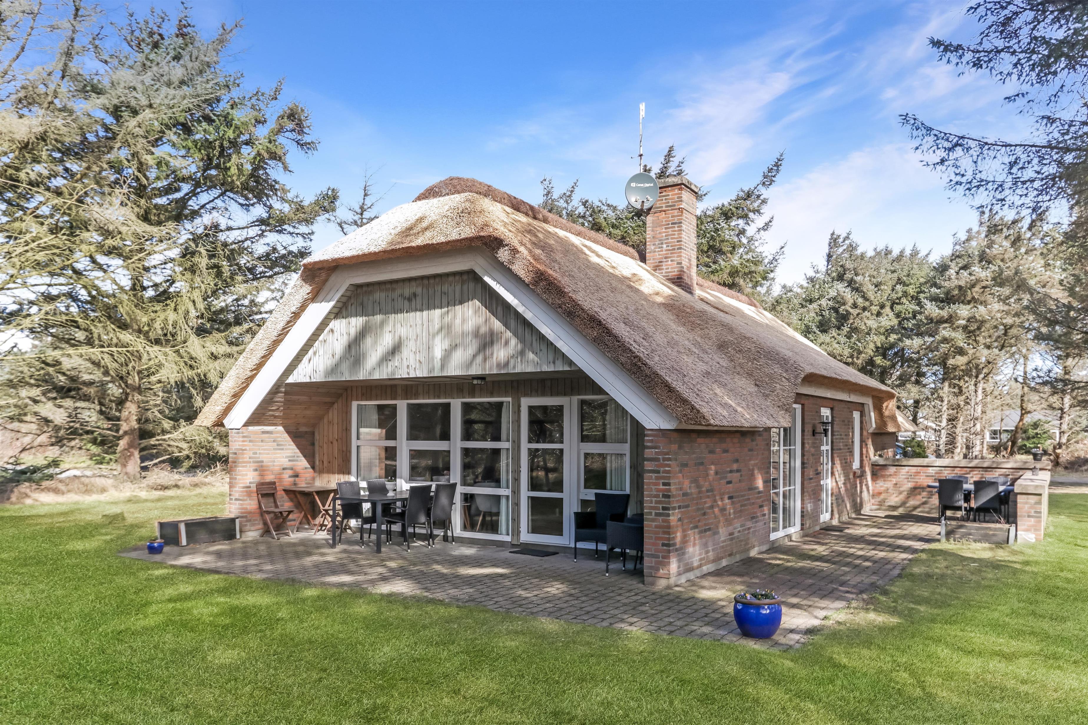 Flot stråtækt feriehus, beliggende i lille skov kun 250 fra Vesterhavet. Gratis internetadgang.