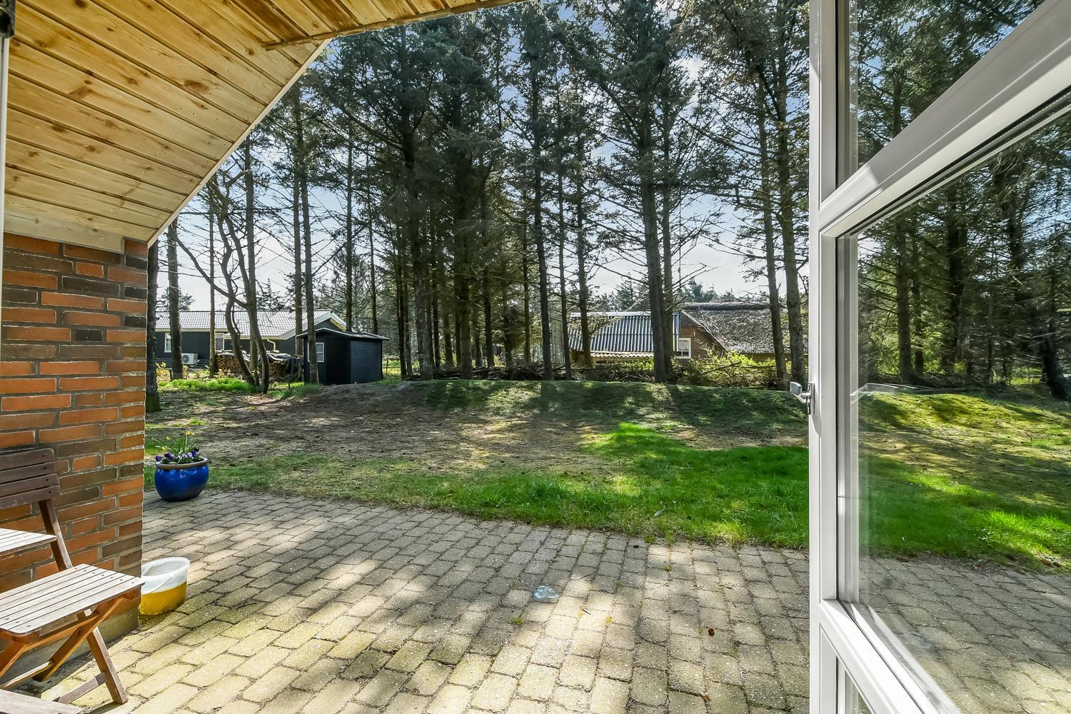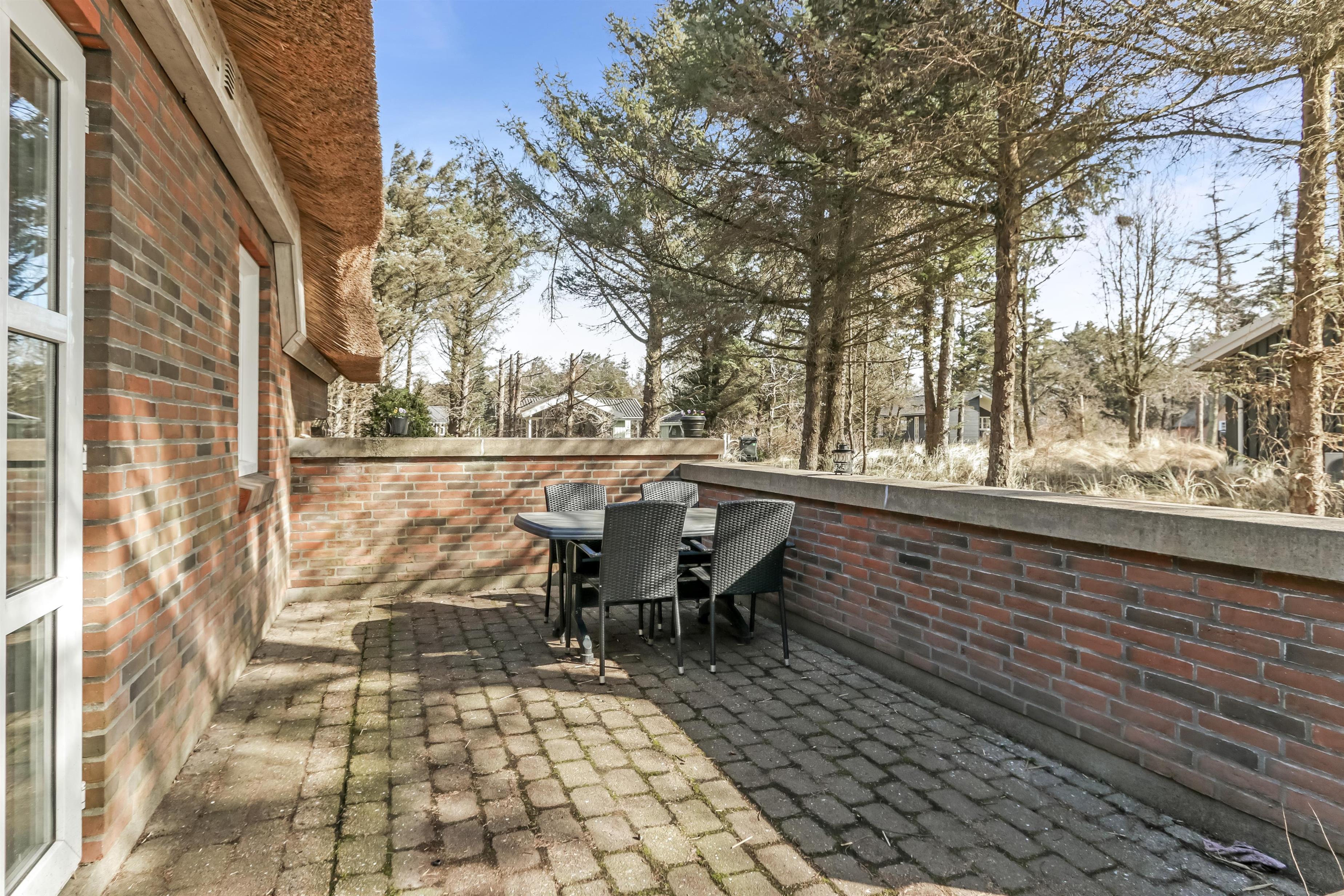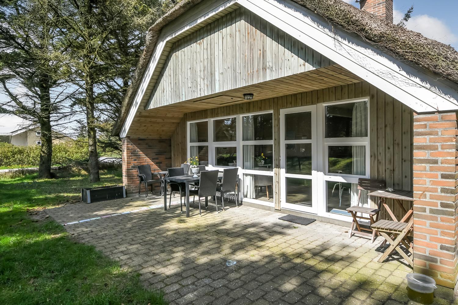 Fra køkkenet er der udgang til en åben terrasse med en halvmur her er der havemøbler og parasol. Fra stuen er der udgang til en delvis overdækket terrasse med havemøbler, grill. Huset beliggenhed er i gåafstand fra stranden. Den sæsonåbnede købmand i Vejlby Klit ligger blot 500 m fra huset og John Wayne cafeen ligger også 500 m fra huset, så man kan nemt hente rundstykker mv. til fods. På grunden er der en gynge til husets mindste gæster. Hele området omkring Vejlby Klit er meget velegnet til vandre- eller cykelture, og et besøg på stranden ved Vesterhavet er hver dag en ny oplevelse. Der er mange muligheder for at lave flere forskellige aktiviteter på stranden, f.eks. bade, lystfiskeri, bygge sandslotte eller bare sidde og dase og nyde solen eller blæsten. Dette skønne hus er velegnet både til et par eller den lille familie som gerne vil bo i et meget attraktivt feriehusområde tæt ved Vesterhavet.