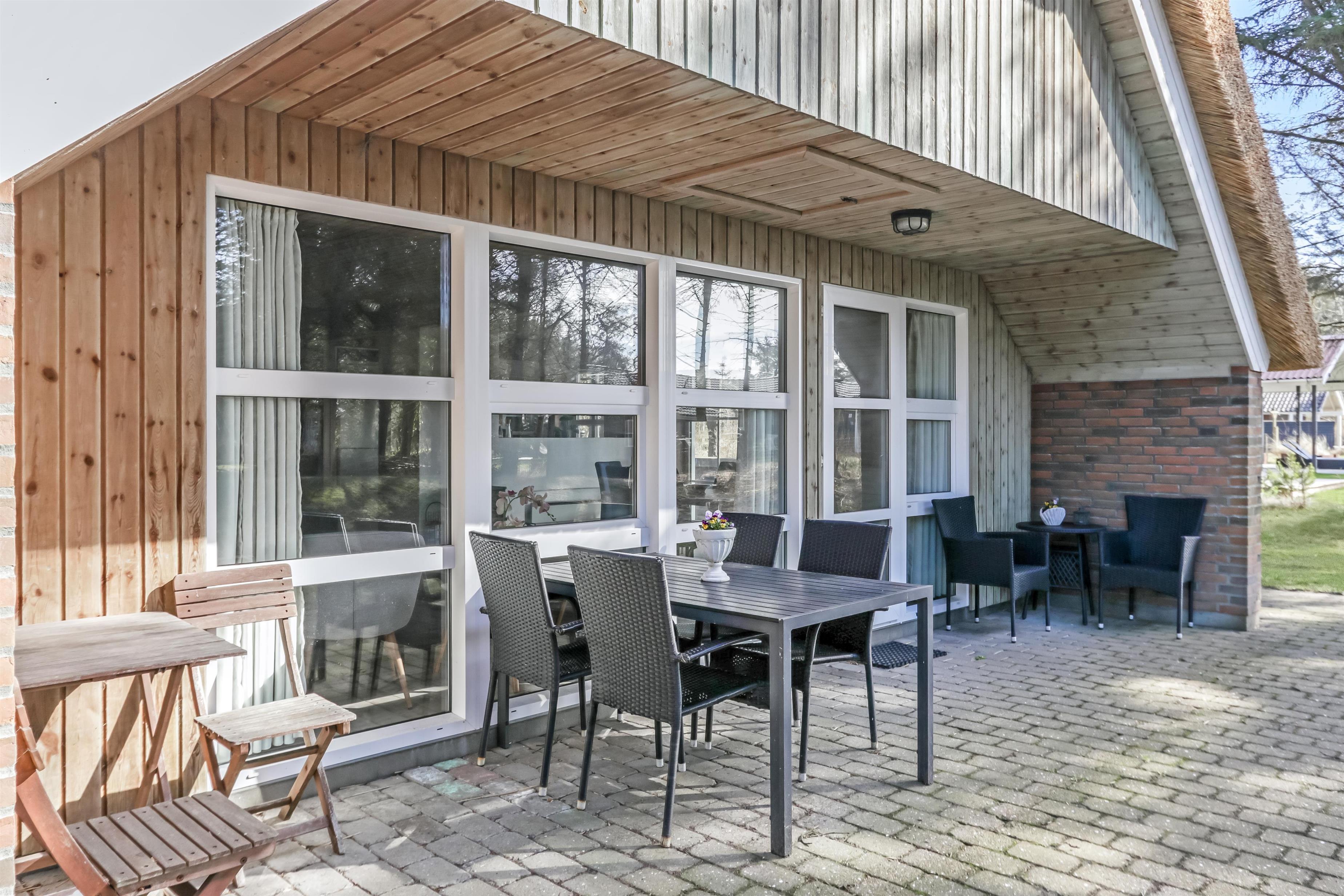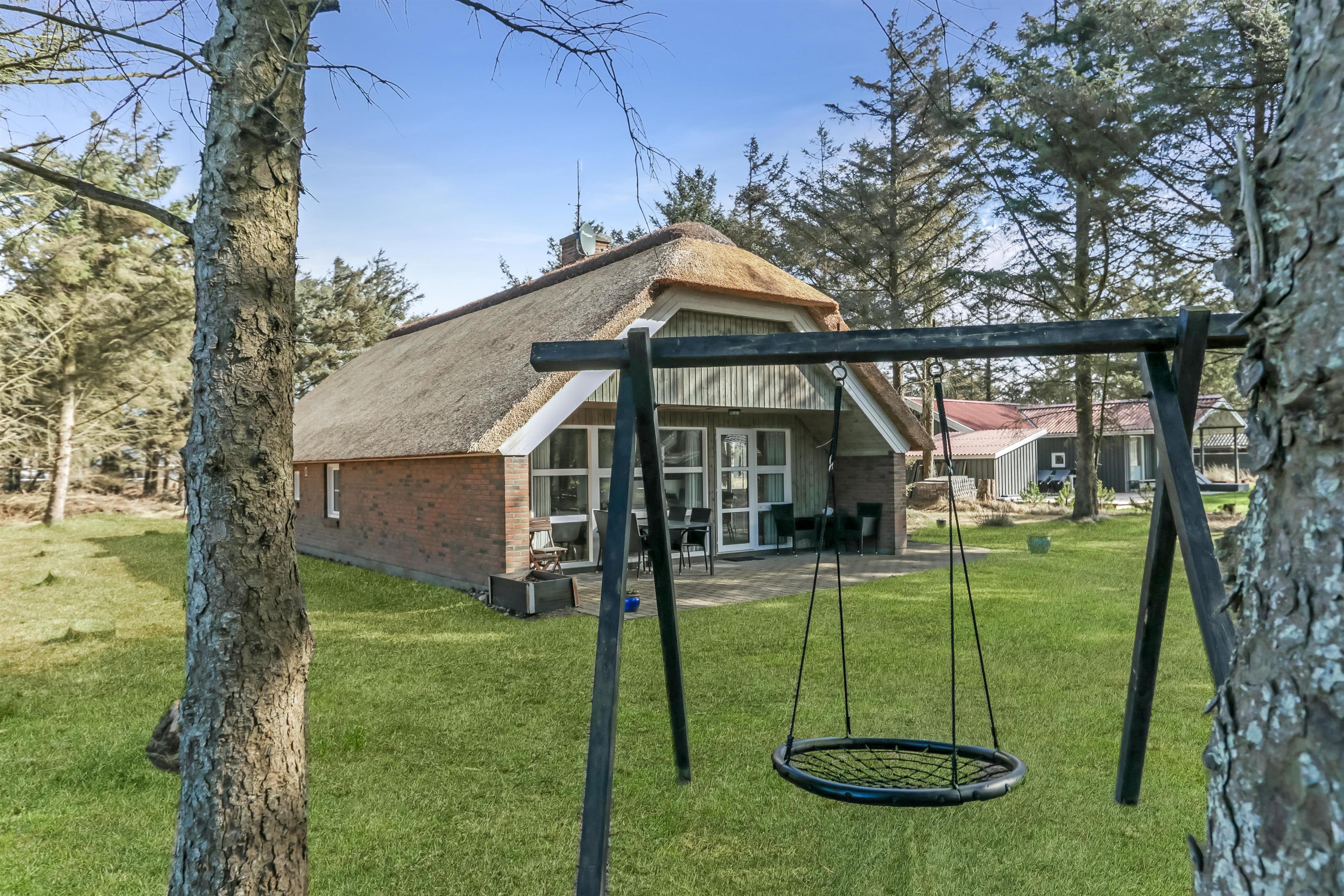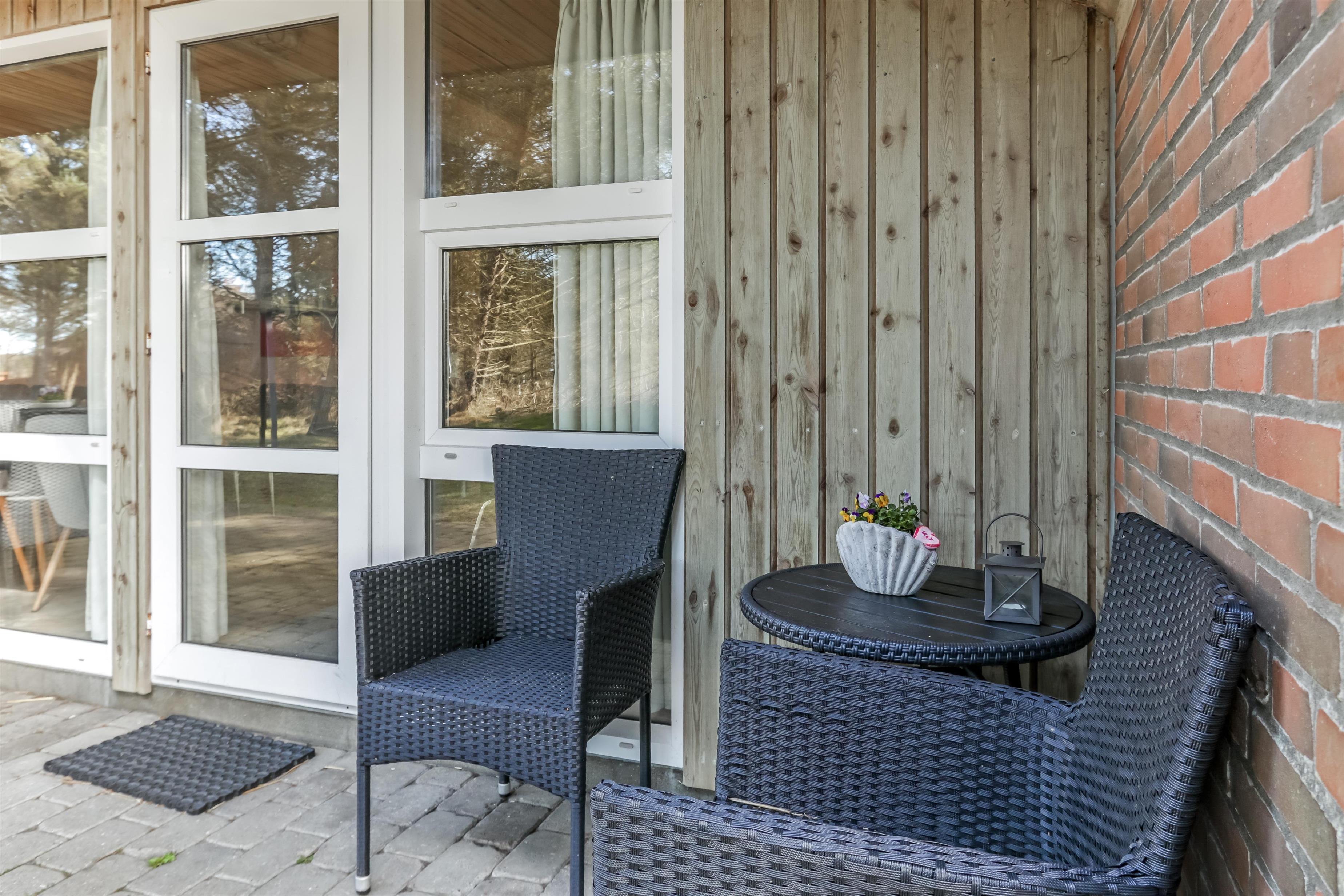 Fra køkkenet er der udgang til en åben terrasse med en halvmur her er der havemøbler og parasol. Fra stuen er der udgang til en delvis overdækket terrasse med havemøbler, grill. Huset beliggenhed er i gåafstand fra stranden. Den sæsonåbnede købmand i Vejlby Klit ligger blot 500 m fra huset og John Wayne cafeen ligger også 500 m fra huset, så man kan nemt hente rundstykker mv. til fods. På grunden er der en gynge til husets mindste gæster. Hele området omkring Vejlby Klit er meget velegnet til vandre- eller cykelture, og et besøg på stranden ved Vesterhavet er hver dag en ny oplevelse. Der er mange muligheder for at lave flere forskellige aktiviteter på stranden, f.eks. bade, lystfiskeri, bygge sandslotte eller bare sidde og dase og nyde solen eller blæsten. Dette skønne hus er velegnet både til et par eller den lille familie som gerne vil bo i et meget attraktivt feriehusområde tæt ved Vesterhavet.