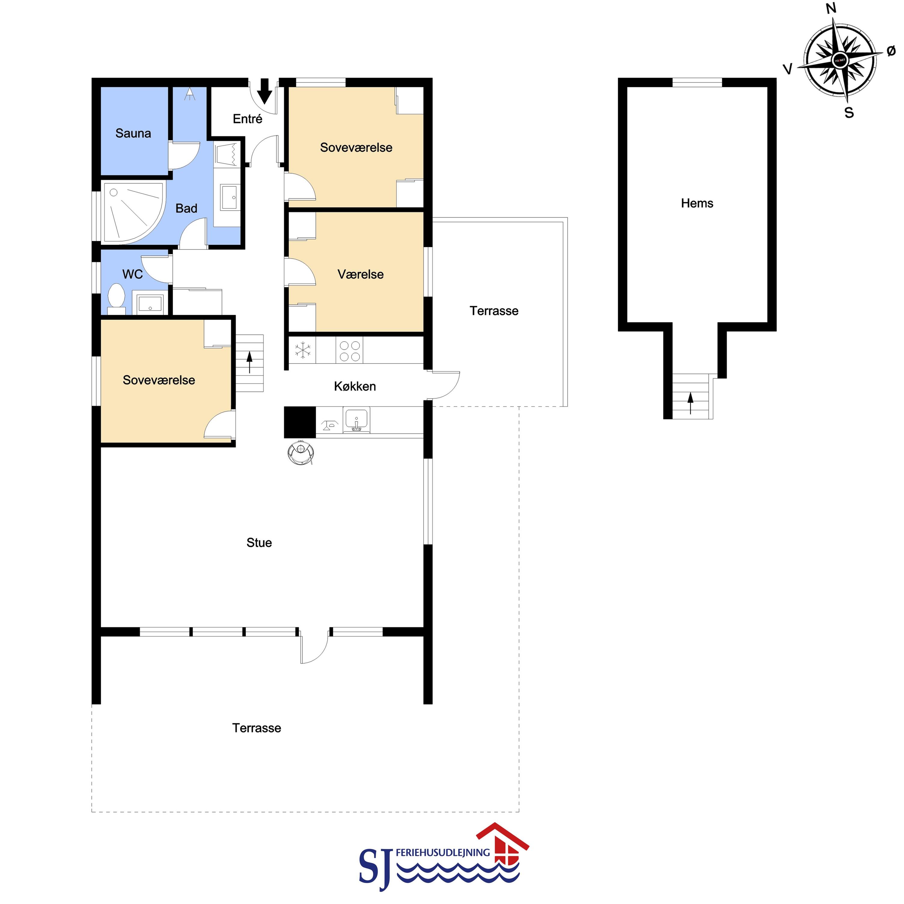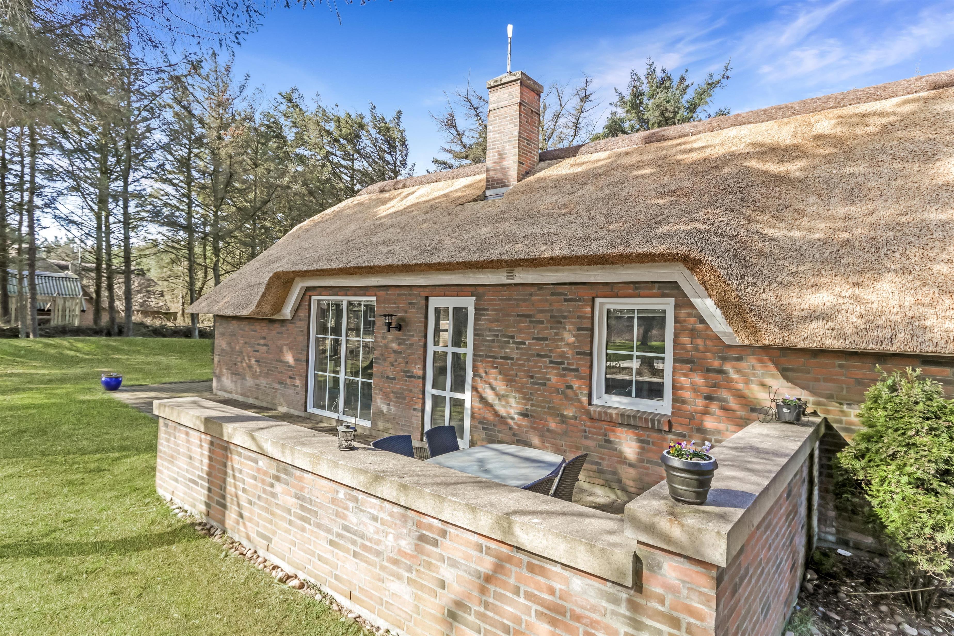 Virkelig flot og hyggeligt indrettet feriehus til 8 personer i sten med stråtag. Huset er beliggende i en lille skov i gåafstand til havet. Indgangen er også en fordeler gang til soveværelser og badeværelser. Fra gangen kommer man ind i det åbne køkken som er kombineret med stuen. Køkkenet er godt udstyret og indeholder elkomfur med glaskeramiske plader, køleskab med frostboks, mikroovn, airfryer og opvaskemaskine. Fra køkkenet er der udgang til terrasse. Stuen er er godt møbleret med lækker hjørnesofa, spisebord og TV med danske og tyske programmer, der er ligeledes fra stuen udgang til terrassen, der er desuden CD og Radio. Dejlig brændeovn som giver en behagelig varme også i de kolde perioder. Huset råder over 3 soverum: 1DS + 1DS + 2S. Desuden er der i gangen en stejl trappe op til hemsen hvor der er 2 sove muligheder. 2 Badeværelser som begge er med gulvvarme. Det ene er med toilet og håndvask og det store badeværelse er med bruser, spa og adgang til sauna, her er desuden også en vaskemaskine. Der er trægulve i alle opholdsrum og klinker på badeværelserne. 2 husdyr er tilladt. Rygning er ikke tilladt.
