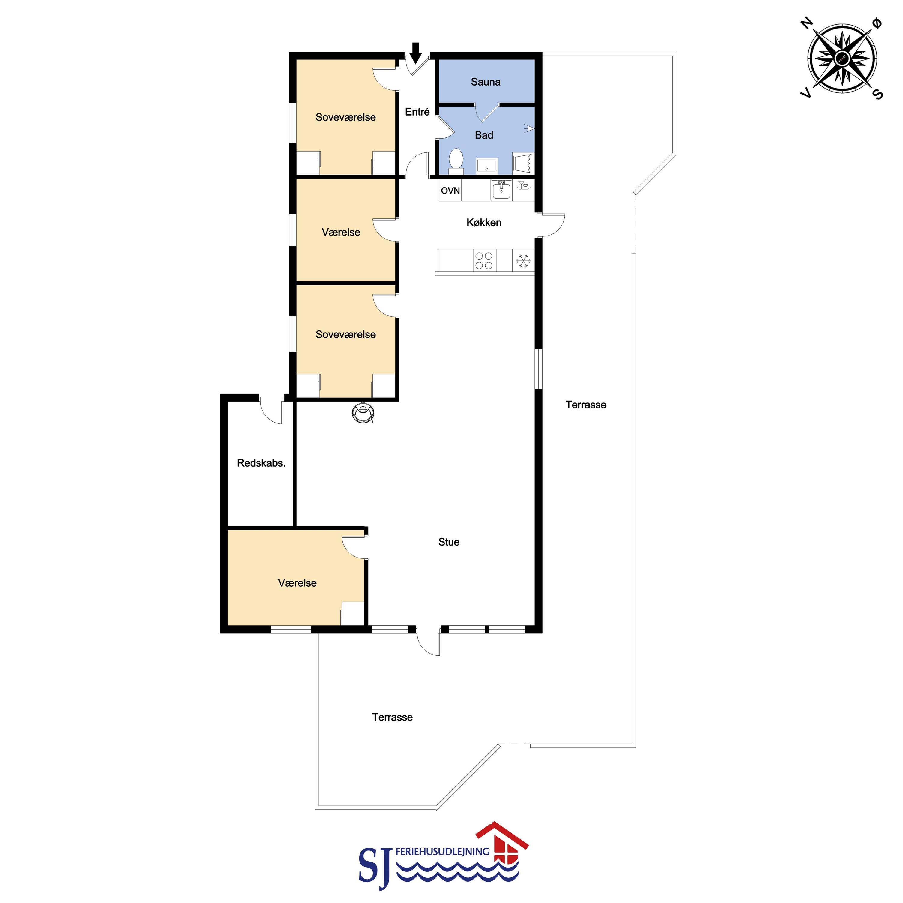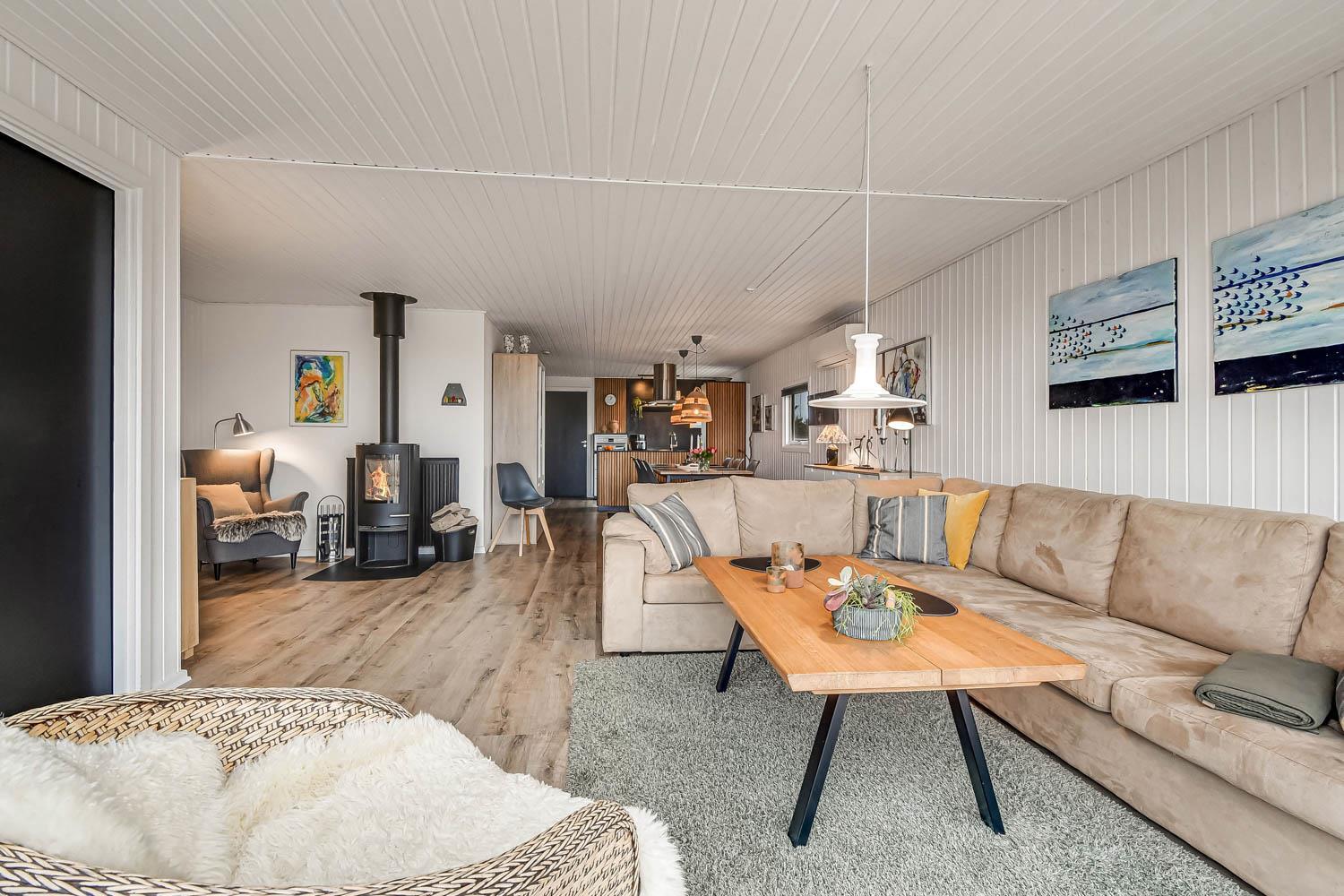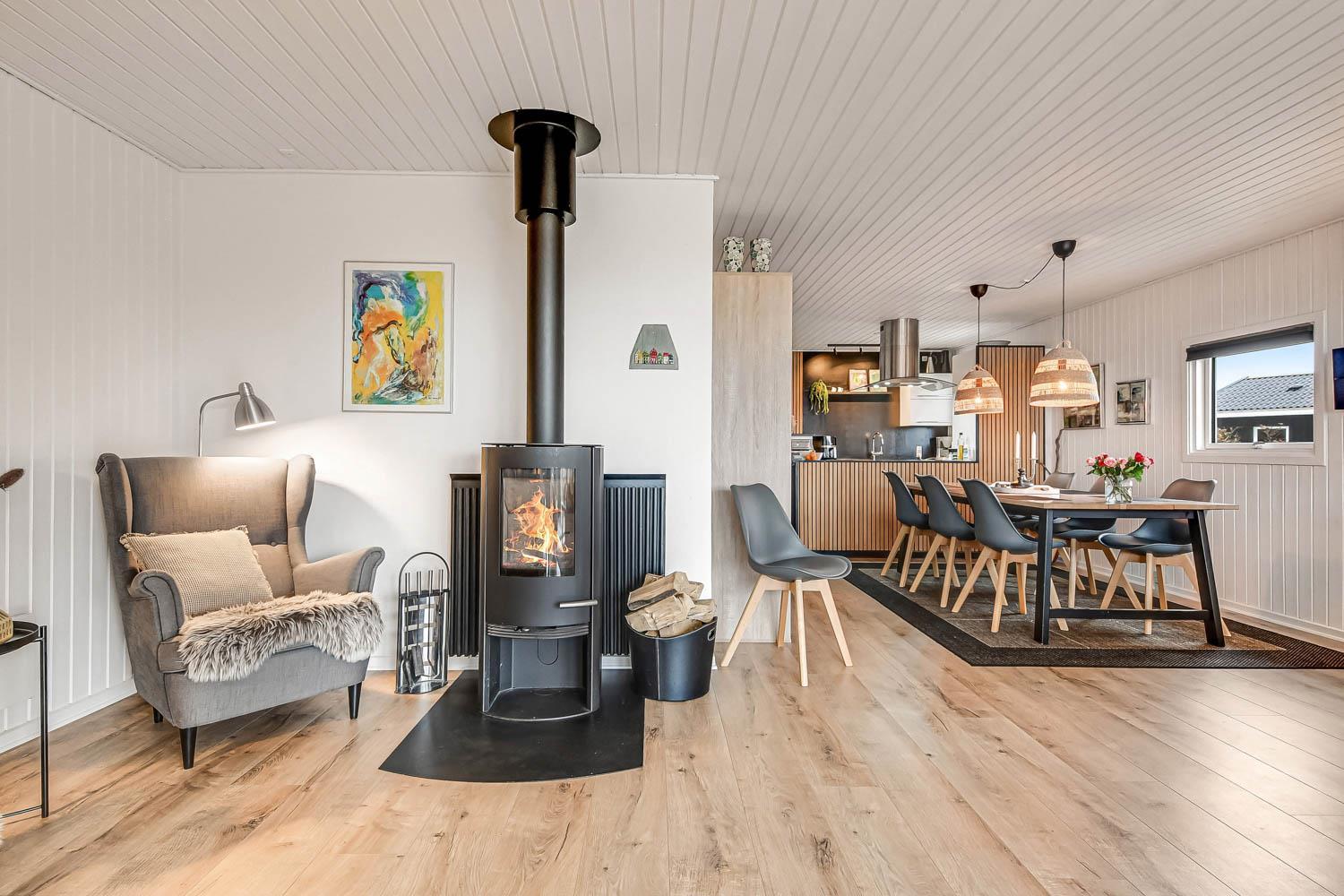 Huset er moderniseret i 2022 i lyse og venlige farver og med mange flotte detaljer. 4 Soveværelser (1DS, 2ES, 2ES1KS). Huset har en dejlig opholdsstue med hyggelig sofagruppe, spiseplads, LED smart-TV med tyske og danske kanaler samt mulighed for streaming af TV / radio / Apps. Der er gratis internetadgang i huset. Sommerhuset har en hyggelig brændeovn og varmepumpe, som begge sørger for et lavere forbrug. Dejligt ”læsehjørne” ,ed 2 dejlige stole og læselamper. Veludstyret køkkenhjørne med glaskeramisk komfur, emhætte, køleskab, mikroovn og opvaskemaskine. Lækkert badeværelse med bruser, toilet, håndvask, sauna, vaskemaskine og klinkegulv med gulvvarme. Der er flotte nye, praktiske pergogulve i alle opholdsrum og i soverummene. Max 1 hund tilladt. Huset er et ikke-ryger hus.