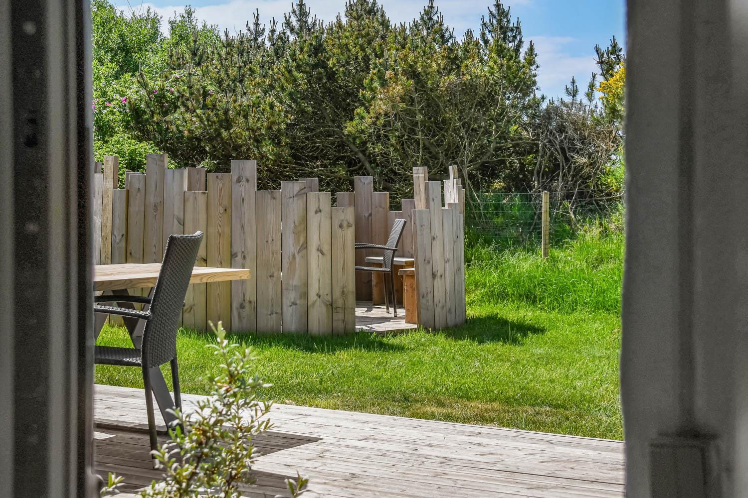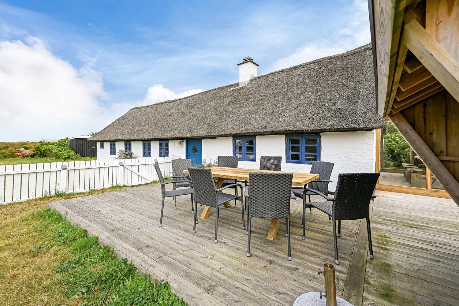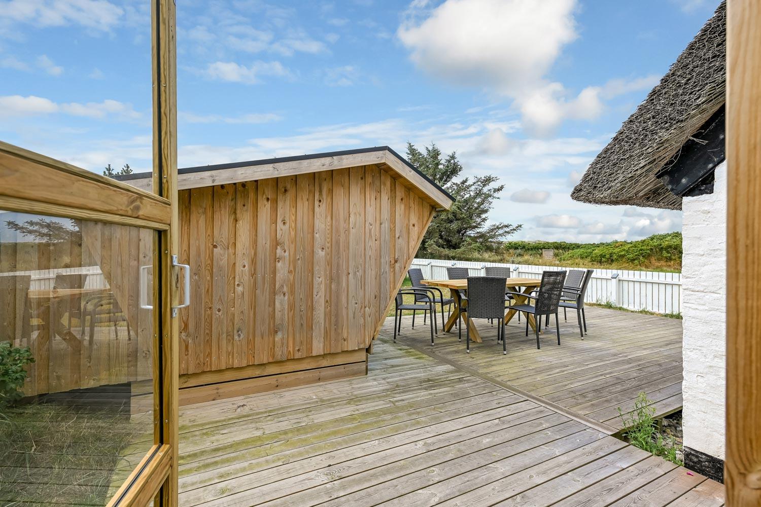 Beliggende på en dejlig privat grund på ca. 1.950 m2. Huset er beliggende tæt på en lille sø, hvor man fra terrassen med bord og bænkesæt kan sidde og nyde udsigten over søen. Huset ligger ca. 500 m fra indkøb og 750 m fra Vesterhavet. Fra lille entre er der udgang til naturgrunden og den dejlige nyanlagte træterrasse. Ved deb ene gavl af huset er der opstillet en bænk for her er der altid læ og der er det perfekte sted til at nyde en kop kaffe eller en god bog. Havemøbler og grill. Også området madsted ligger ca. 500 fra huset. Inden for 25-30 minutter kan flere aktiviteter og shoppingmuligheder nås.